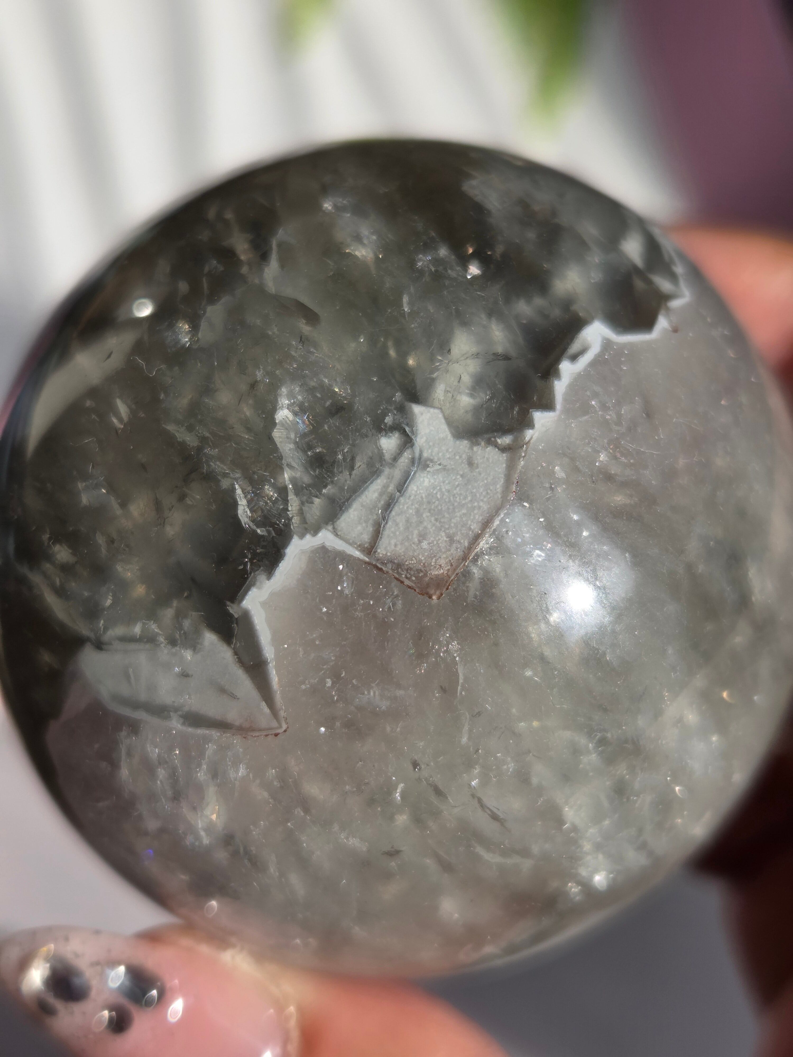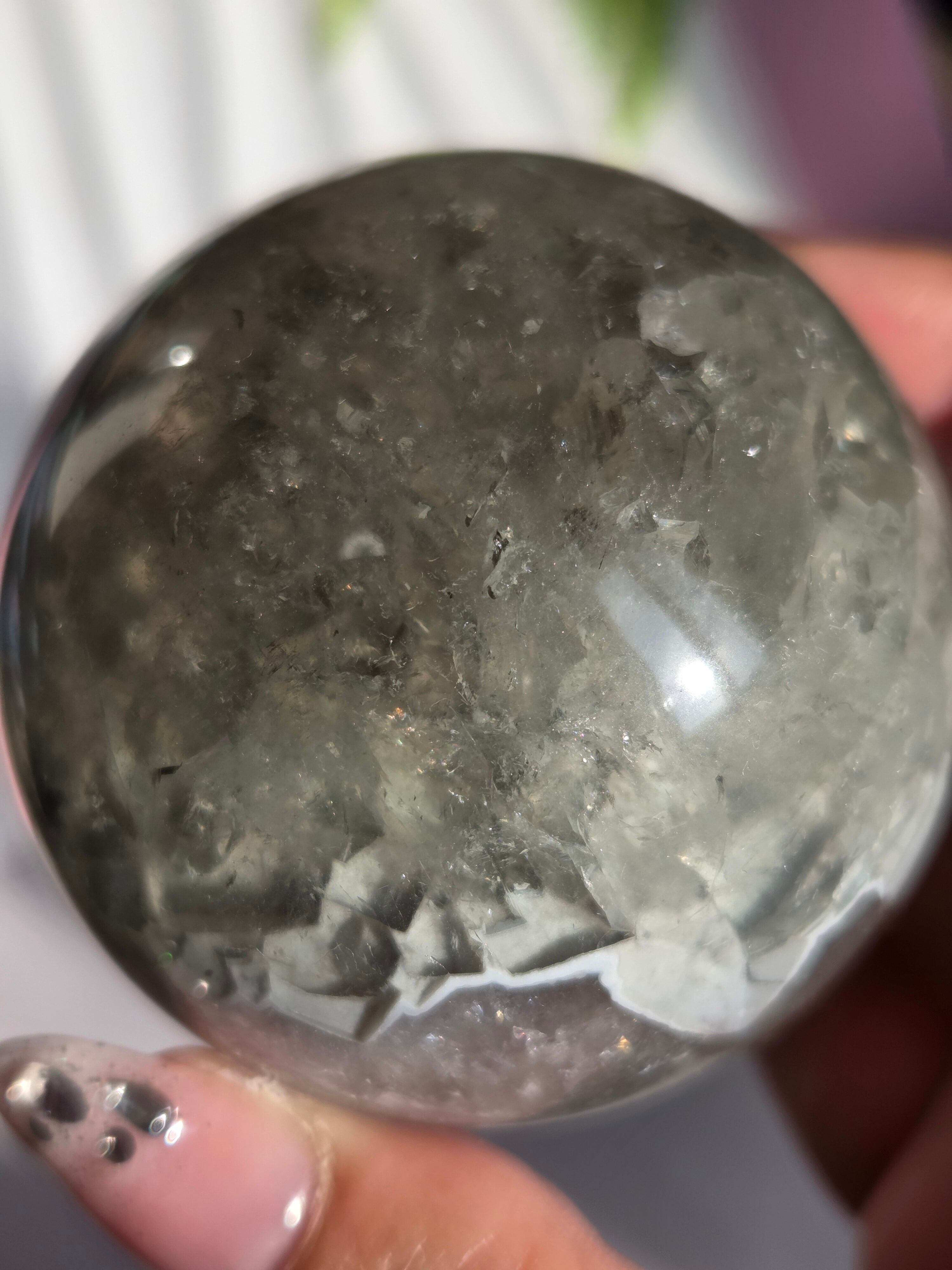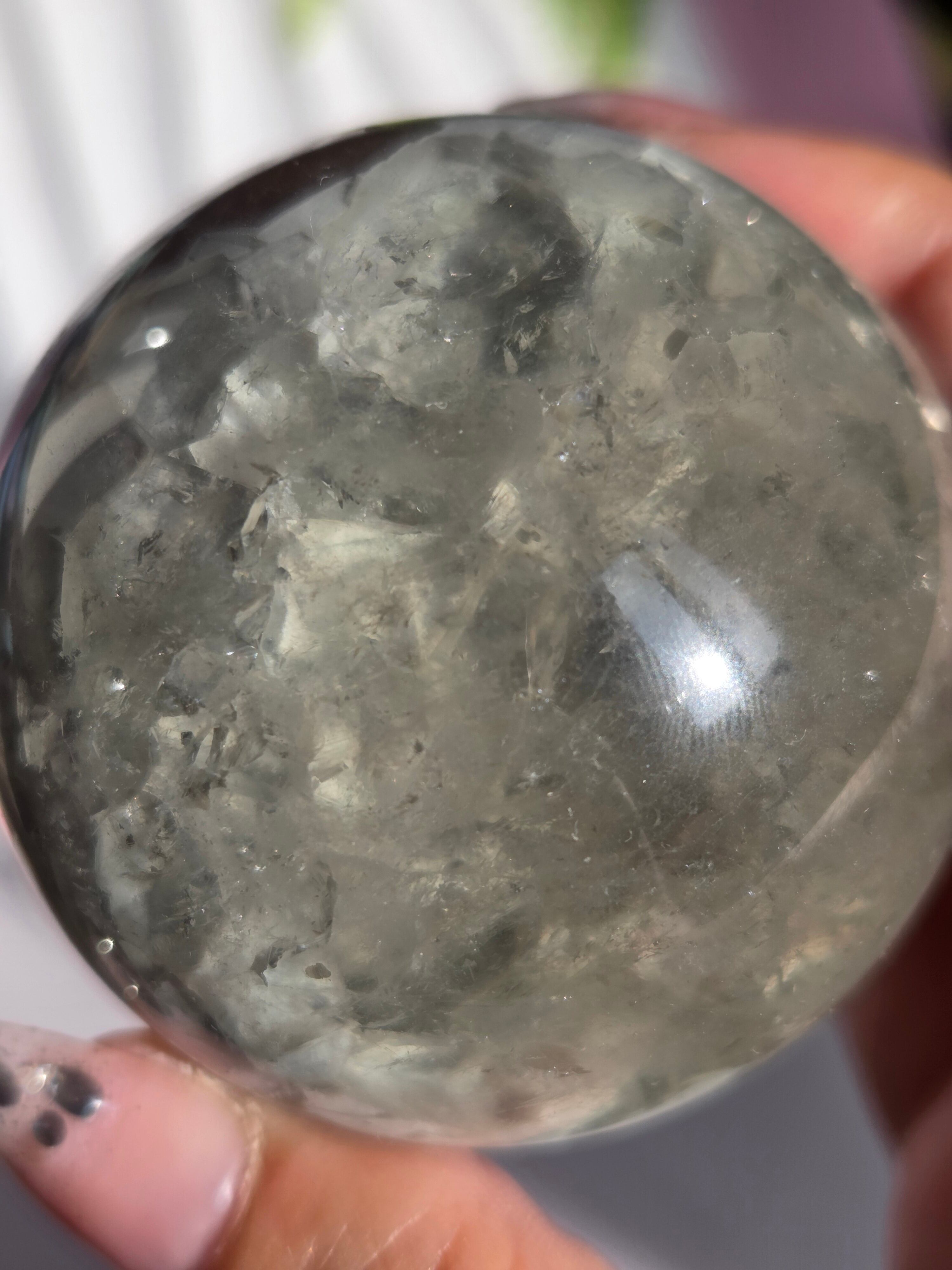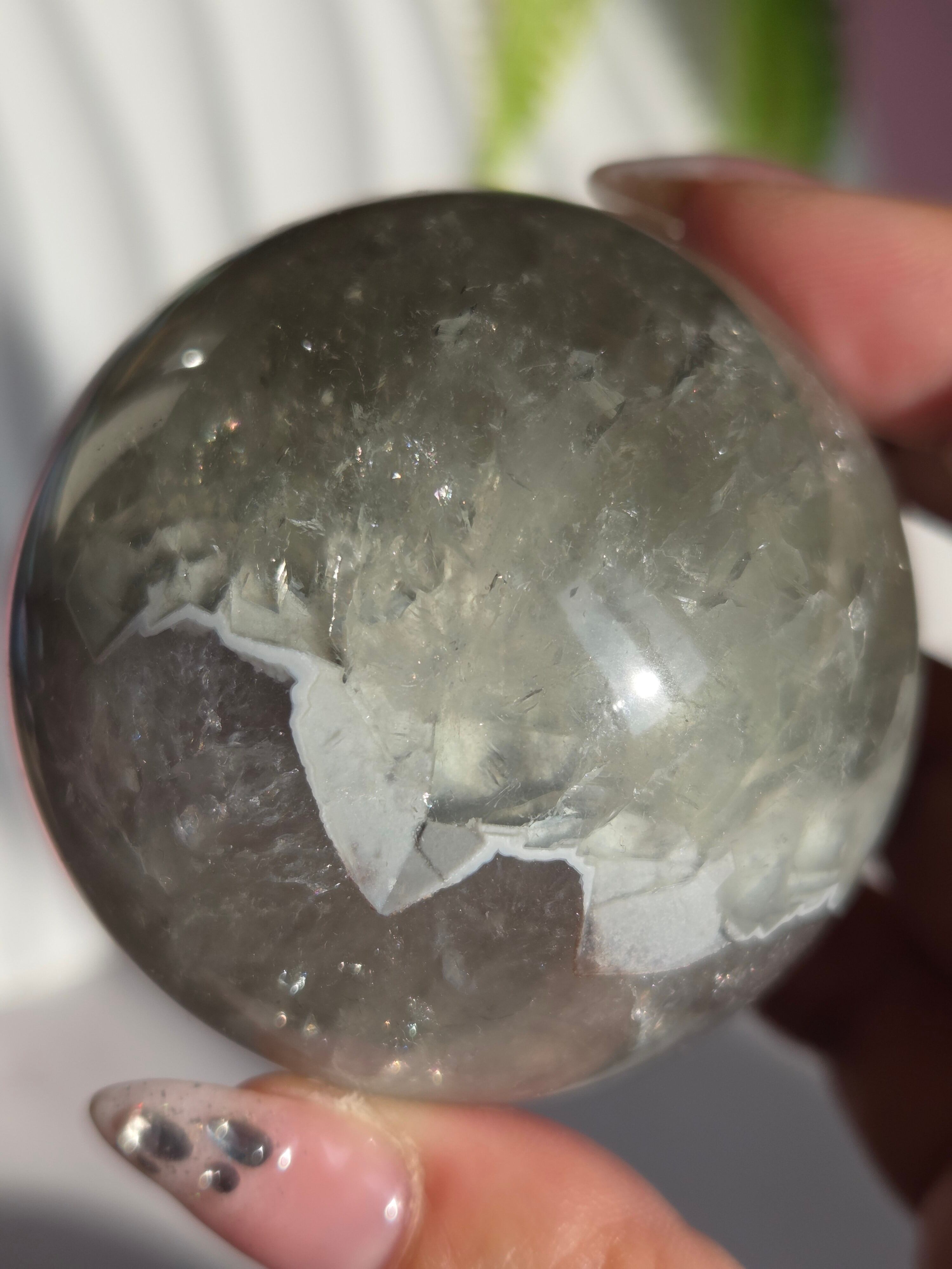 淡いグリーンとパープルの結晶の合間から見える沢山の虹の煌めきが美しいスフィアです。