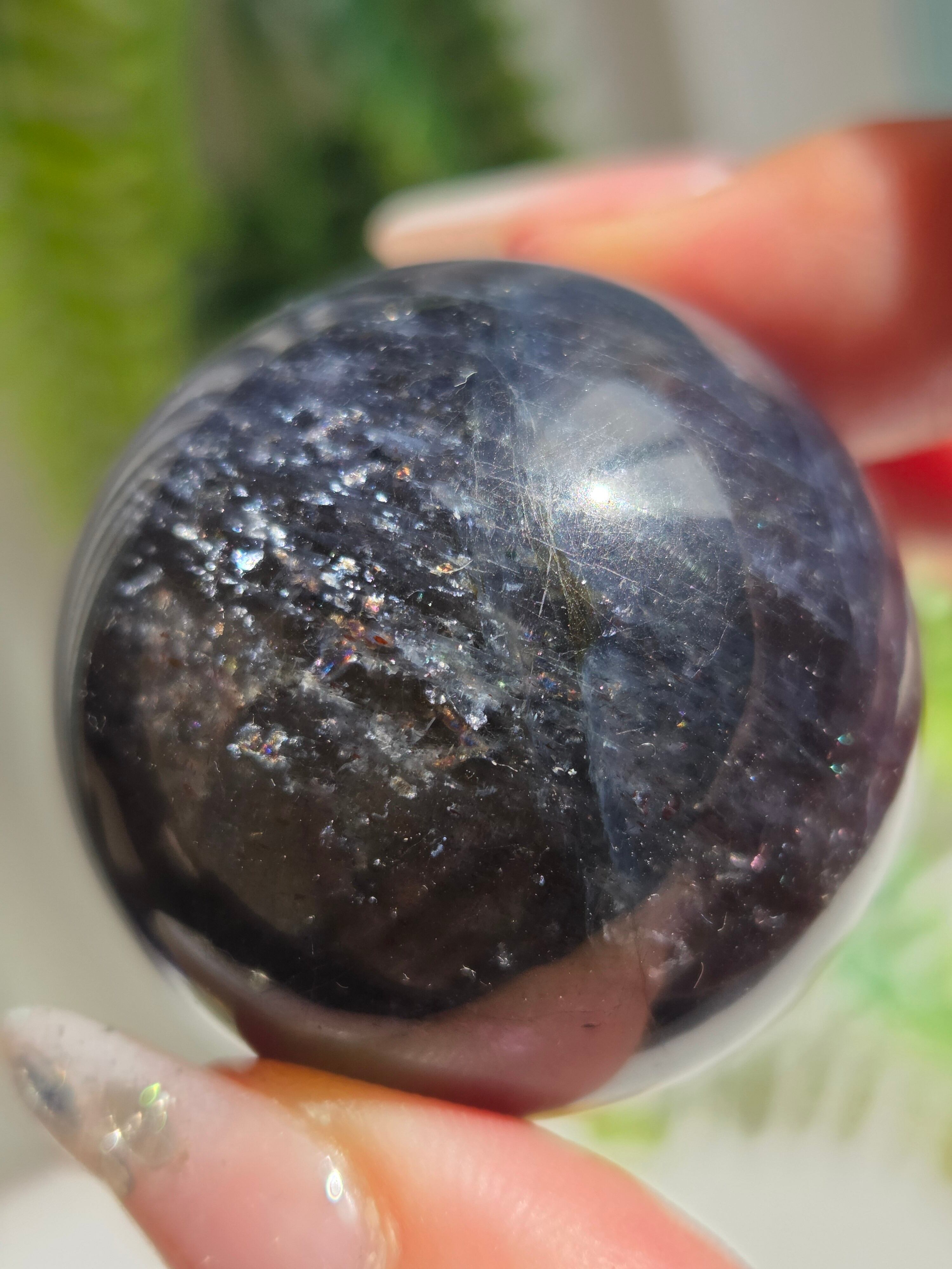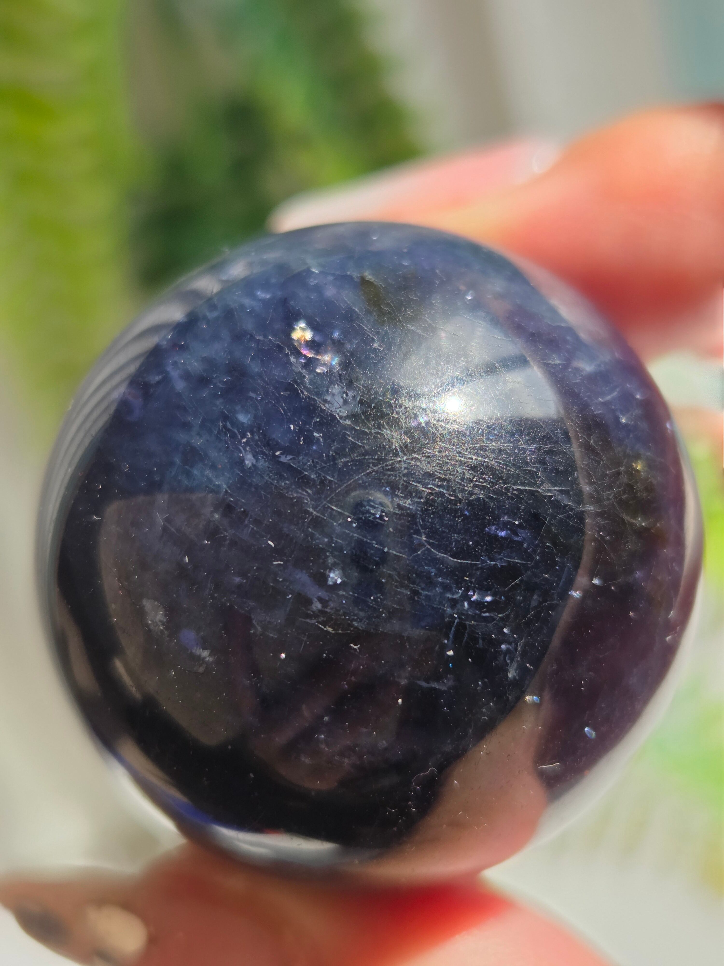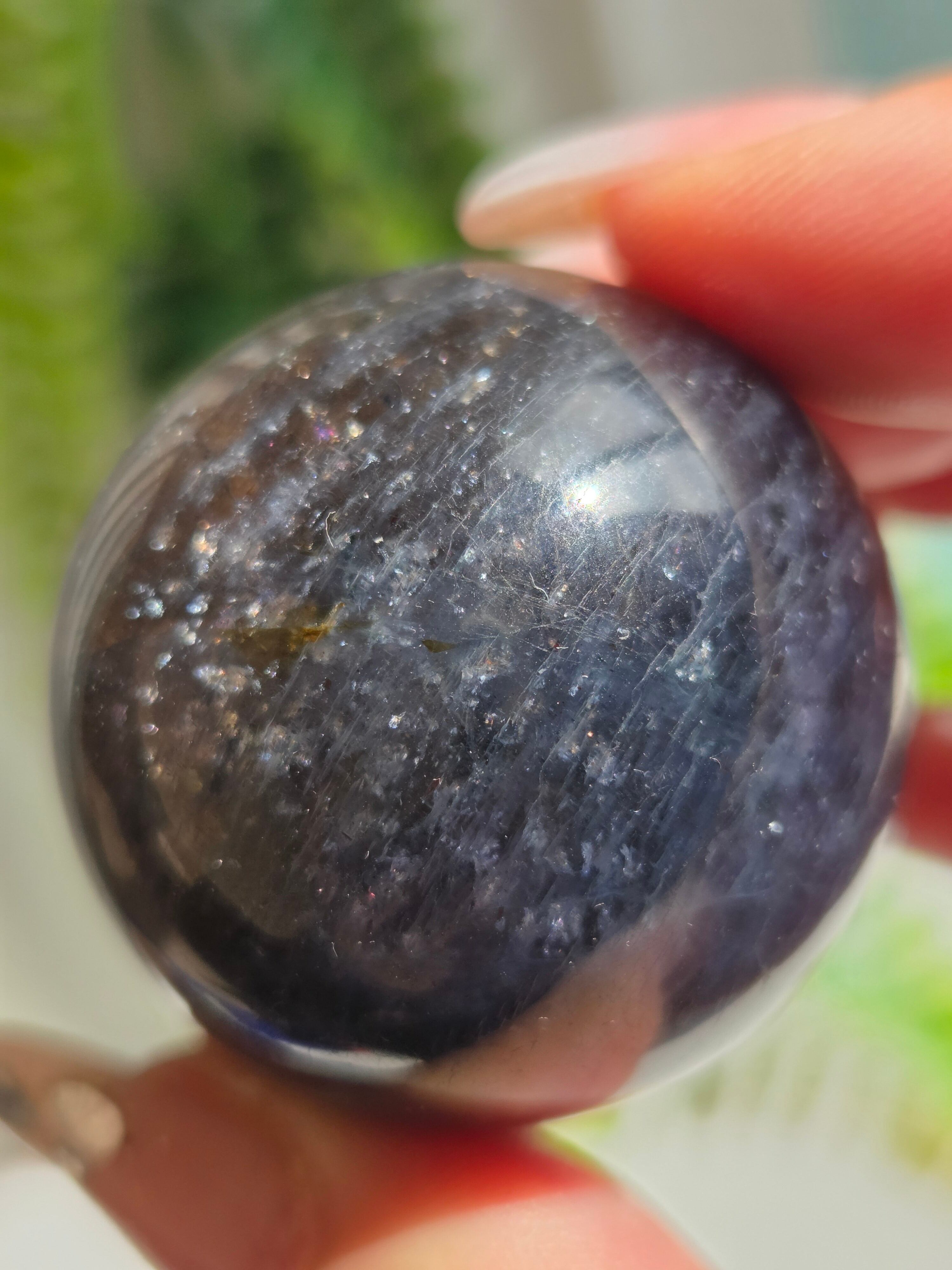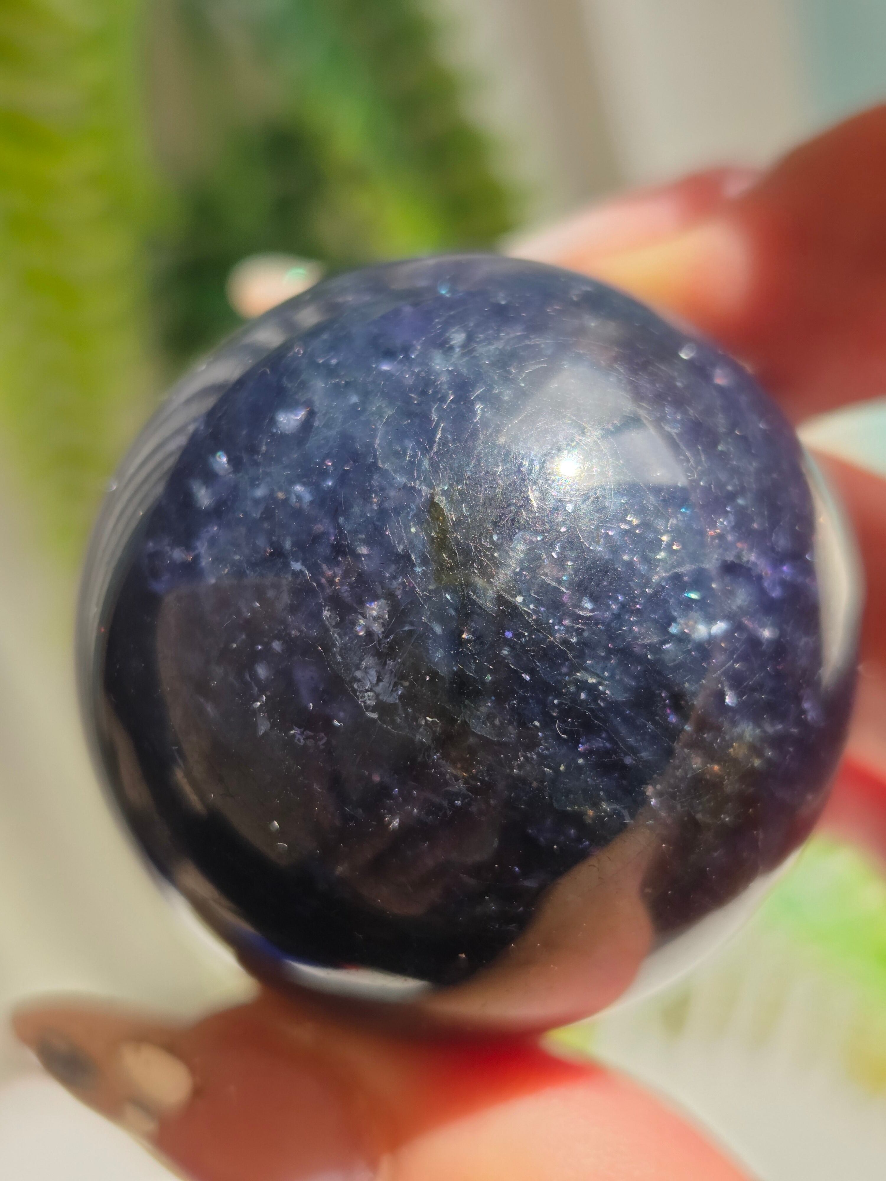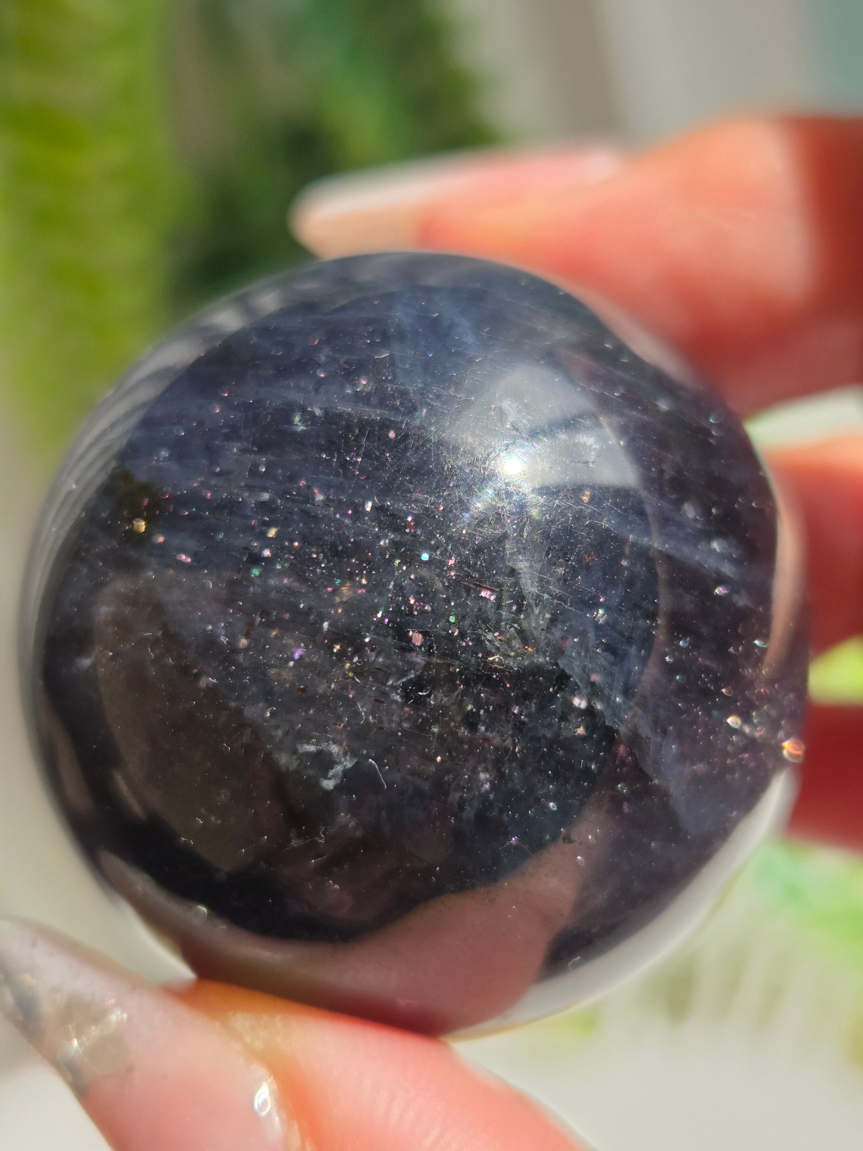 アイオライトサンストーンとは、藍色のアイオライト(菫青石)の中に、サンストーンのようなキラキラとした金属の輝き(アベンチュレッセンス)が見られる天然石のことです。この輝きは、主にレピドクロサイトなどの鉄鉱物が内包されることで生じ、アベンチュリンアイオライトとも呼ばれます。
