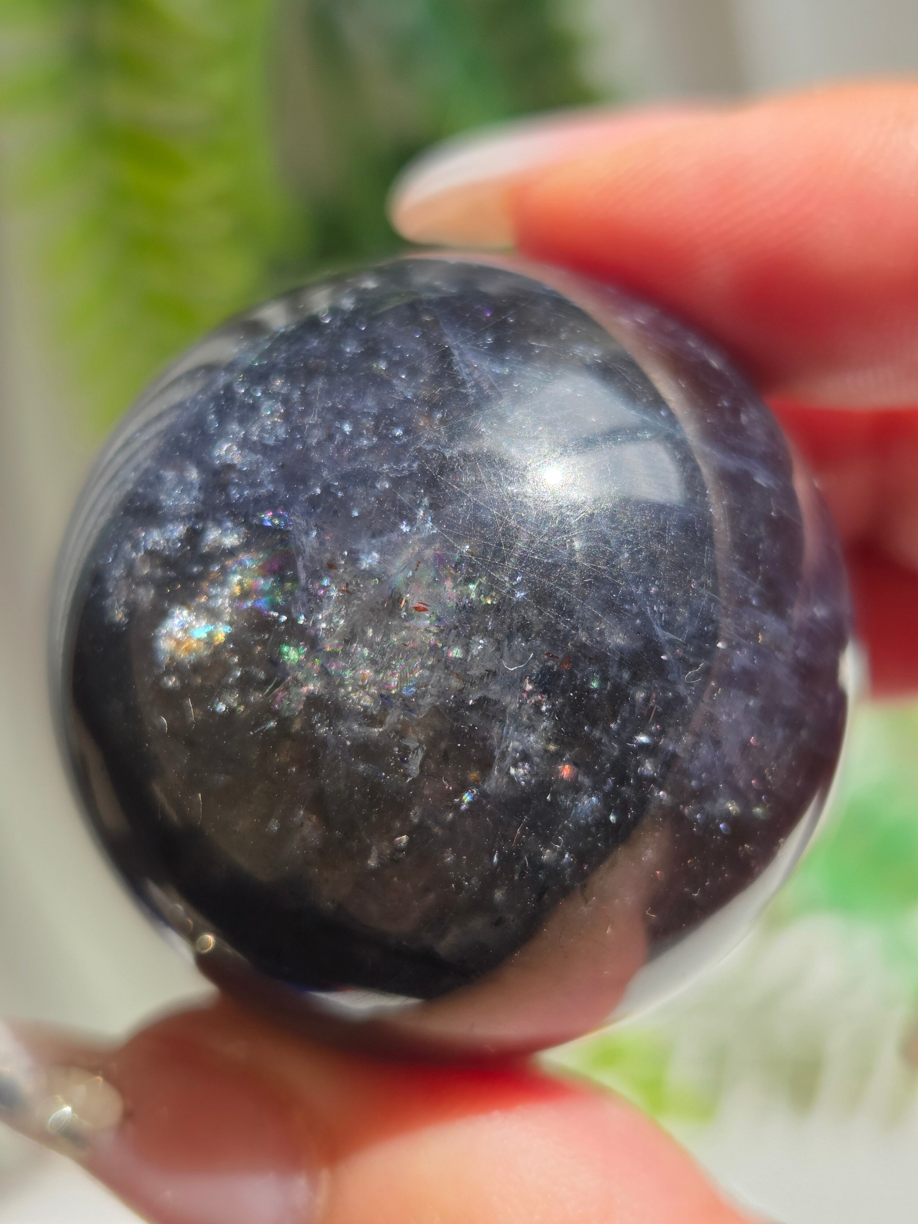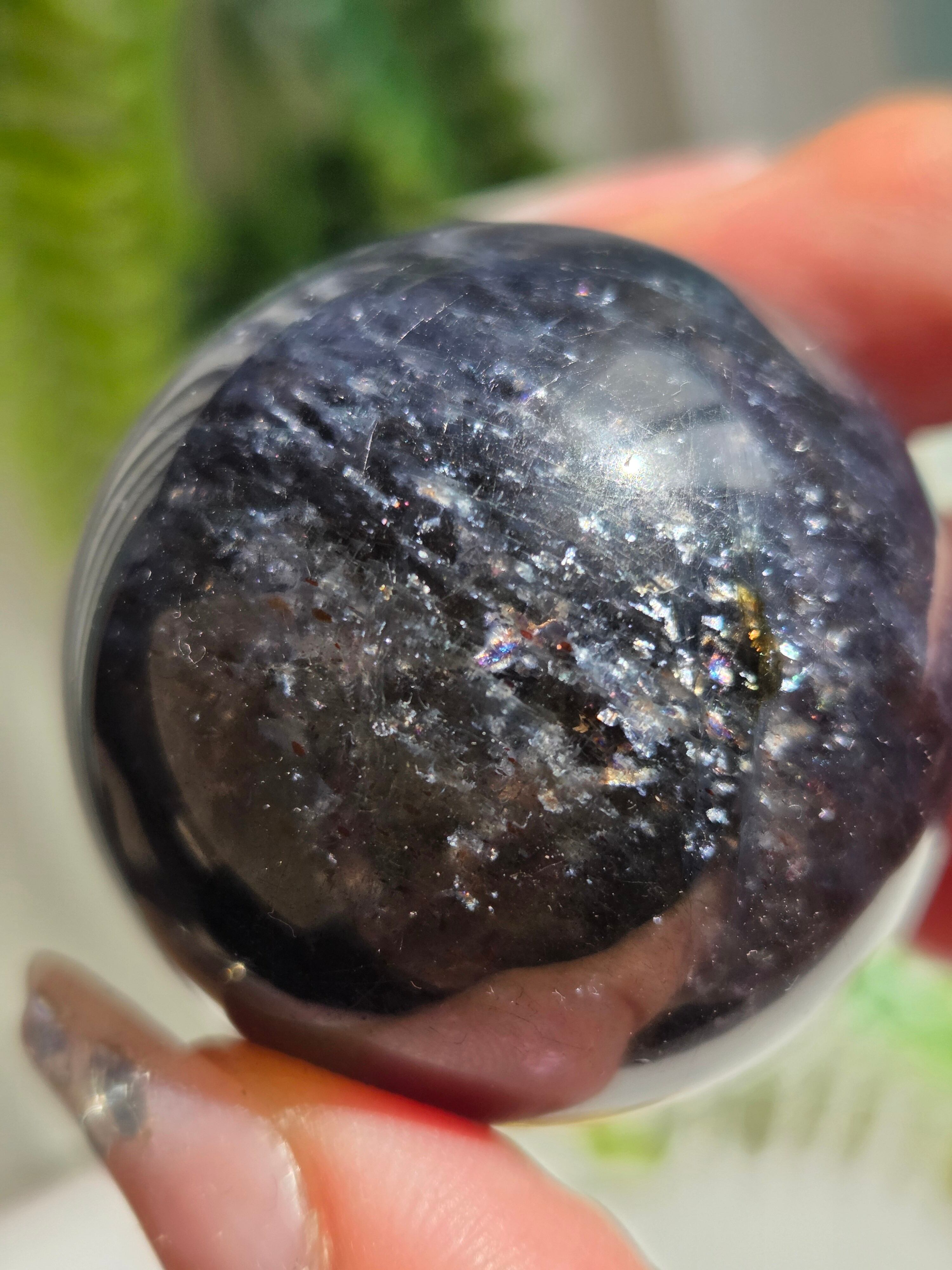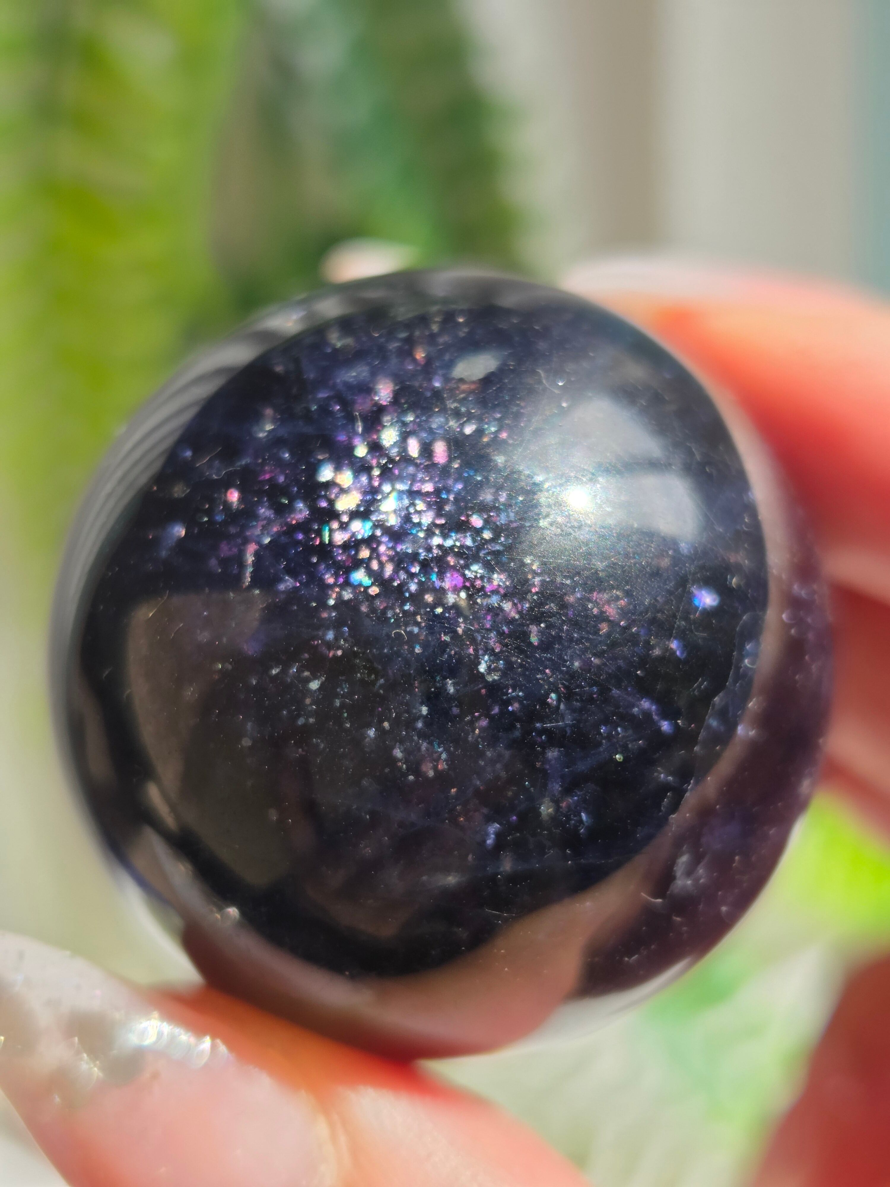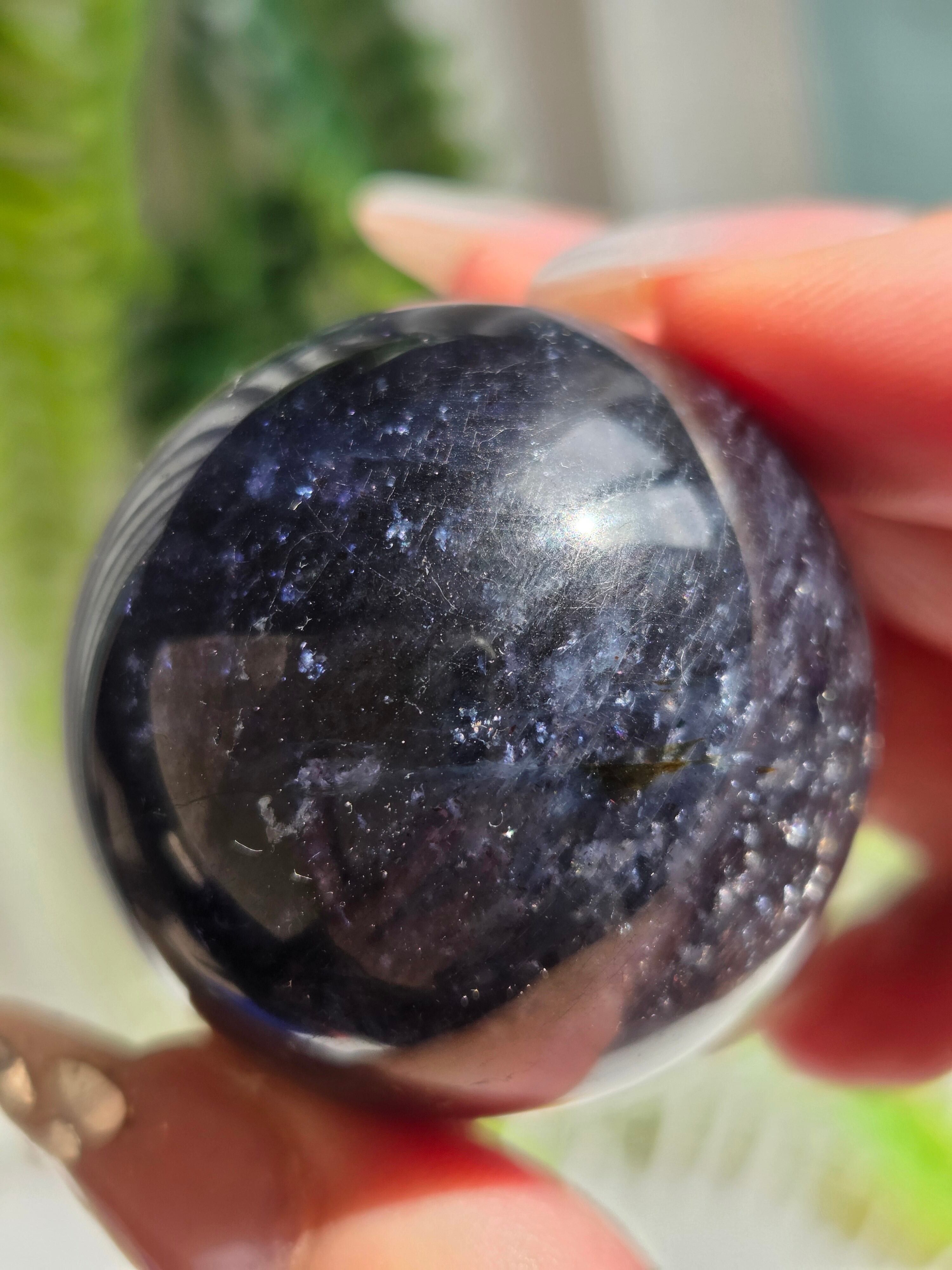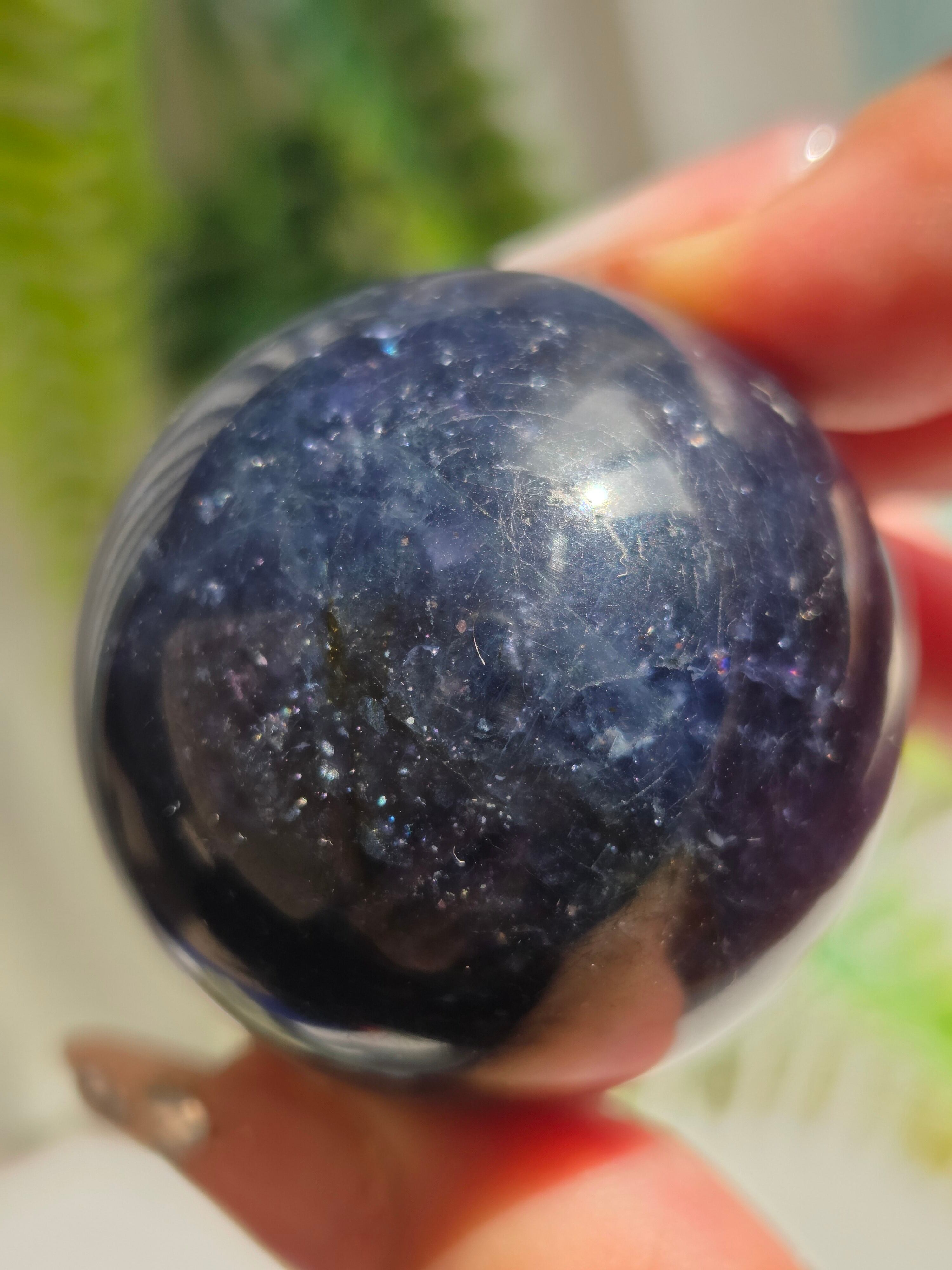 アイオライトサンストーンとは、藍色のアイオライト(菫青石)の中に、サンストーンのようなキラキラとした金属の輝き(アベンチュレッセンス)が見られる天然石のことです。この輝きは、主にレピドクロサイトなどの鉄鉱物が内包されることで生じ、アベンチュリンアイオライトとも呼ばれます。