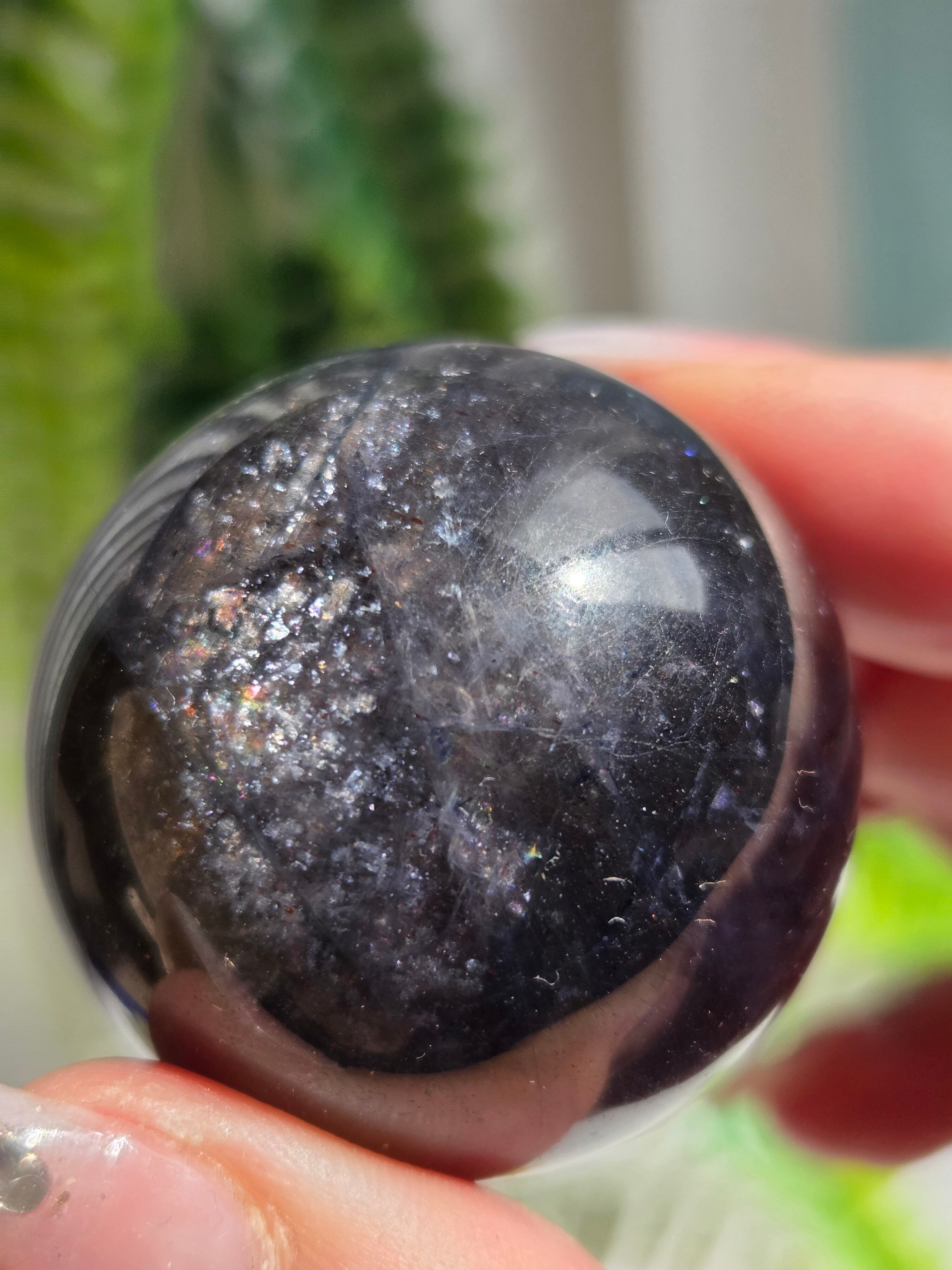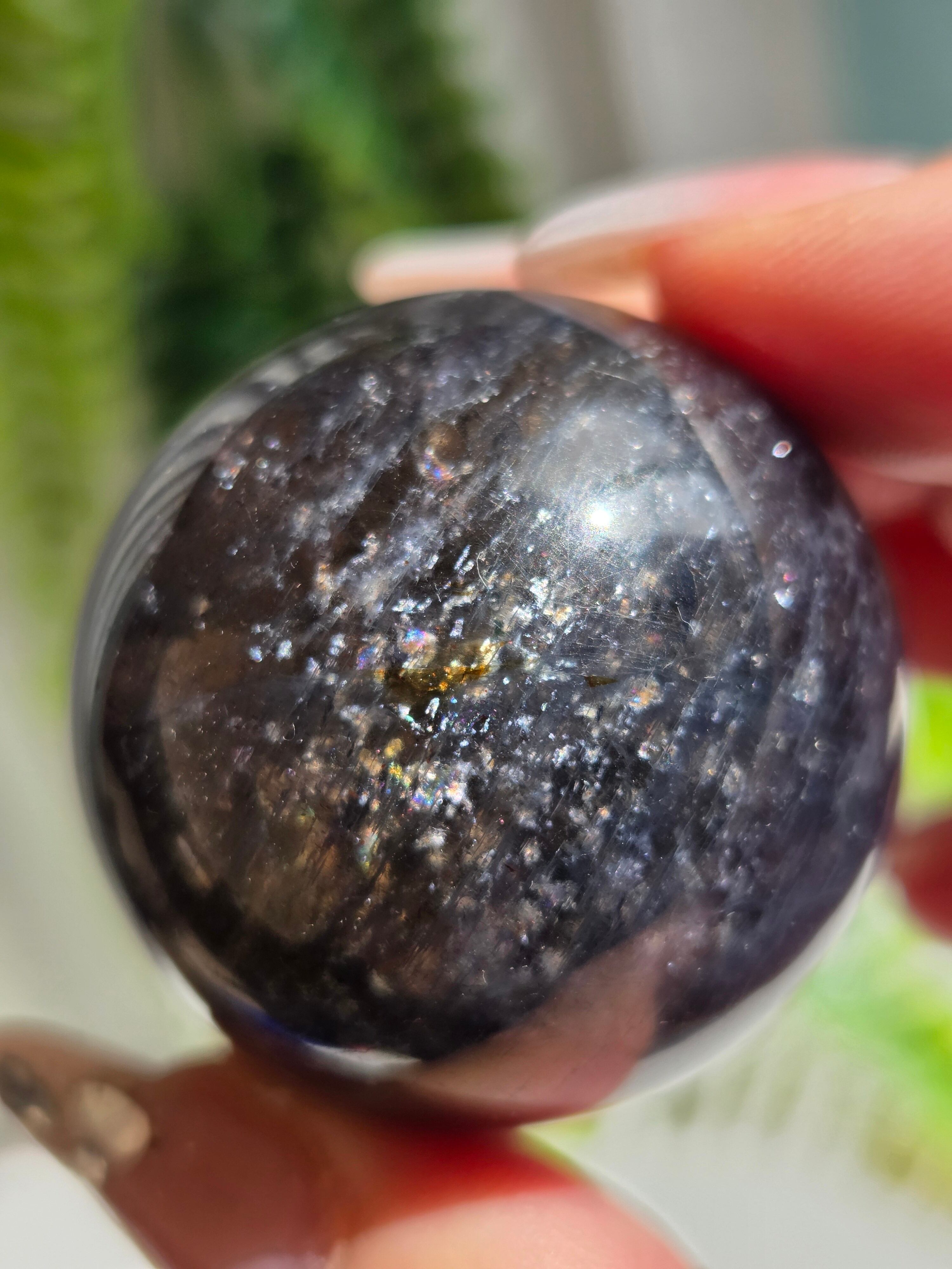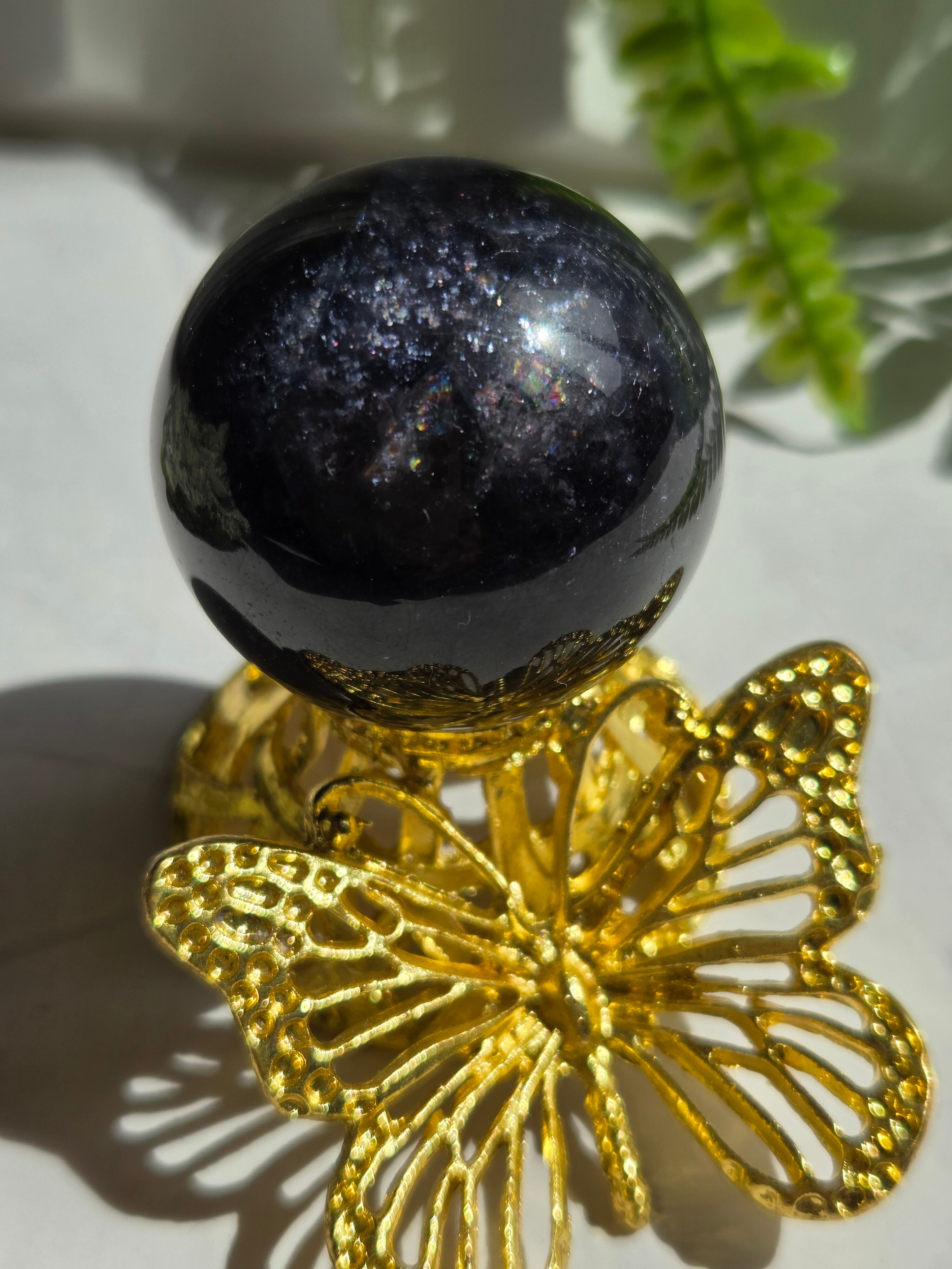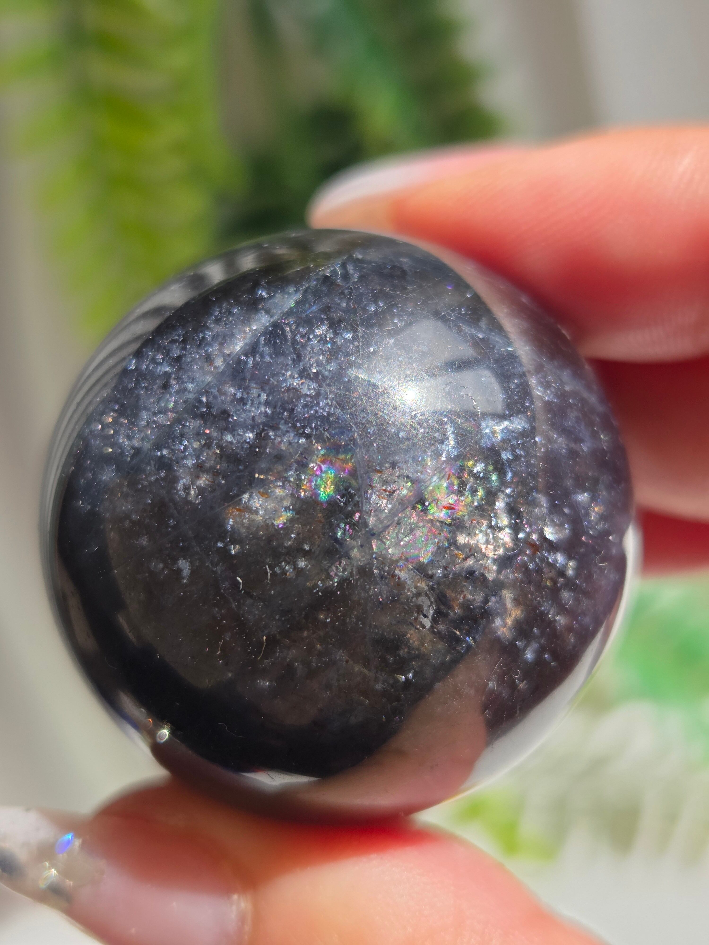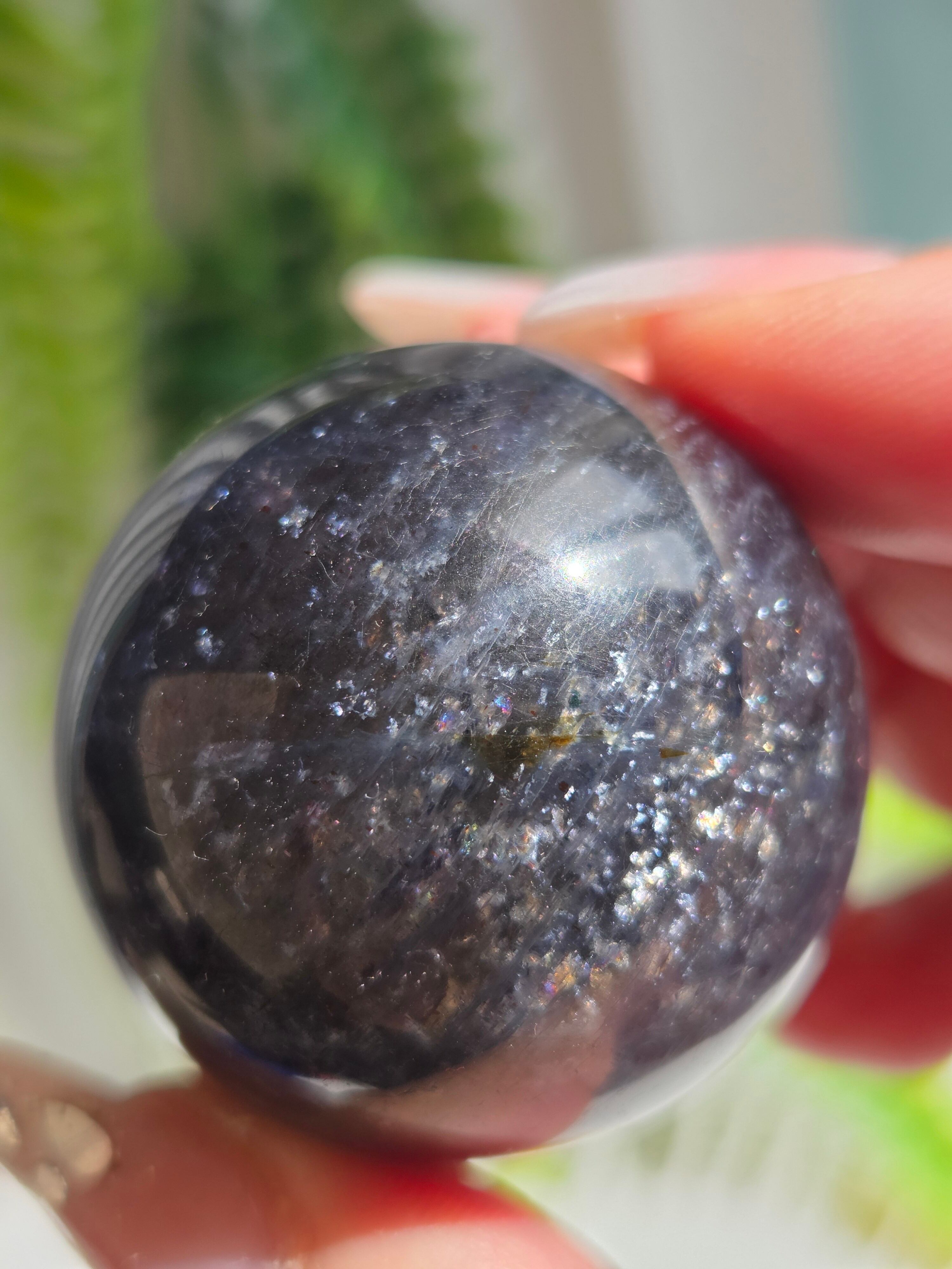 アイオライトサンストーンとは、藍色のアイオライト(菫青石)の中に、サンストーンのようなキラキラとした金属の輝き(アベンチュレッセンス)が見られる天然石のことです。この輝きは、主にレピドクロサイトなどの鉄鉱物が内包されることで生じ、アベンチュリンアイオライトとも呼ばれます。