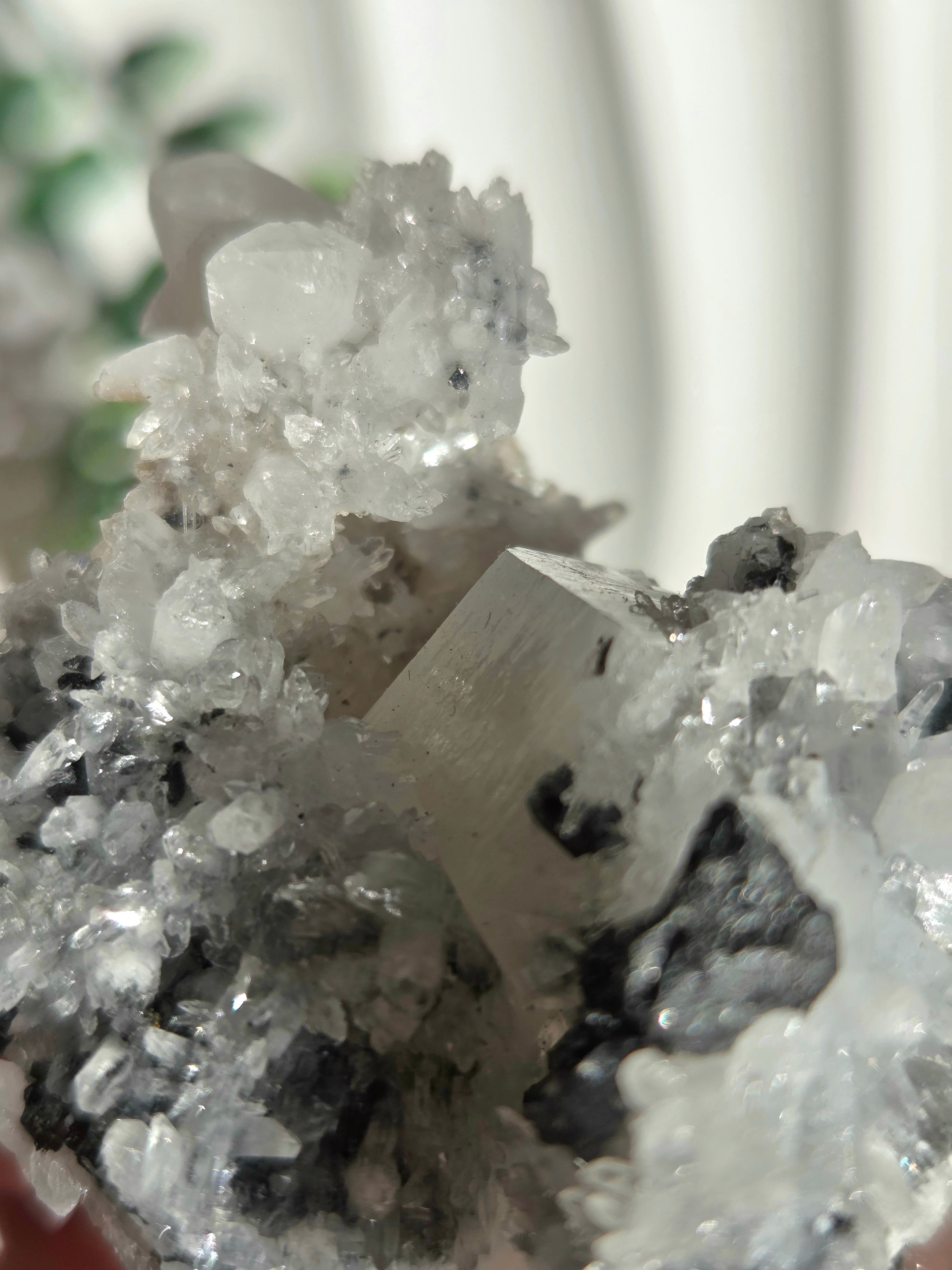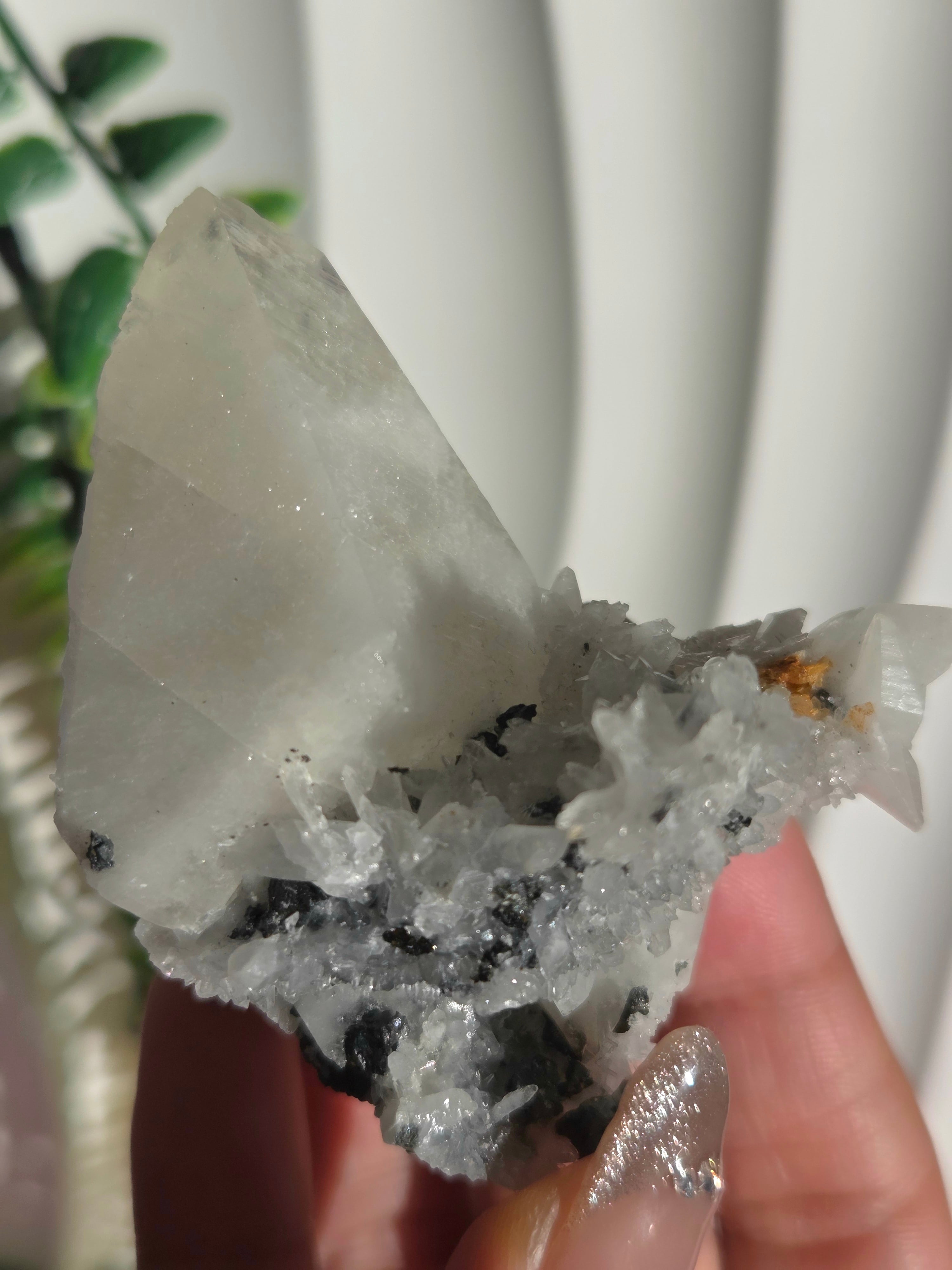 カルサイトをメインに、周りには、花のような水晶や、煌めきのあるガレナやスファレライトが共生している、かっこいい鉱物標本です。