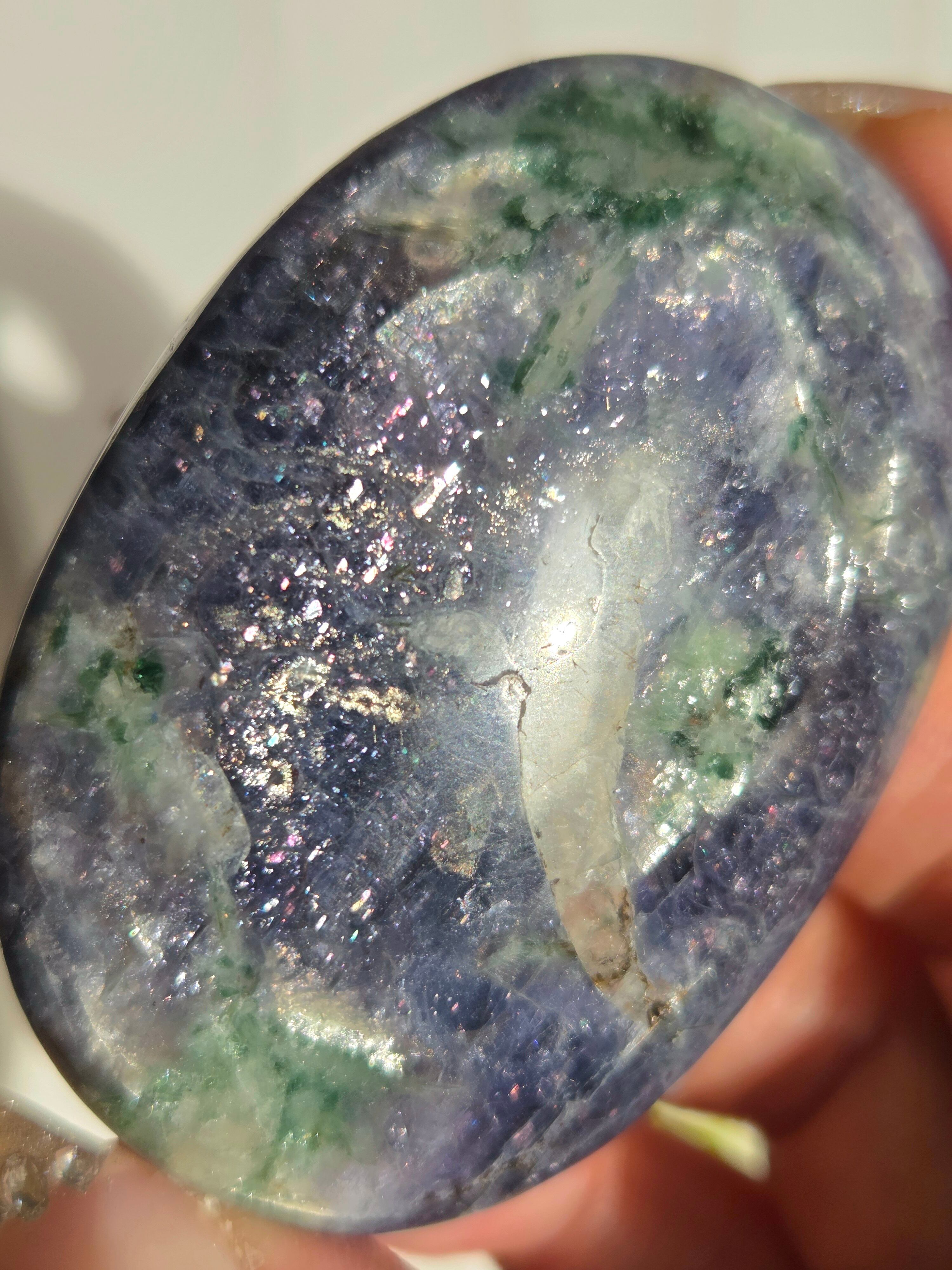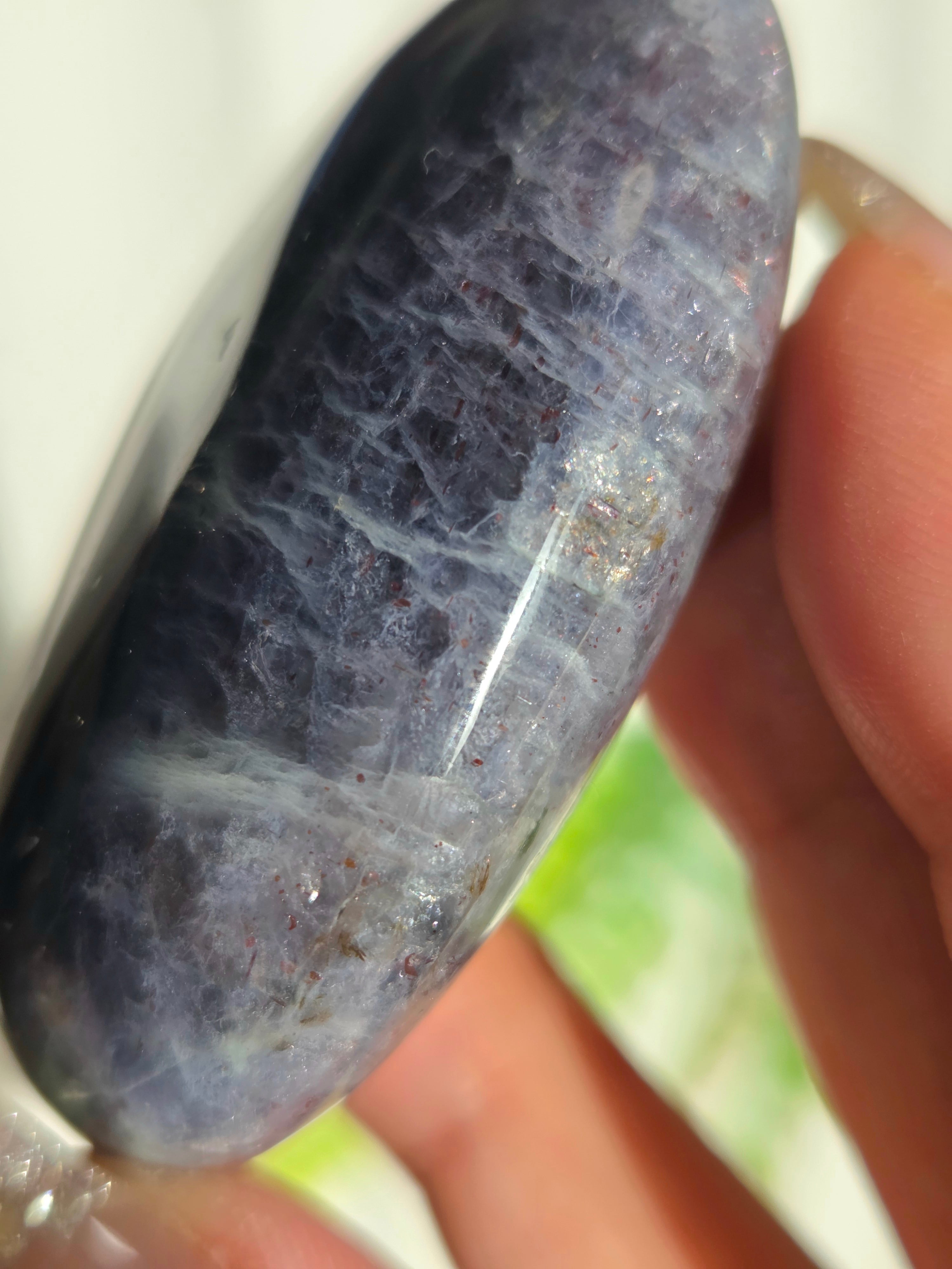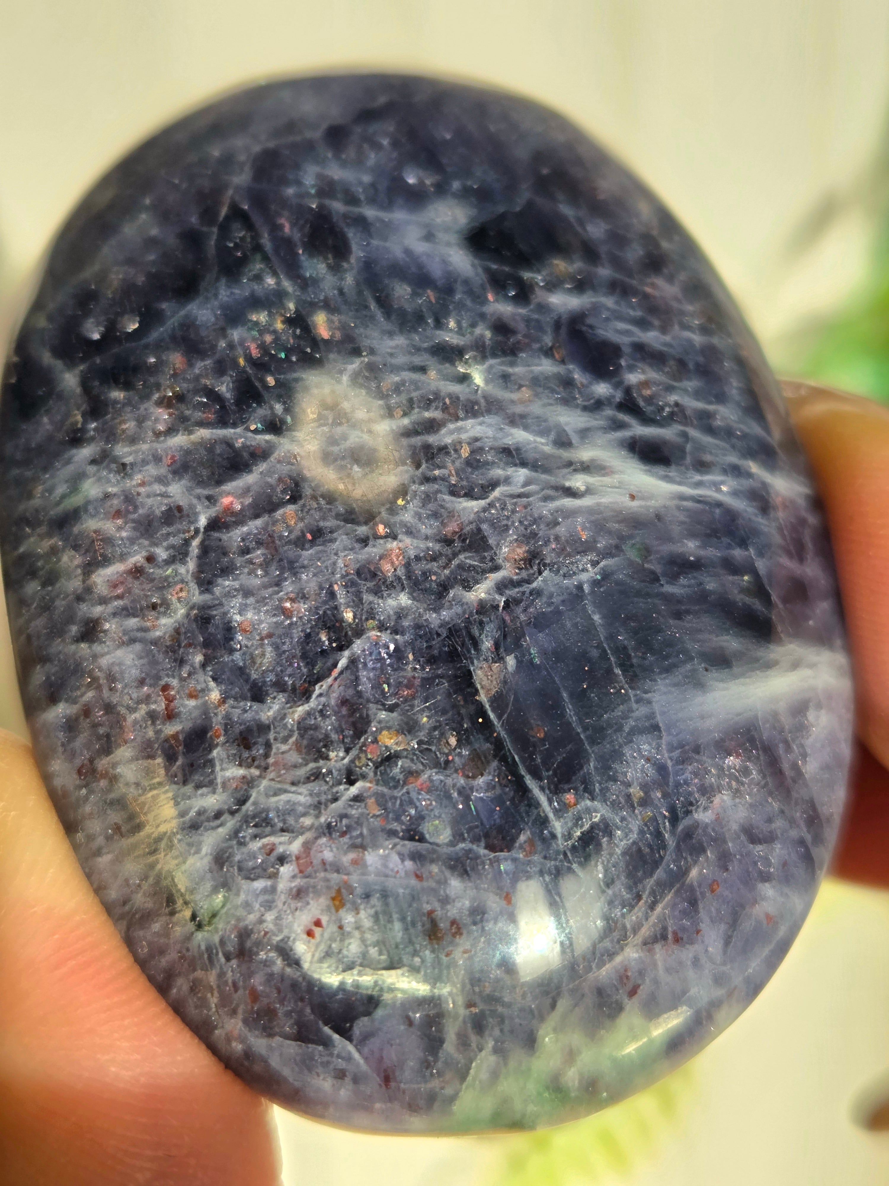 アイオライトサンストーンとは、藍色のアイオライト(菫青石)の中に、サンストーンのようなキラキラとした金属の輝き(アベンチュレッセンス)が見られる天然石のことです。この輝きは、主にレピドクロサイトなどの鉄鉱物が内包されることで生じ、アベンチュリンアイオライトとも呼ばれます。