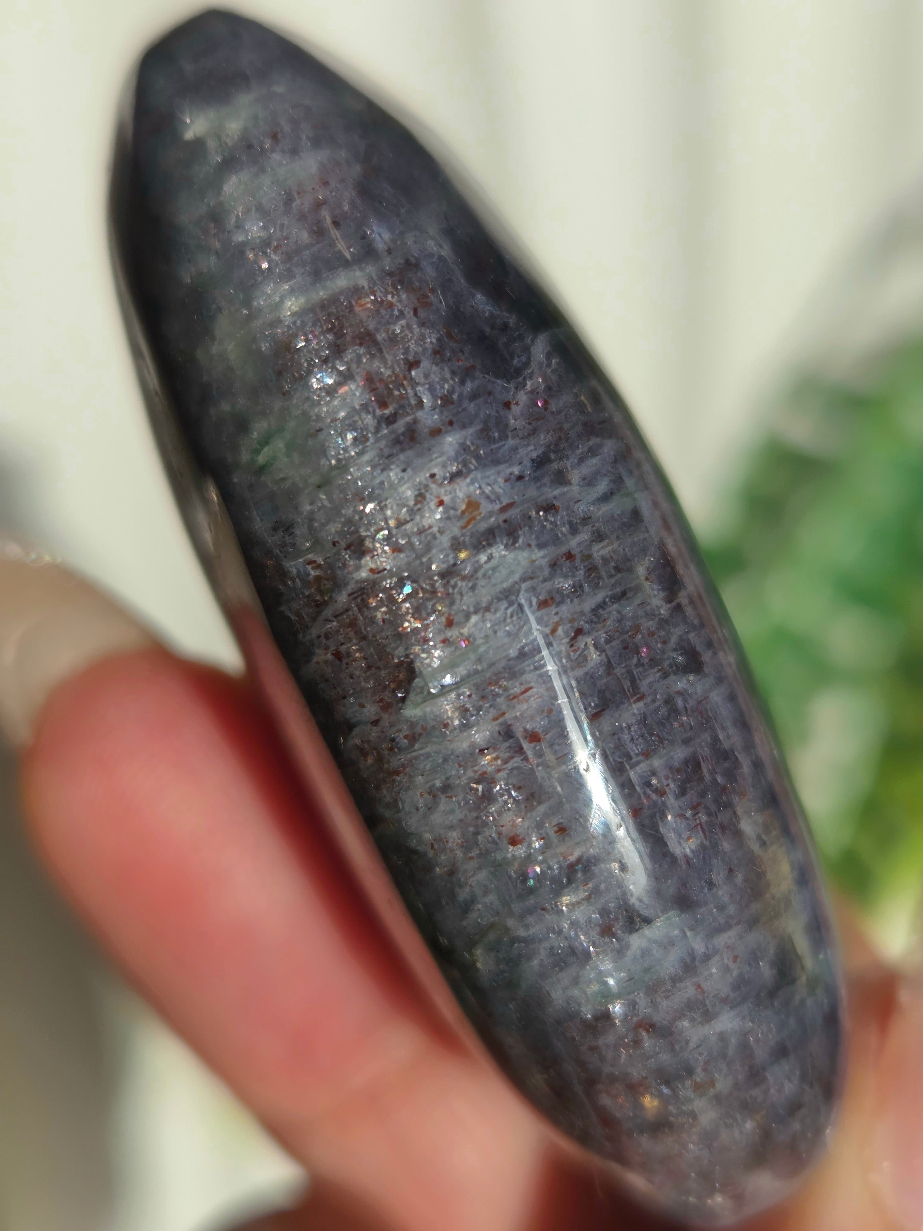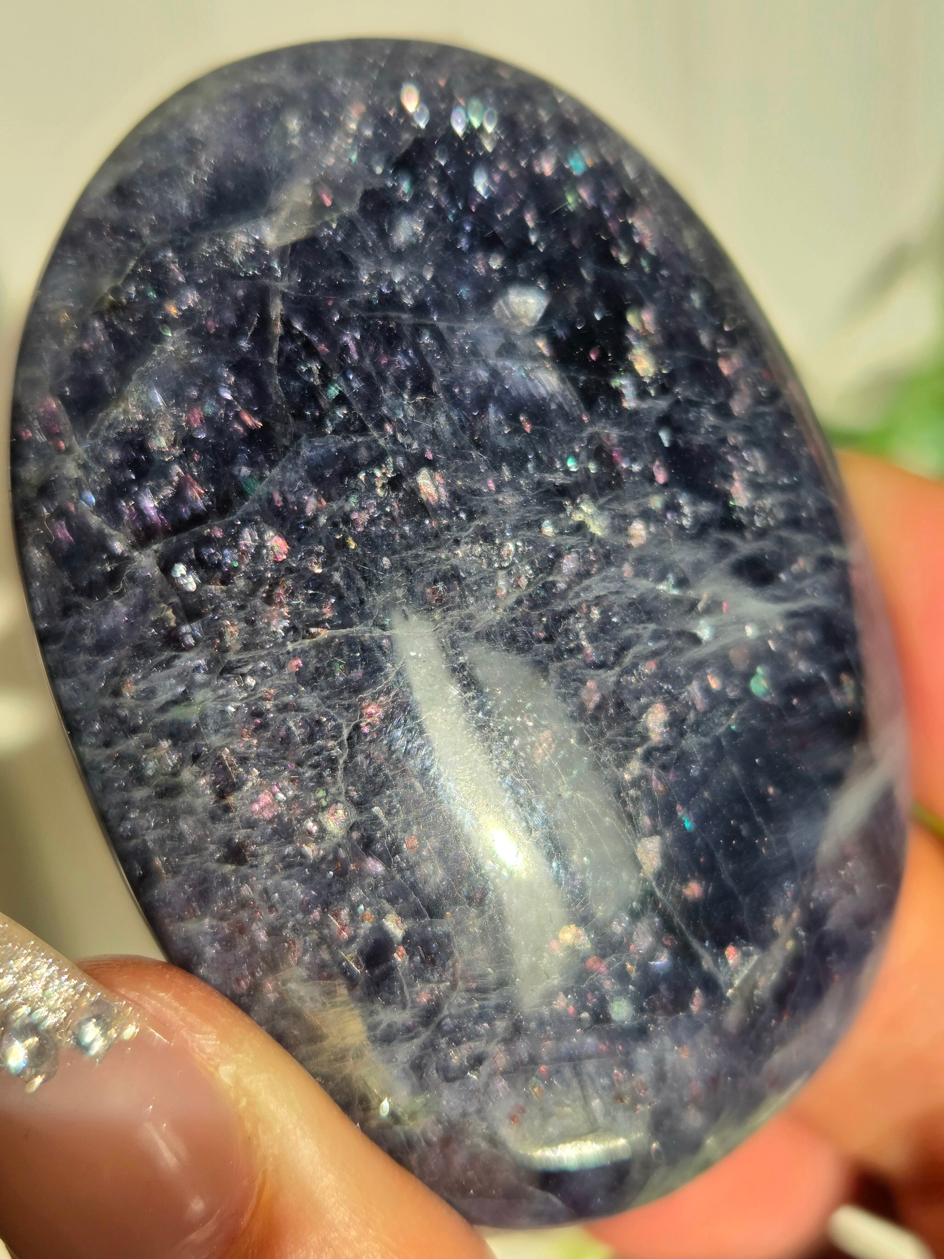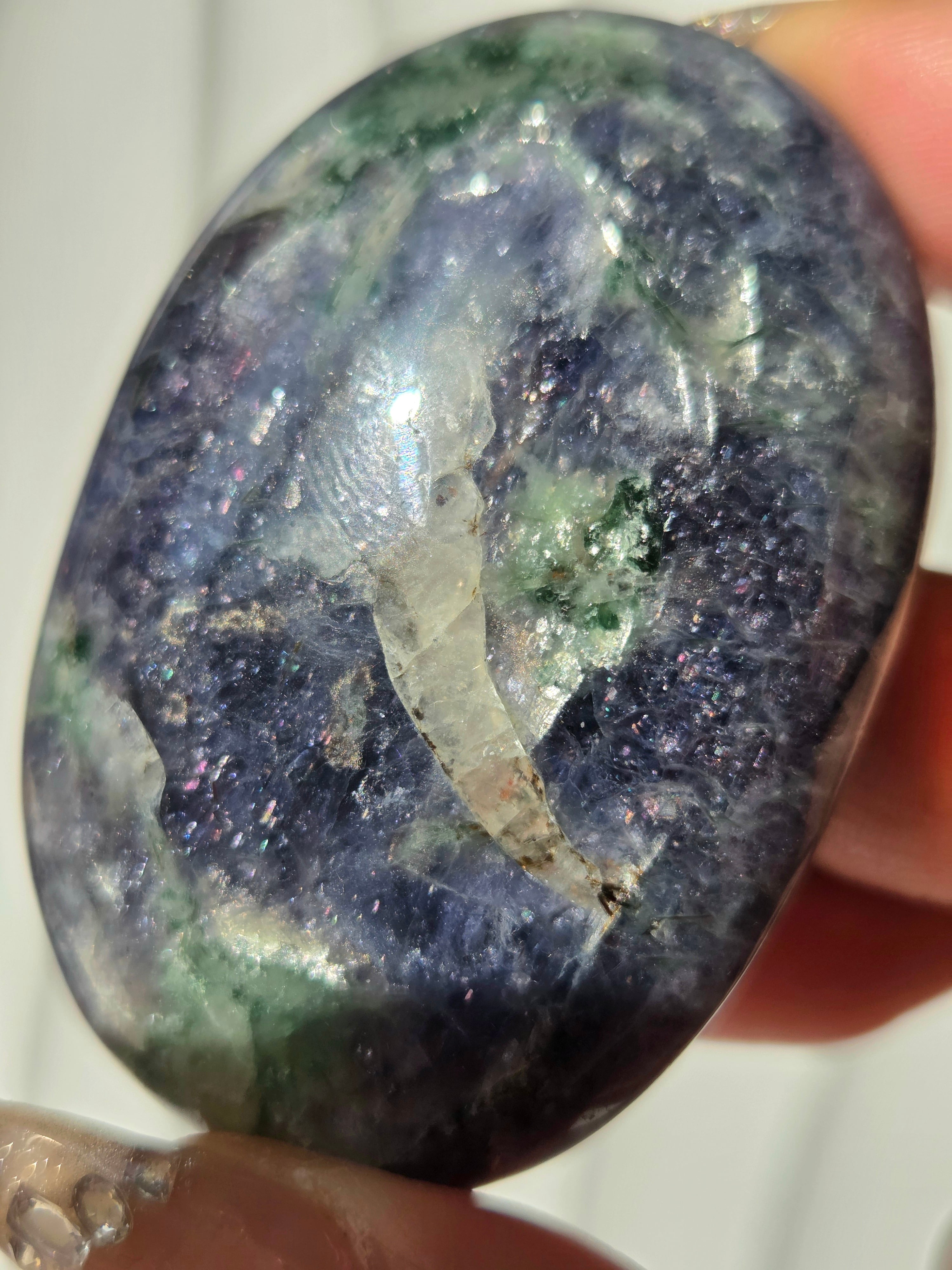 アイオライトサンストーンとは、藍色のアイオライト(菫青石)の中に、サンストーンのようなキラキラとした金属の輝き(アベンチュレッセンス)が見られる天然石のことです。この輝きは、主にレピドクロサイトなどの鉄鉱物が内包されることで生じ、アベンチュリンアイオライトとも呼ばれます。