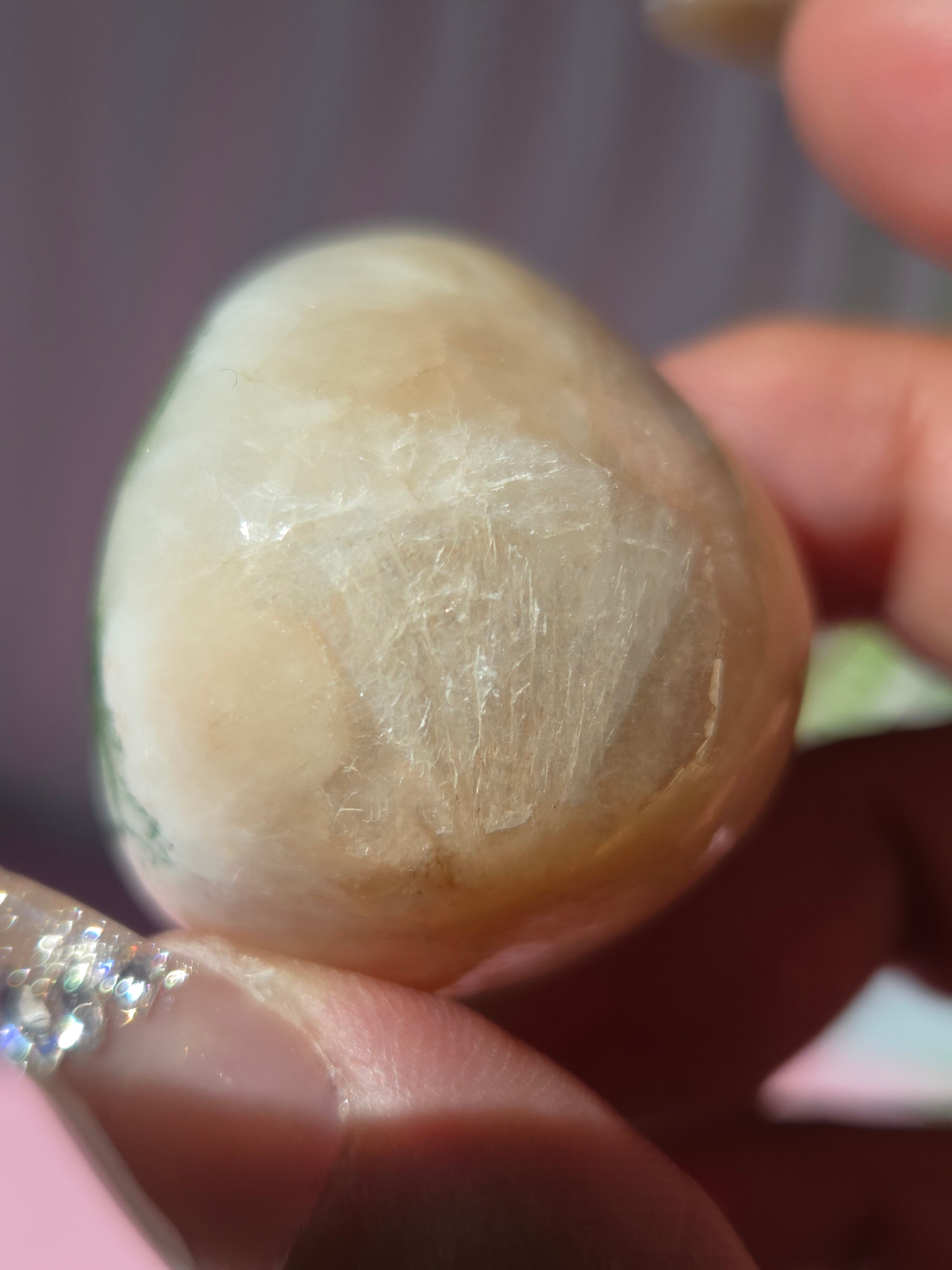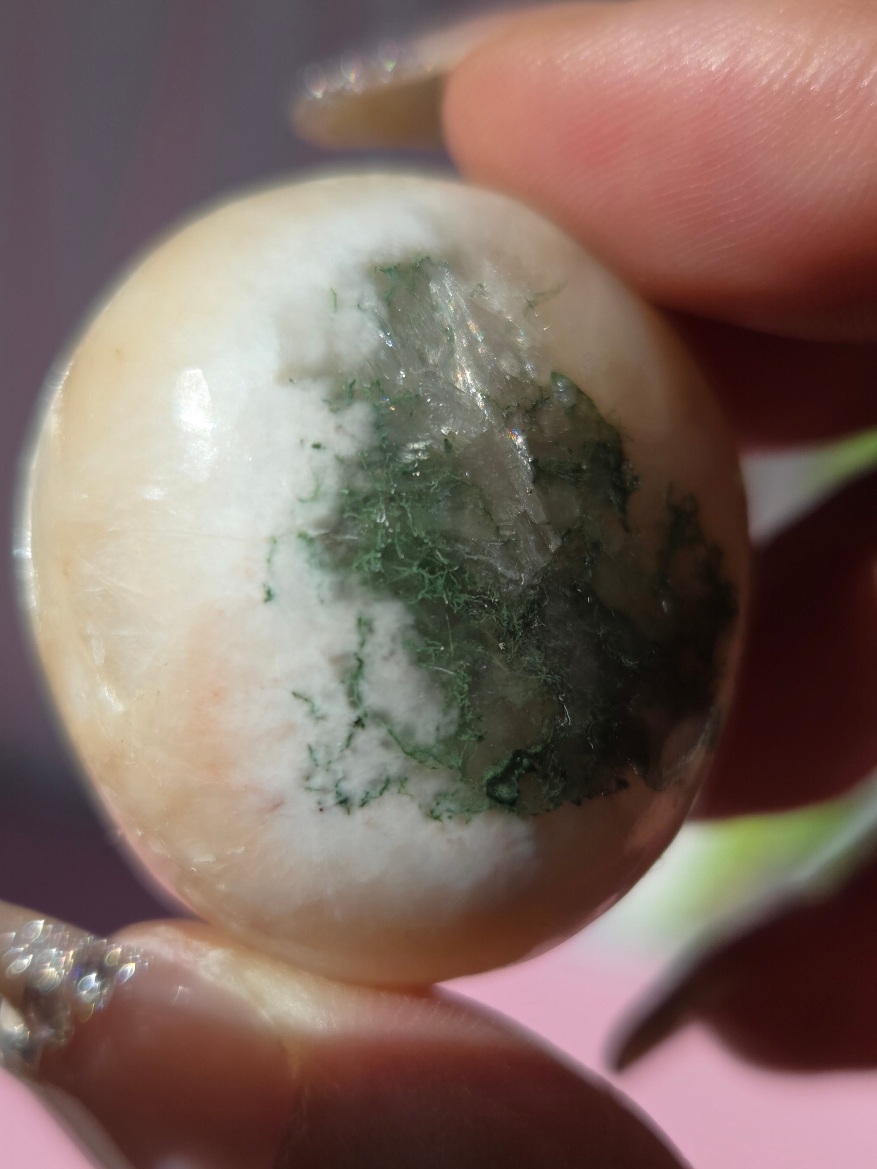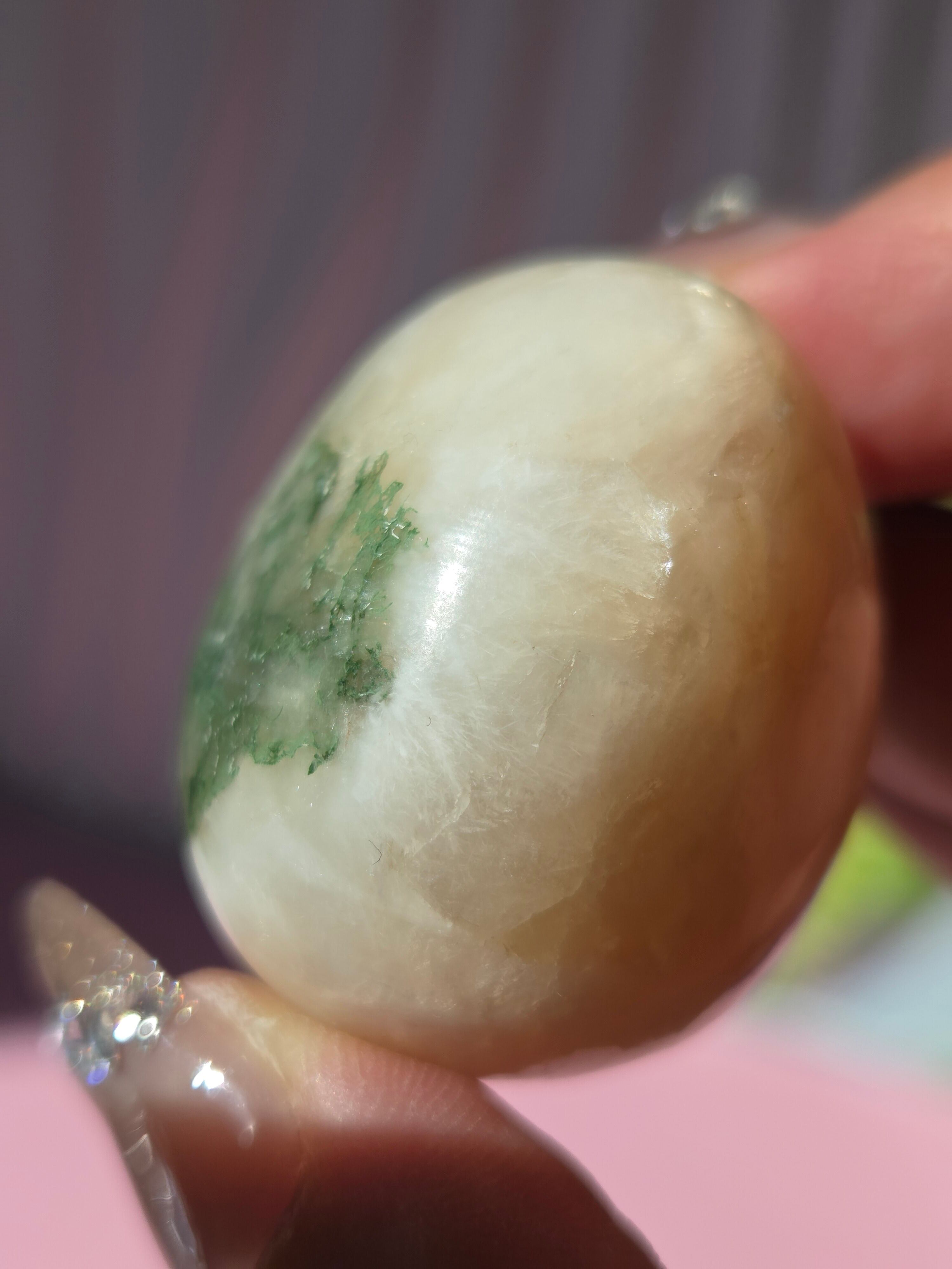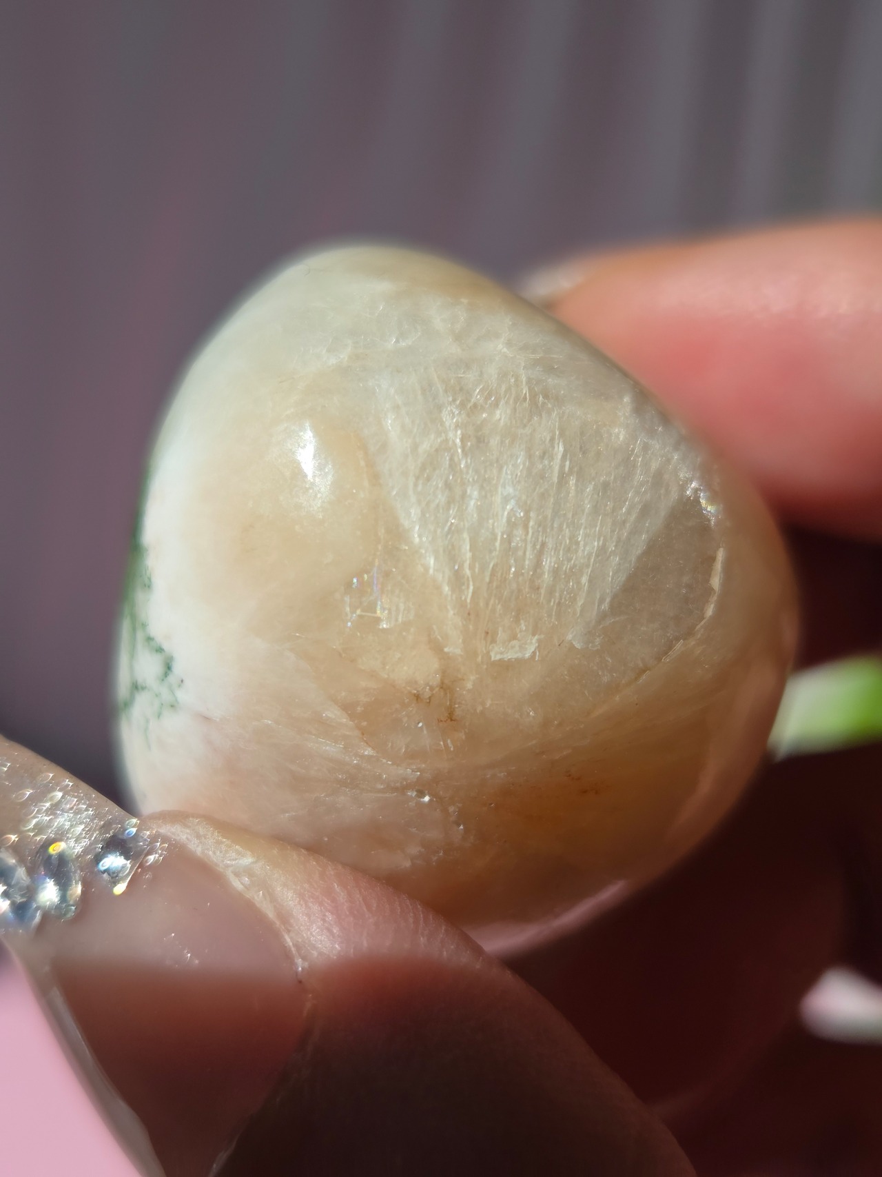 スティルバイトの羽のような優しいシラーに、モスアゲートのグリーンや、ピンクが差し色になり、とても貴重な素敵なタンブルです。