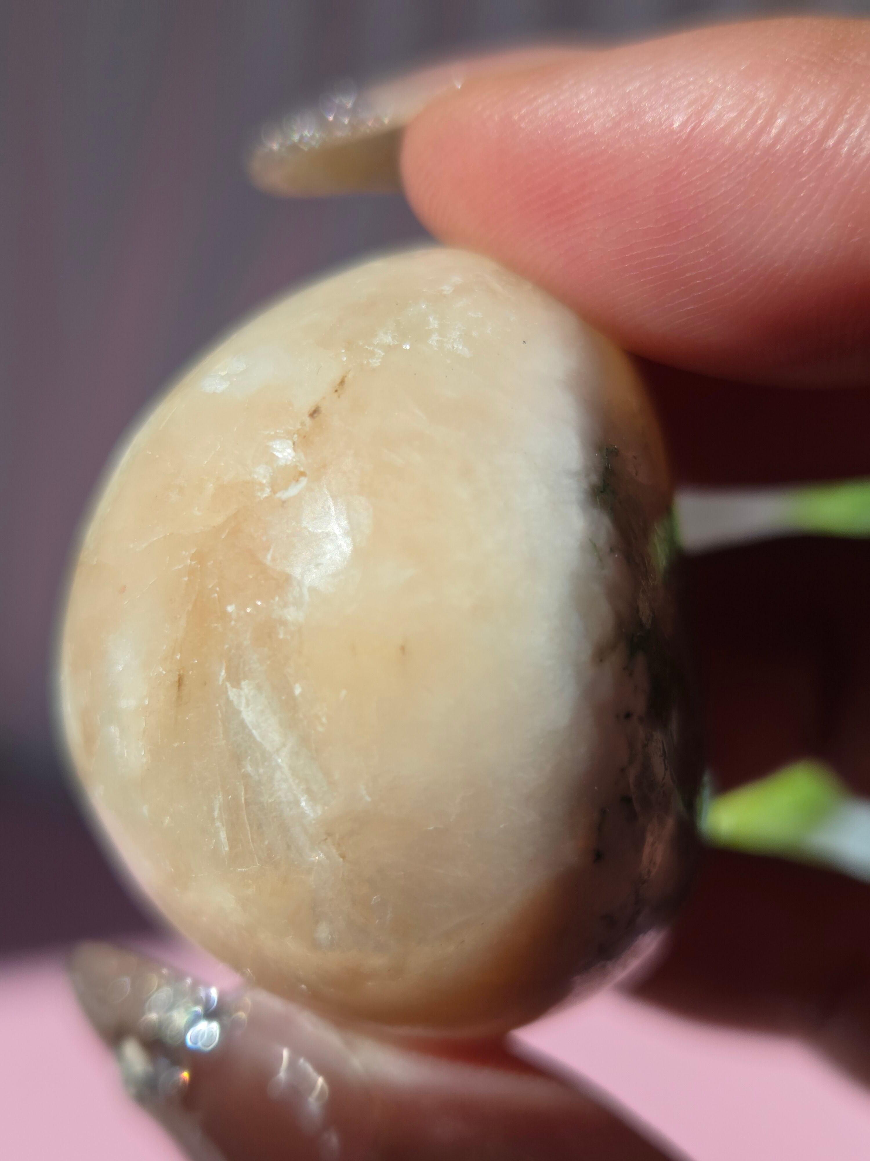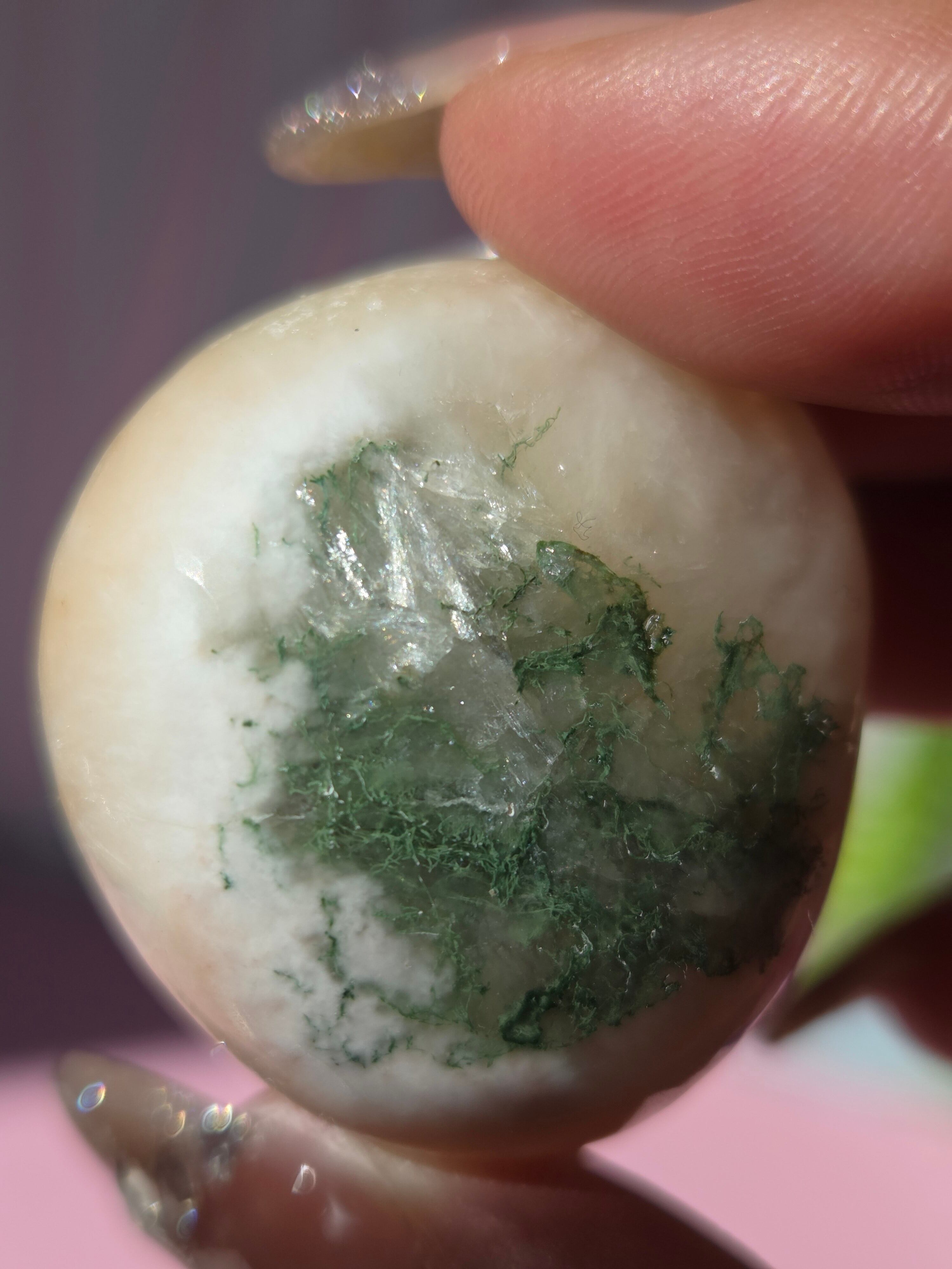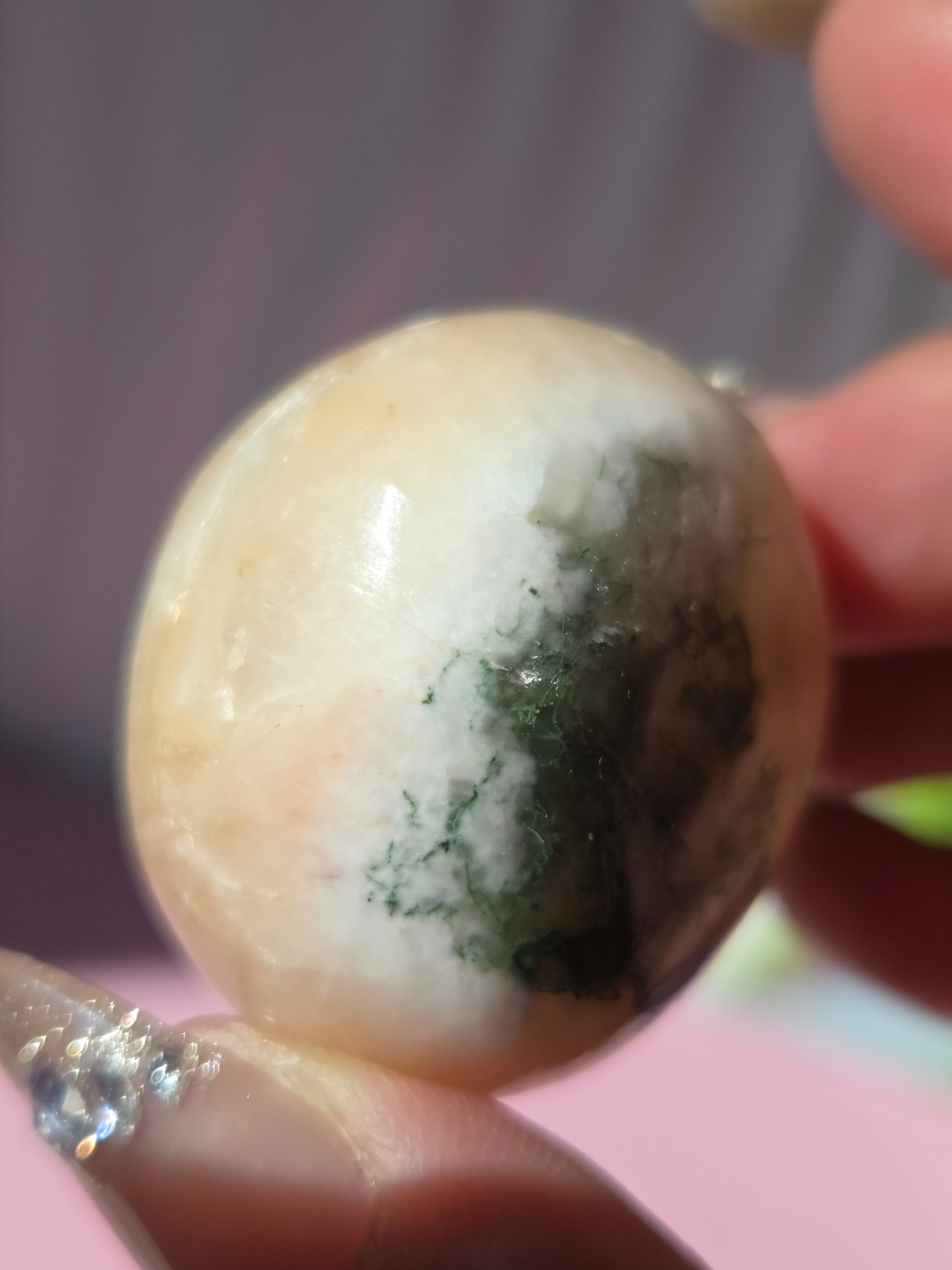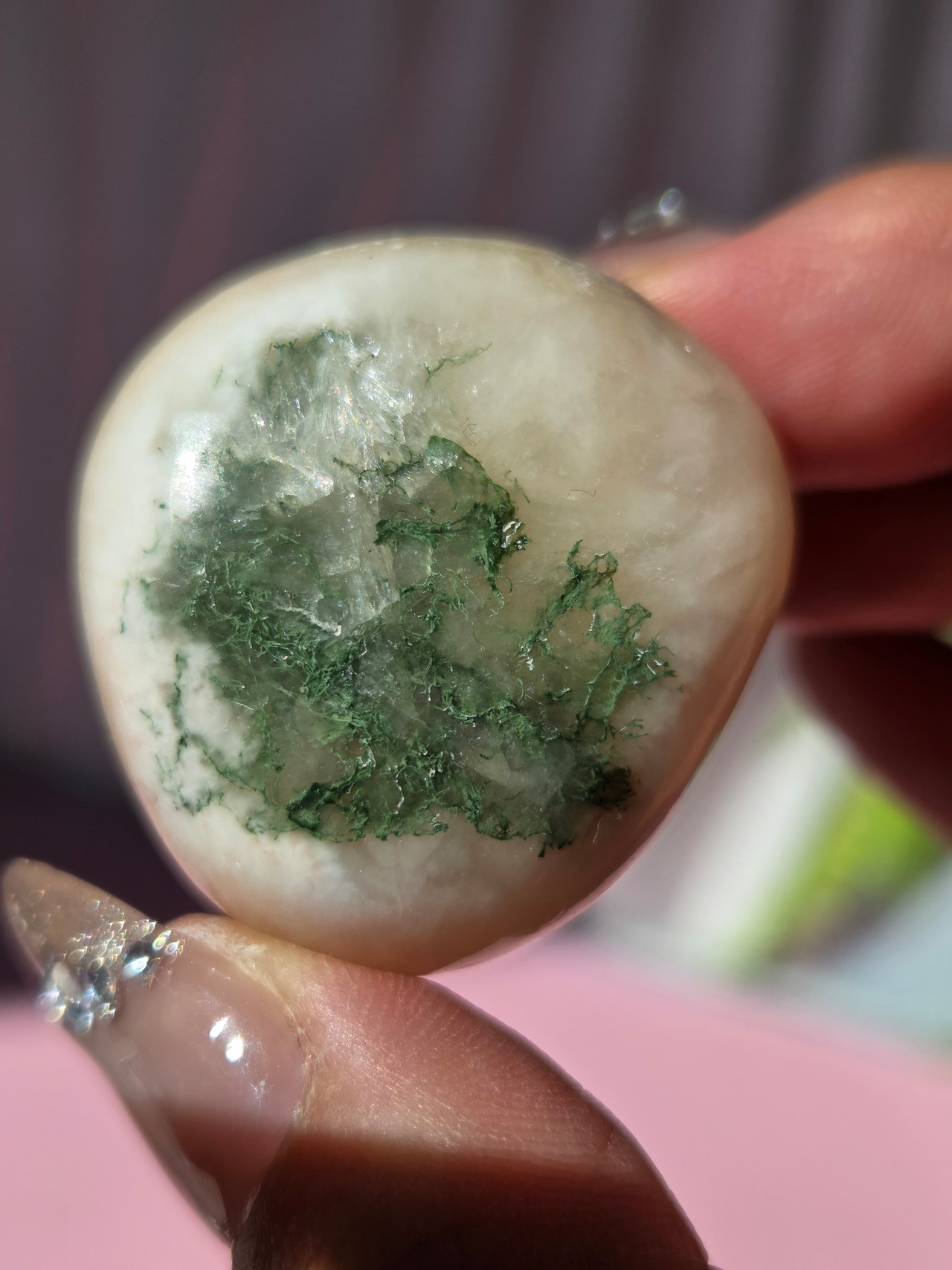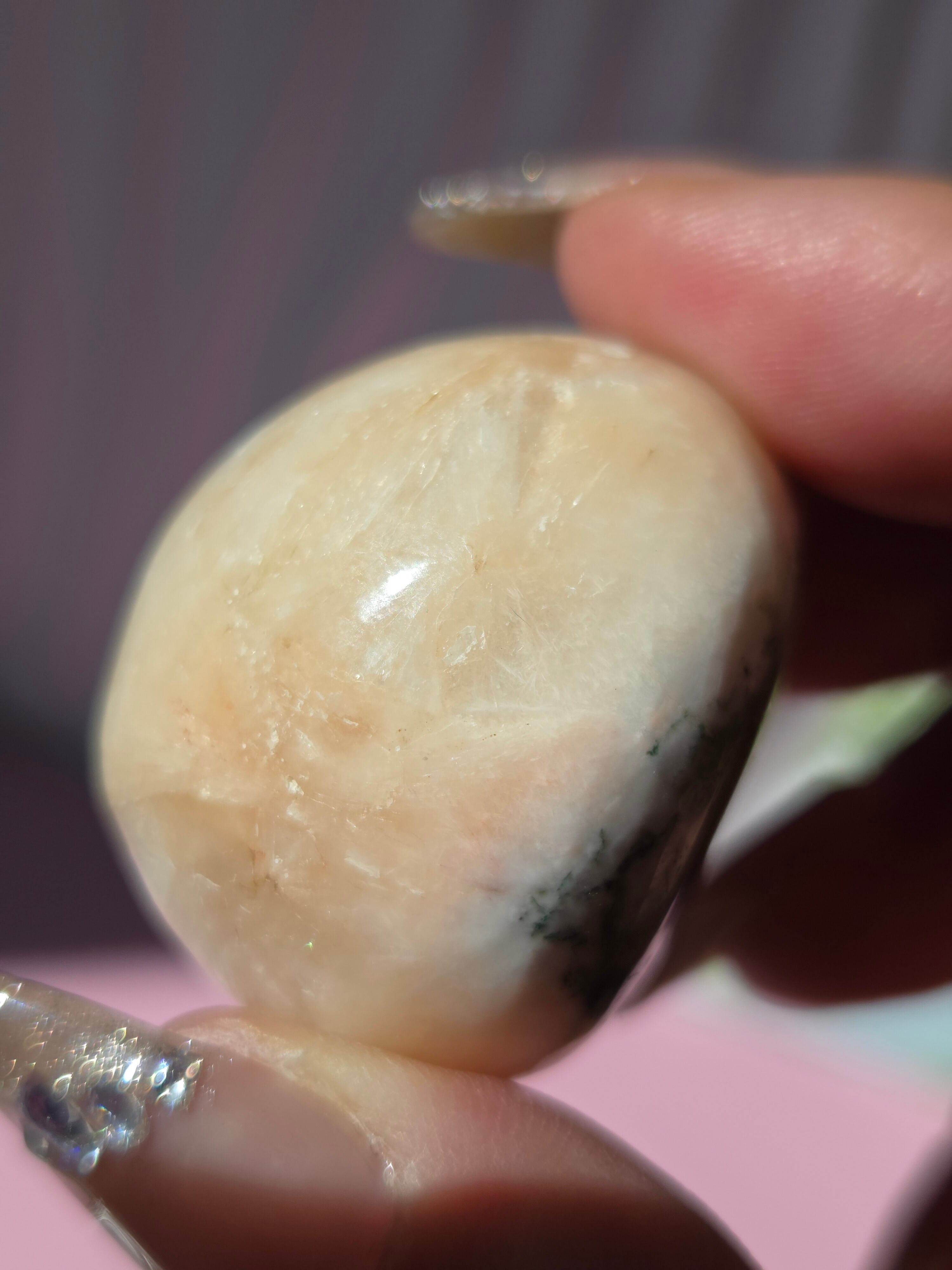 スティルバイトの羽のような優しいシラーに、モスアゲートのグリーンや、ピンクが差し色になり、とても貴重な素敵なタンブルです。