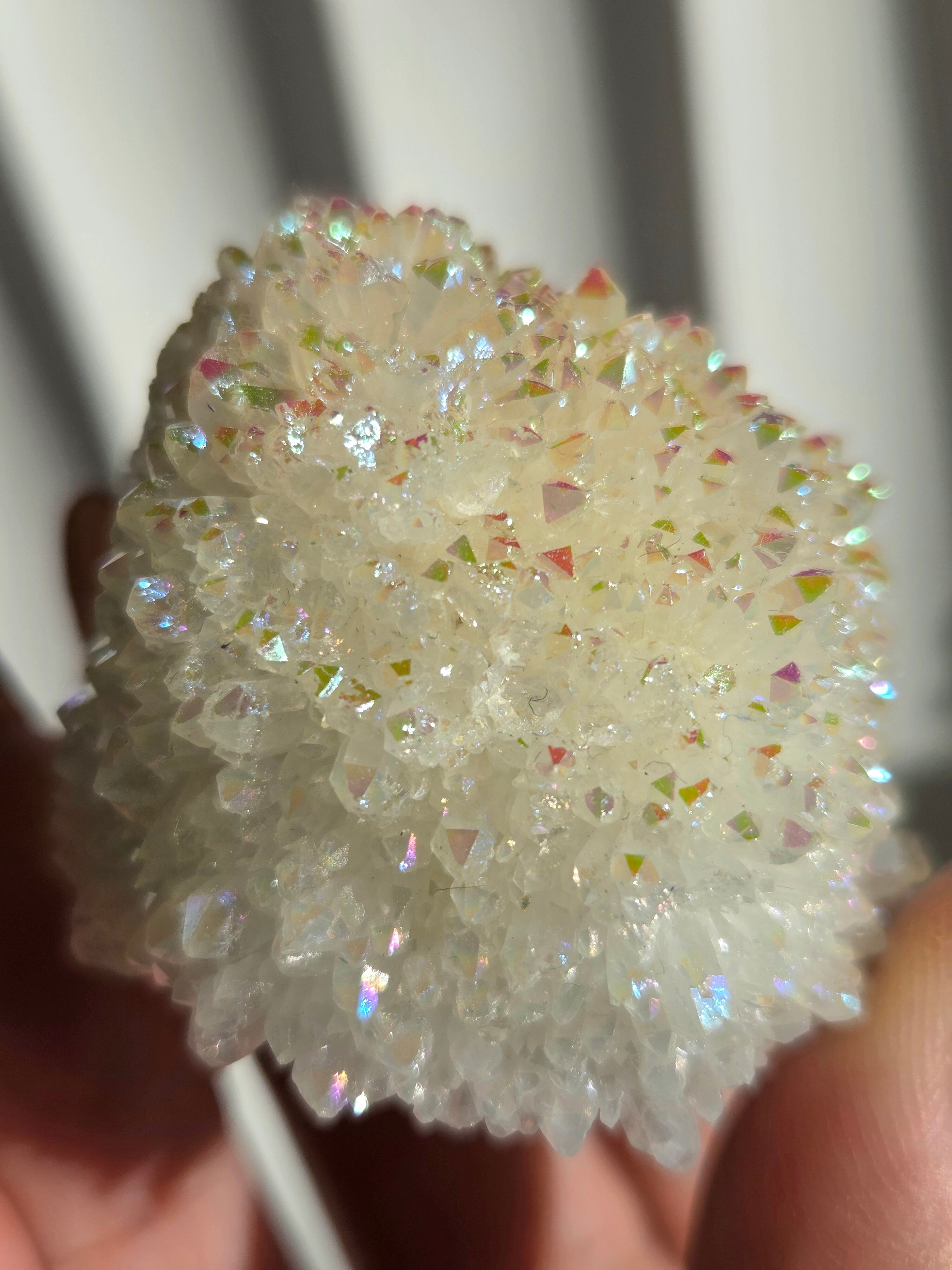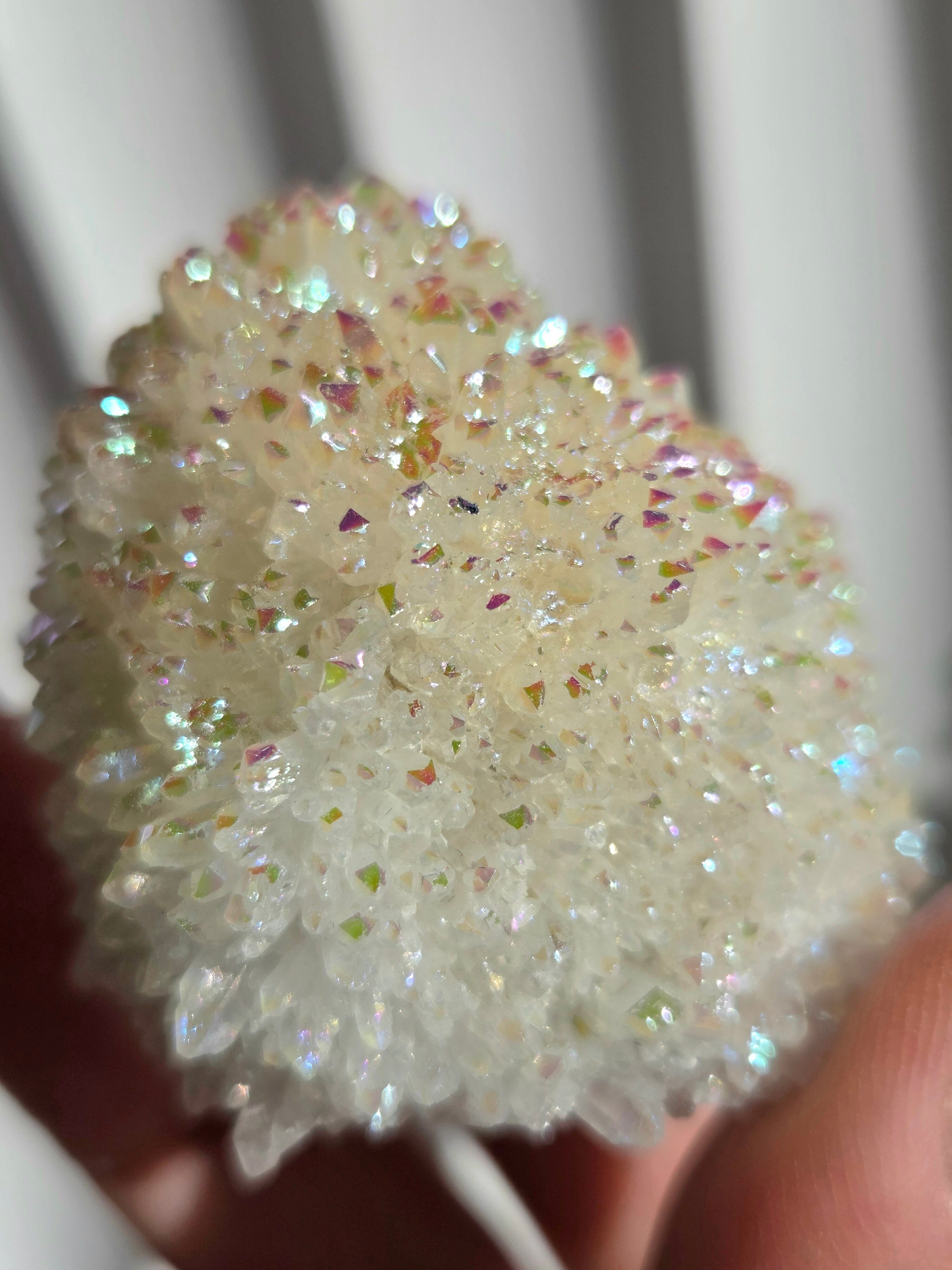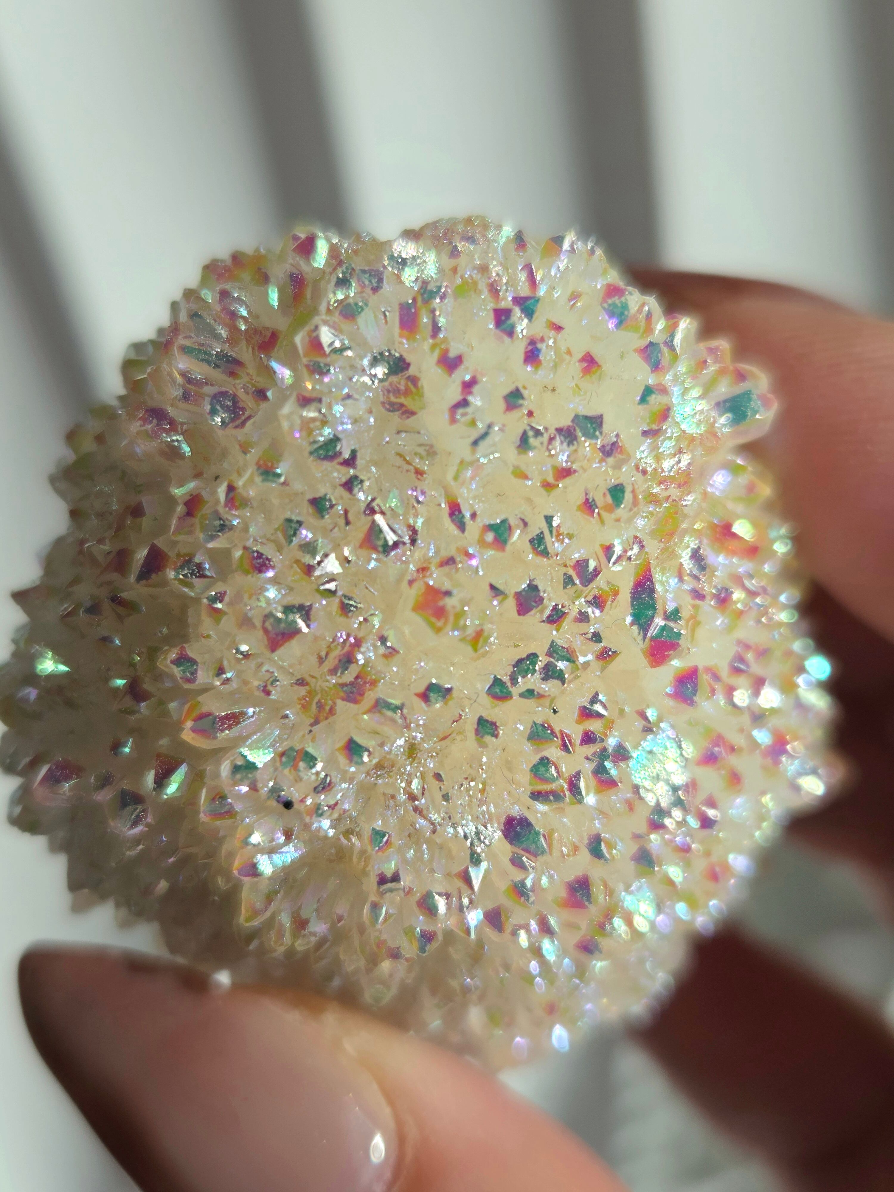 オーラクォーツは、天然の水晶に金やチタンなどの金属を蒸着させて、人工的に虹色の光沢をつけた加工石です。スピリチュアルなブームの中でアメリカで生み出された「新時代のクリスタル」で、エンジェルオーラやアクアオーラなど色によって様々な呼び方があります。パワーストーンとして、「活力や希望を与え、成功へ導く」「ネガティブなエネルギーを浄化する」といった意味を持つとされています。