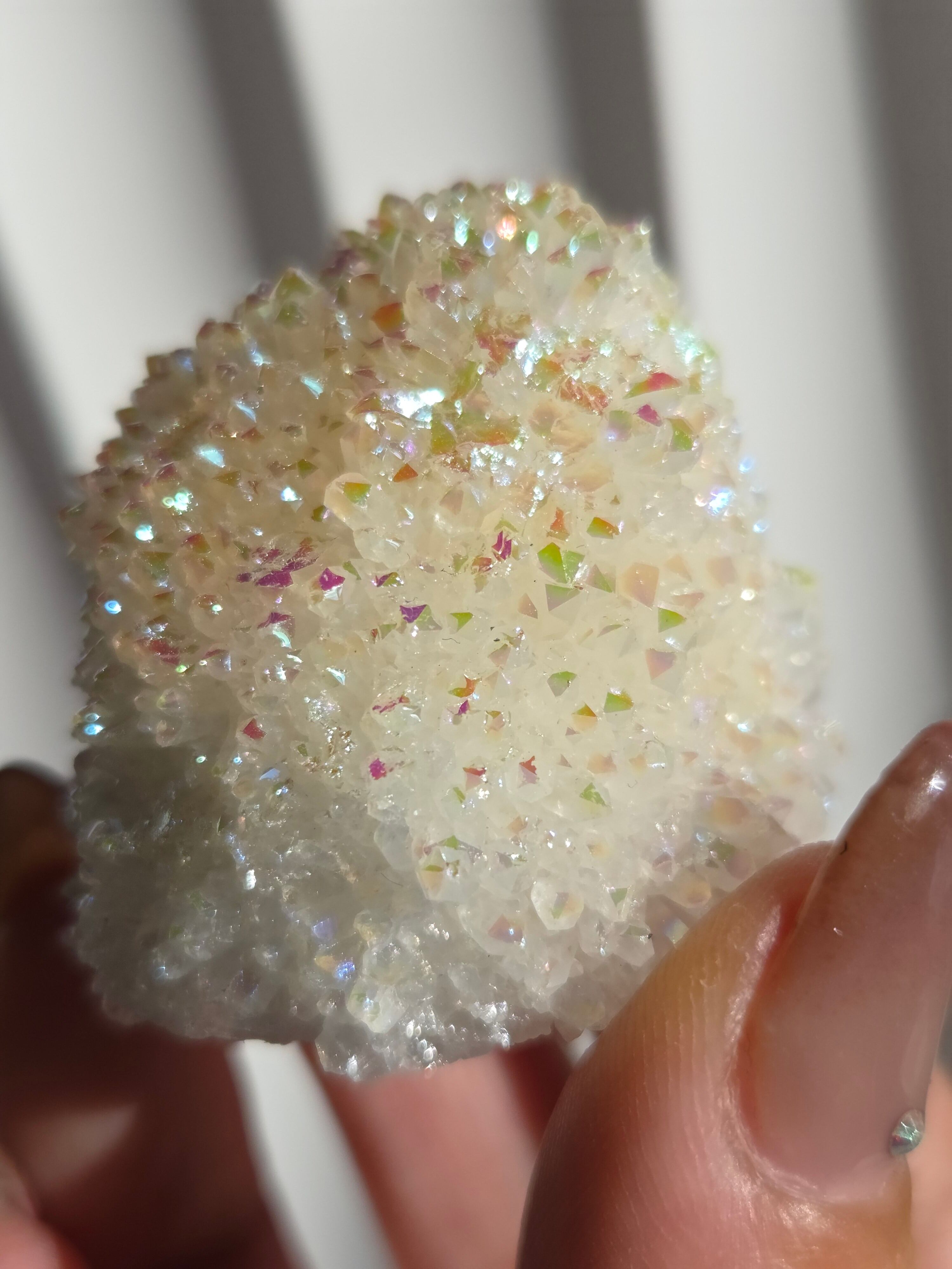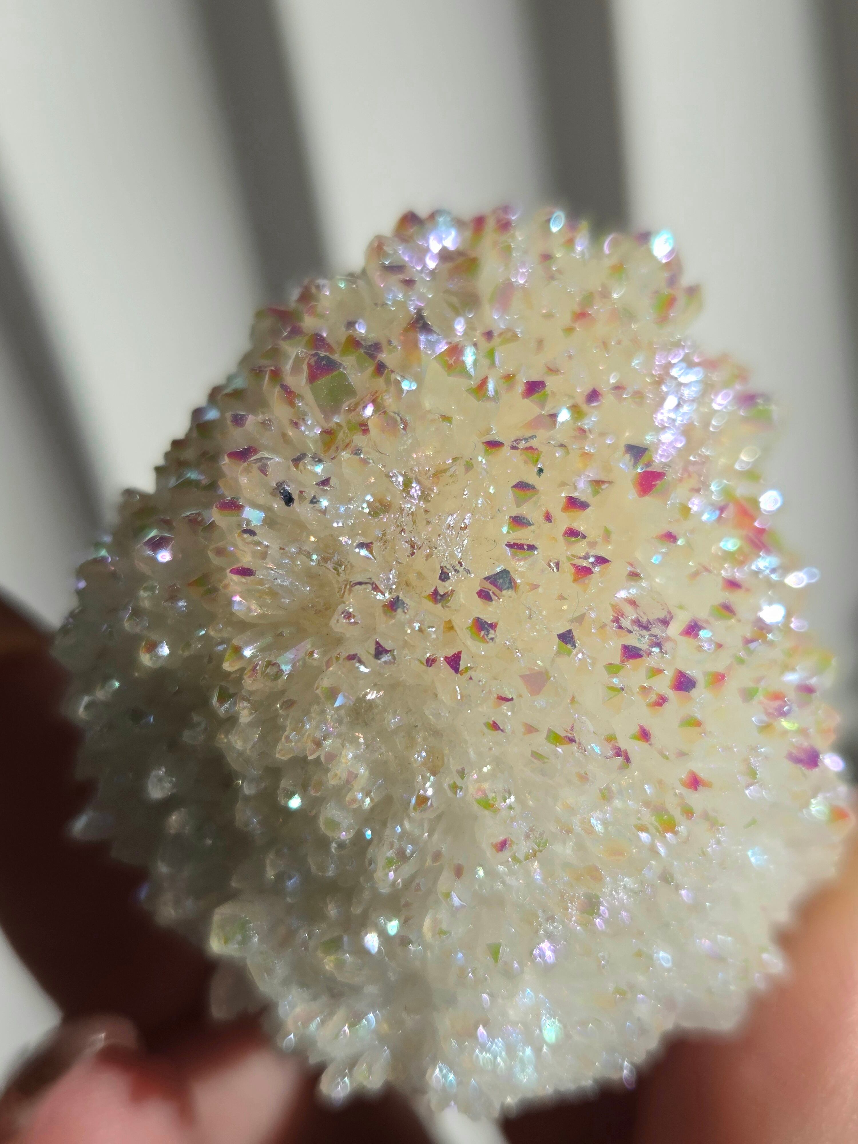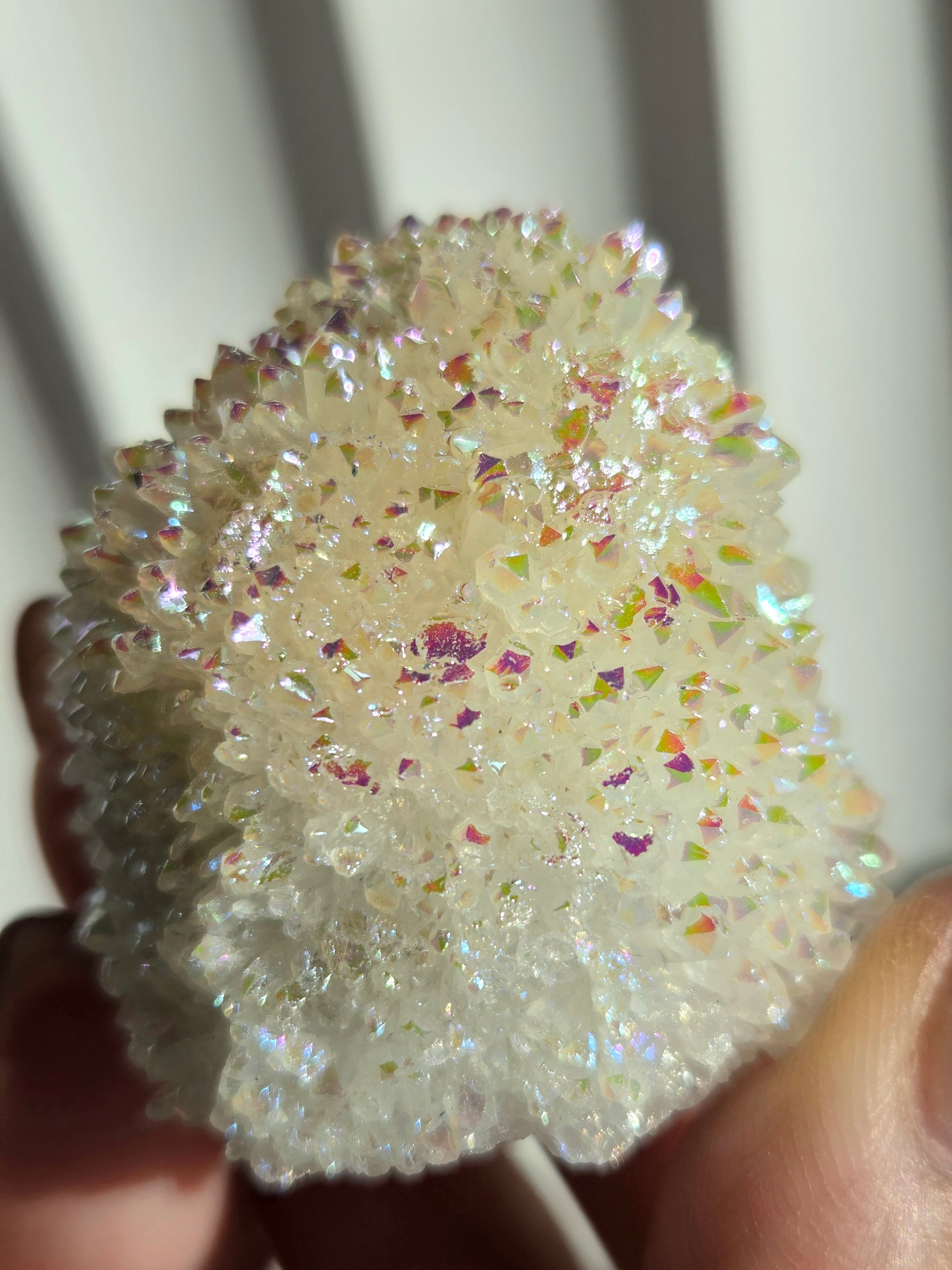 オーラクォーツは、天然の水晶に金やチタンなどの金属を蒸着させて、人工的に虹色の光沢をつけた加工石です。スピリチュアルなブームの中でアメリカで生み出された「新時代のクリスタル」で、エンジェルオーラやアクアオーラなど色によって様々な呼び方があります。パワーストーンとして、「活力や希望を与え、成功へ導く」「ネガティブなエネルギーを浄化する」といった意味を持つとされています。
