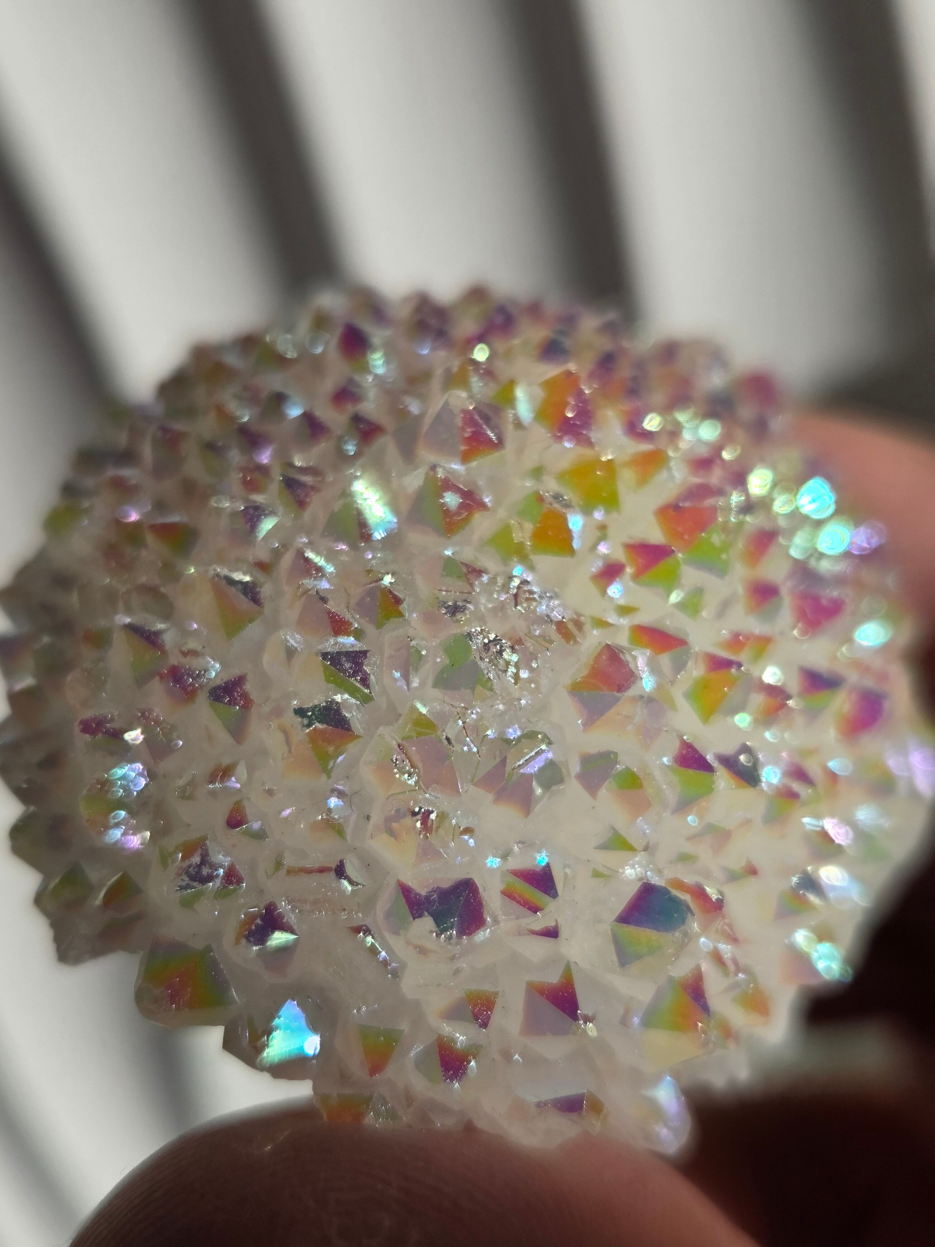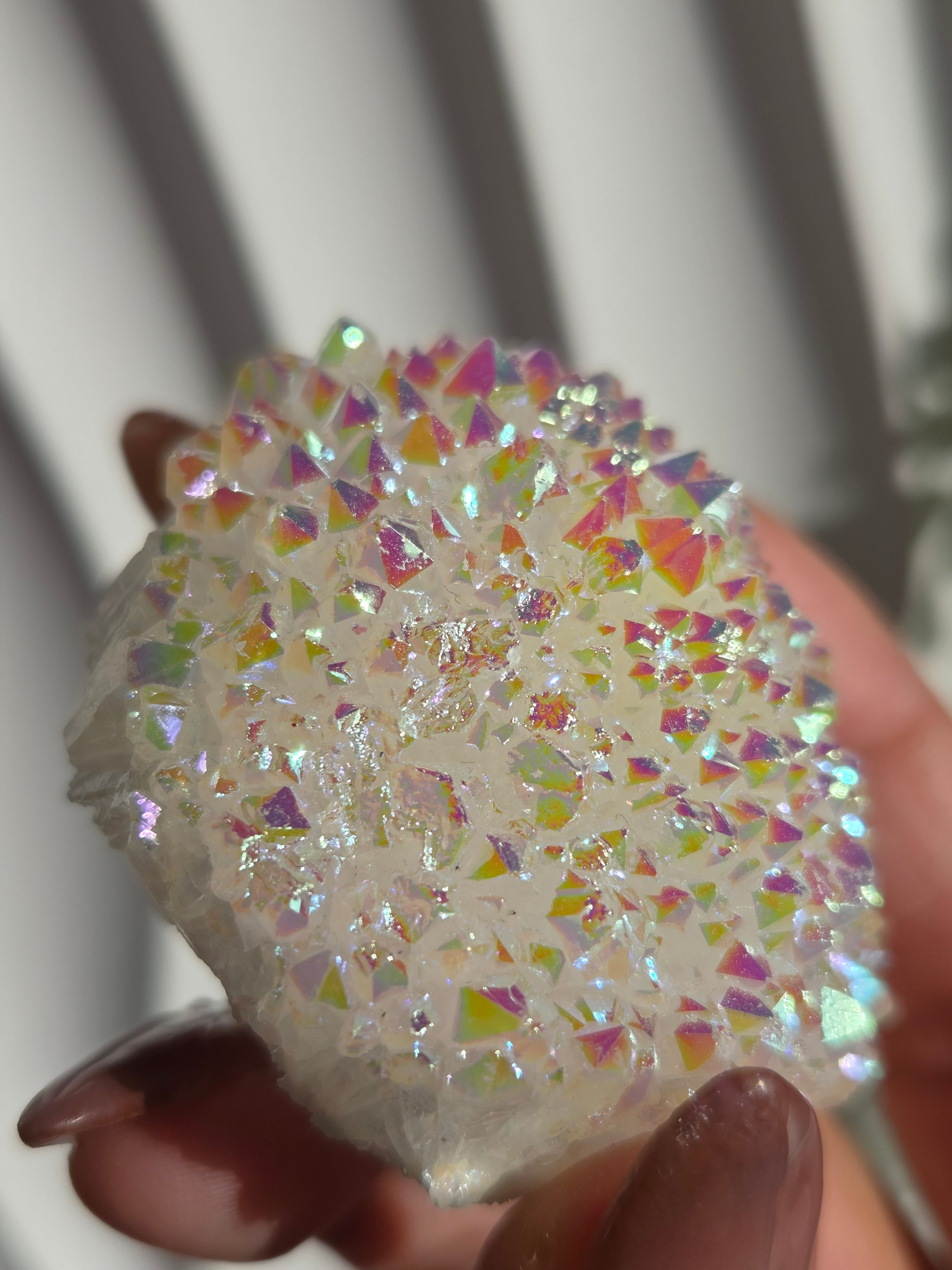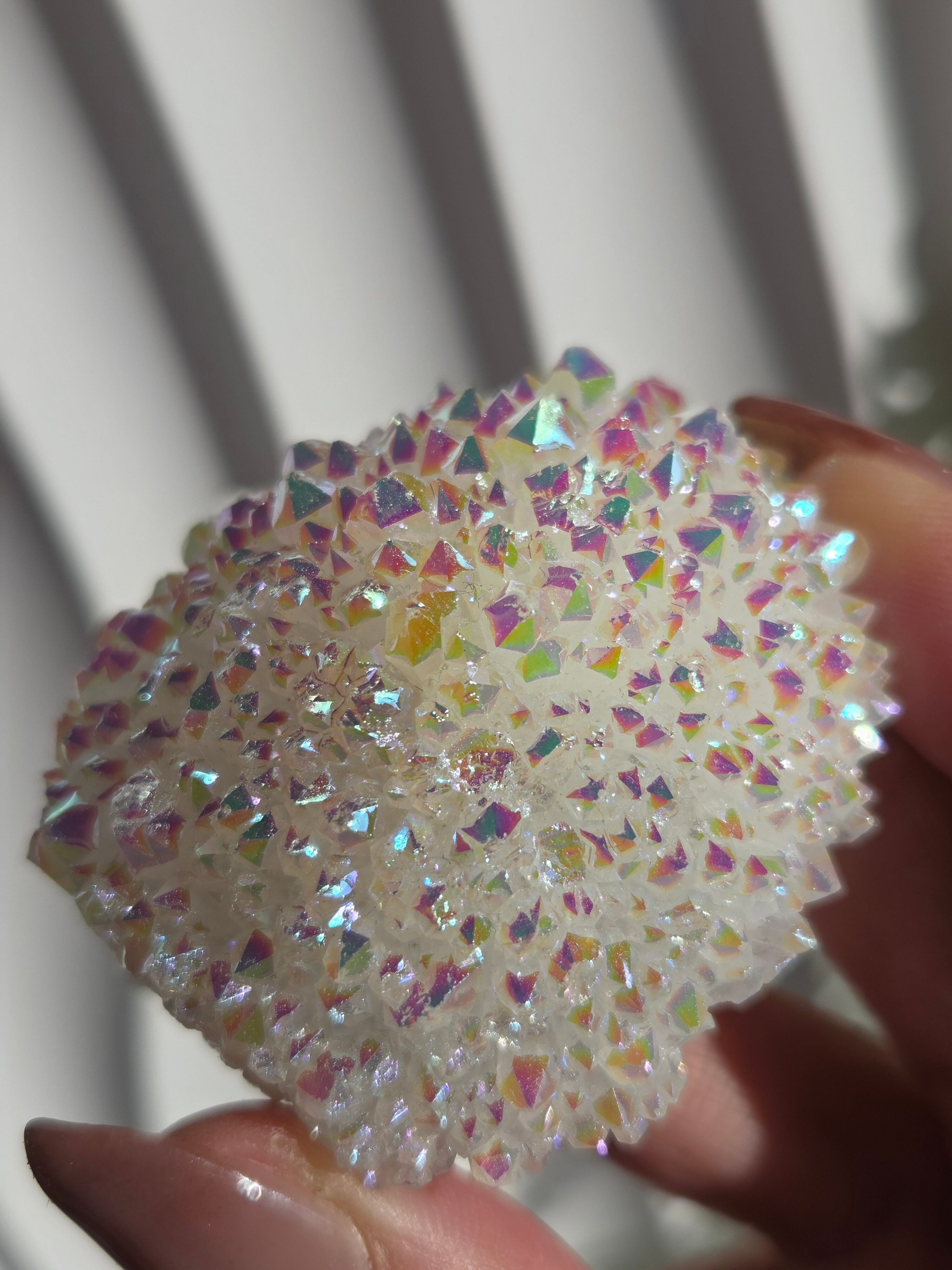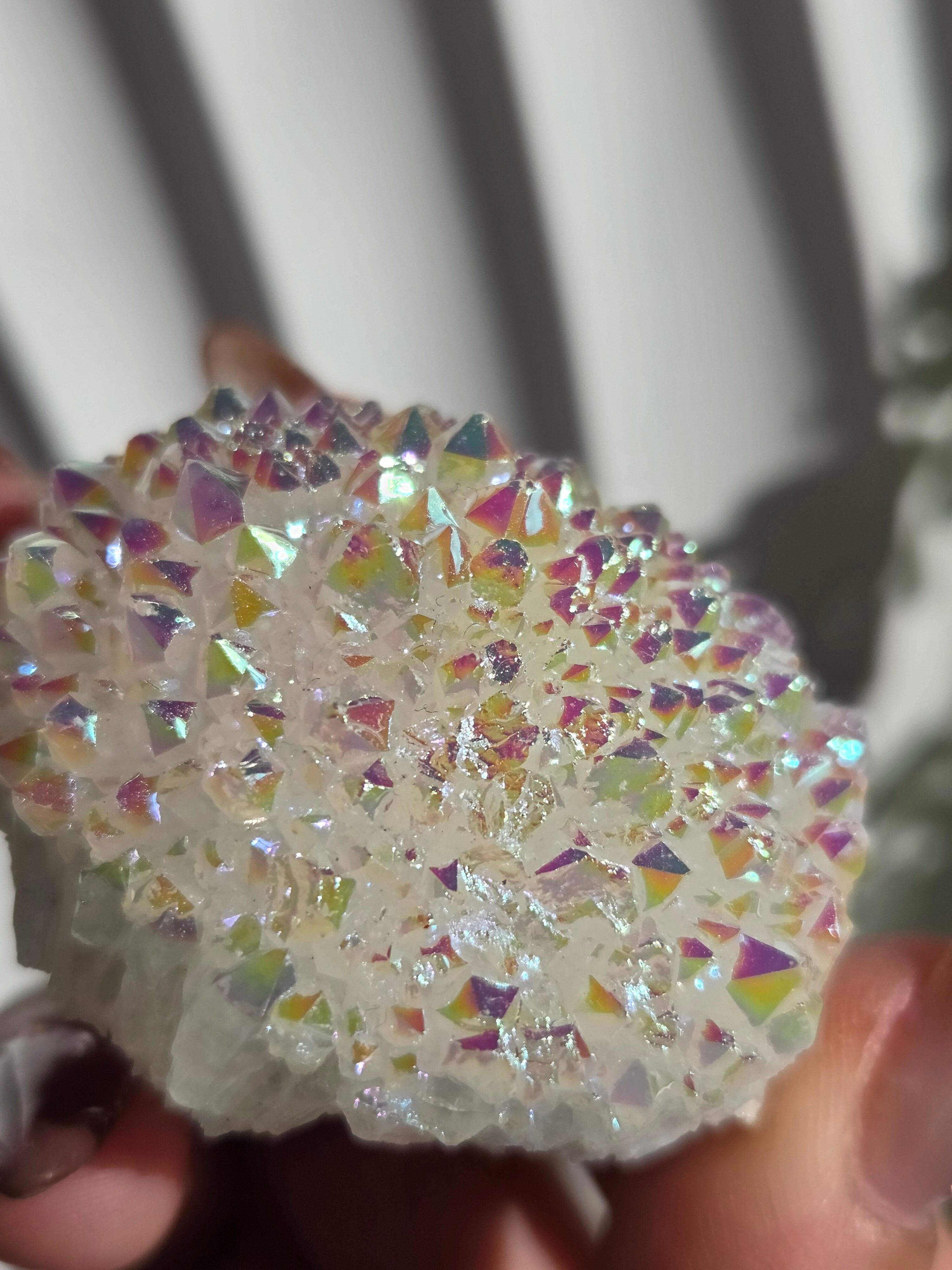 オーラクォーツは、天然の水晶に金やチタンなどの金属を蒸着させて、人工的に虹色の光沢をつけた加工石です。スピリチュアルなブームの中でアメリカで生み出された「新時代のクリスタル」で、エンジェルオーラやアクアオーラなど色によって様々な呼び方があります。パワーストーンとして、「活力や希望を与え、成功へ導く」「ネガティブなエネルギーを浄化する」といった意味を持つとされています。