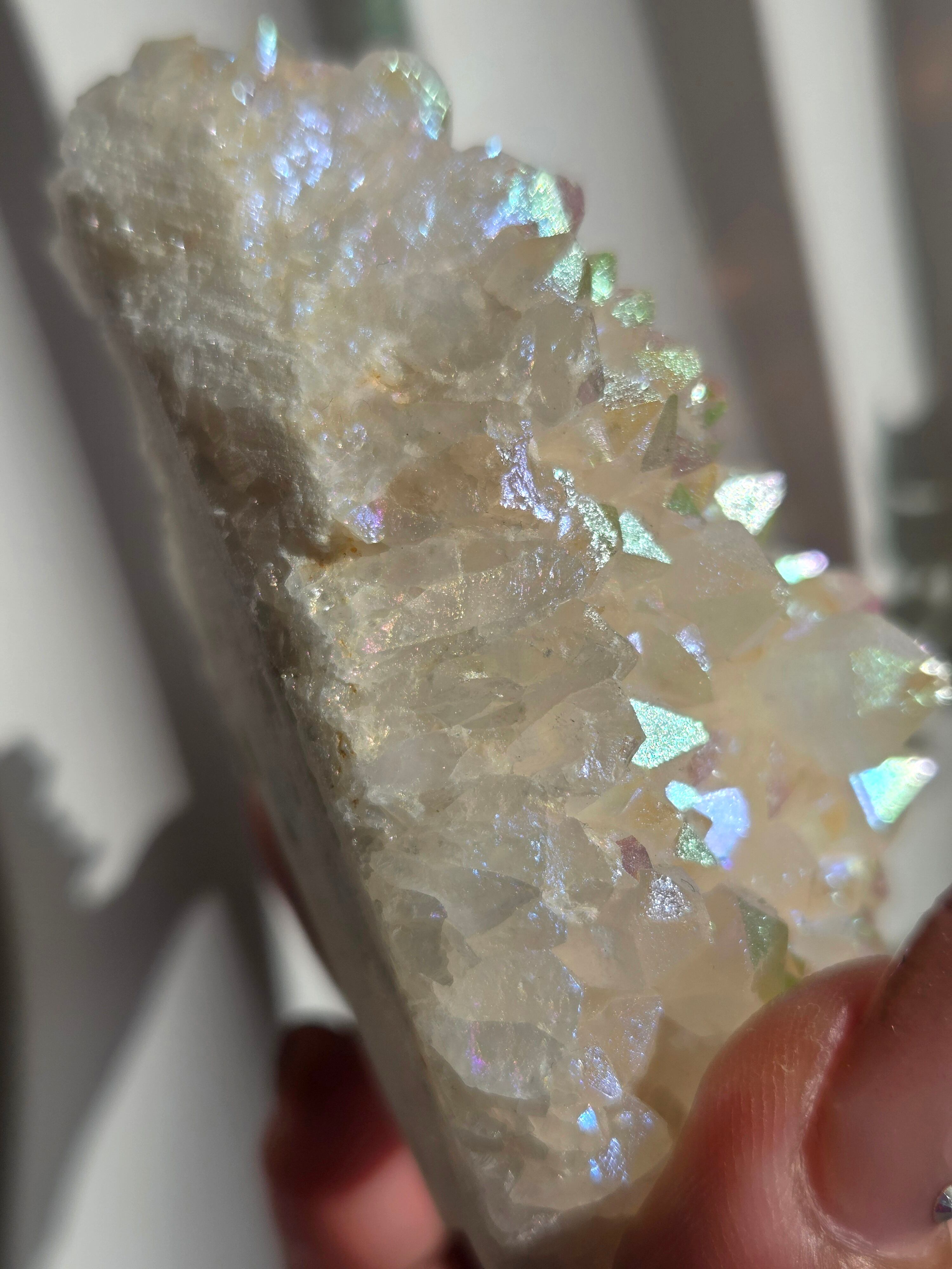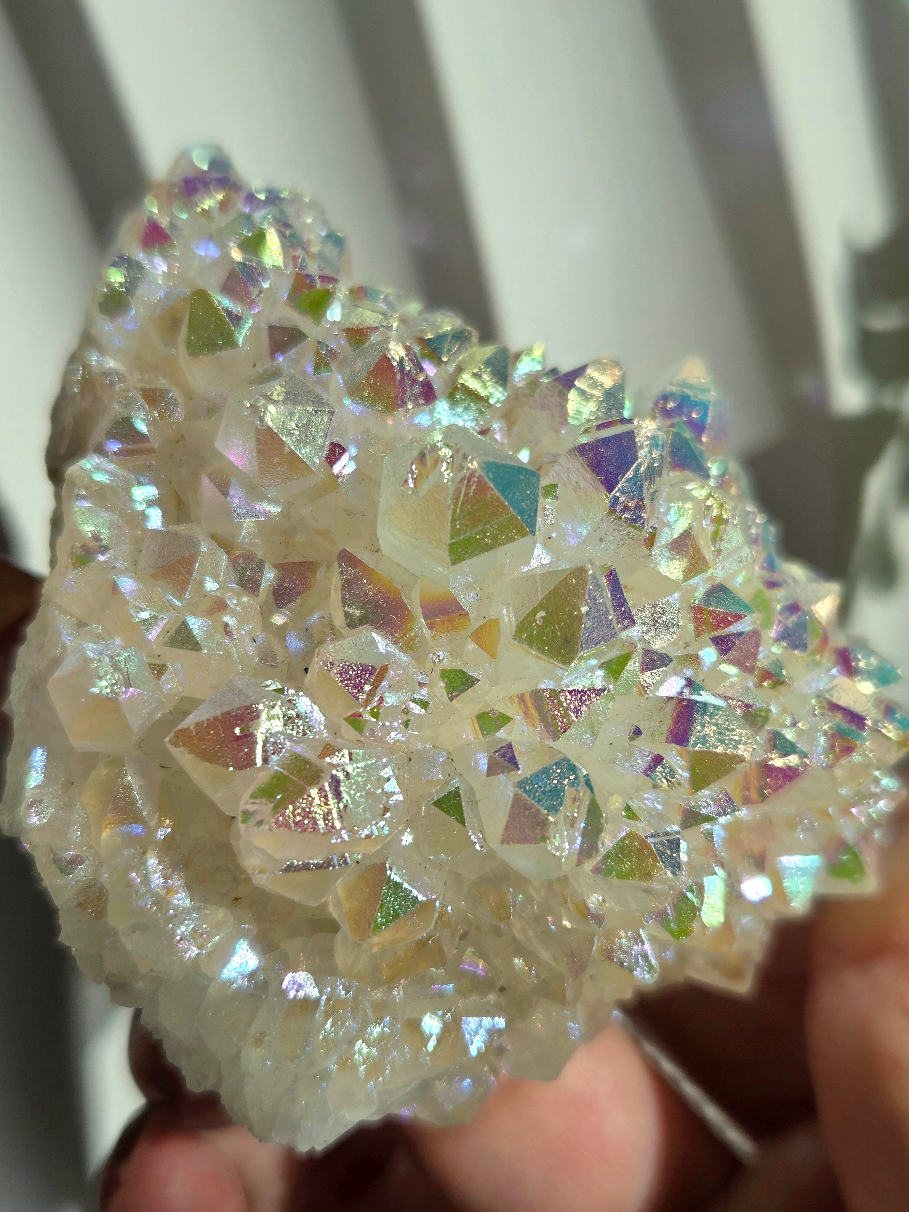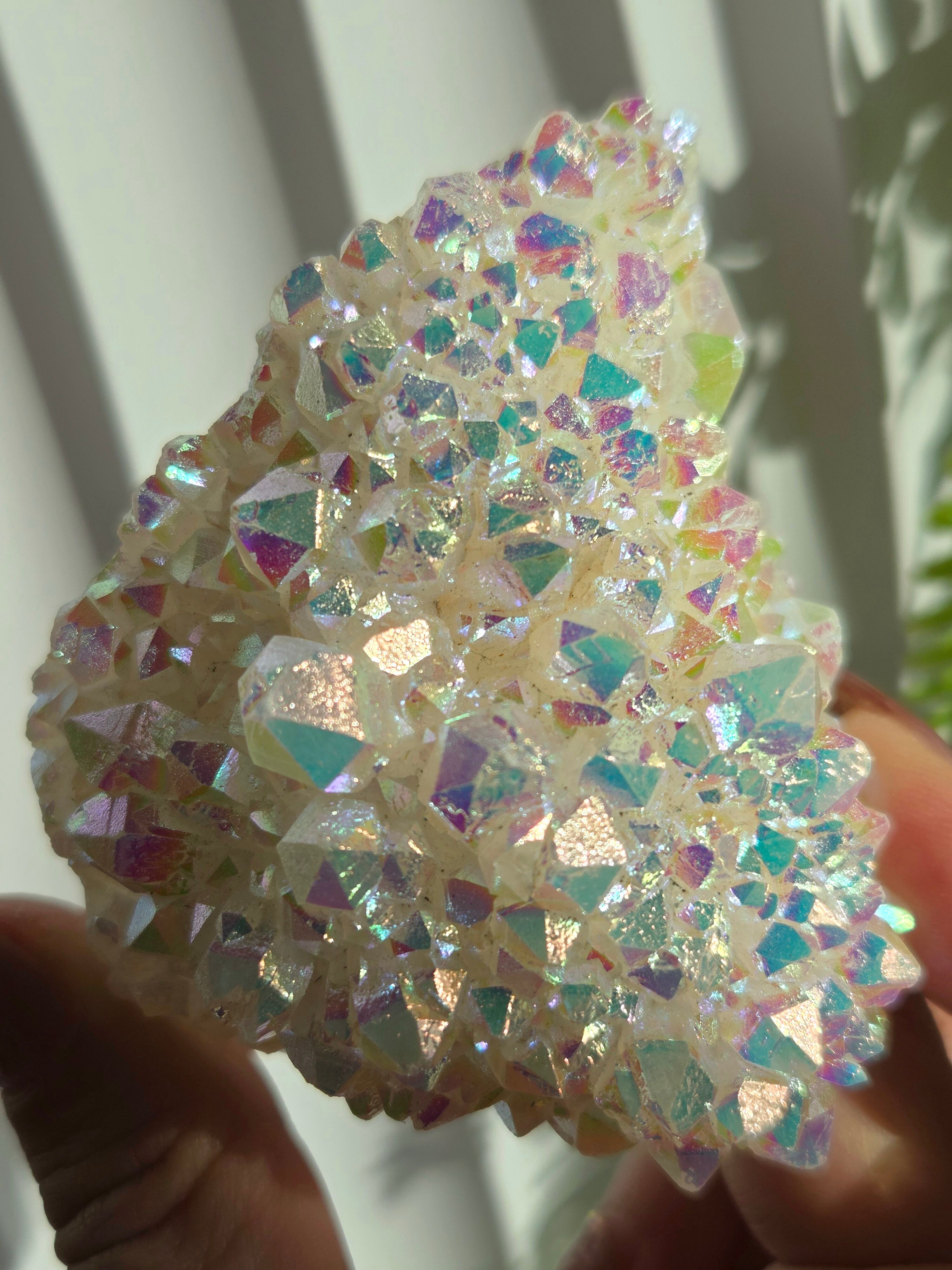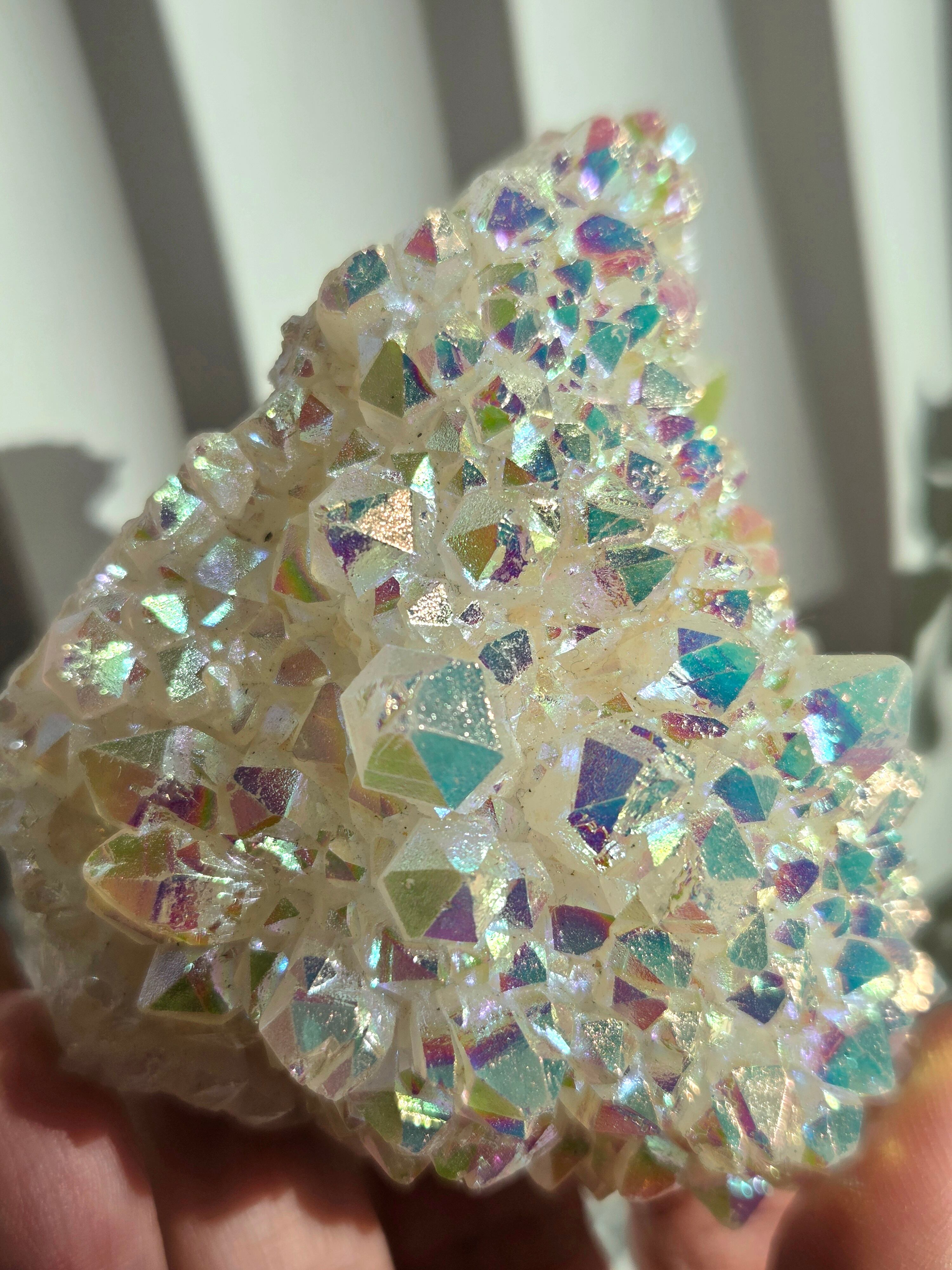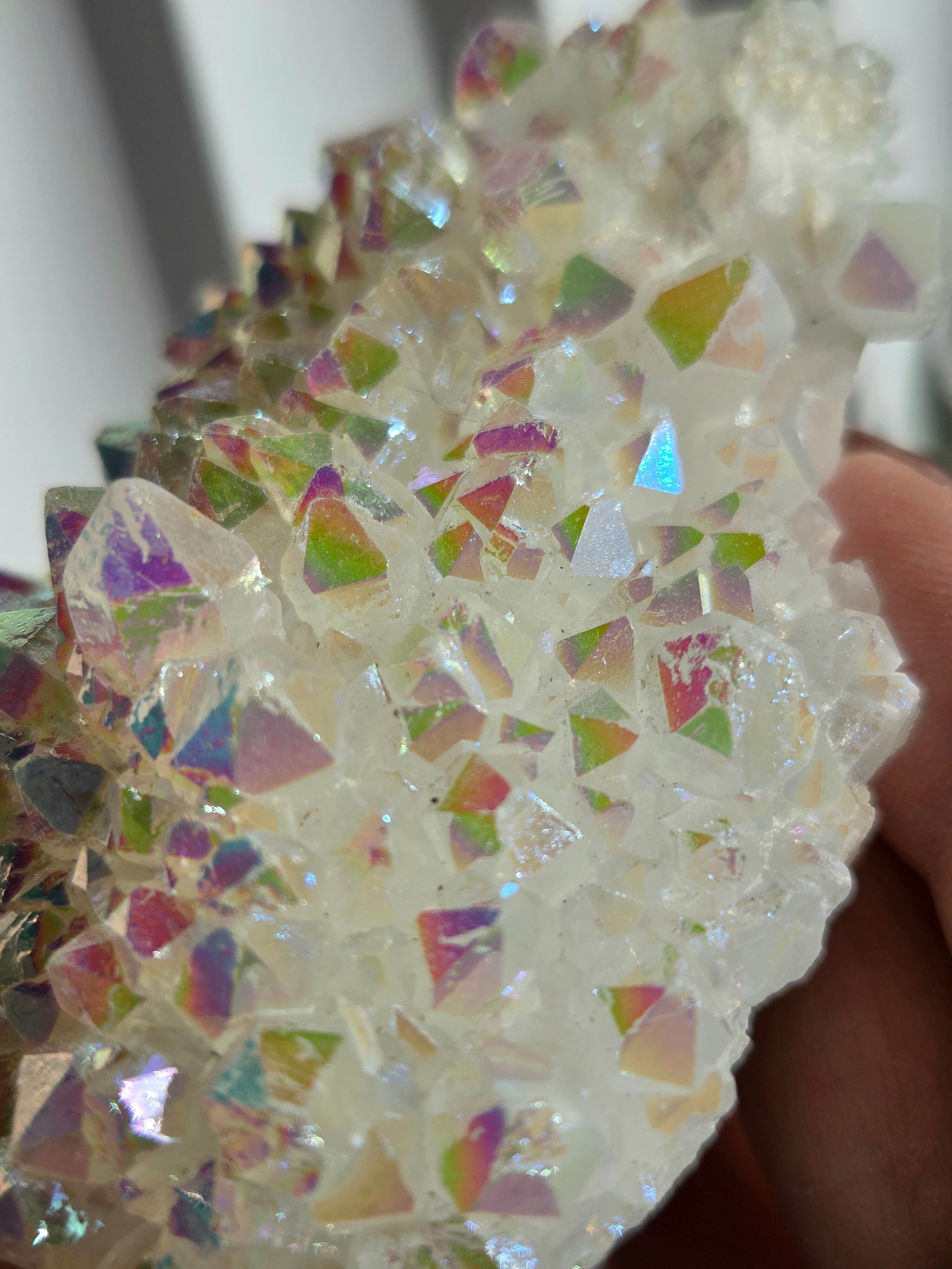 オーラクォーツは、天然の水晶に金やチタンなどの金属を蒸着させて、人工的に虹色の光沢をつけた加工石です。スピリチュアルなブームの中でアメリカで生み出された「新時代のクリスタル」で、エンジェルオーラやアクアオーラなど色によって様々な呼び方があります。パワーストーンとして、「活力や希望を与え、成功へ導く」「ネガティブなエネルギーを浄化する」といった意味を持つとされています。