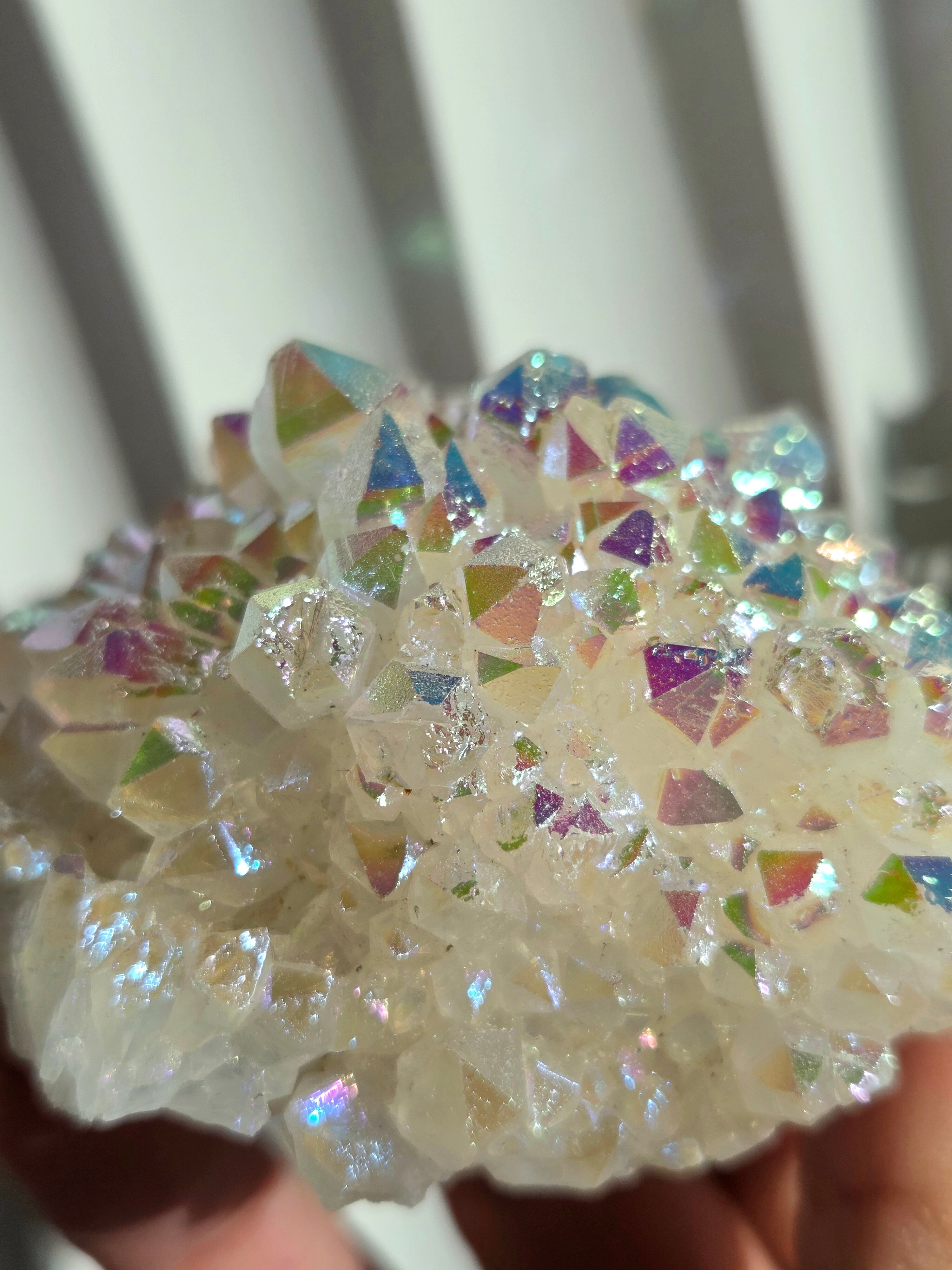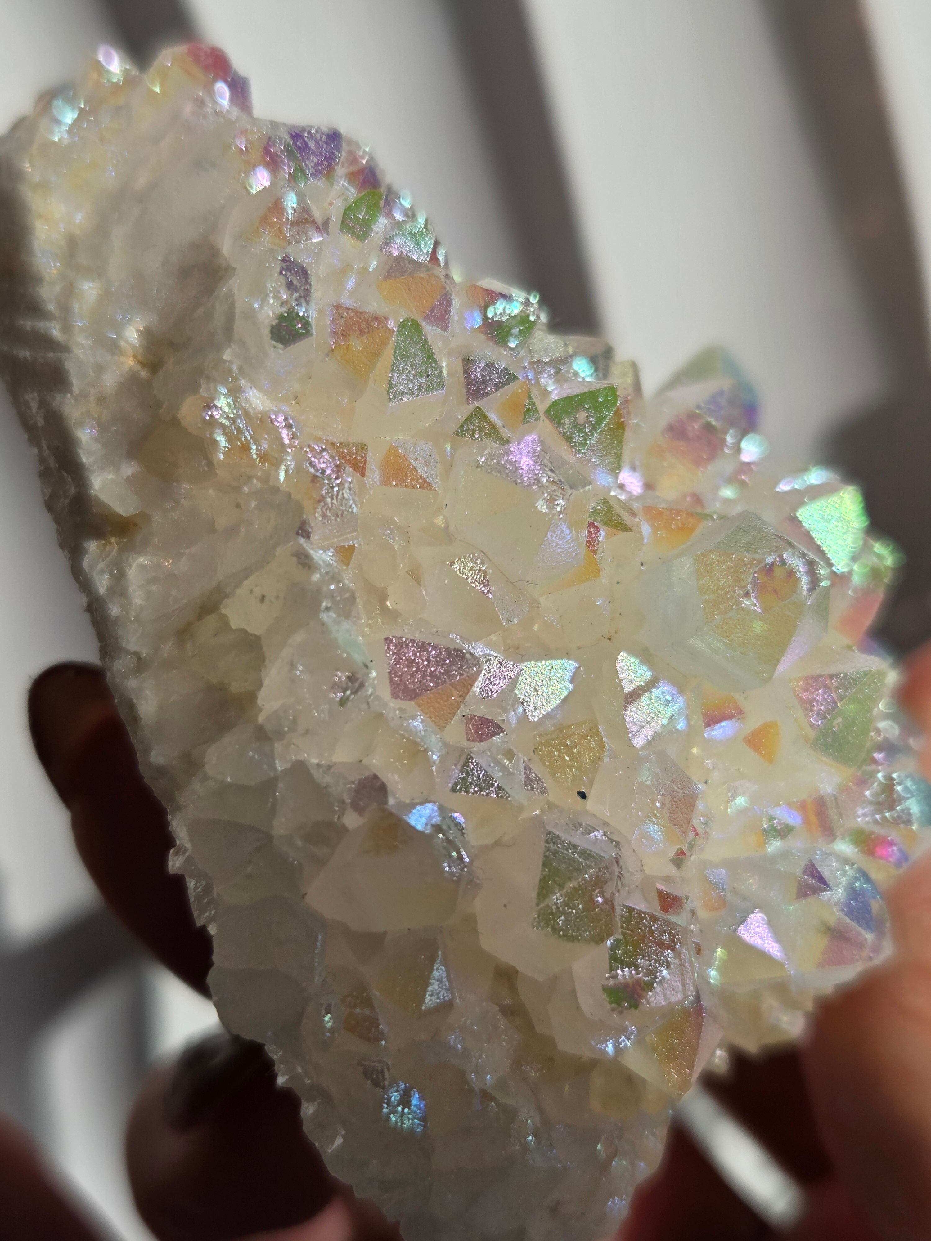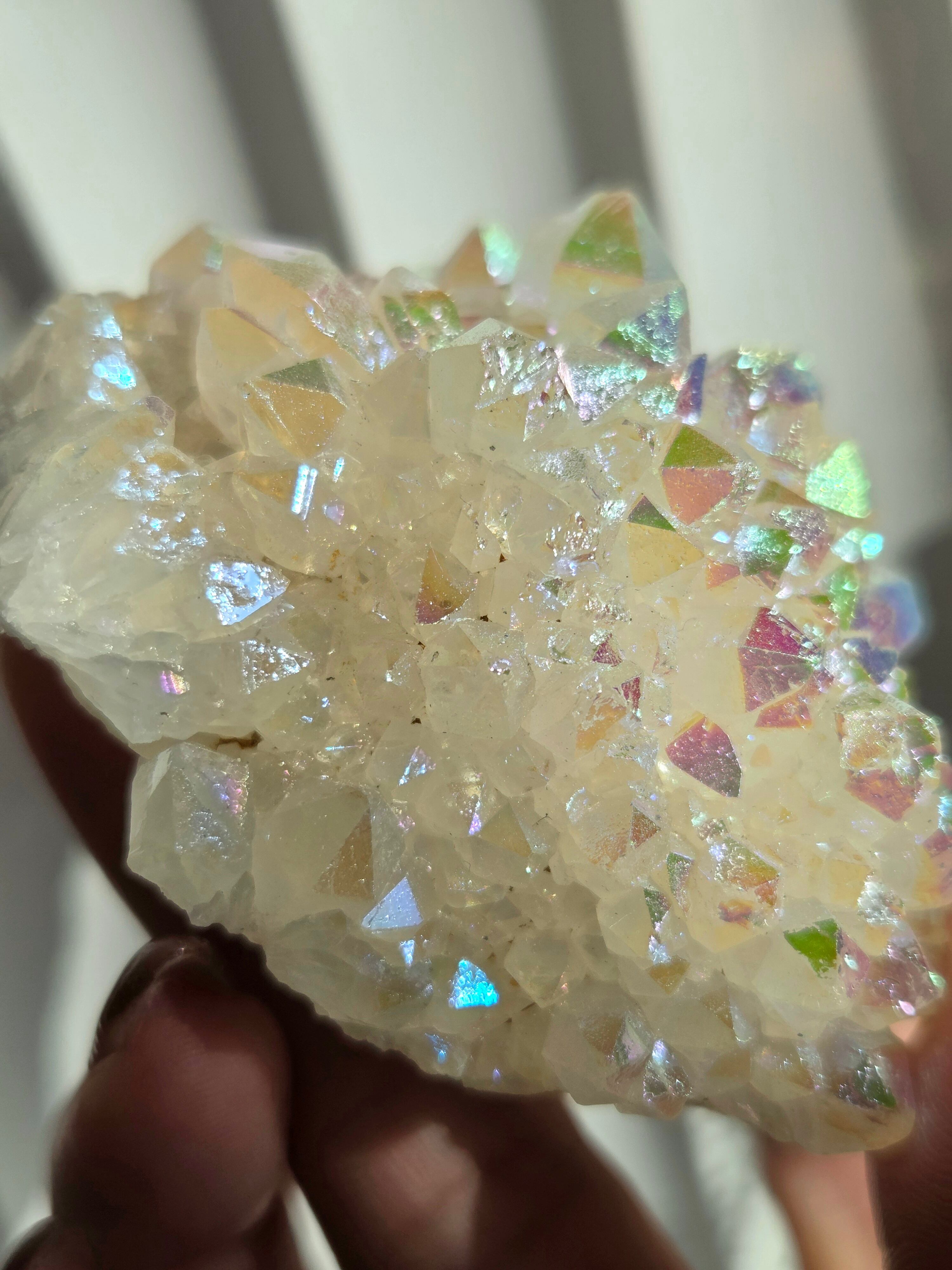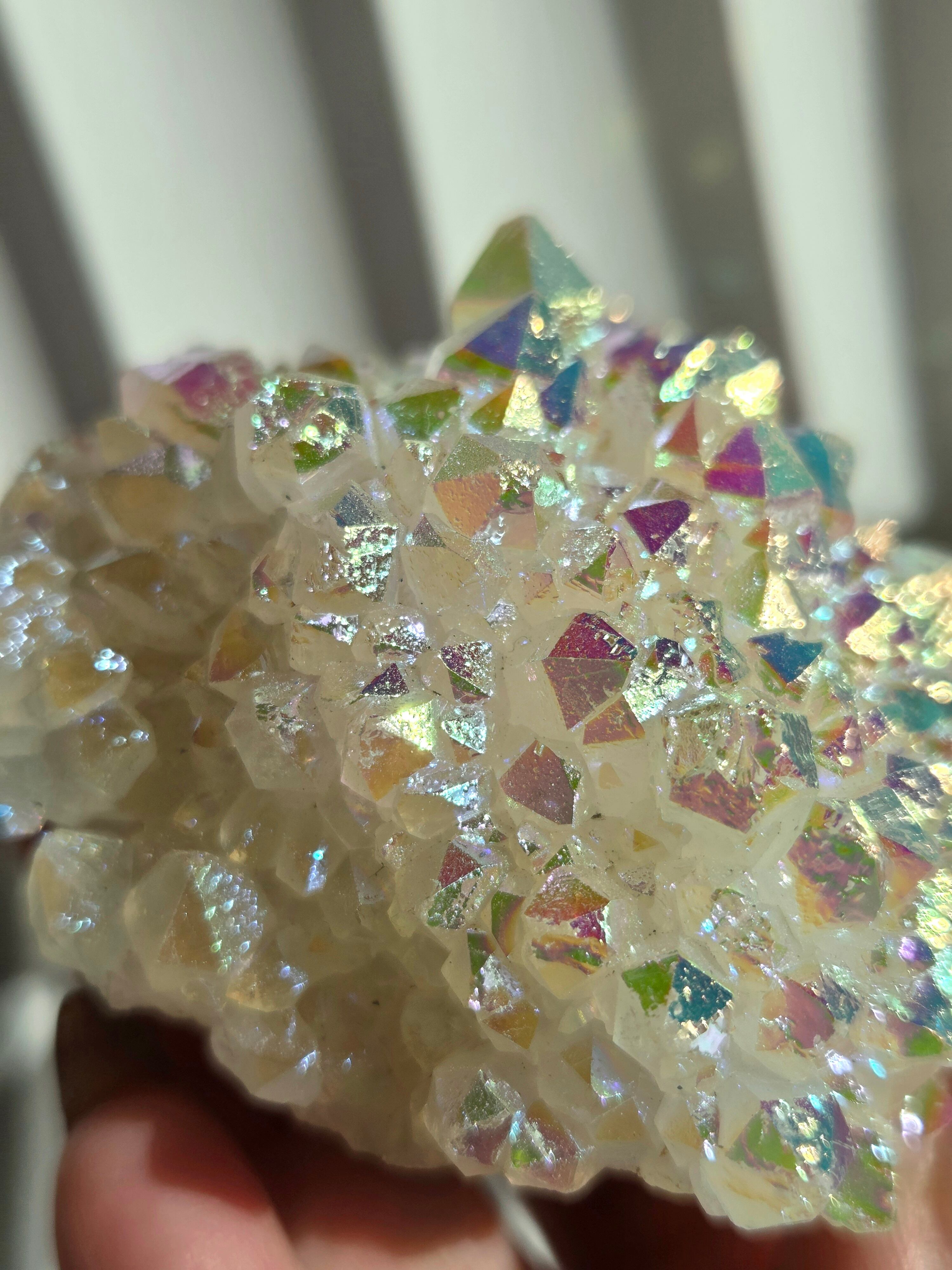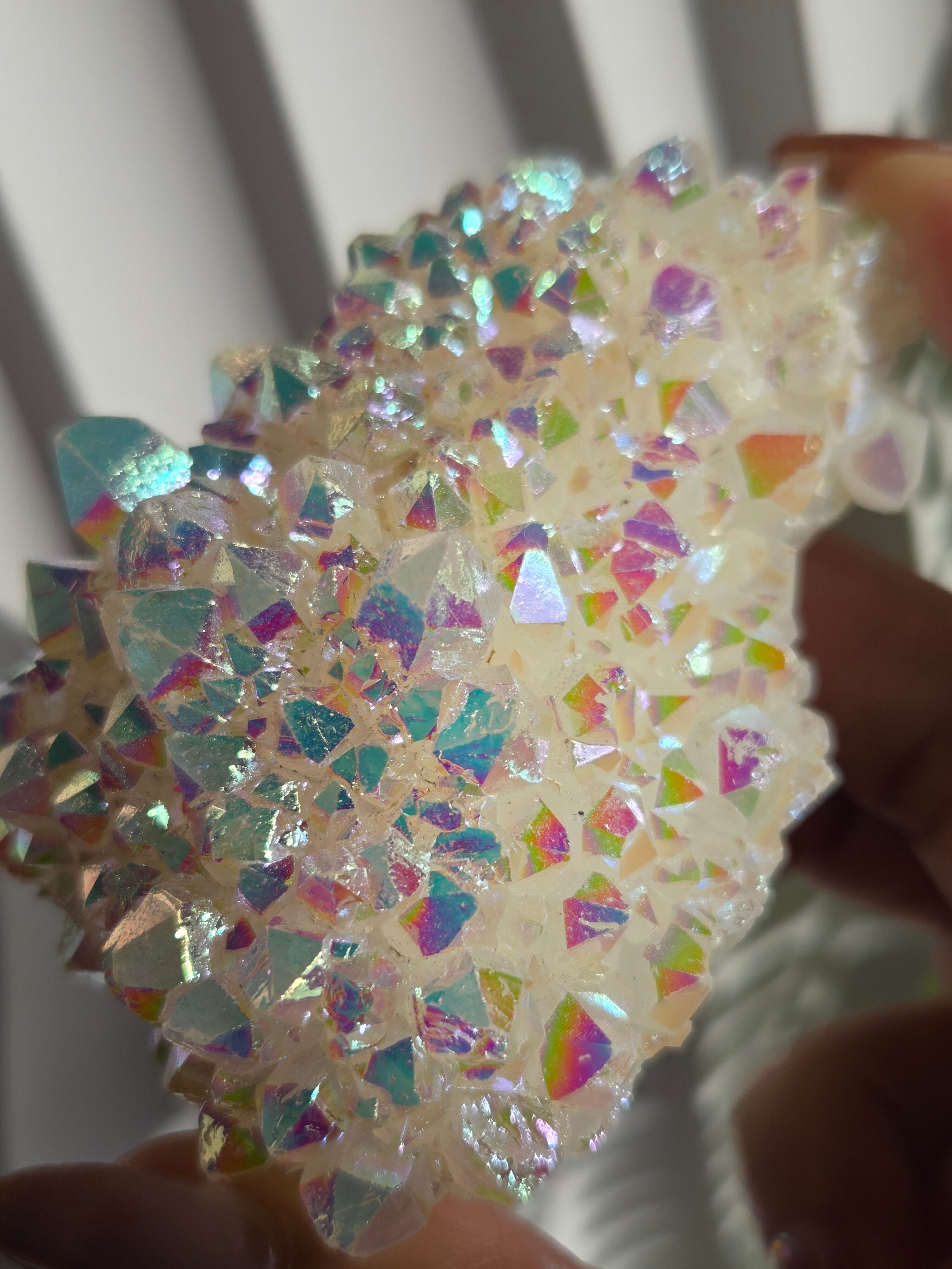 オーラクォーツは、天然の水晶に金やチタンなどの金属を蒸着させて、人工的に虹色の光沢をつけた加工石です。スピリチュアルなブームの中でアメリカで生み出された「新時代のクリスタル」で、エンジェルオーラやアクアオーラなど色によって様々な呼び方があります。パワーストーンとして、「活力や希望を与え、成功へ導く」「ネガティブなエネルギーを浄化する」といった意味を持つとされています。
