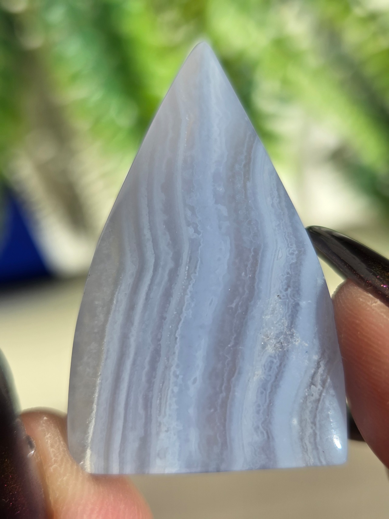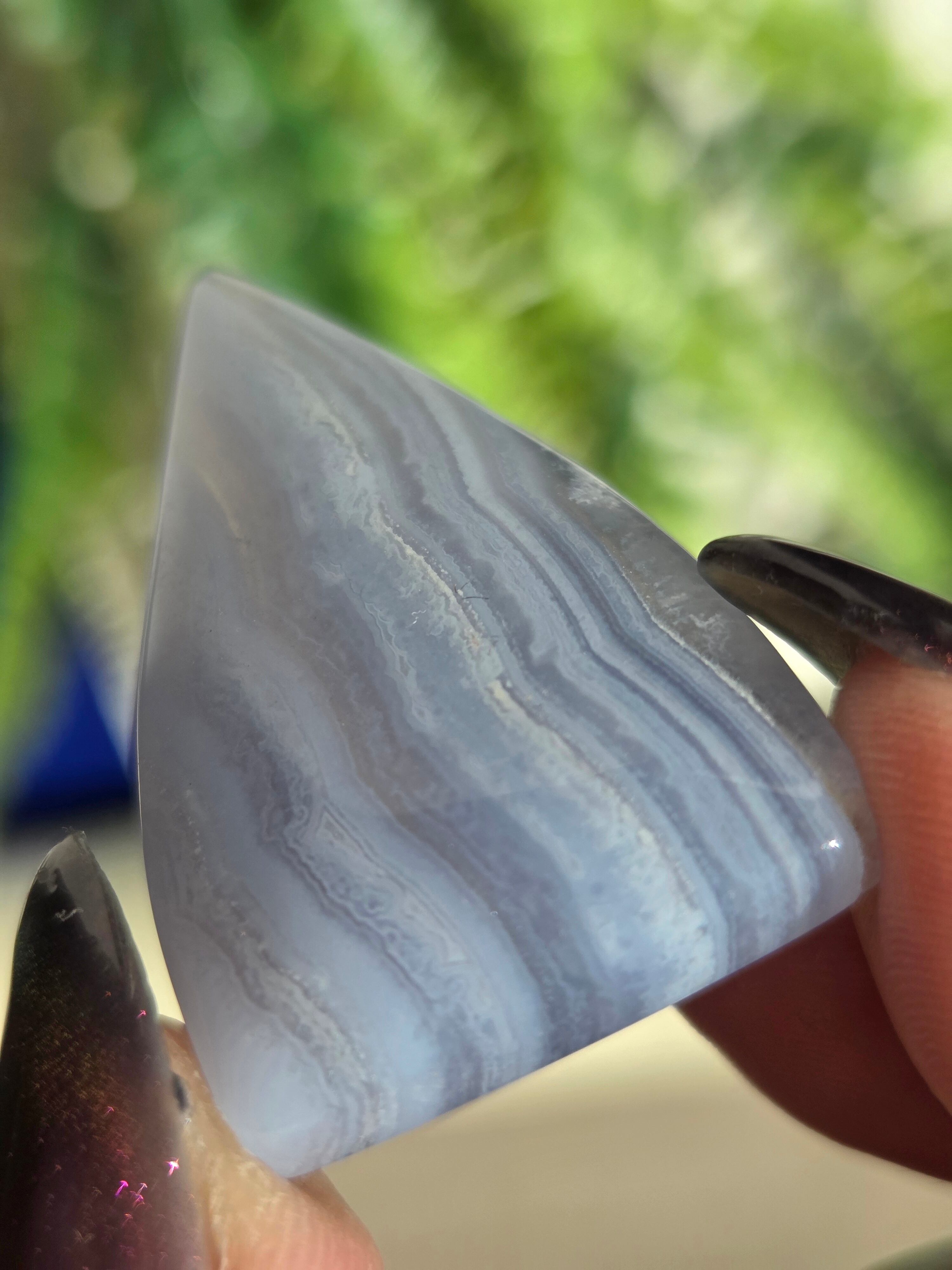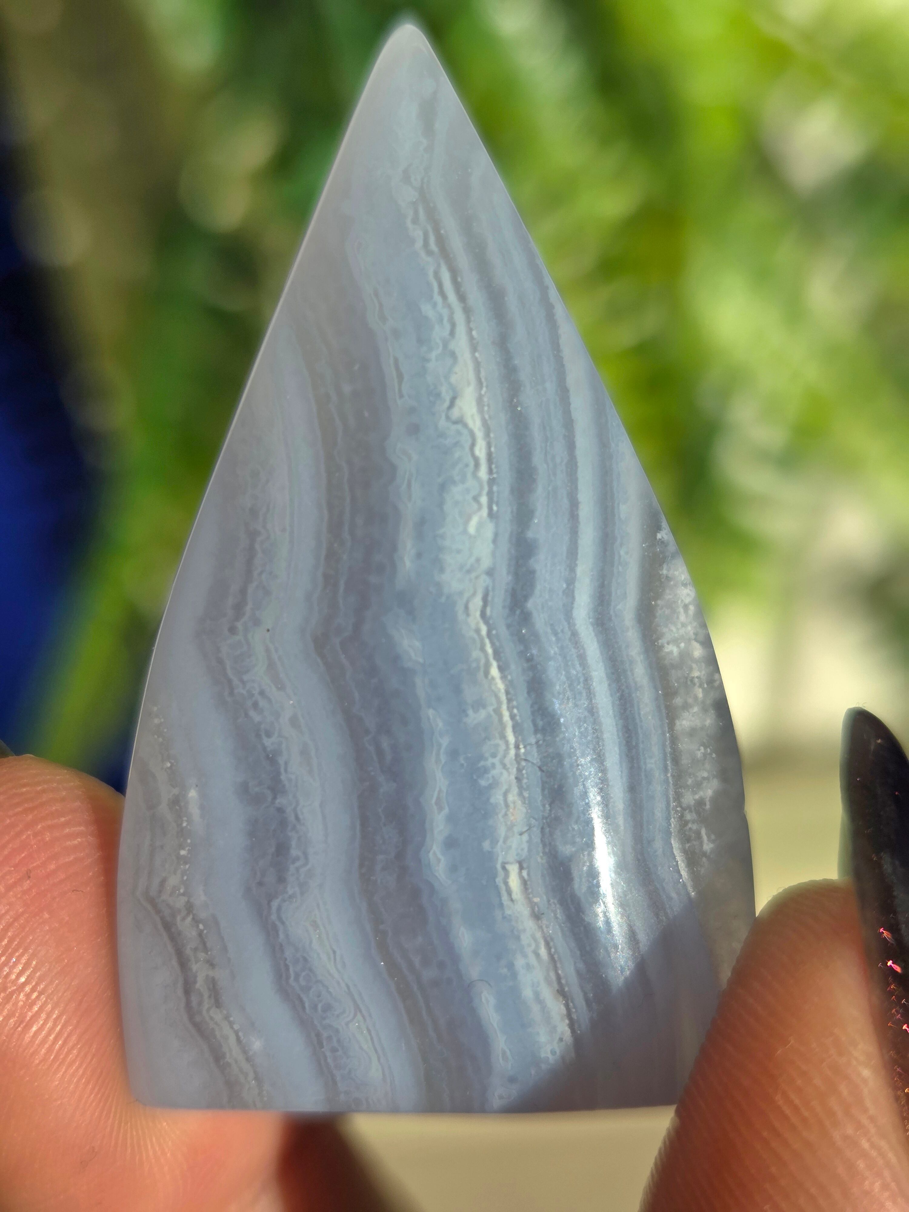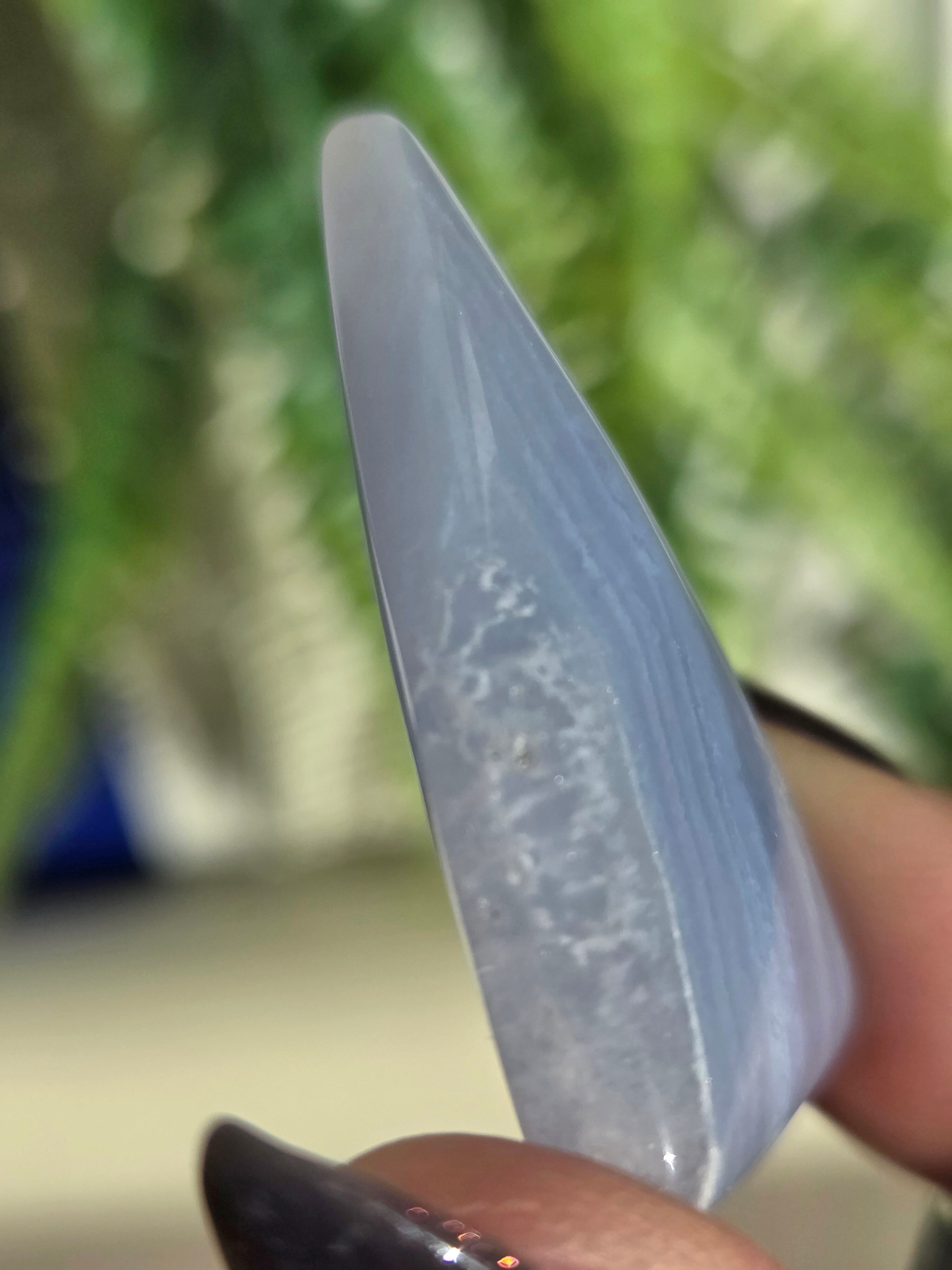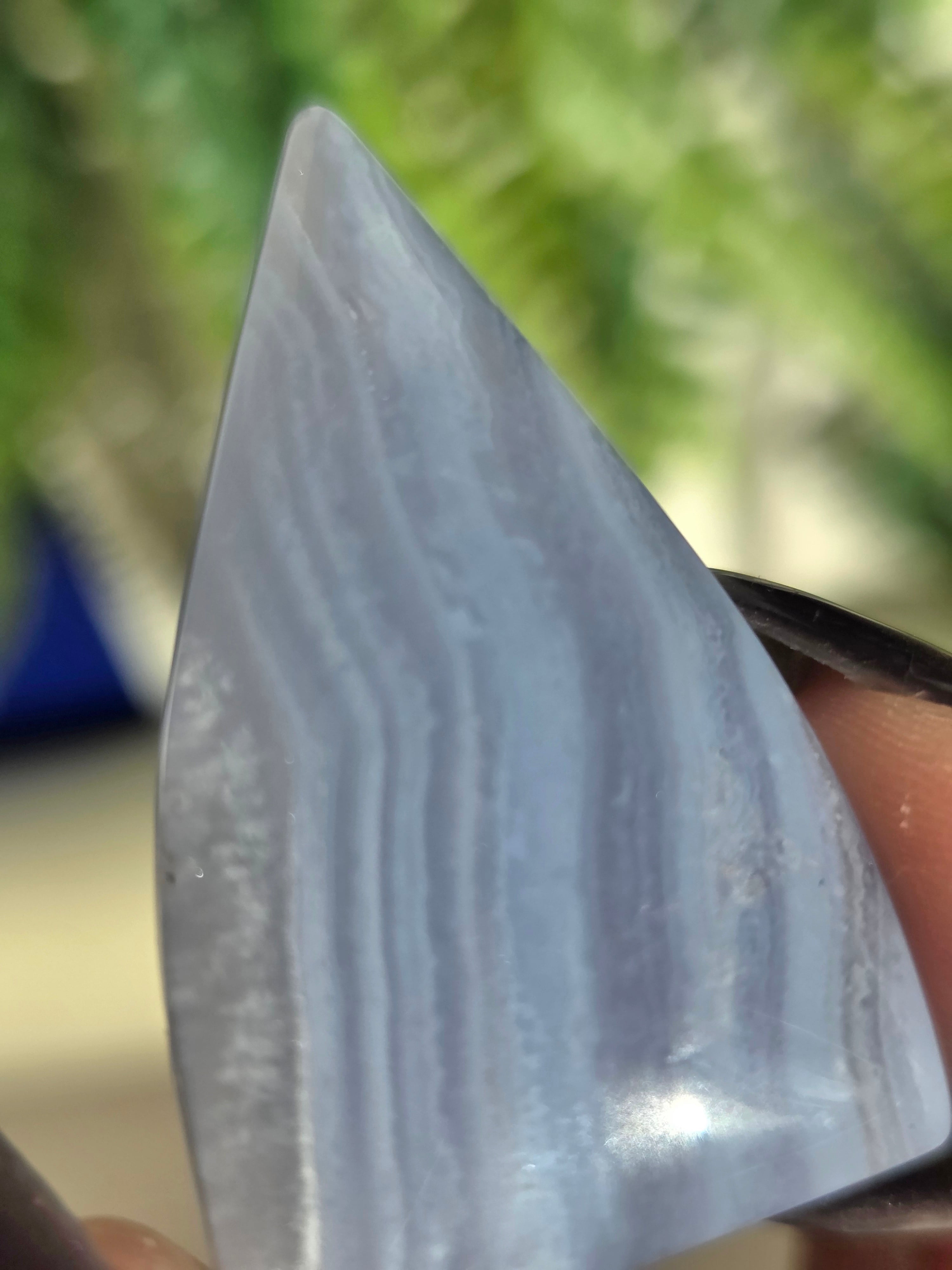 ブルーレースアゲートは、古来より危険を回避するお守りとして、人々の生活に寄り添ってきました。 その控えめで清潔感のある外観は、持ち主に安心感を与え、心を清らかに保つ効果があります。 気持ちが落ち着かない時やイライラしてしまう時に、この石をじっと見つめることで、心が安定し、リラックスした状態に導いてくれるといわれています