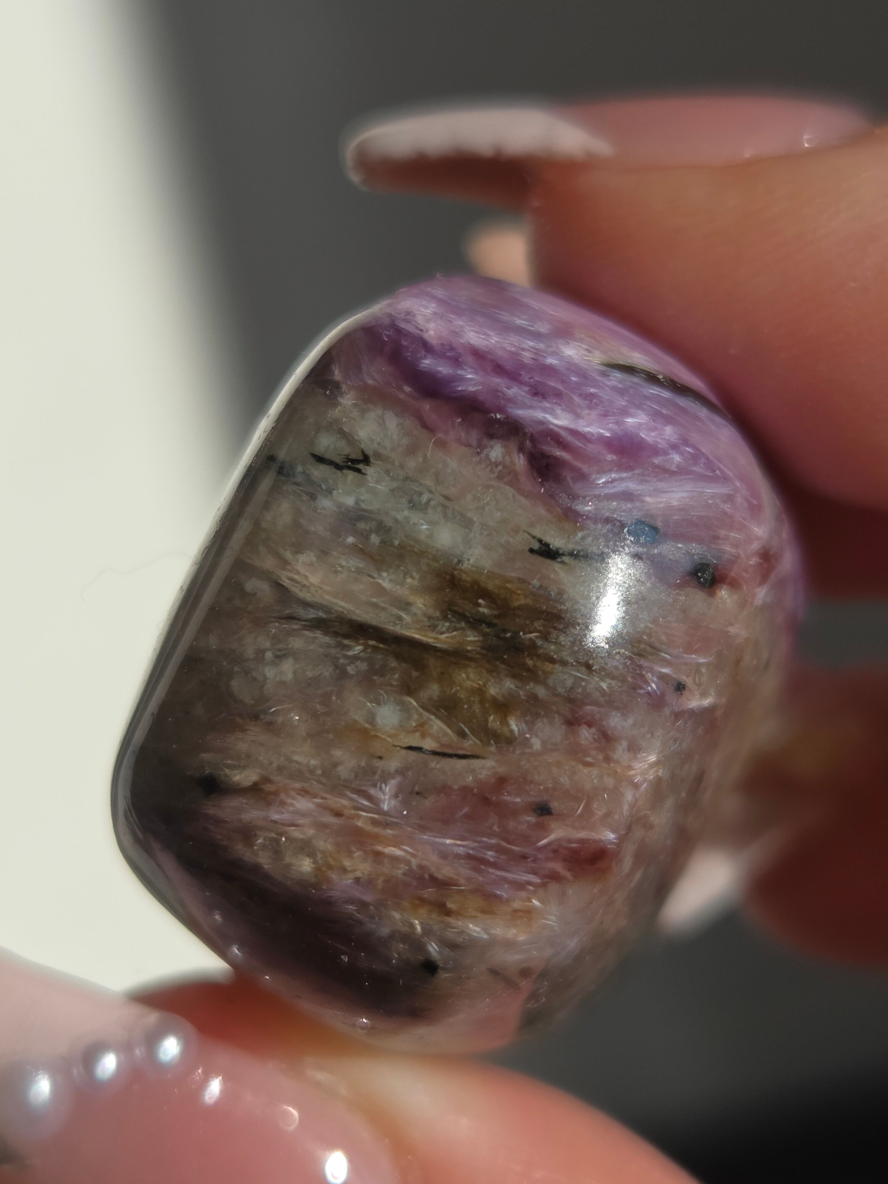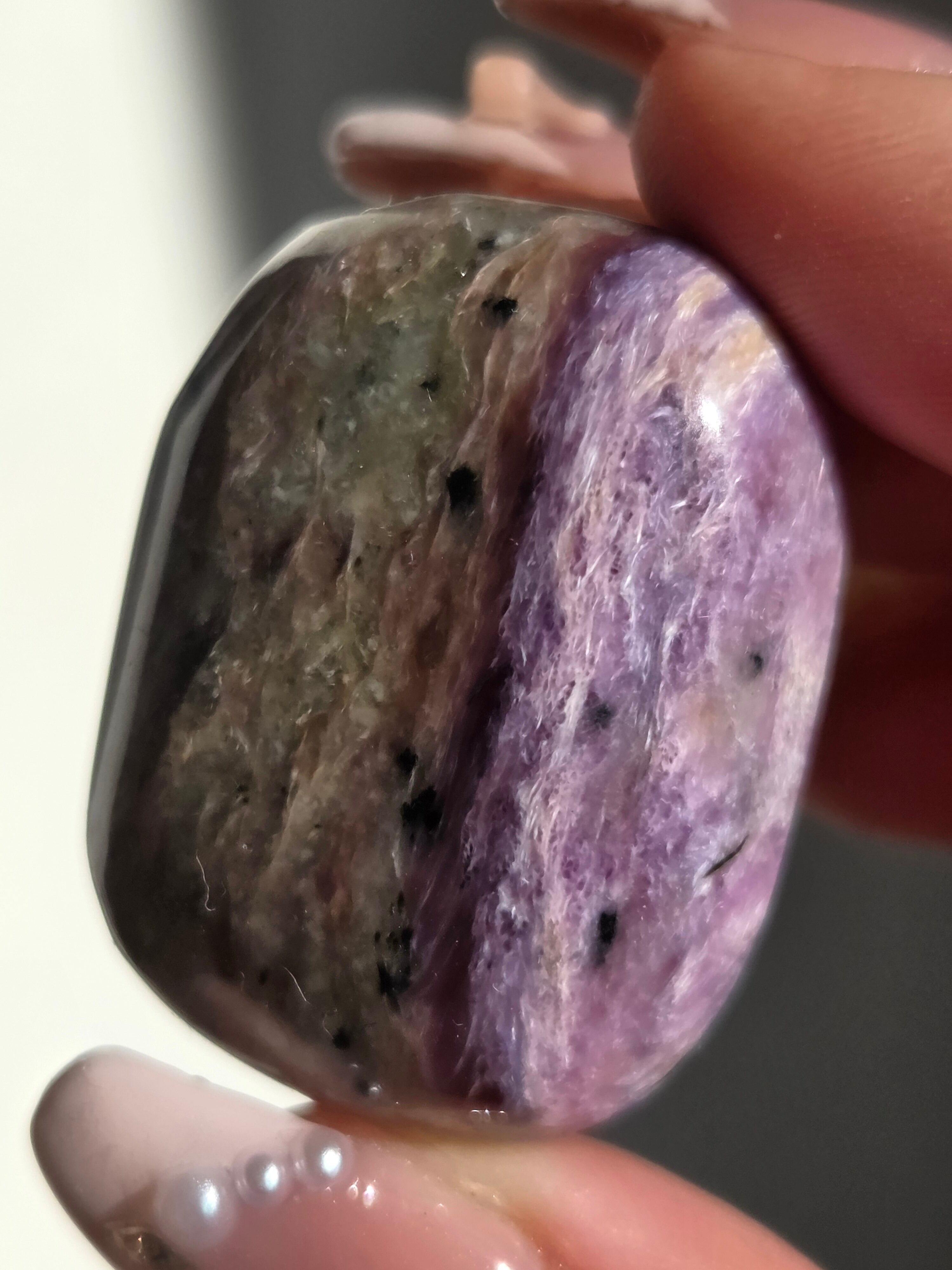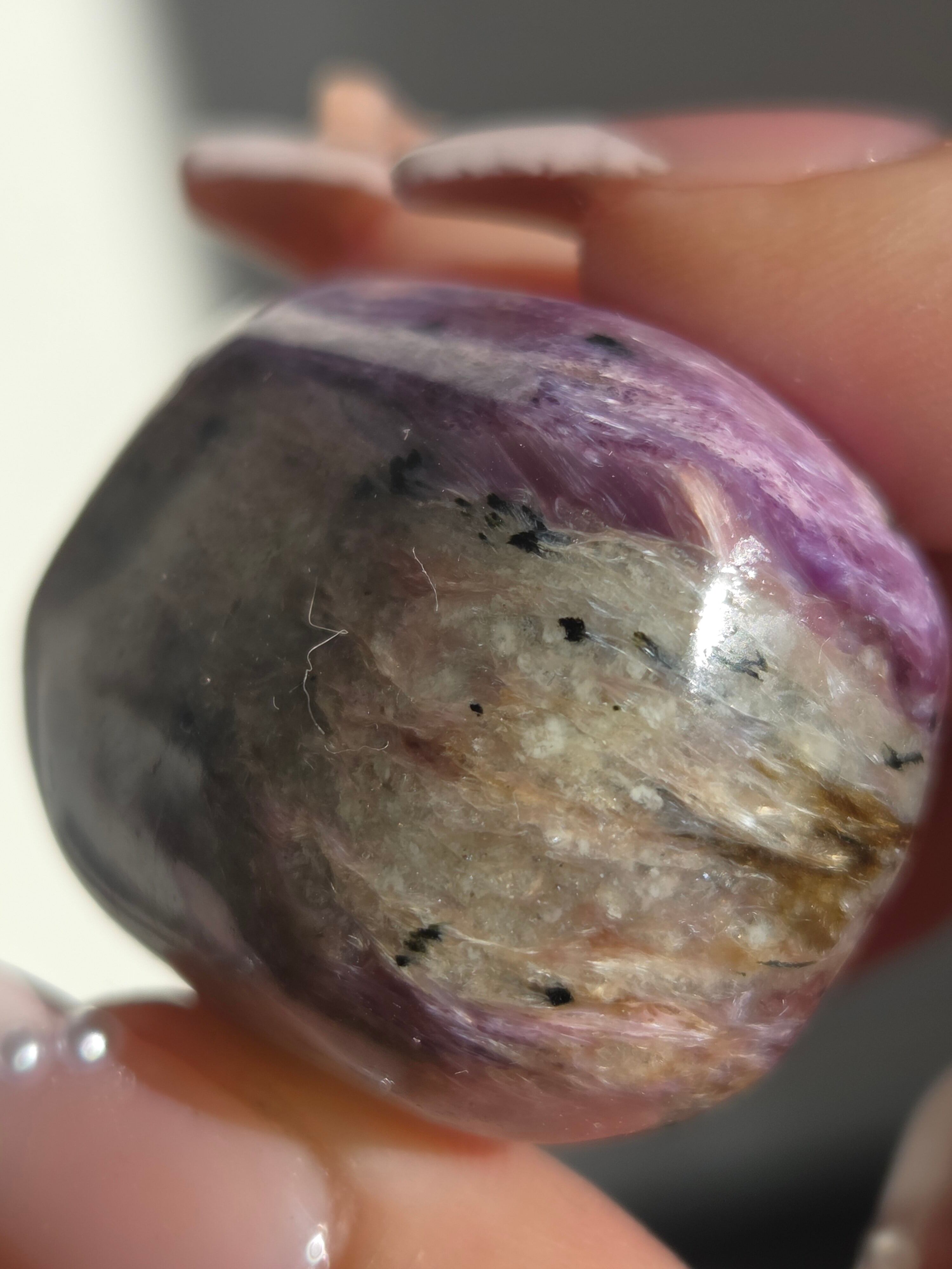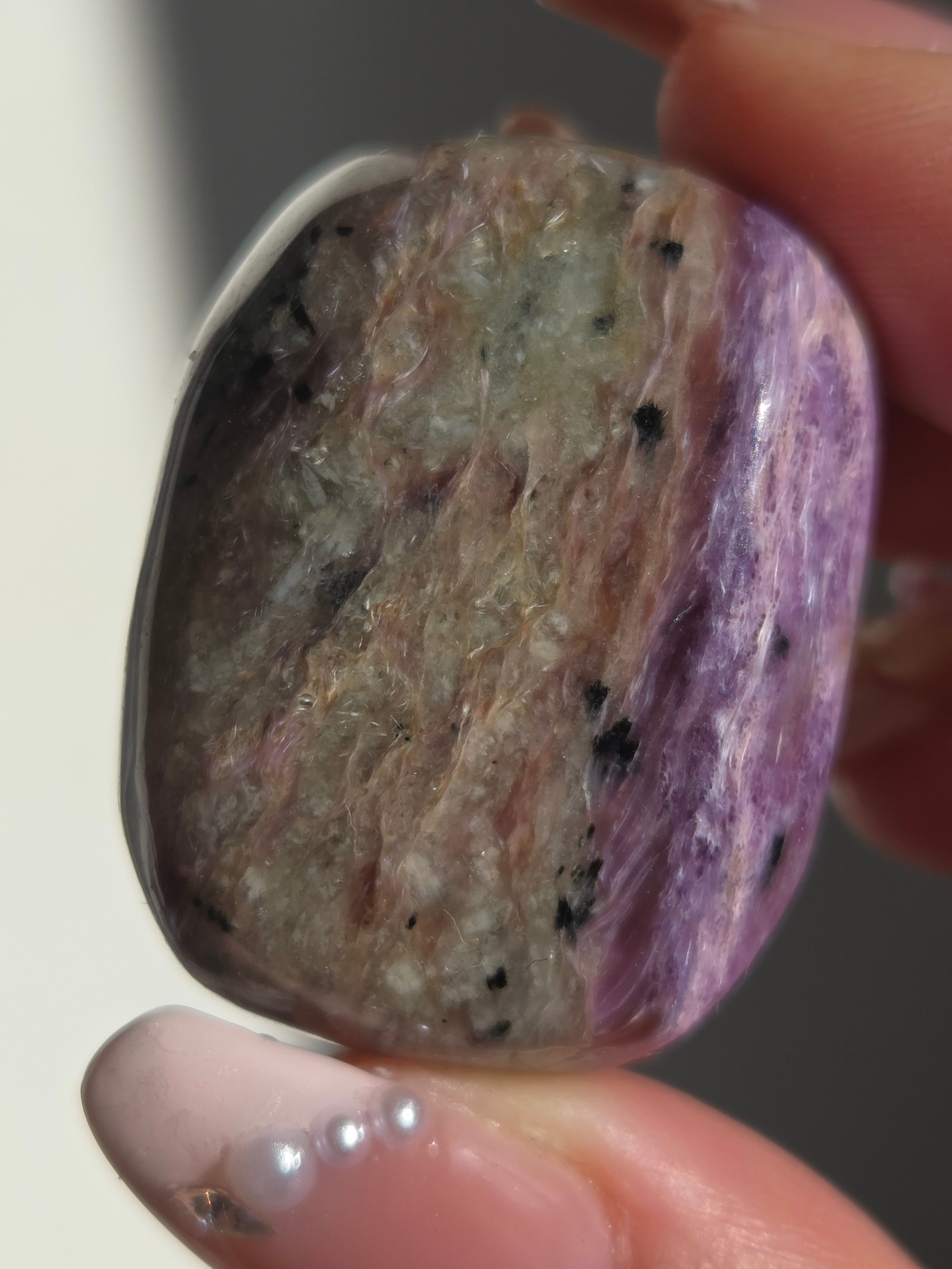 チャロアイトは、幻想的な紫色の渦巻き模様が特徴の希少な天然石で、スギライト・ラリマーと並ぶ世界三大ヒーリングストーンの一つです。ロシアのチャロ川流域でのみ産出され、名前は川の名前か、ロシア語の「魅惑する(charo)」に由来するとされ、癒しや浄化、人生の転機をサポートする意味を持ち、高いヒーリング効果からお守りとしても人気があります。