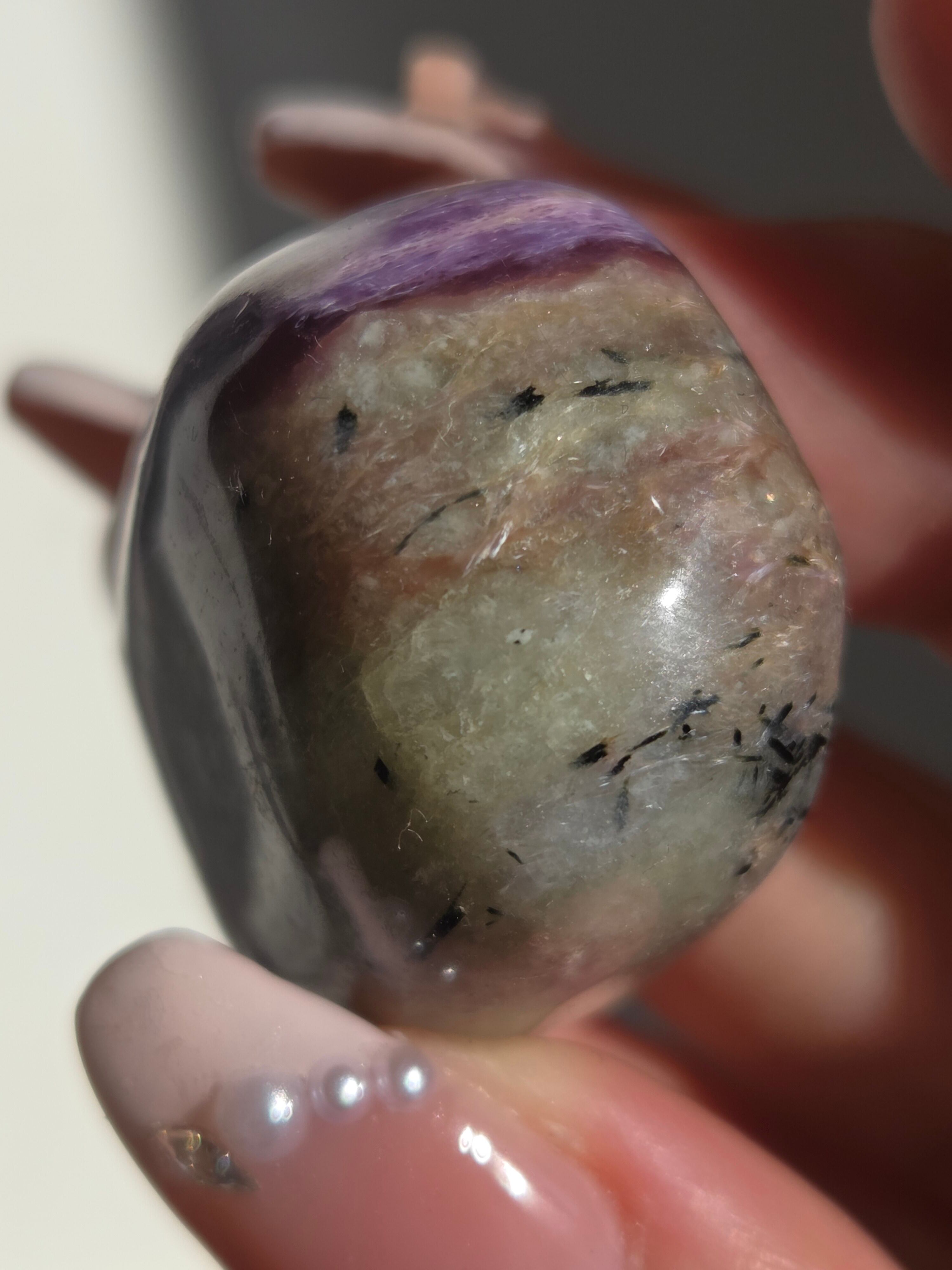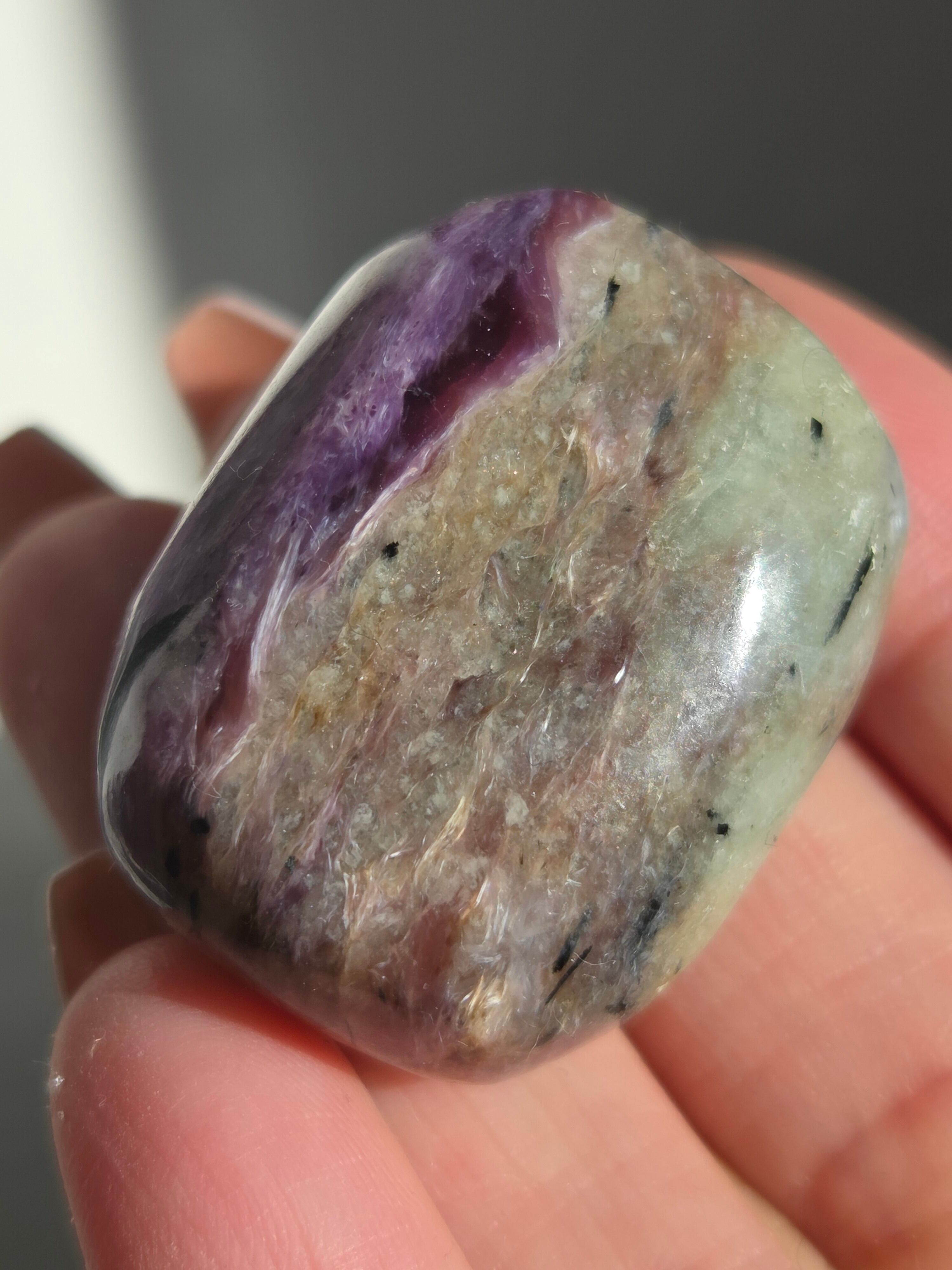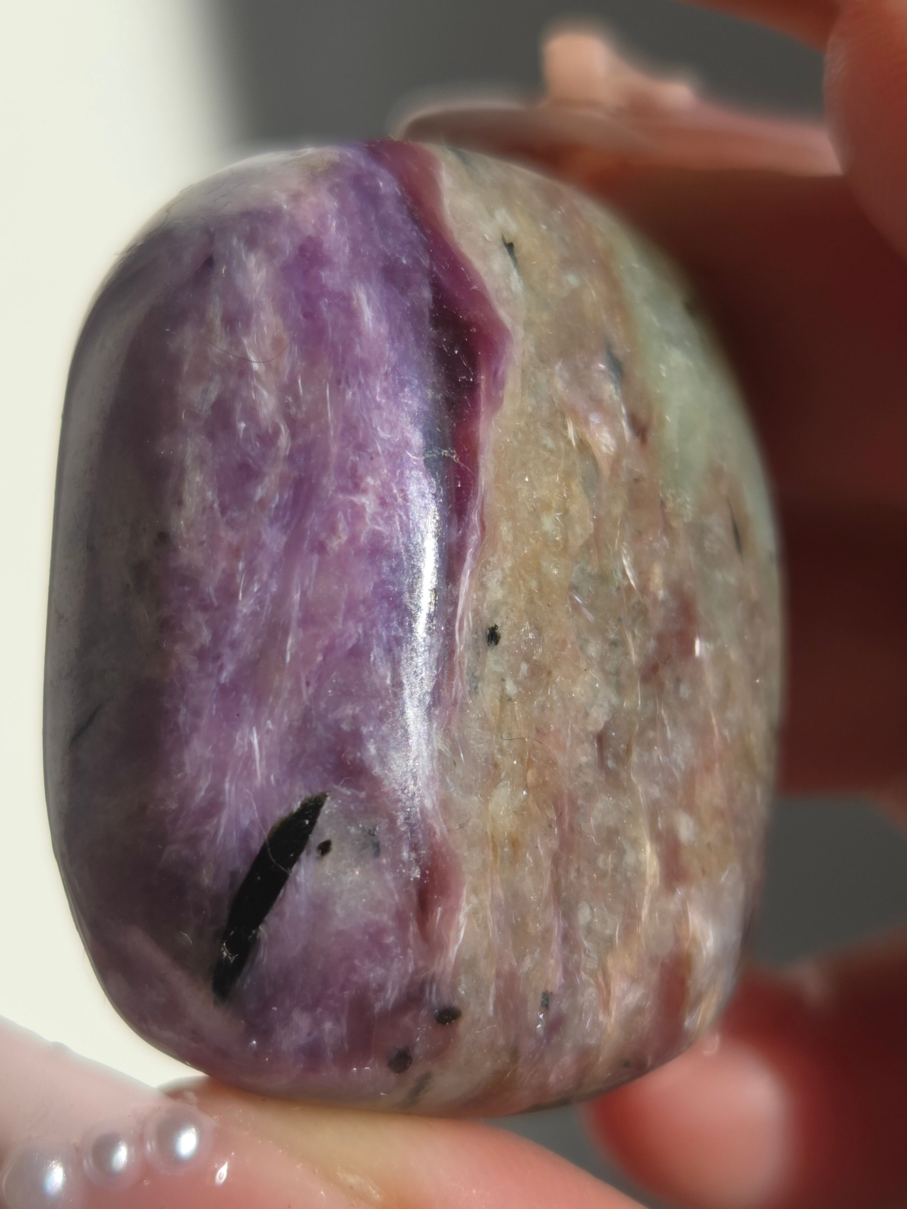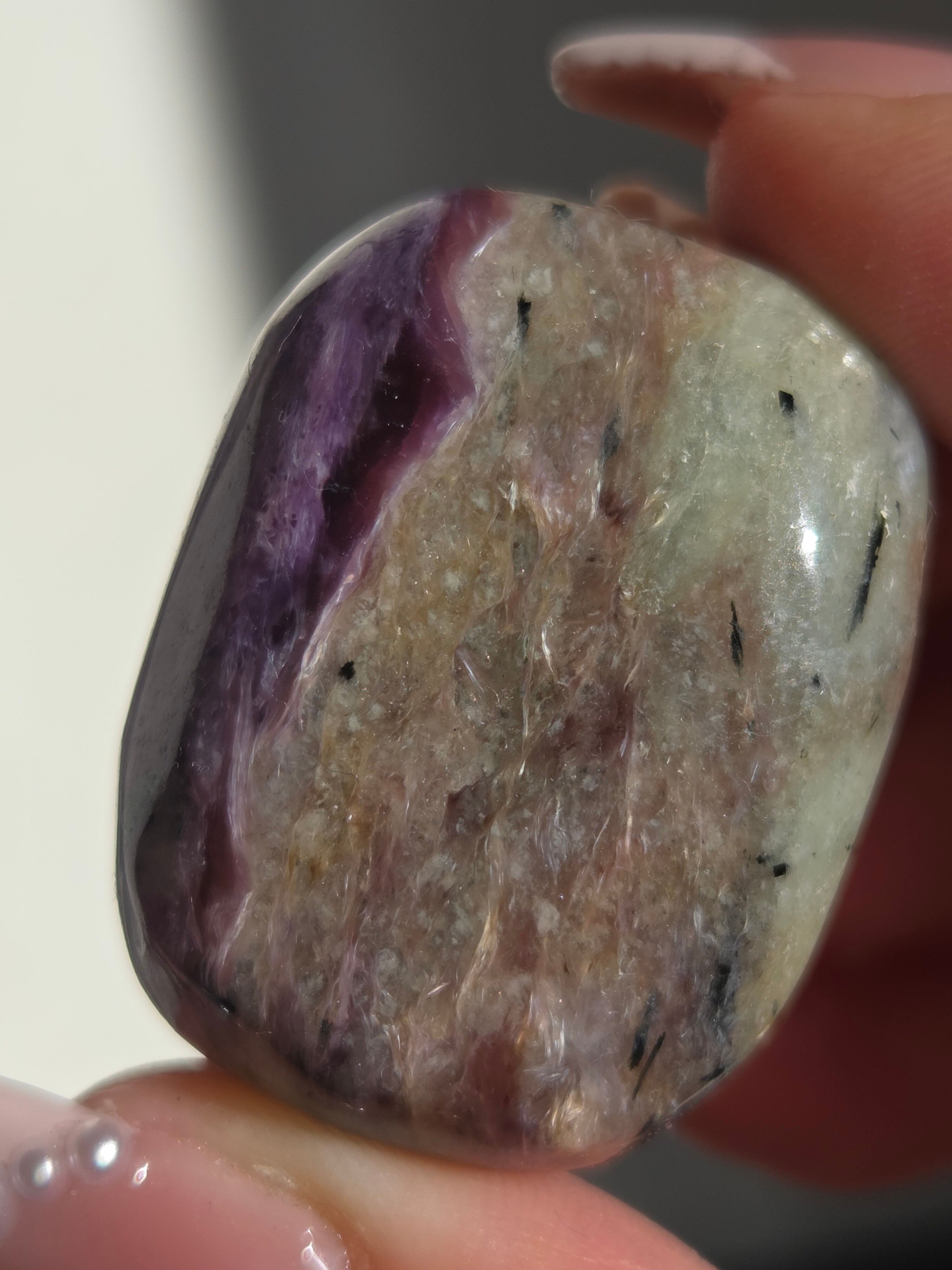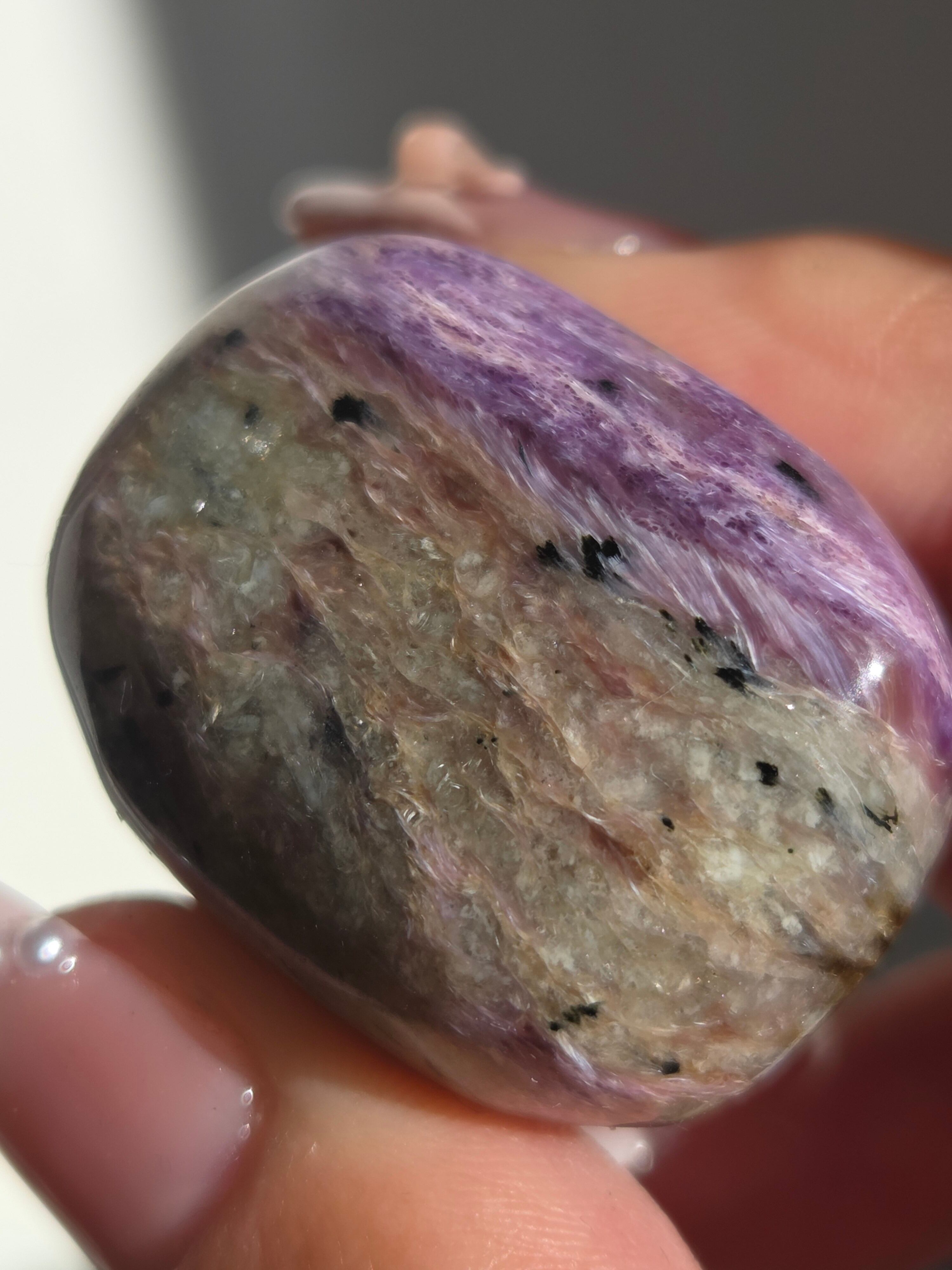 チャロアイトは、幻想的な紫色の渦巻き模様が特徴の希少な天然石で、スギライト・ラリマーと並ぶ世界三大ヒーリングストーンの一つです。ロシアのチャロ川流域でのみ産出され、名前は川の名前か、ロシア語の「魅惑する(charo)」に由来するとされ、癒しや浄化、人生の転機をサポートする意味を持ち、高いヒーリング効果からお守りとしても人気があります。