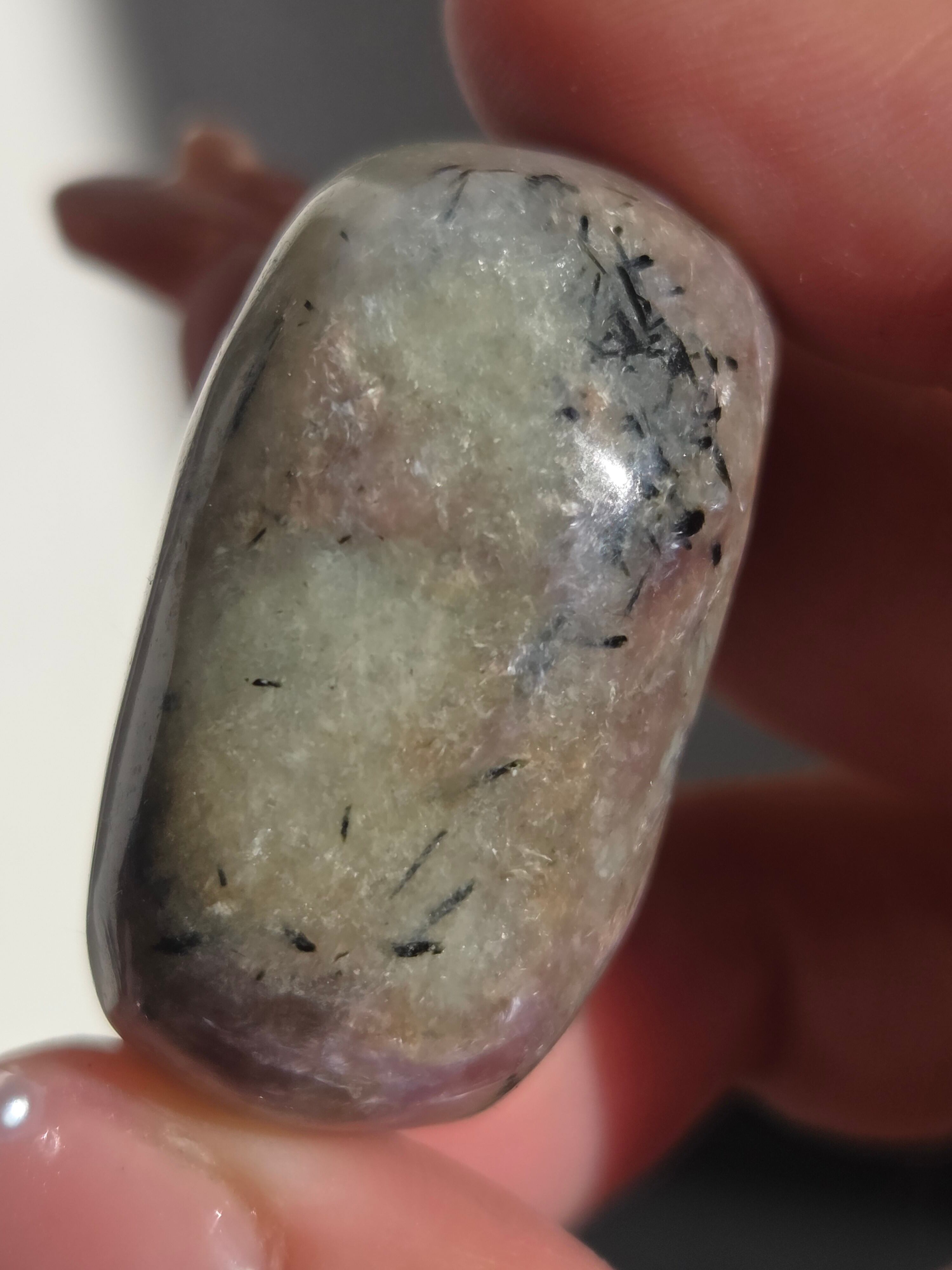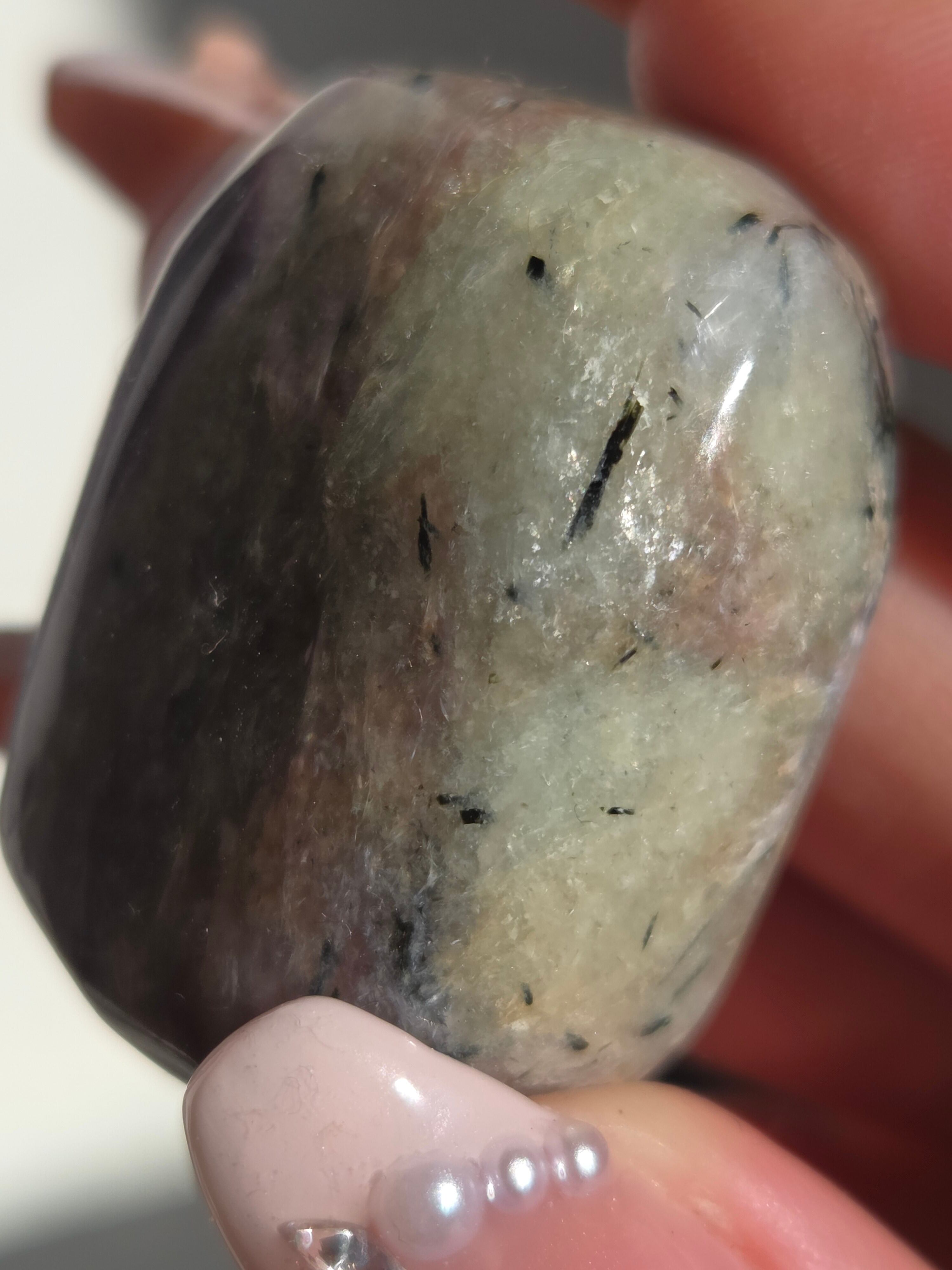 黒い部分はエジリンで、エジリン(アクマイト)は、「断ち切る」力を持つとされるパワーストーンで、悪縁や不運の連鎖、ネガティブな感情や淀みを断ち切り、心身のデトックス、思考のクリアリングに効果が期待できます。体内毒素の排出促進や、免疫系・神経系の活性化といった身体的なヒーリング効果も報告されており、「あらゆるネガティブエネルギーを破壊し、持ち主を守る」石として、特に悪いことが続いたり気分が沈みがちな方におすすめです。