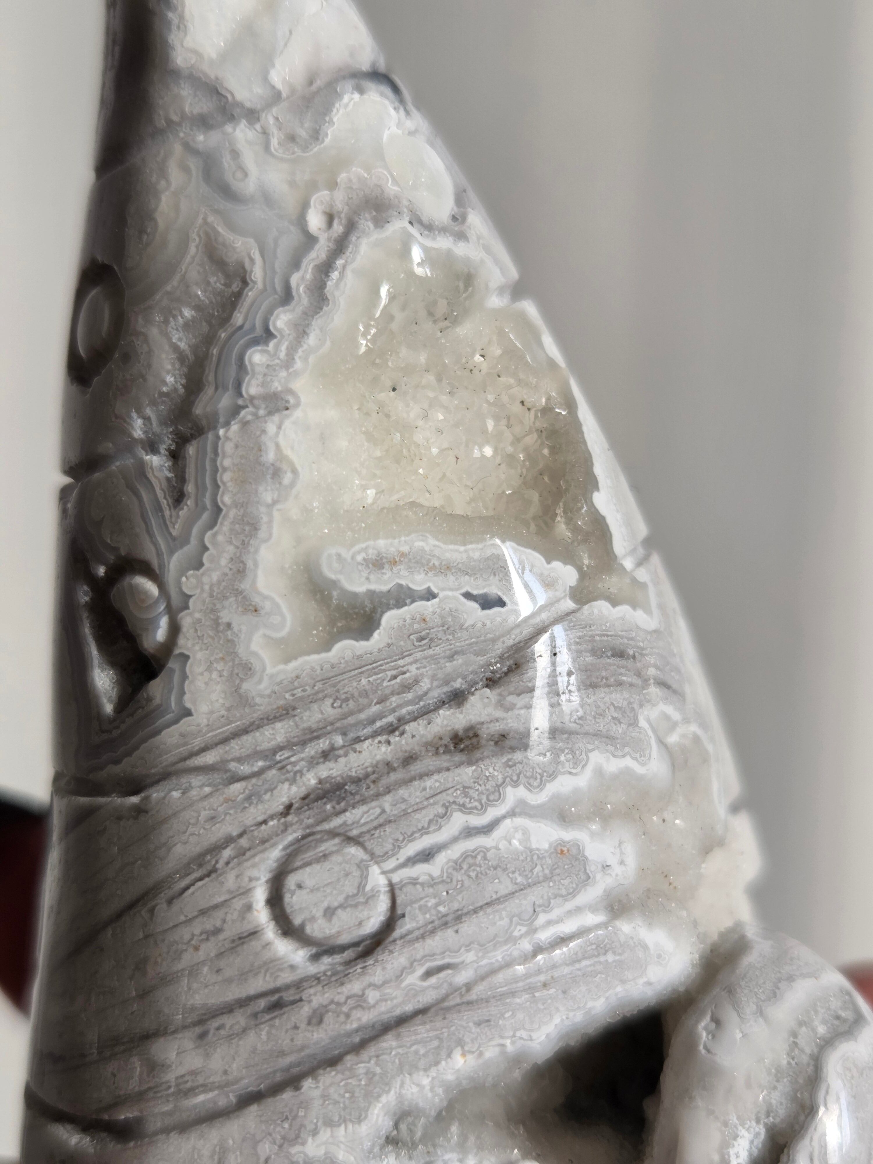 ホワイトアゲートの効果は、精神安定・心身の浄化・人間関係の調和・過去への執着を断ち切るサポートなど多岐にわたります。清らかな輝きが持ち主の心を穏やかにし、ネガティブな感情を取り除き、安堵感をもたらしてくれるとされています。また、他者への許しを促し、深い家族の絆を育む効果もあるとされています。