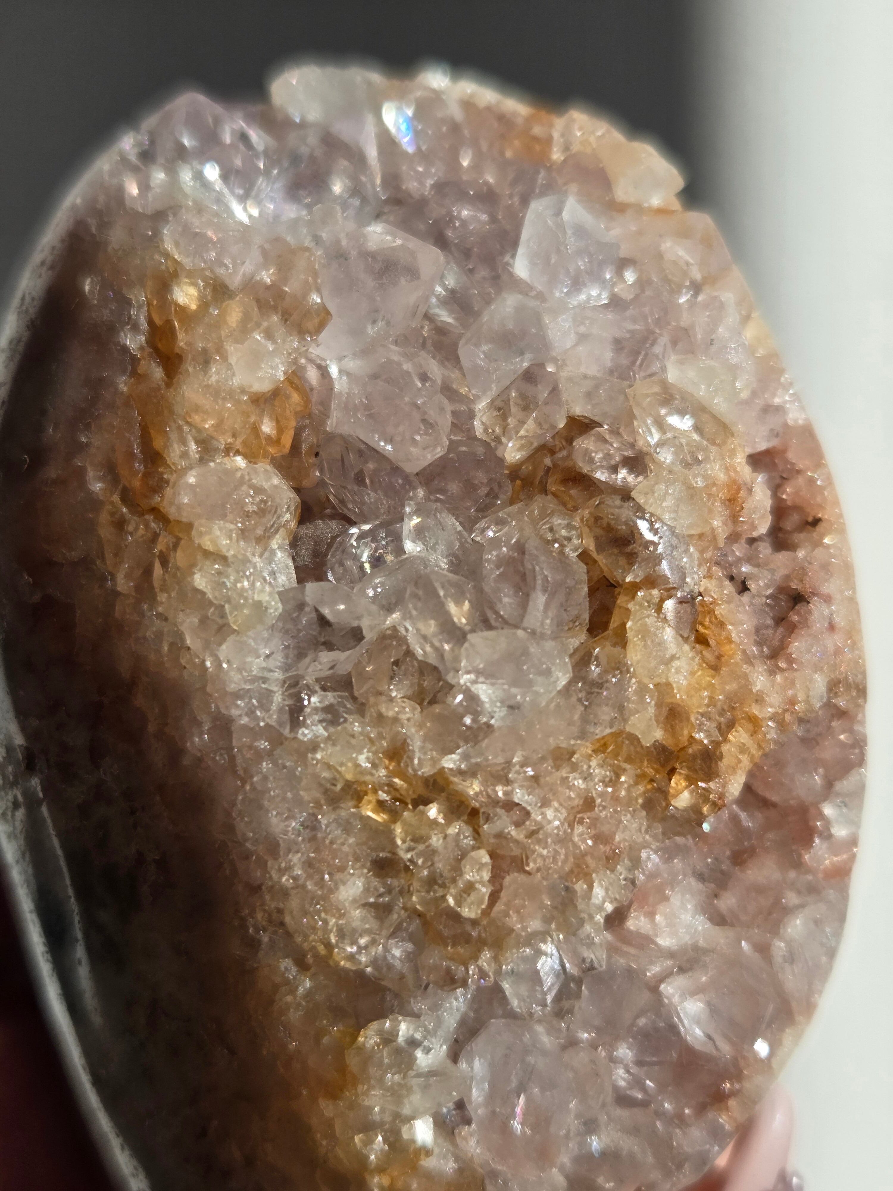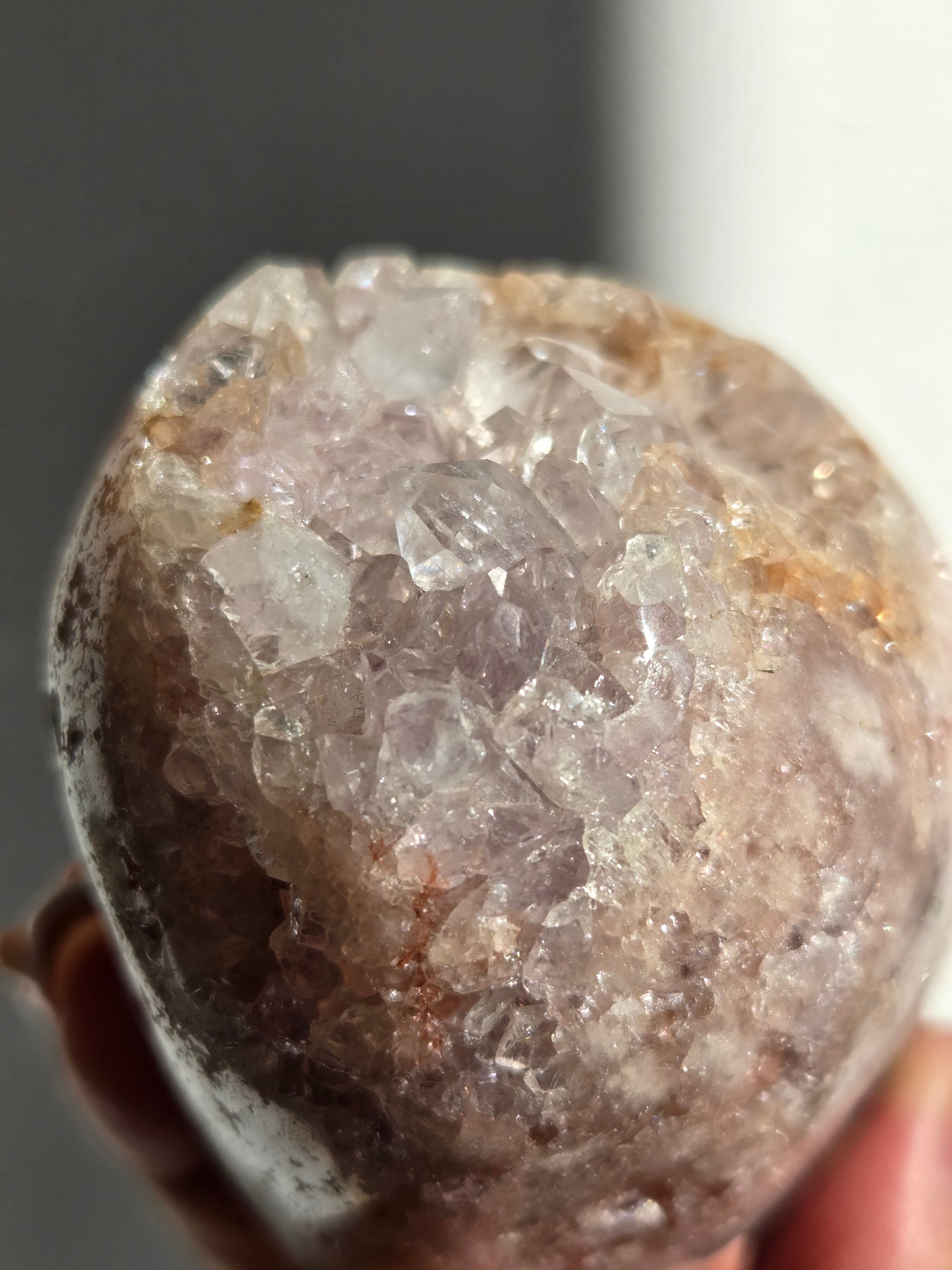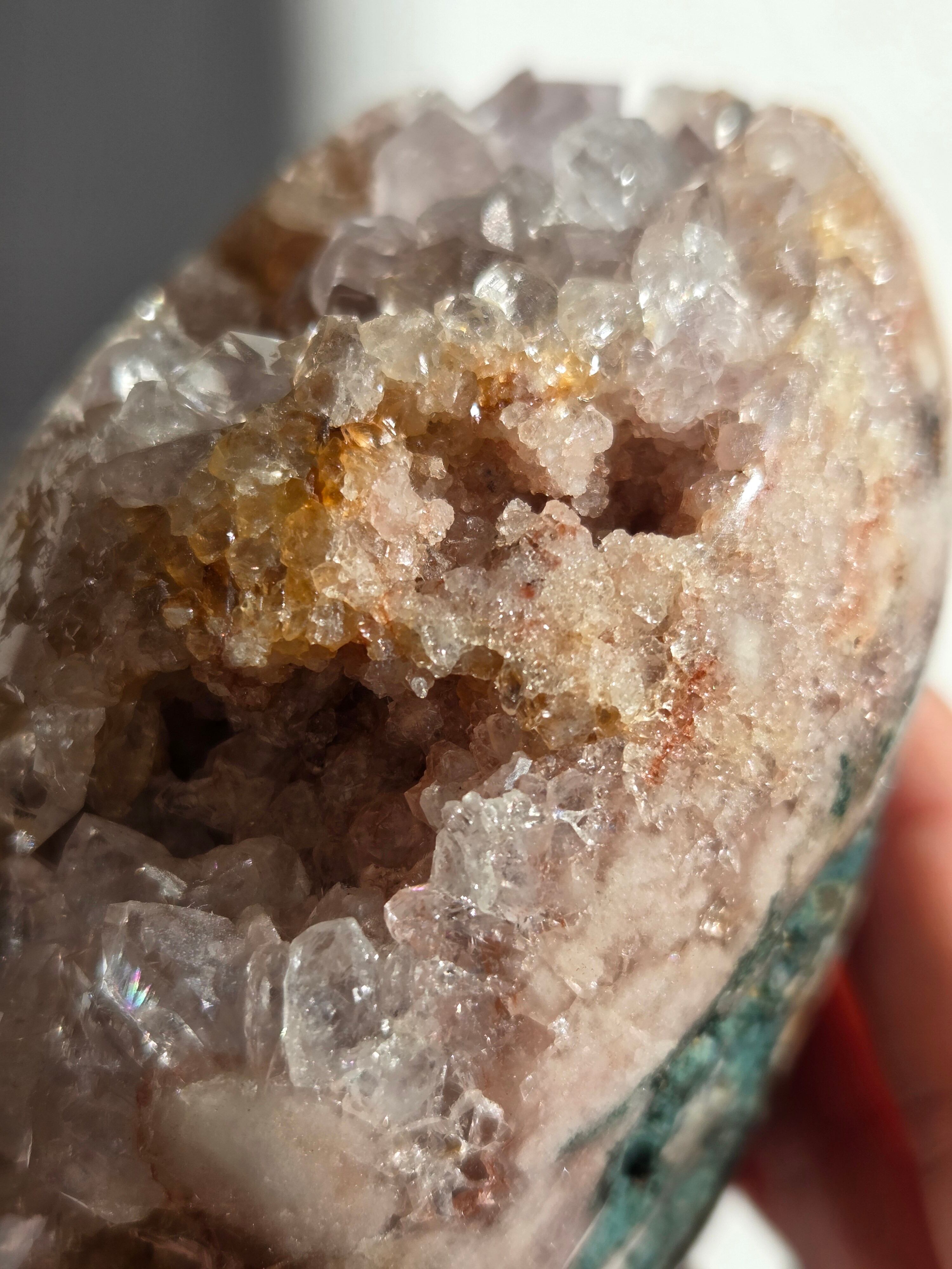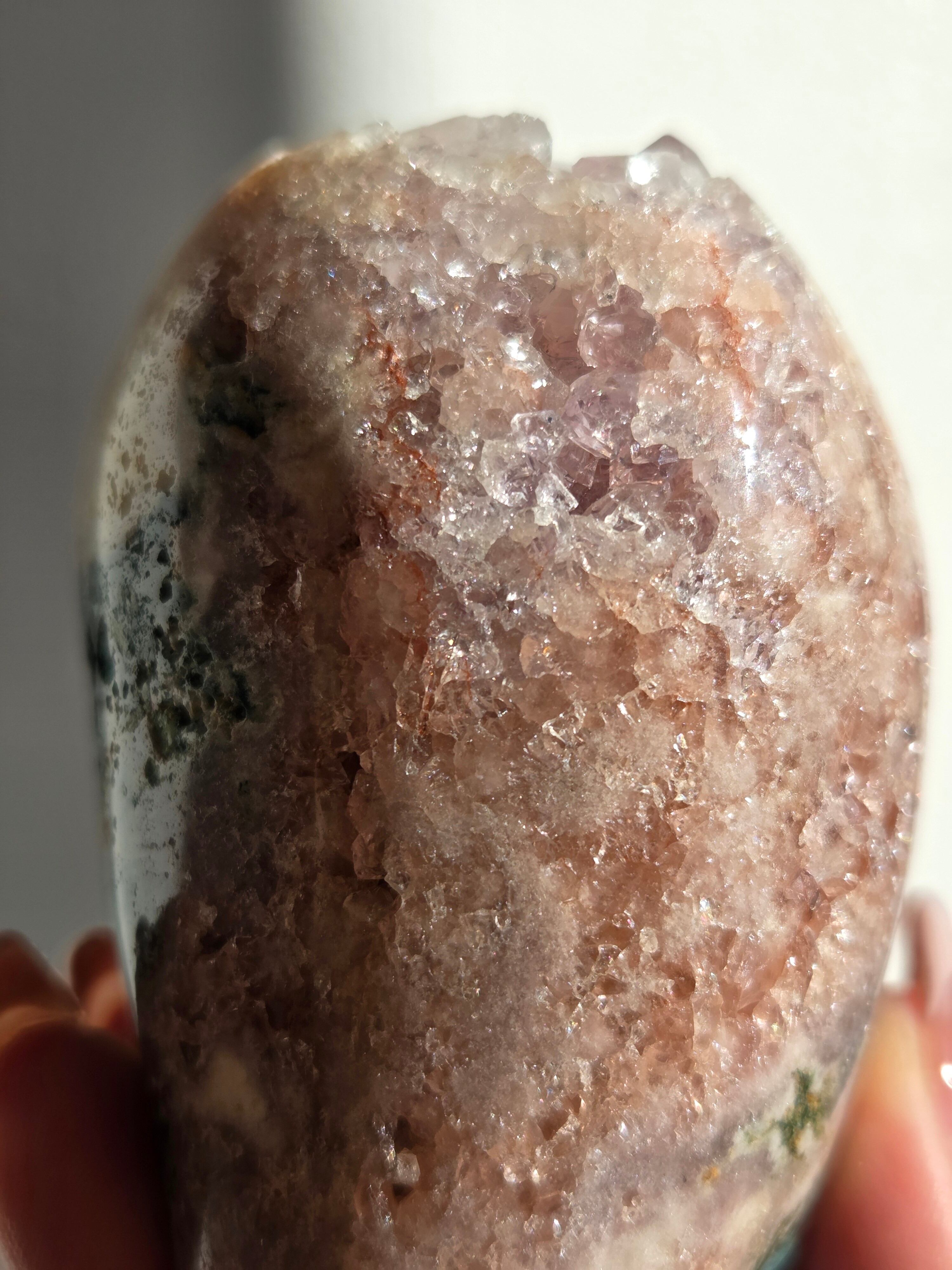 淡いピンクとパープルの結晶がキラキラ輝き、虹も見えます。