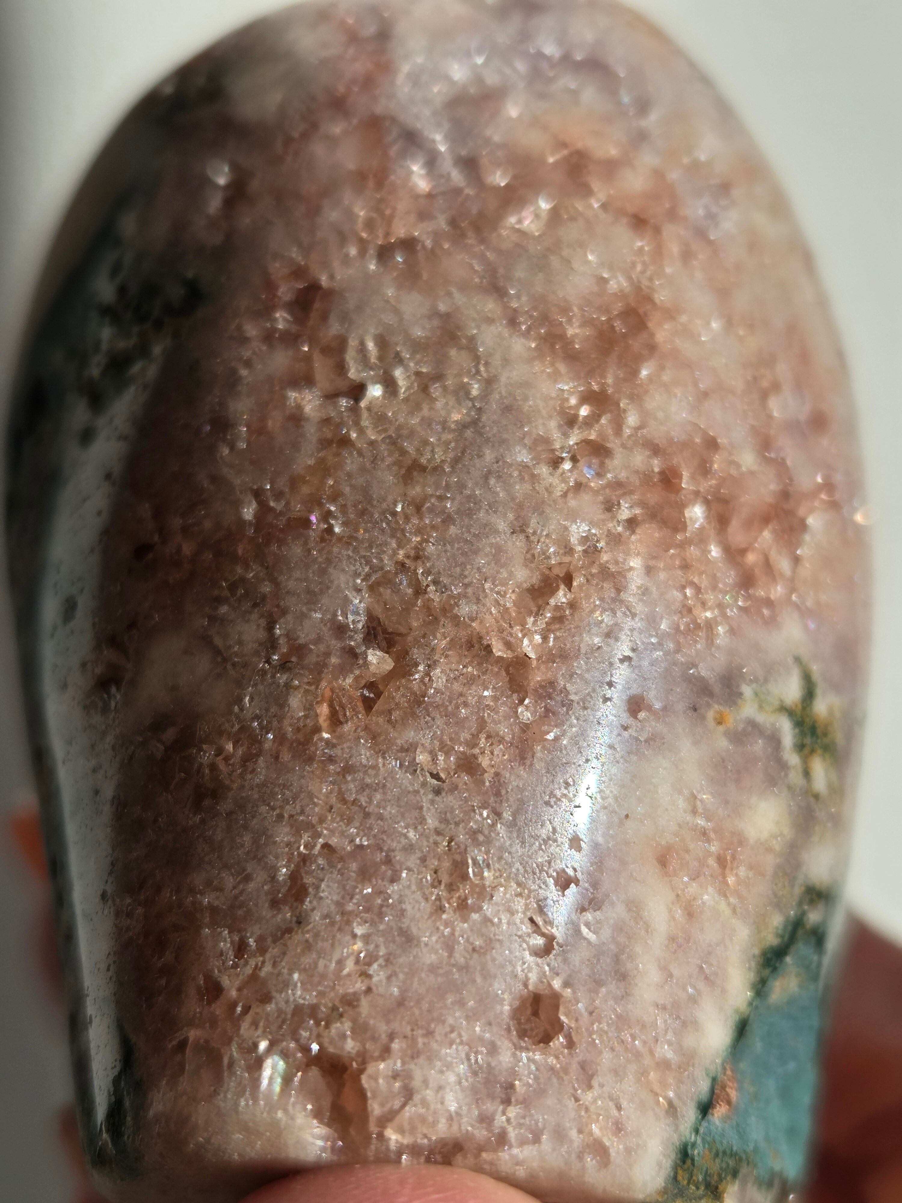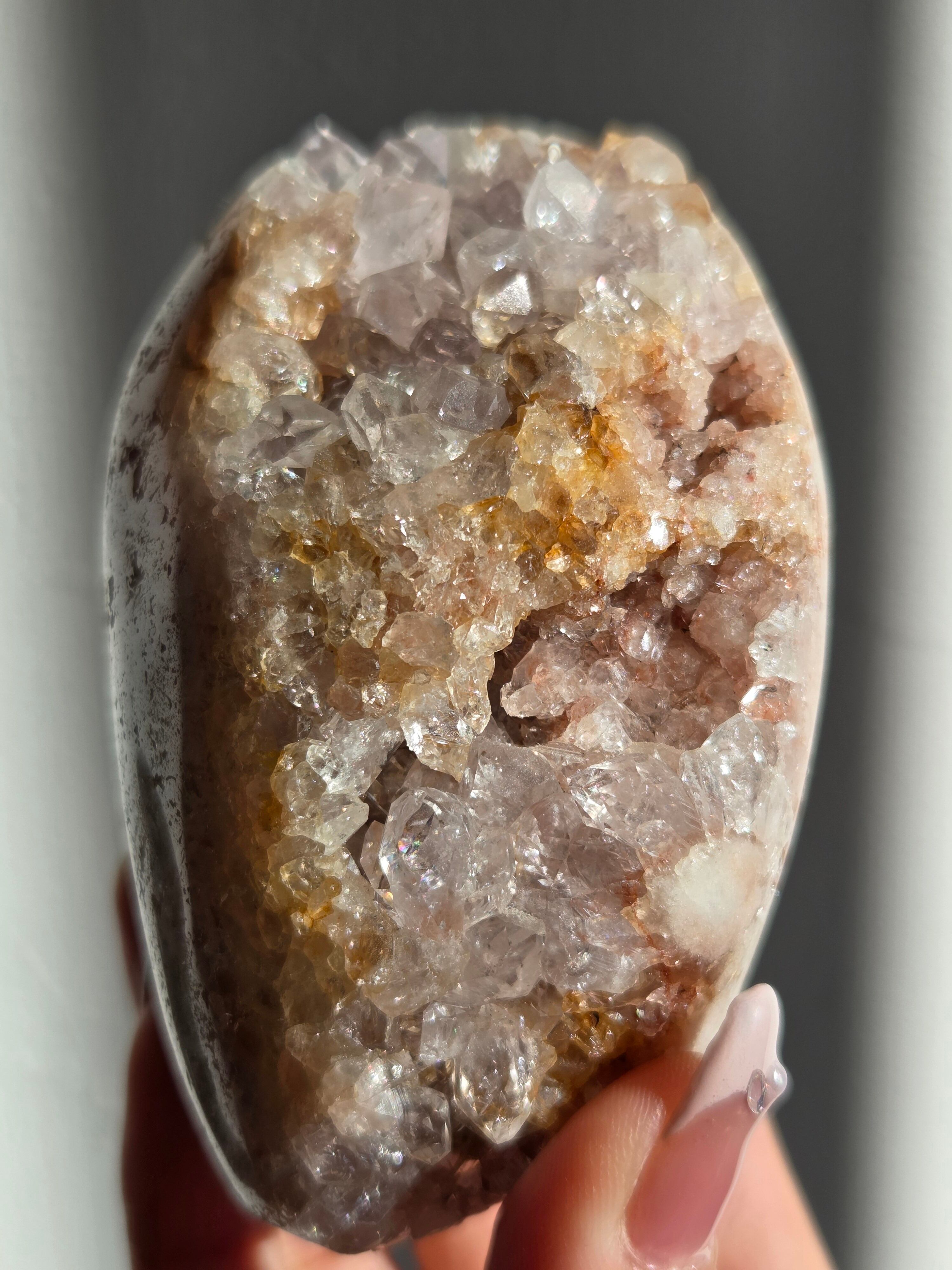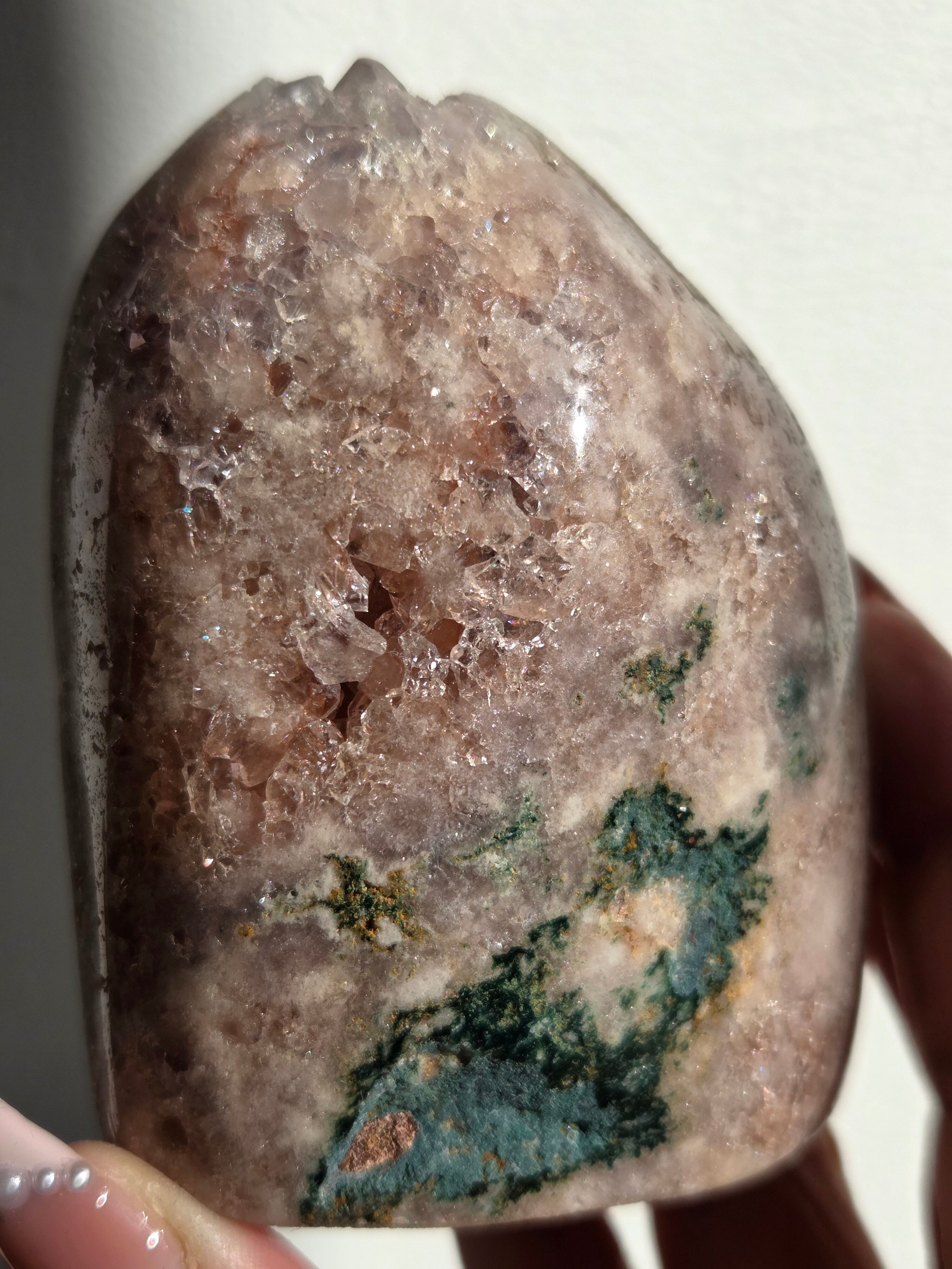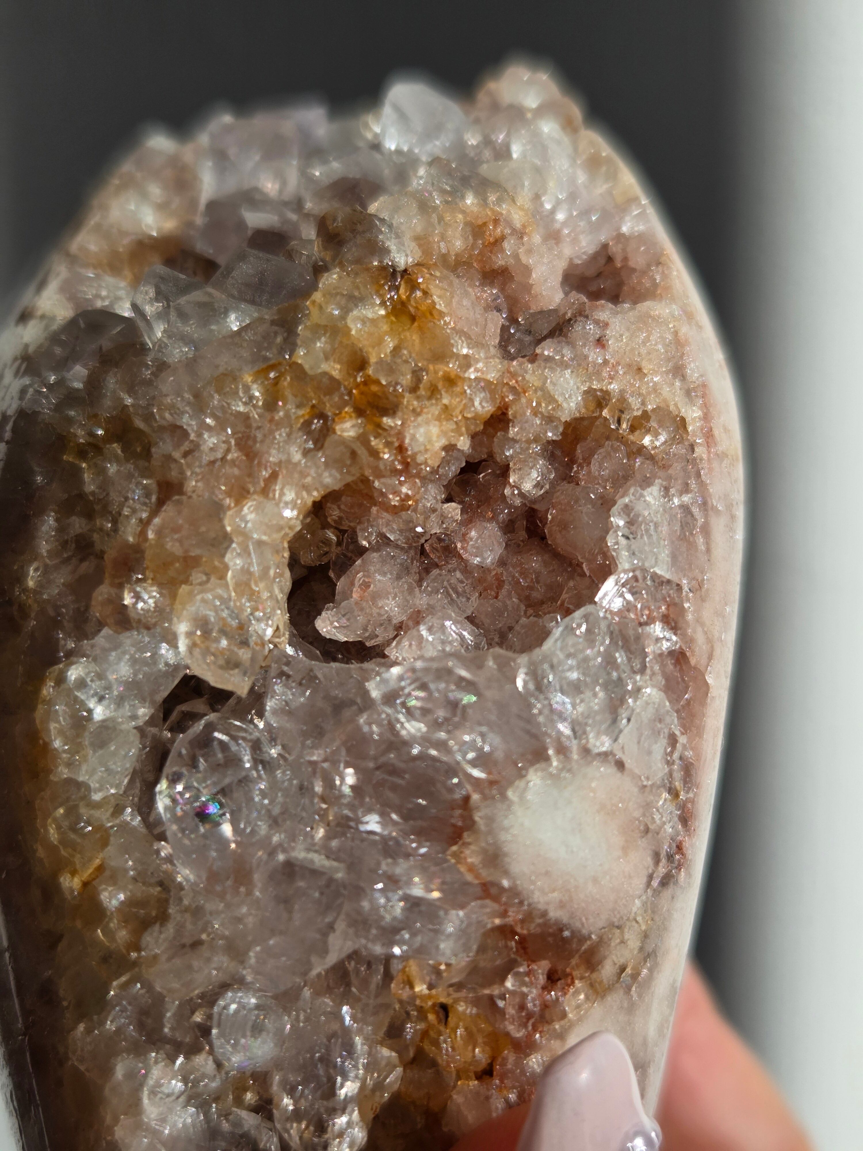淡いピンクとパープルの結晶がキラキラ輝き、虹も見えます。