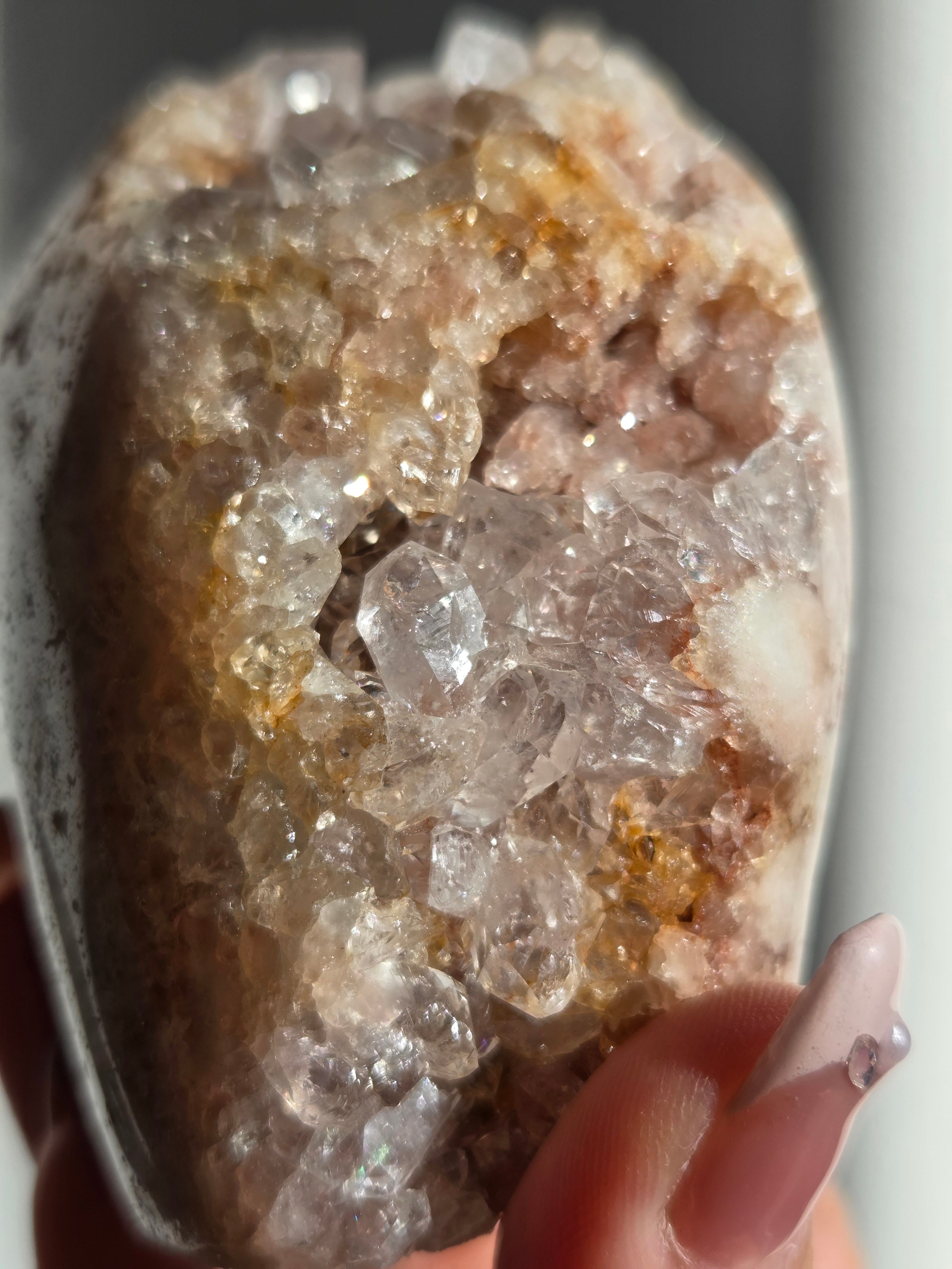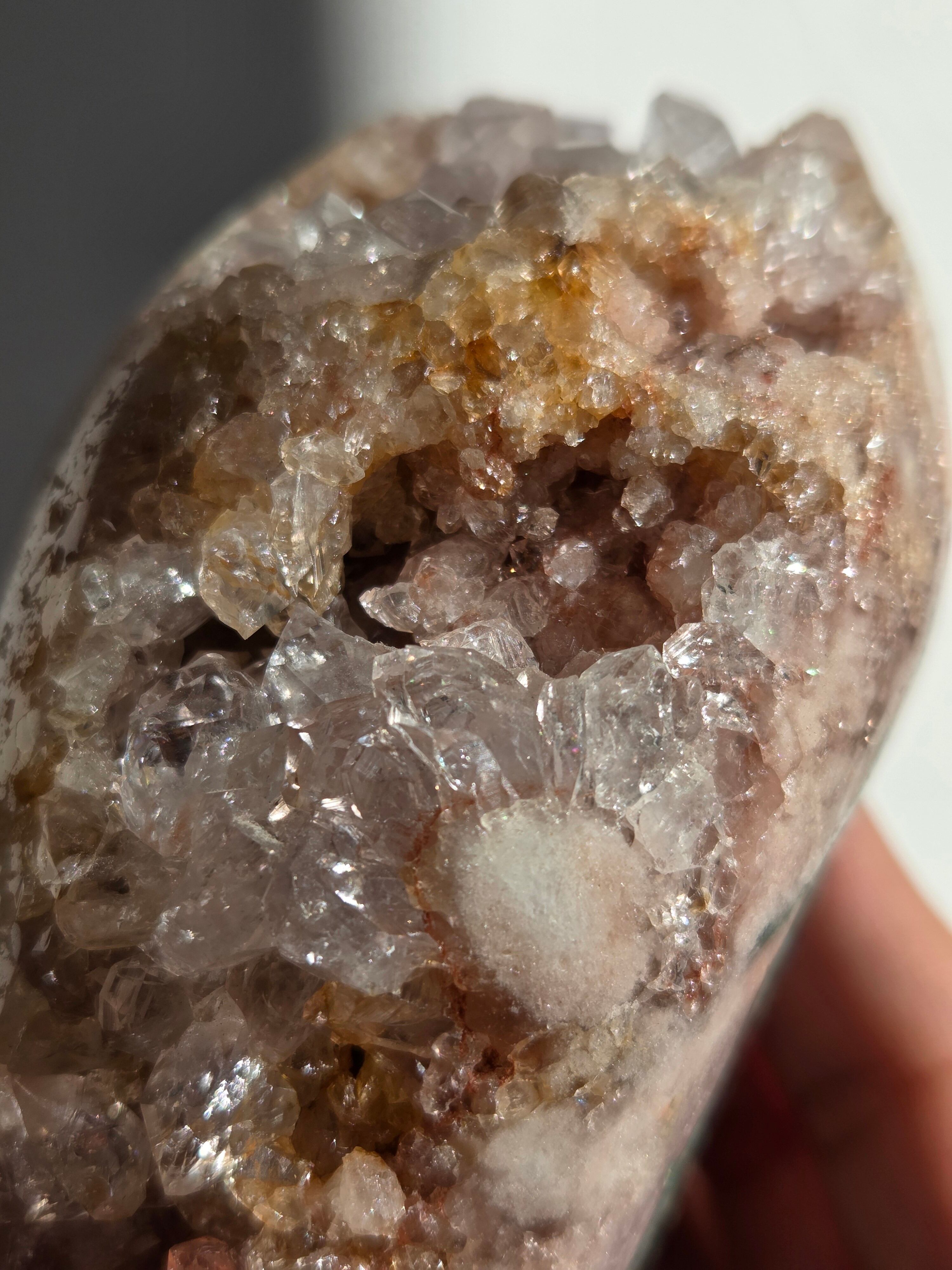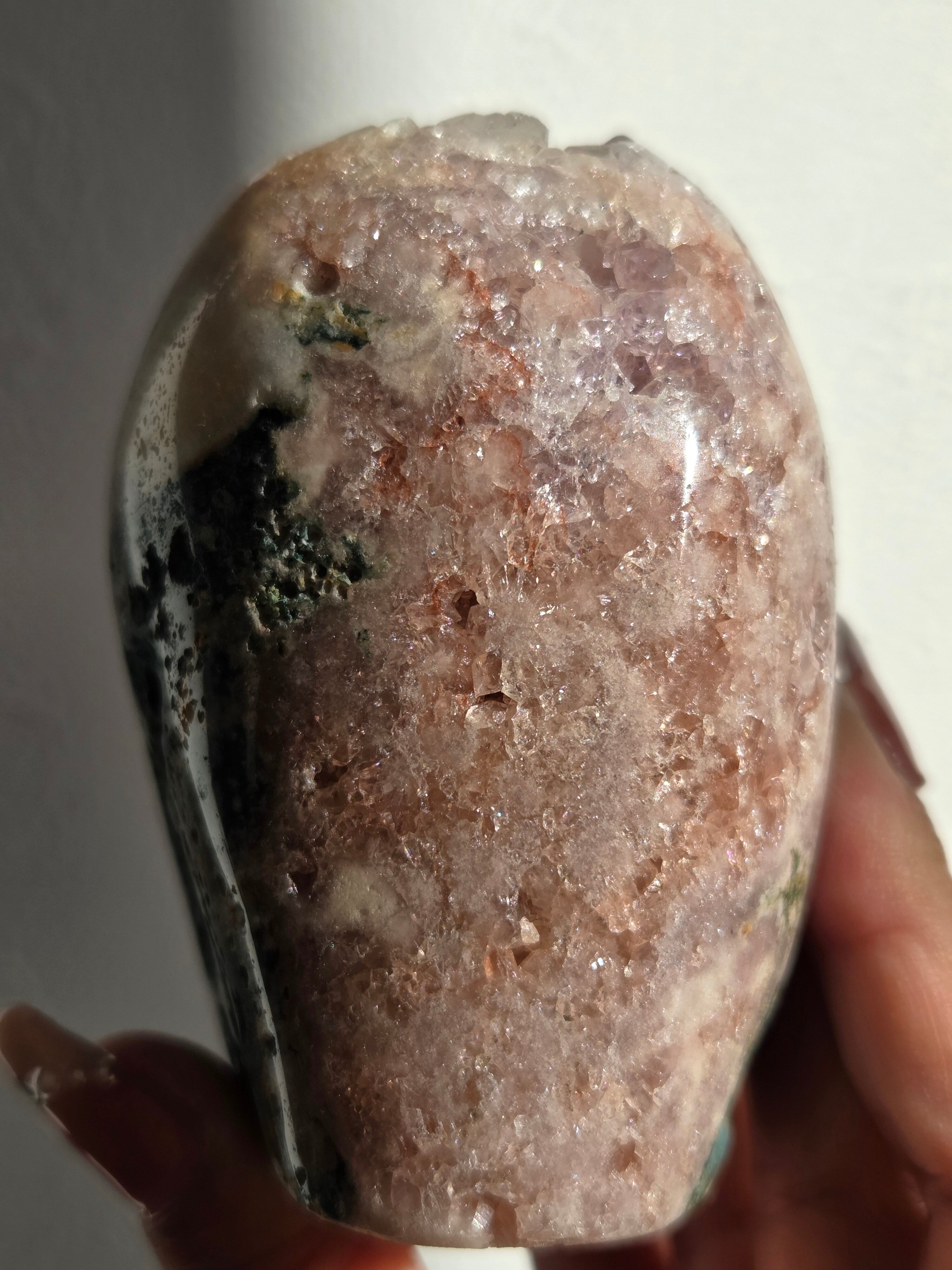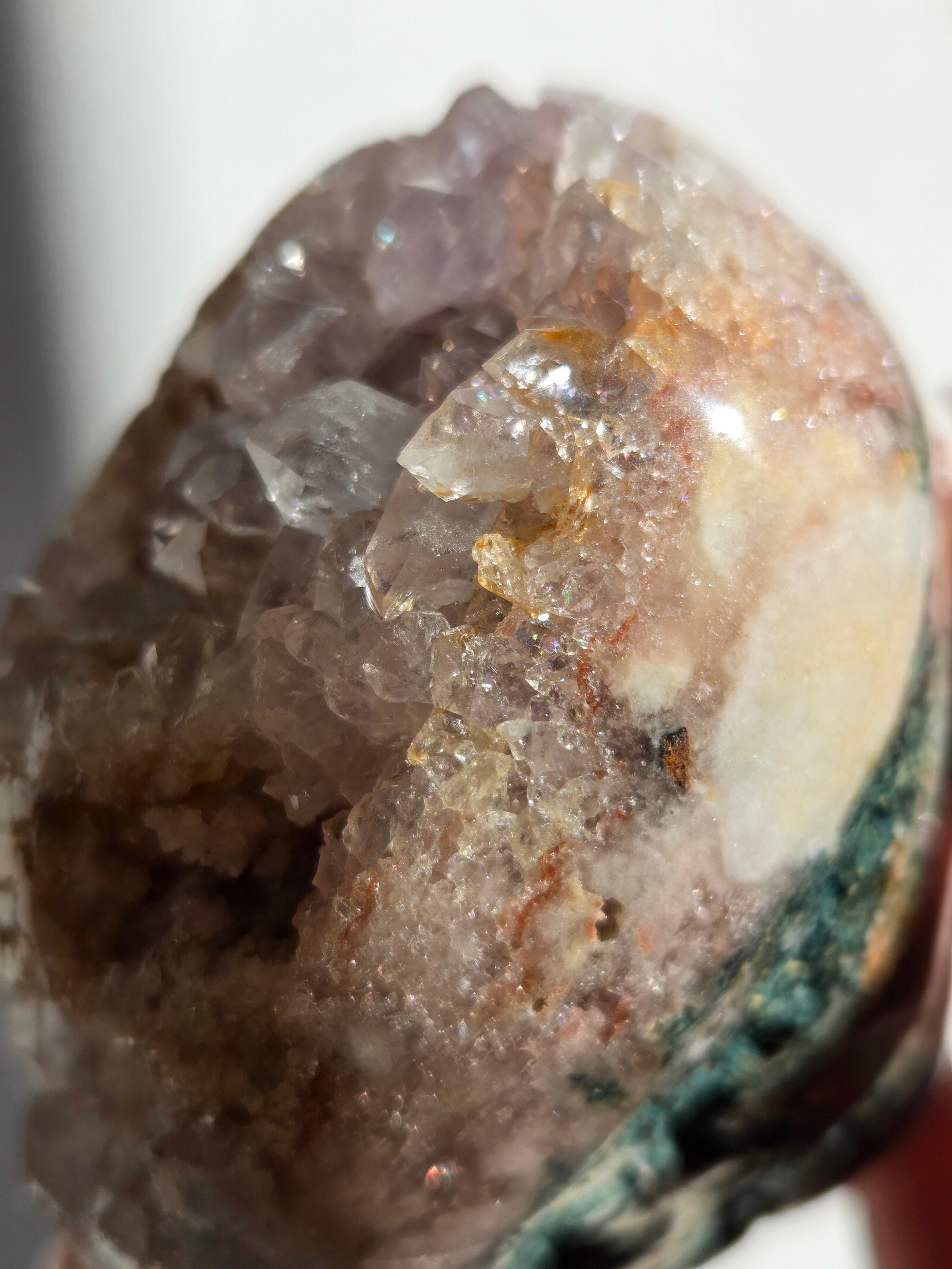 淡いピンクとパープルの結晶がキラキラ輝き、虹も見えます。
