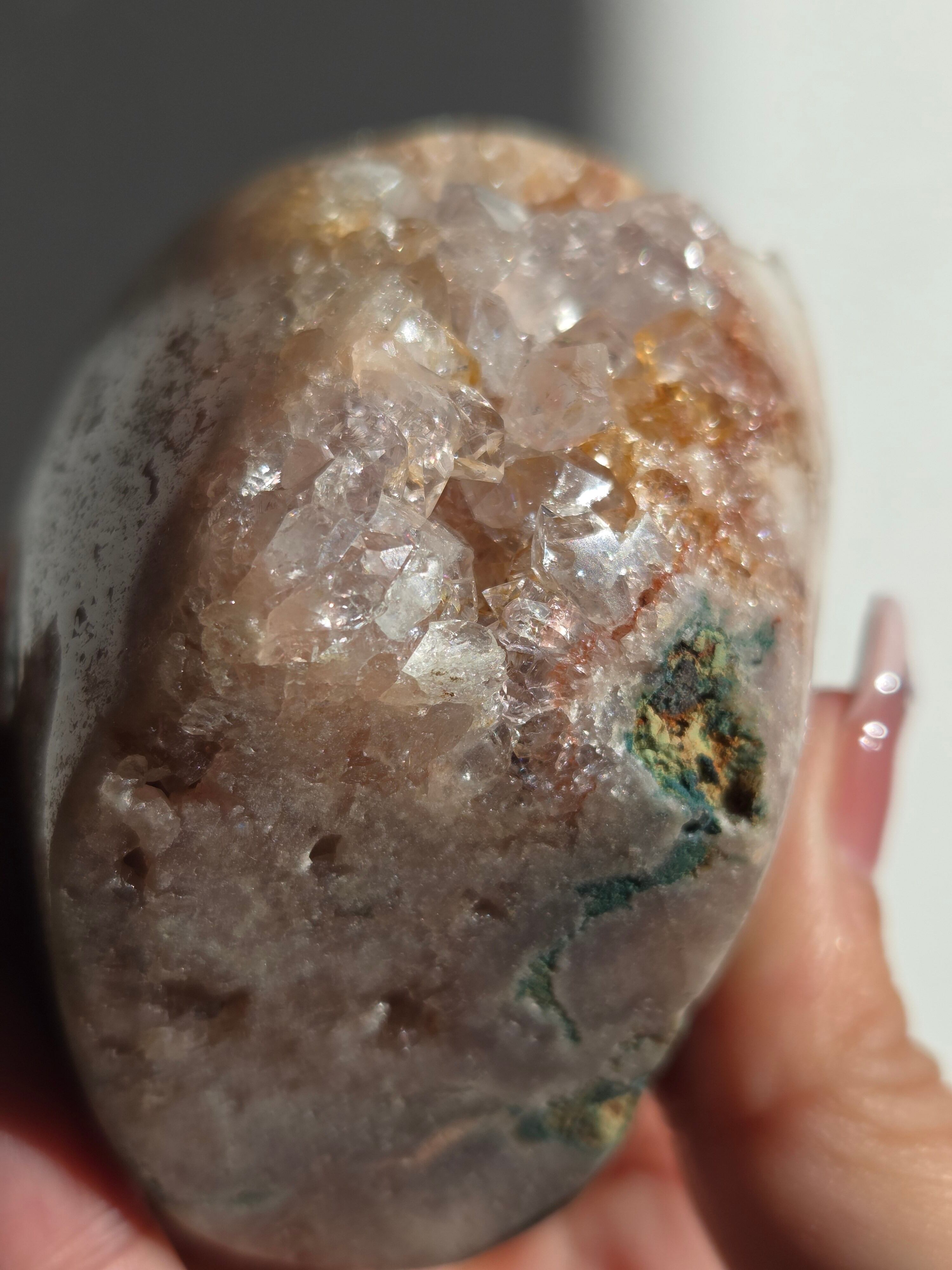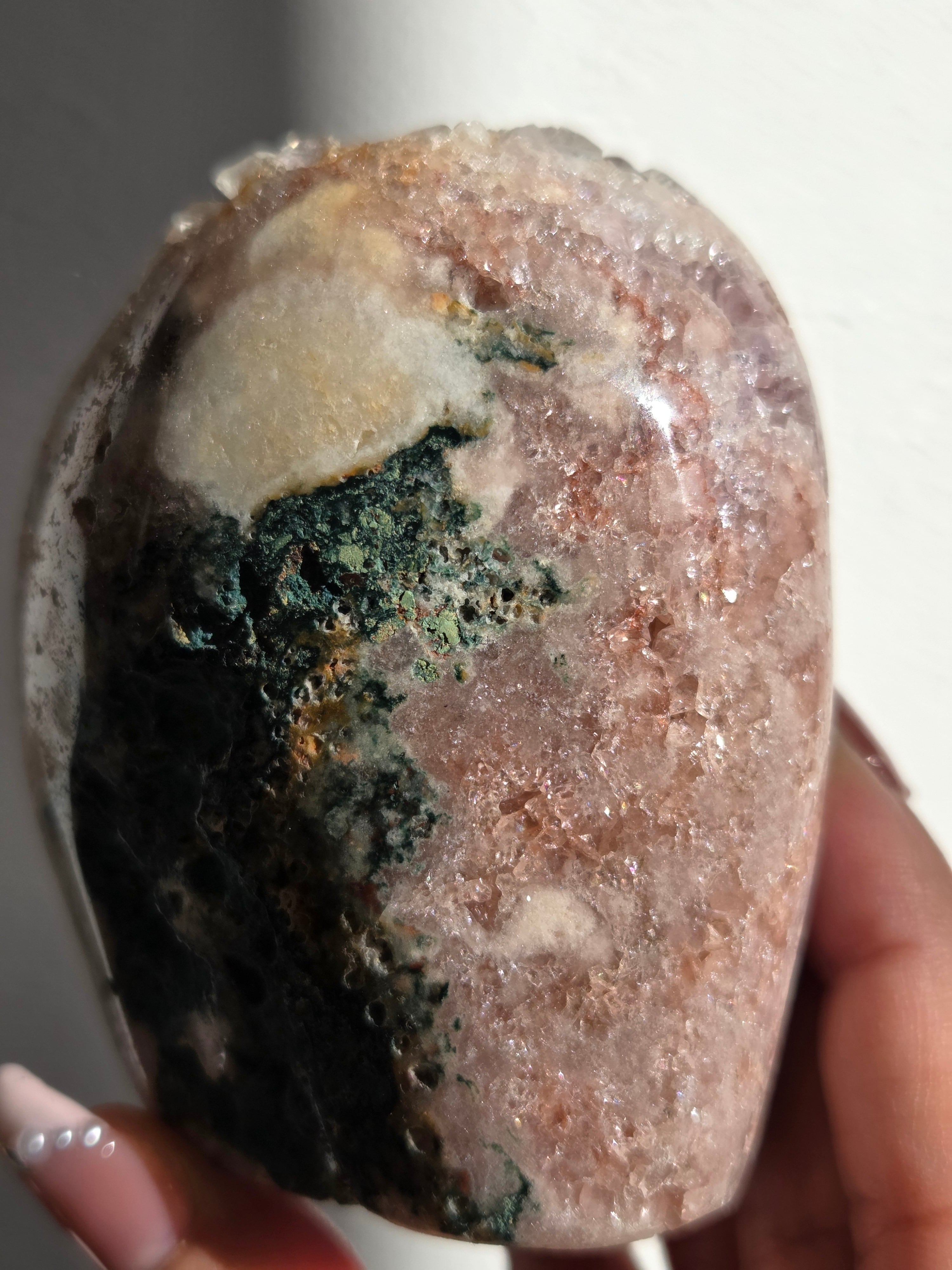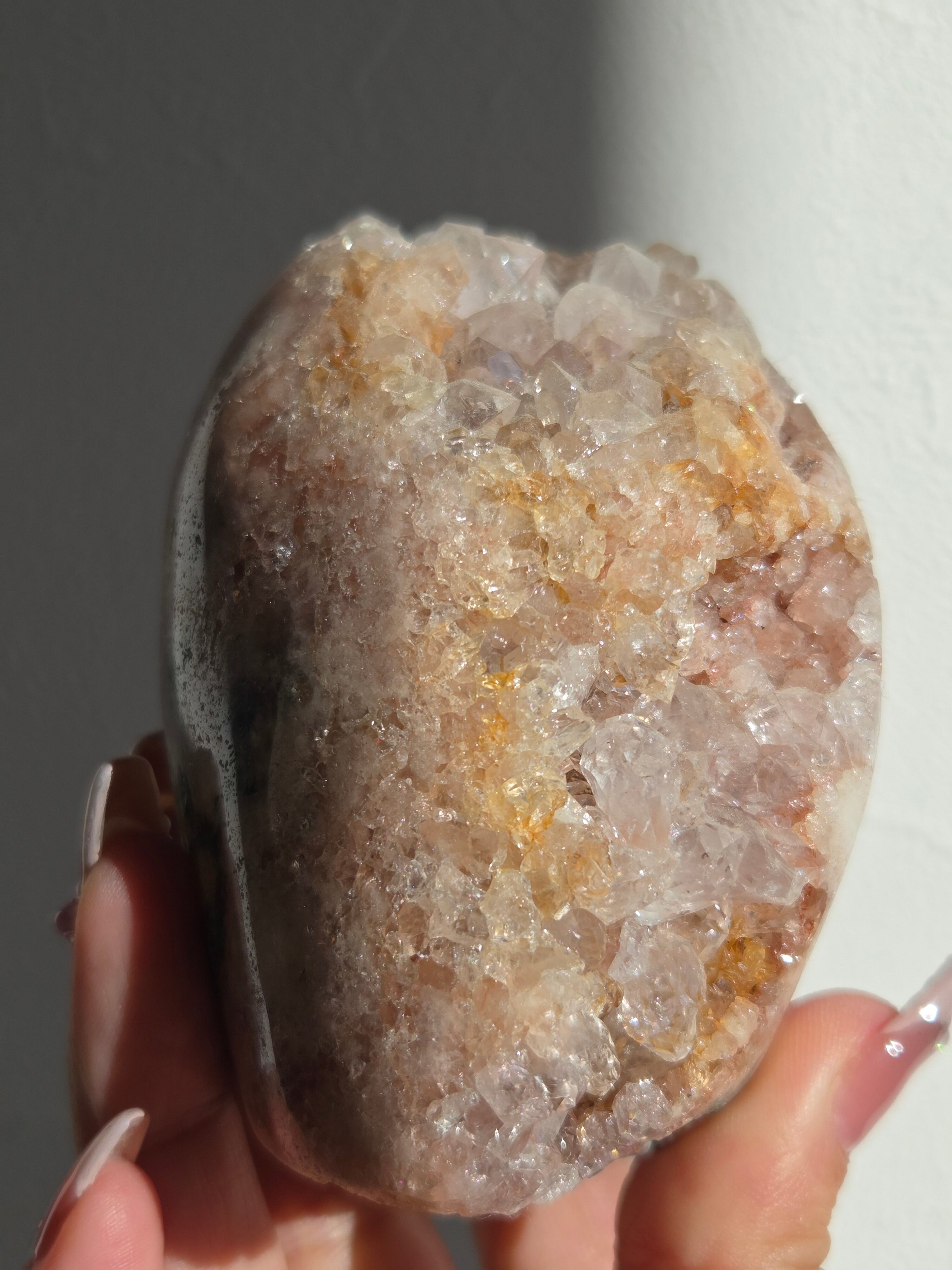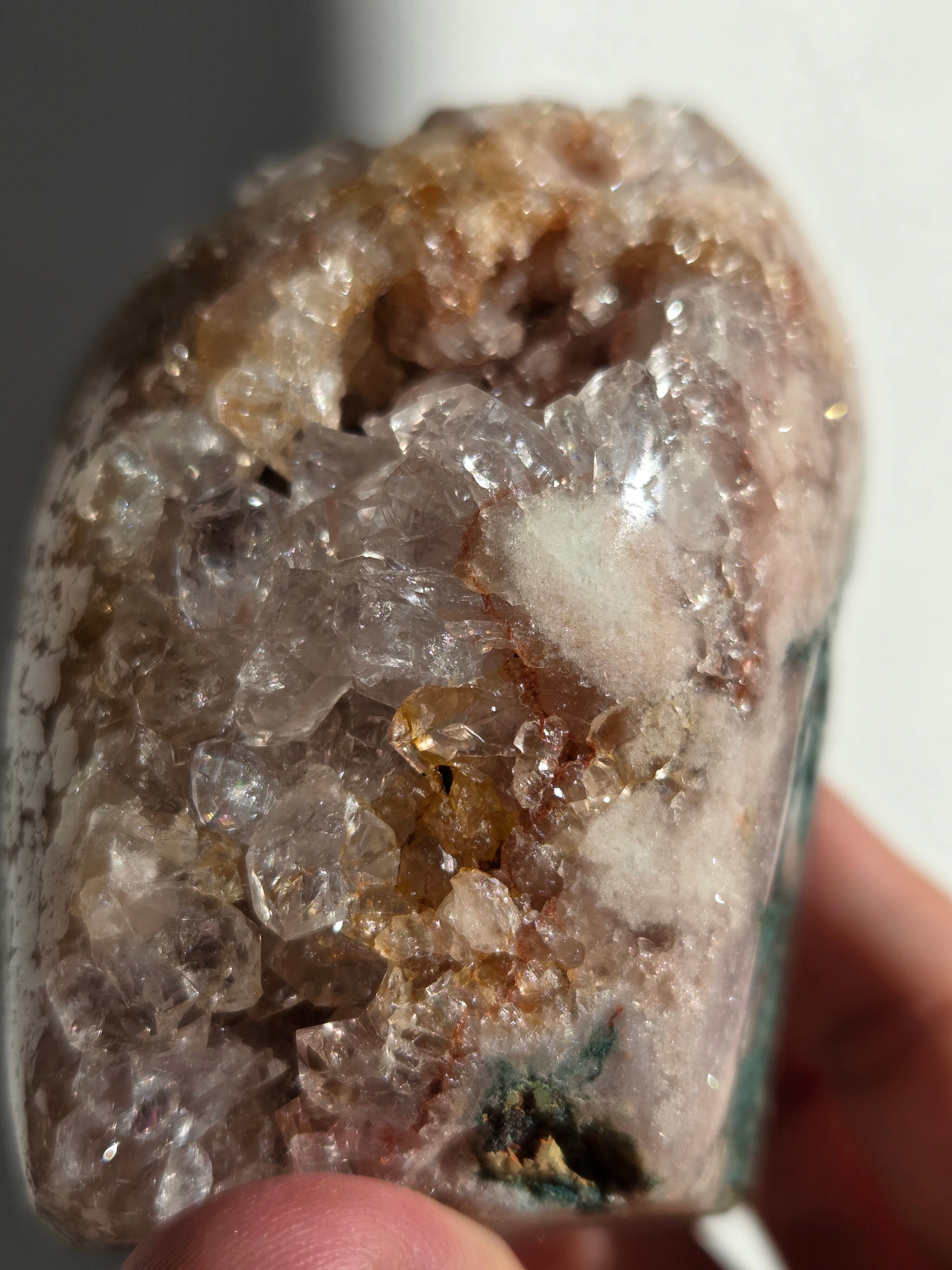 淡いピンクとパープルの結晶がキラキラ輝き、虹も見えます。