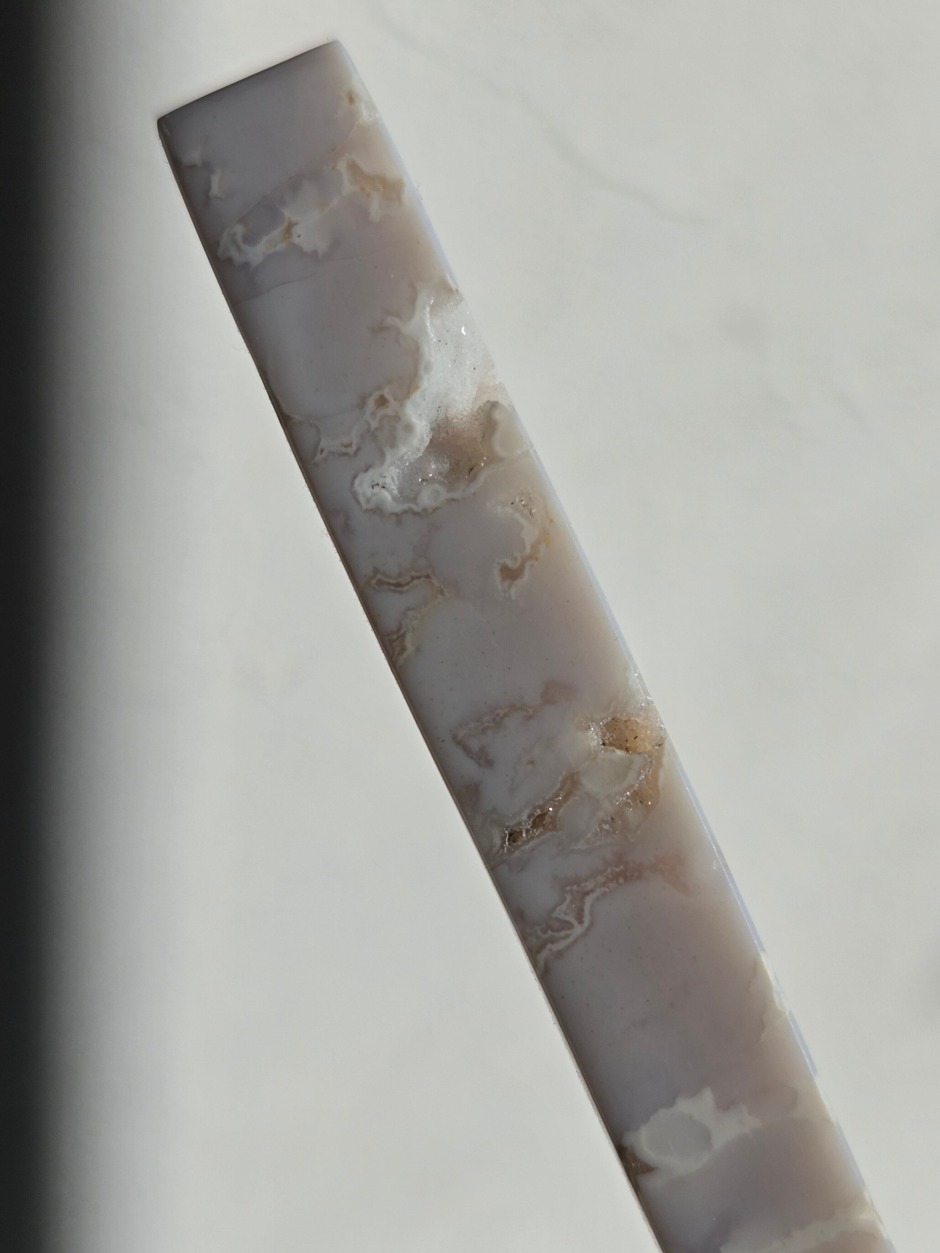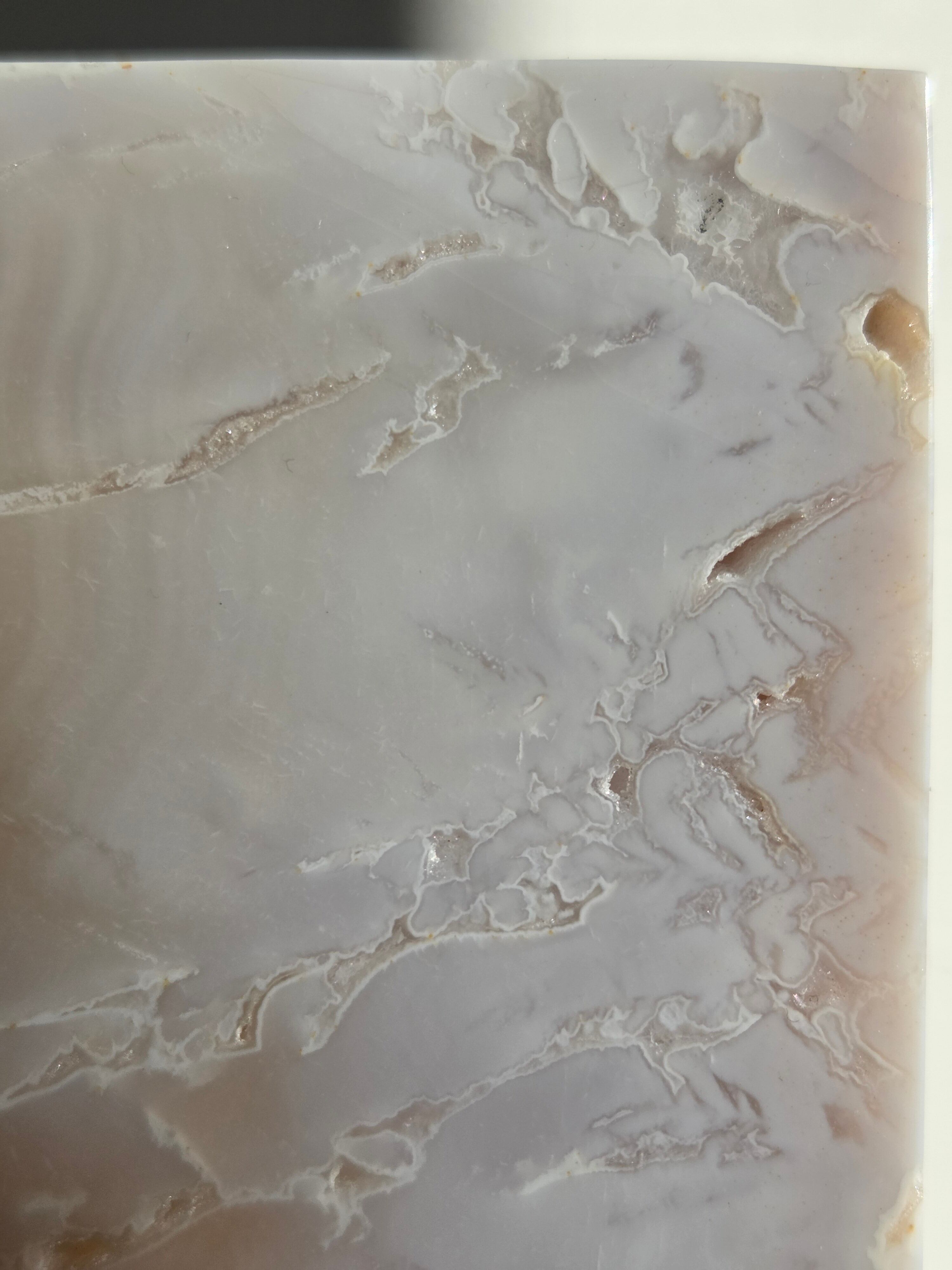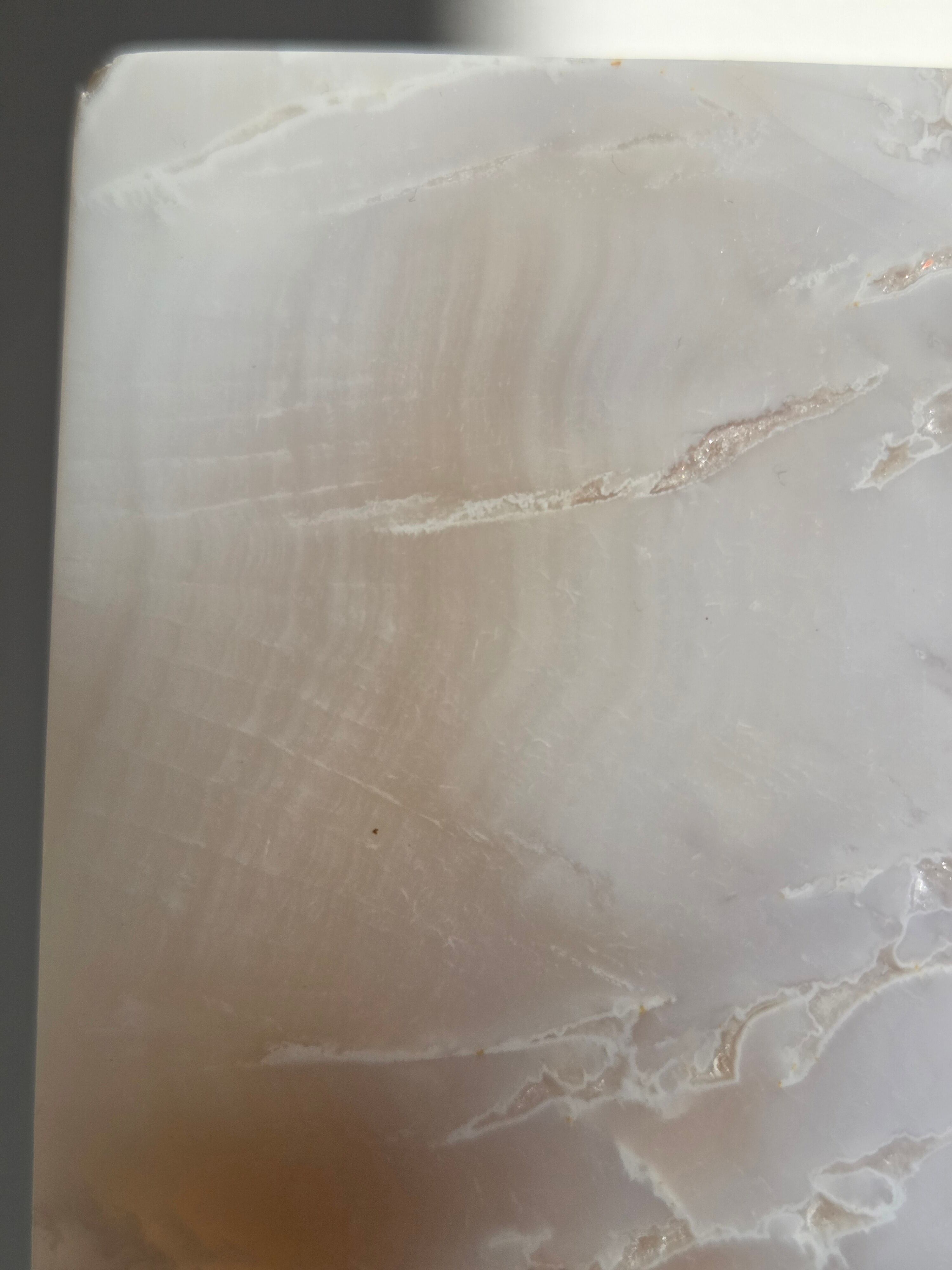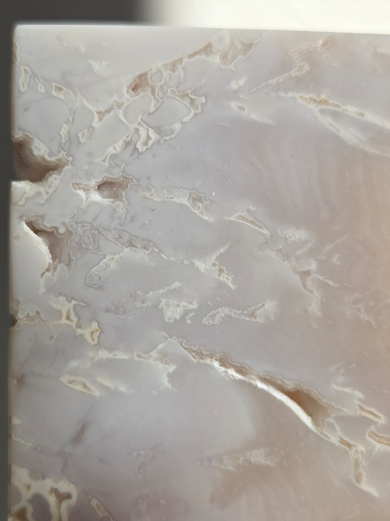 ホワイトスノーアゲート(白雪瑪瑙)は、雪のような純粋な白や乳白色が特徴のホワイトアゲート(白瑪瑙)のことで、穏やかなエネルギーで心を癒し、不安やストレスを和らげ、人間関係の改善、素直さや優しさを引き出す効果があるとされるパワーストーンです。縞模様(アゲート)や、水晶の結晶(ドゥルージー)が内包された神秘的なものもあり、持ち主に安らぎと精神的な安定をもたらすといわれています