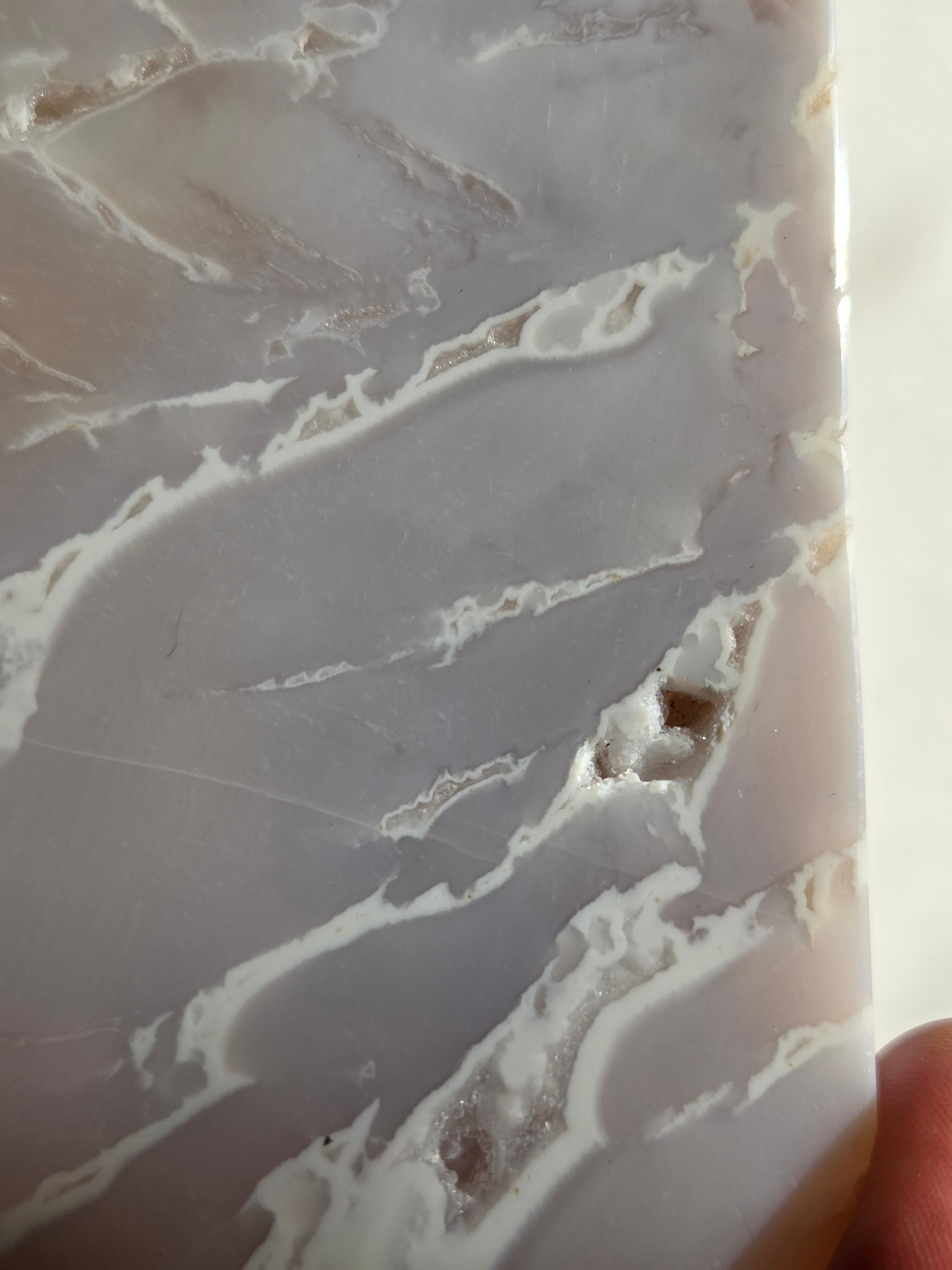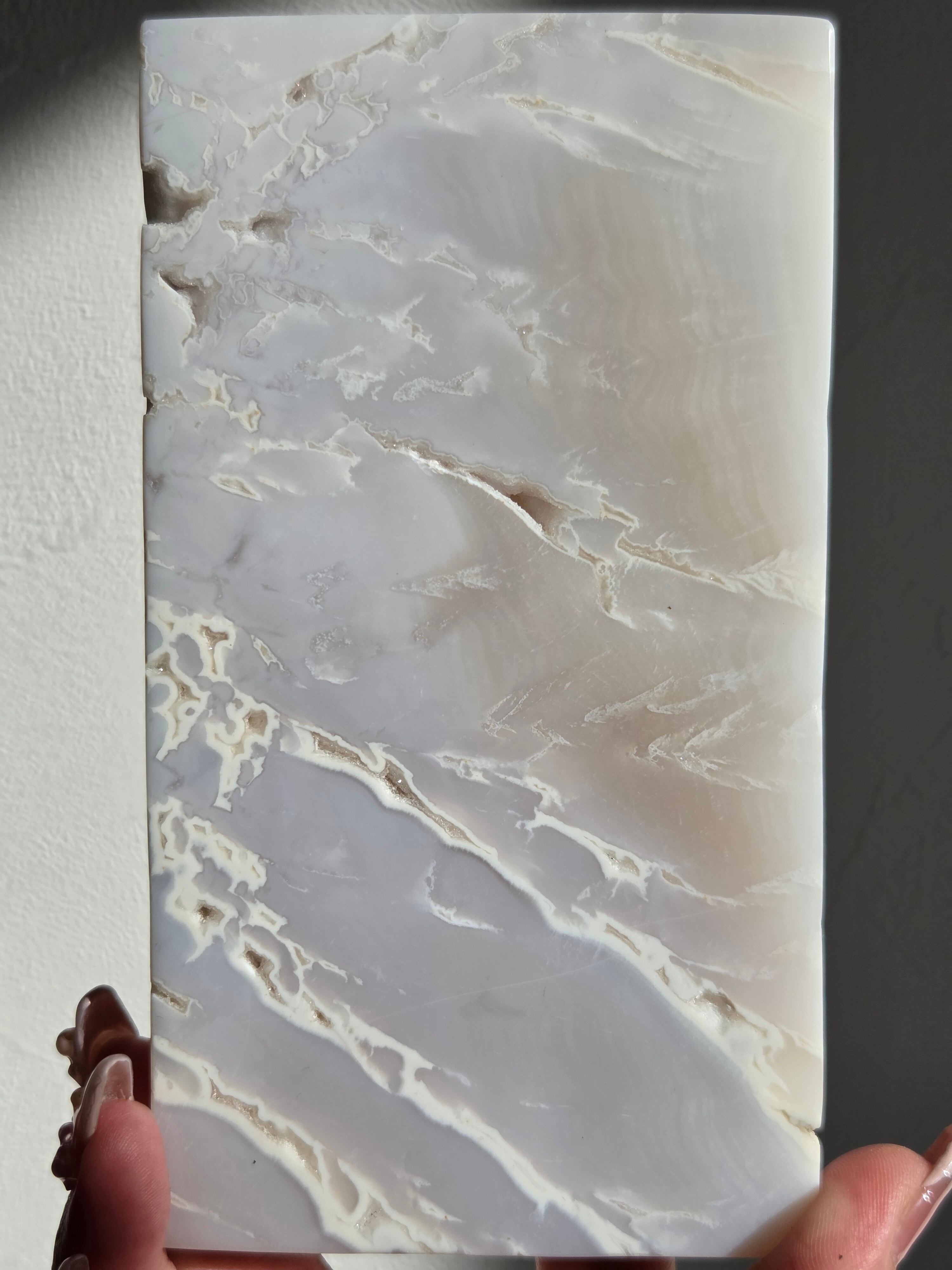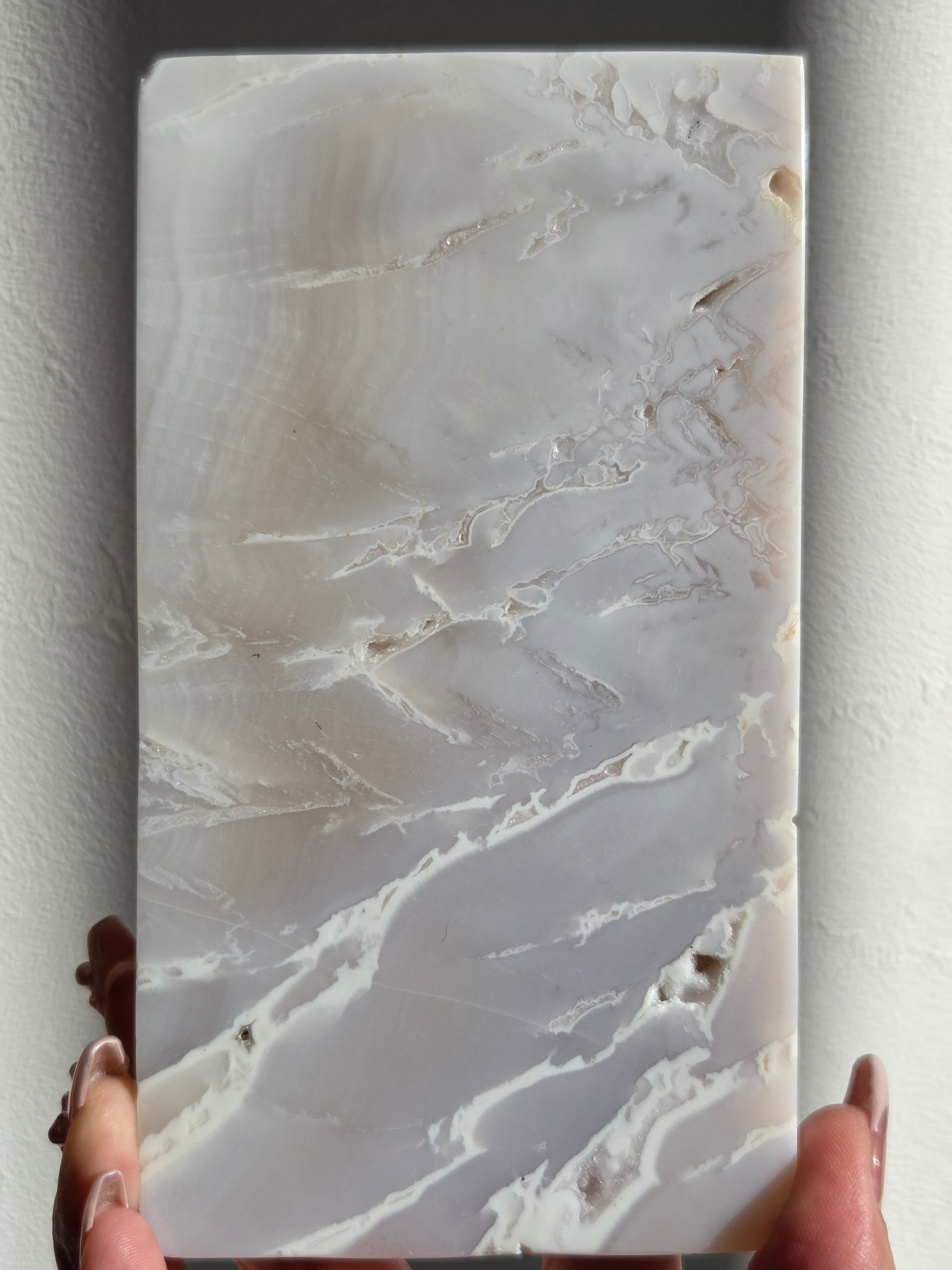 ホワイトスノーアゲート(白雪瑪瑙)は、雪のような純粋な白や乳白色が特徴のホワイトアゲート(白瑪瑙)のことで、穏やかなエネルギーで心を癒し、不安やストレスを和らげ、人間関係の改善、素直さや優しさを引き出す効果があるとされるパワーストーンです。縞模様(アゲート)や、水晶の結晶(ドゥルージー)が内包された神秘的なものもあり、持ち主に安らぎと精神的な安定をもたらすといわれています