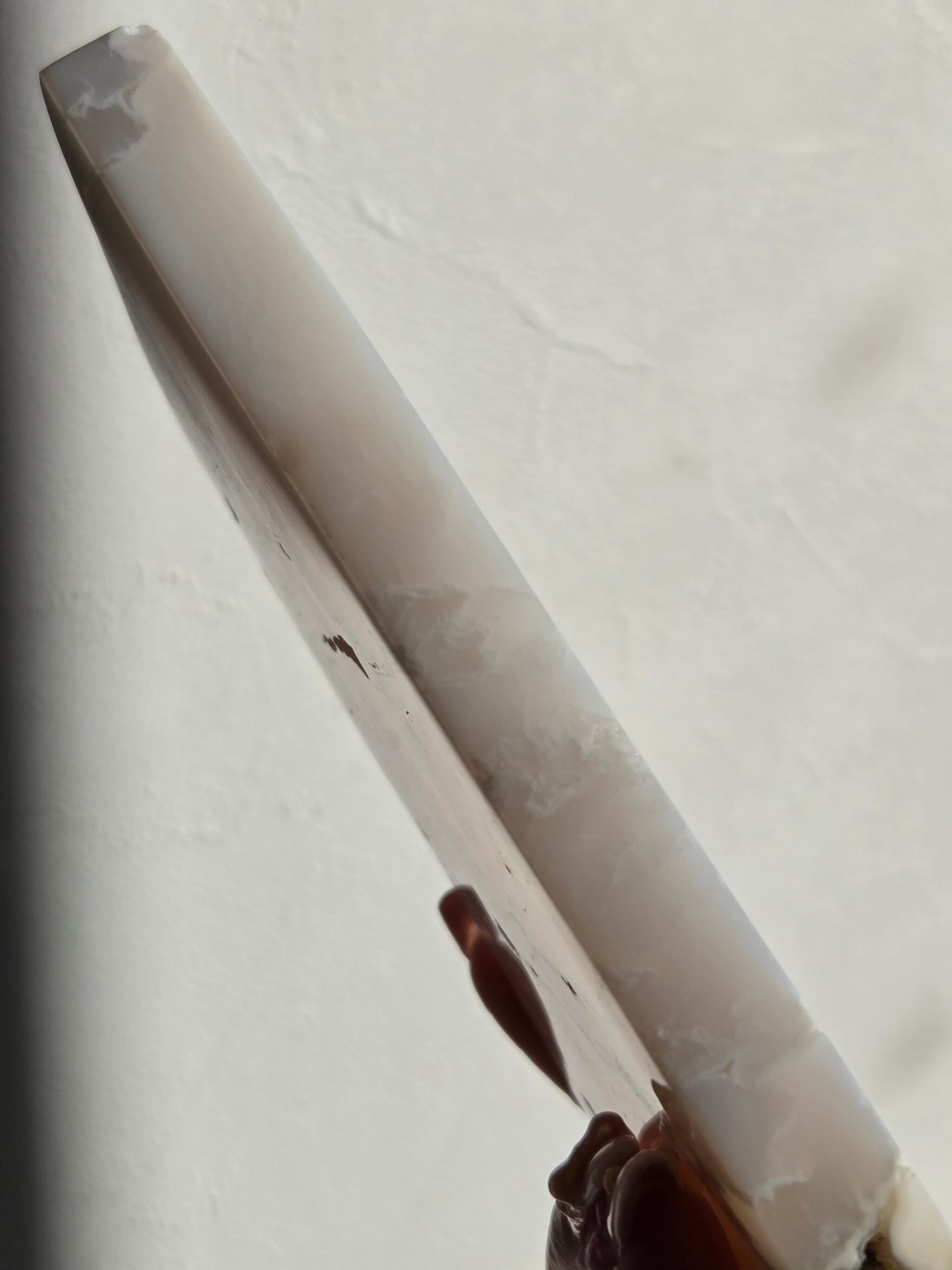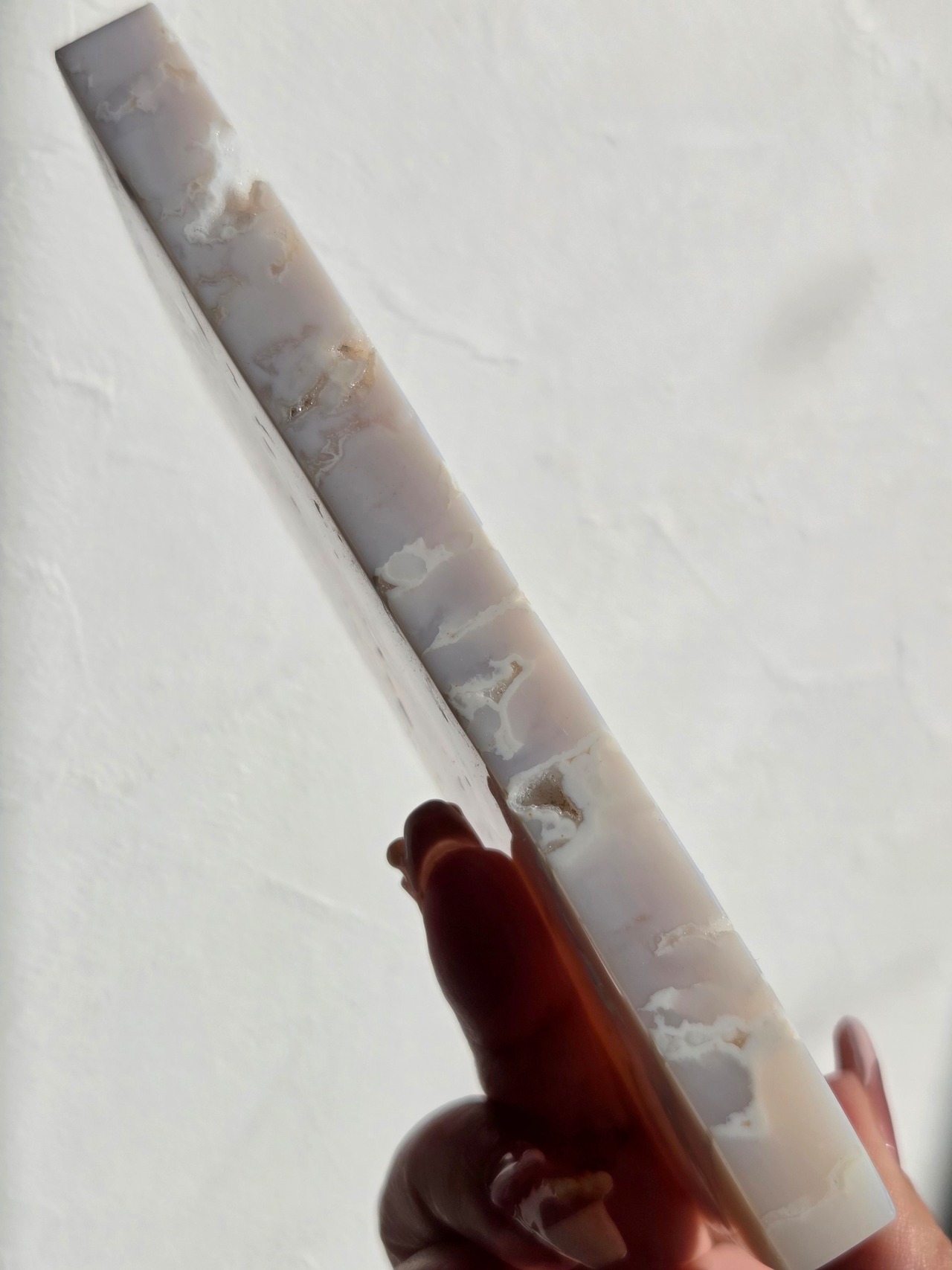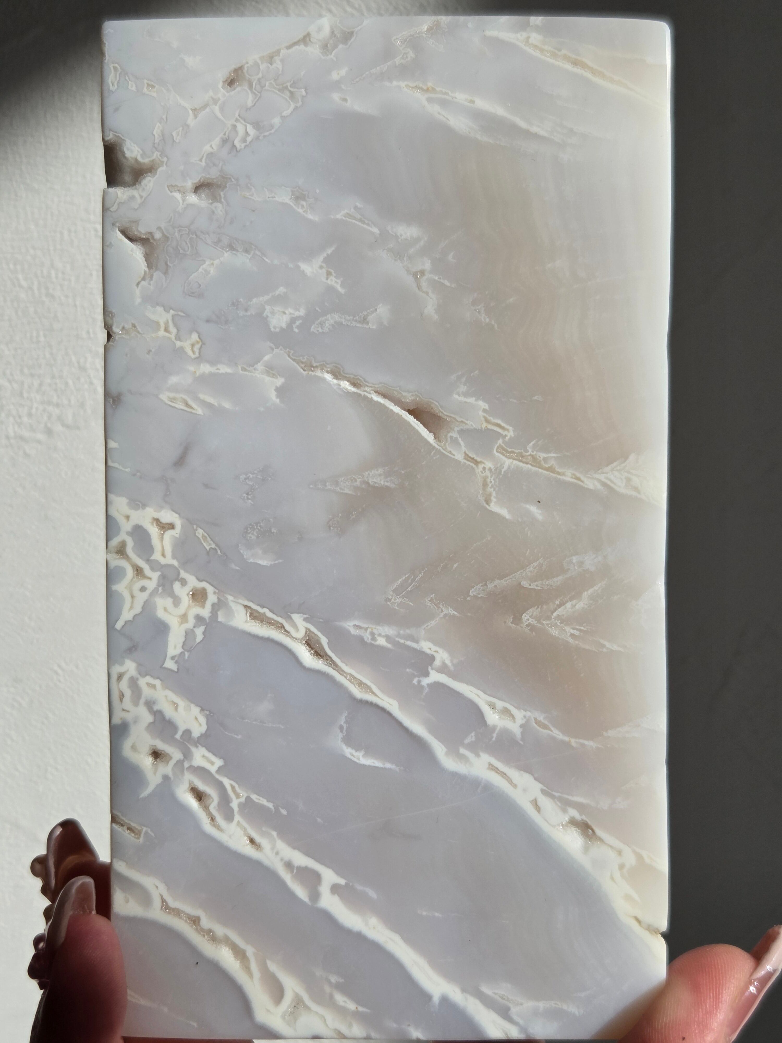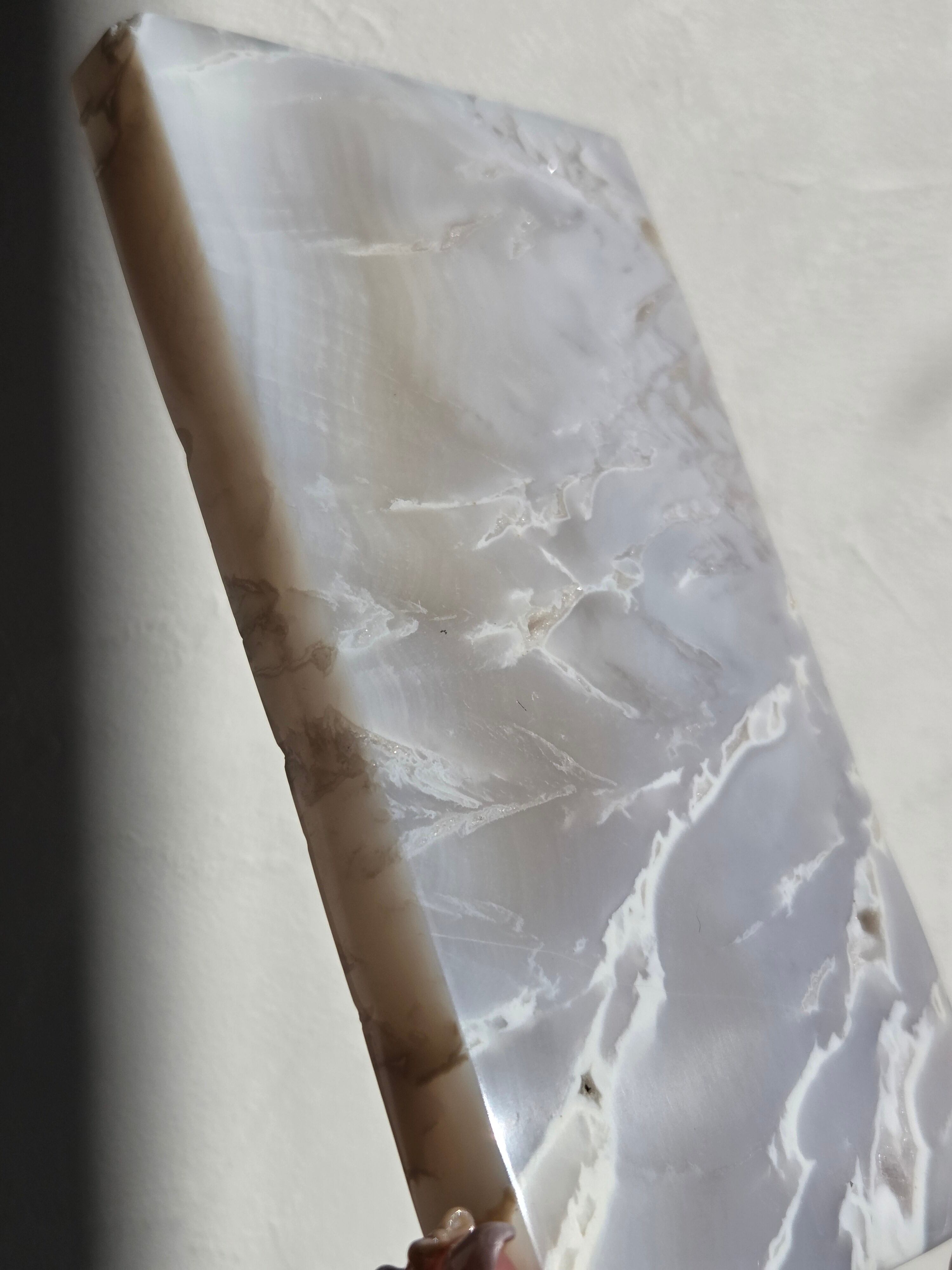 ホワイトスノーアゲート(白雪瑪瑙)は、雪のような純粋な白や乳白色が特徴のホワイトアゲート(白瑪瑙)のことで、穏やかなエネルギーで心を癒し、不安やストレスを和らげ、人間関係の改善、素直さや優しさを引き出す効果があるとされるパワーストーンです。縞模様(アゲート)や、水晶の結晶(ドゥルージー)が内包された神秘的なものもあり、持ち主に安らぎと精神的な安定をもたらすといわれています