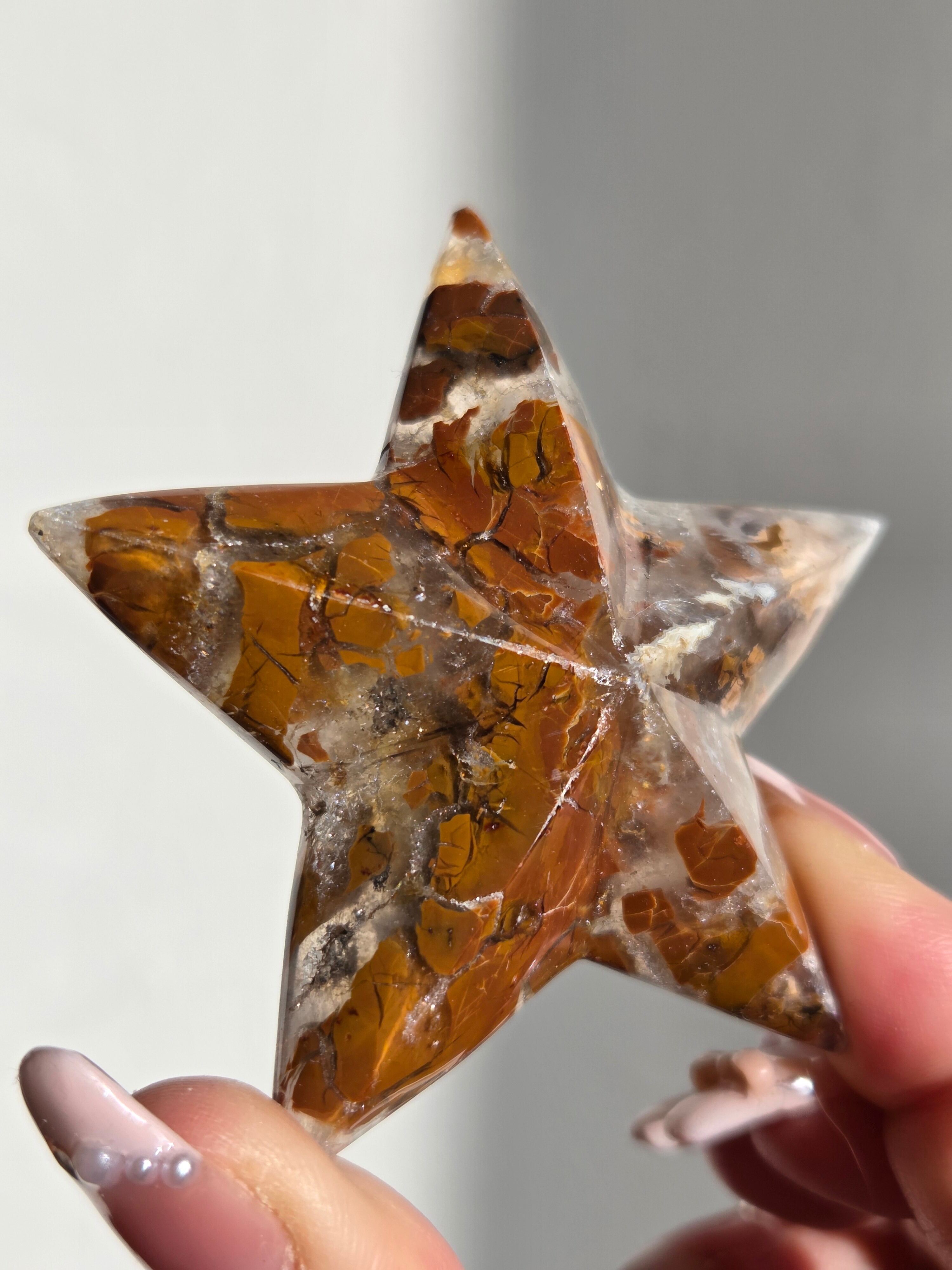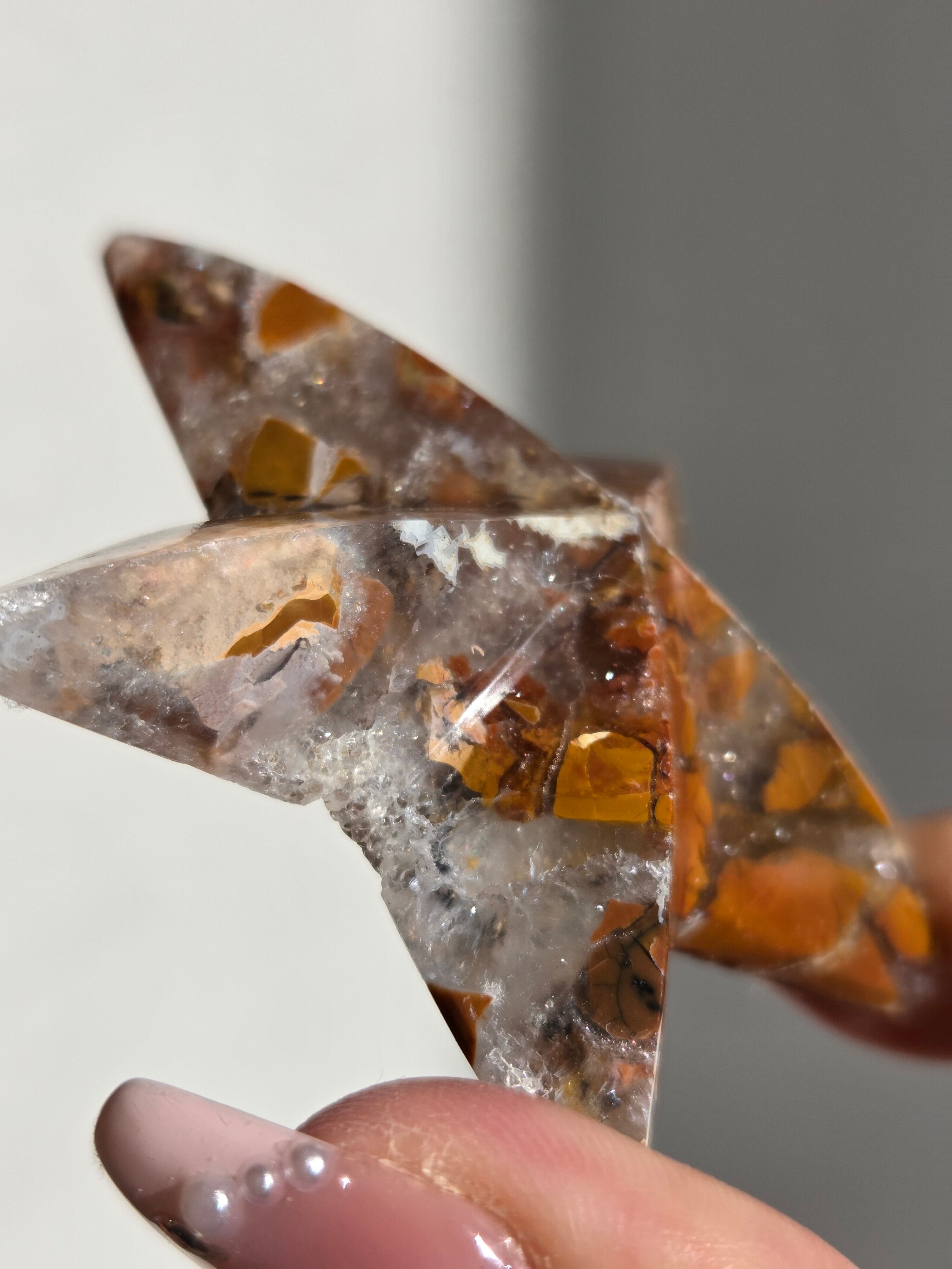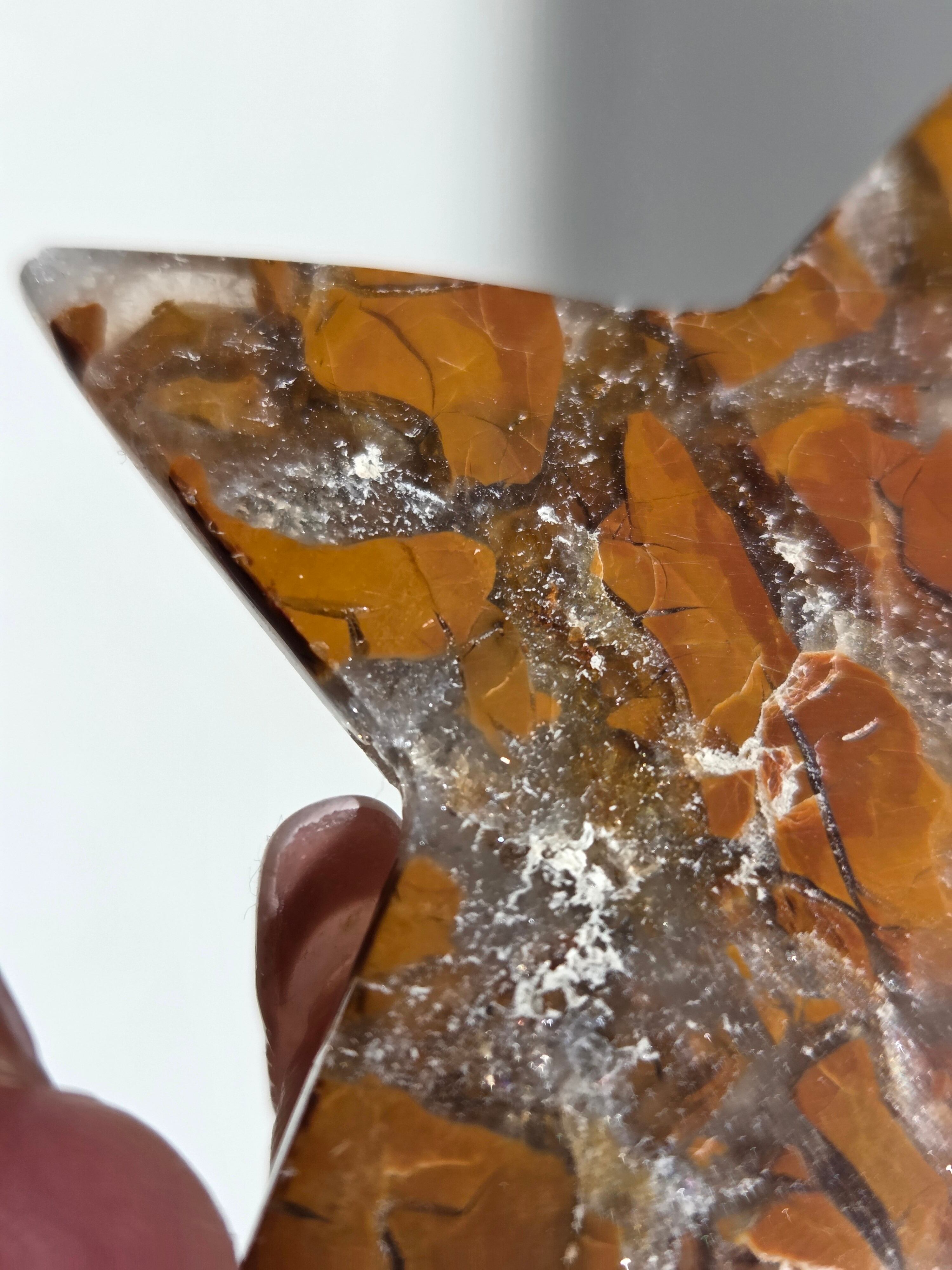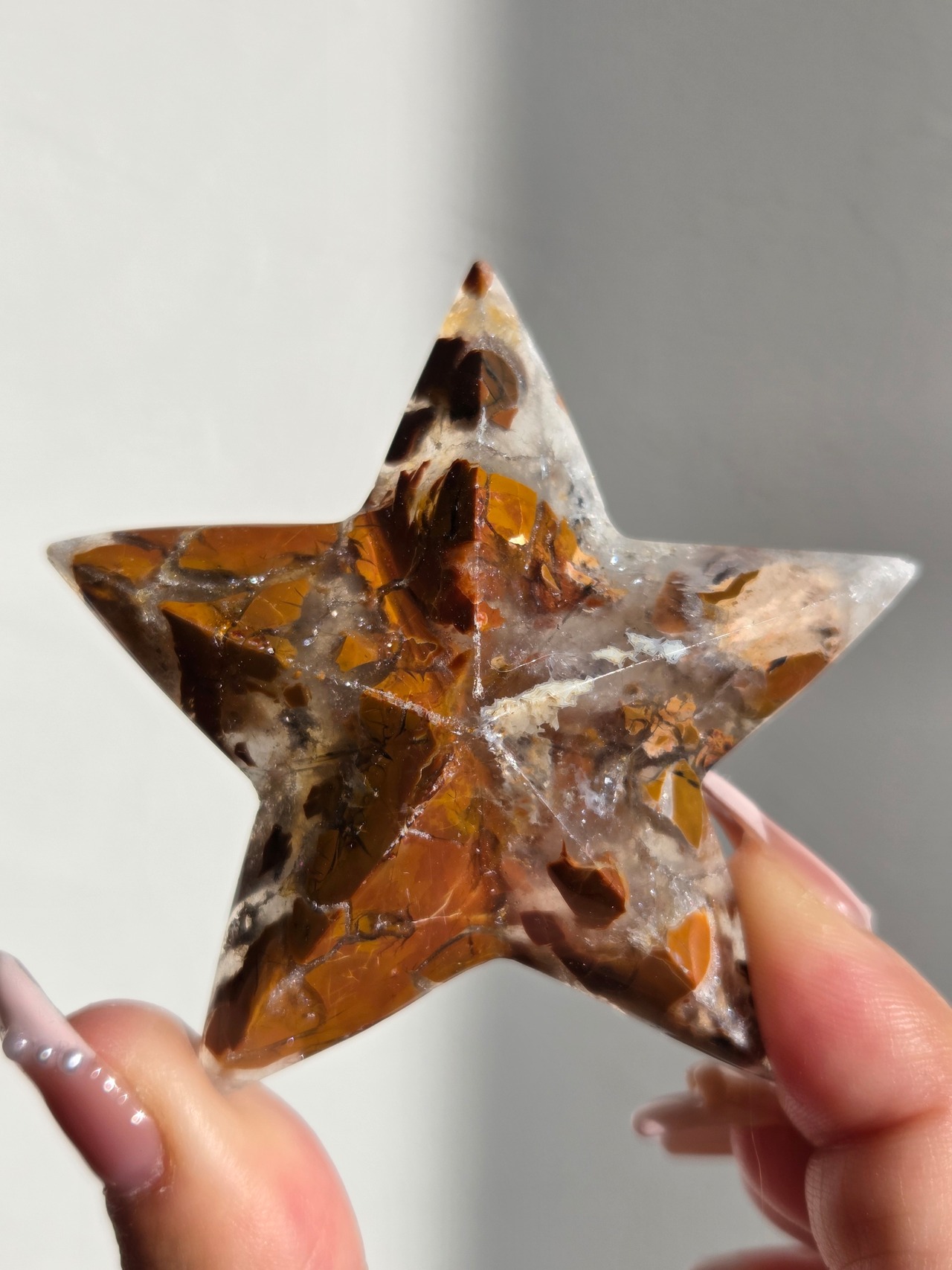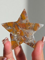 オレンジカラーをメインに、合間からクォーツの煌めきが見えるスターカービングです。
