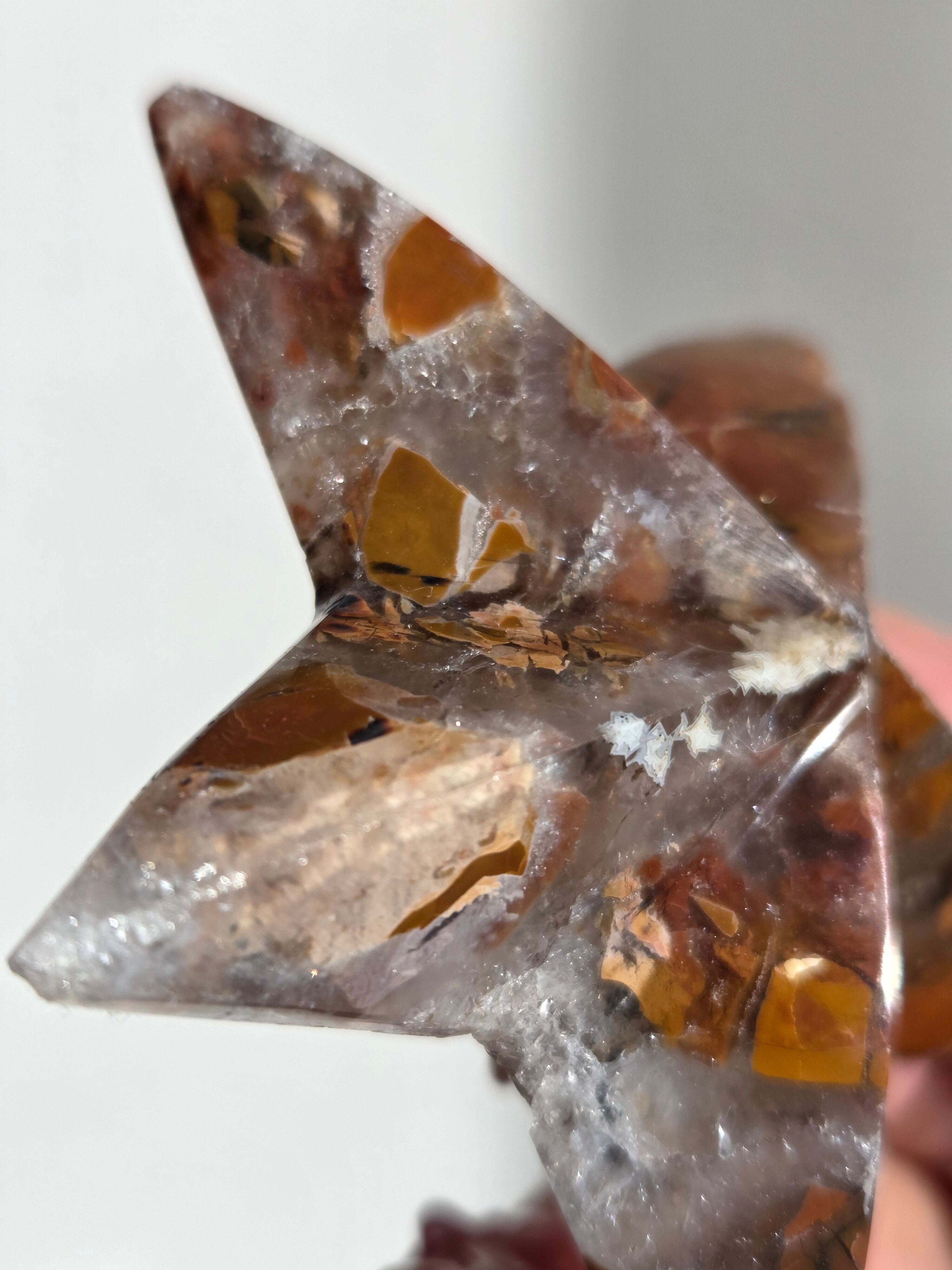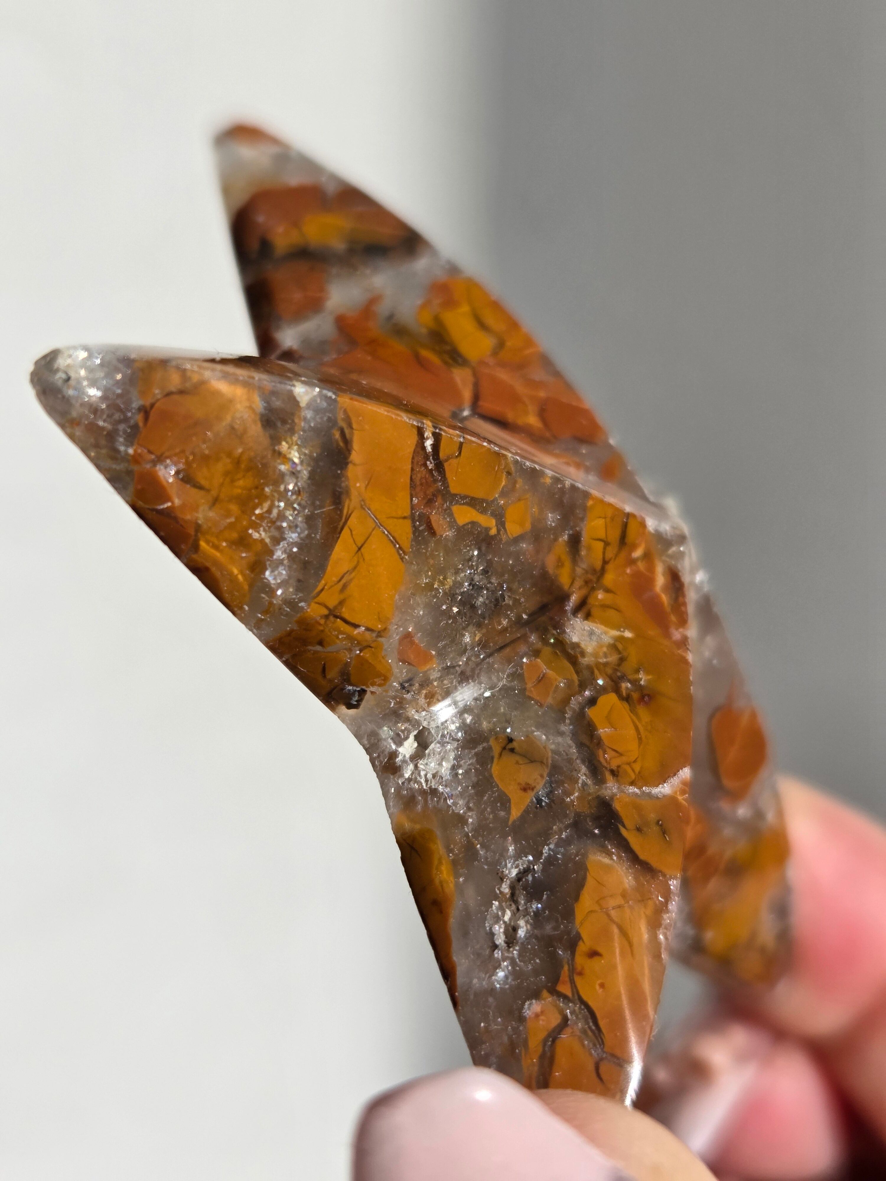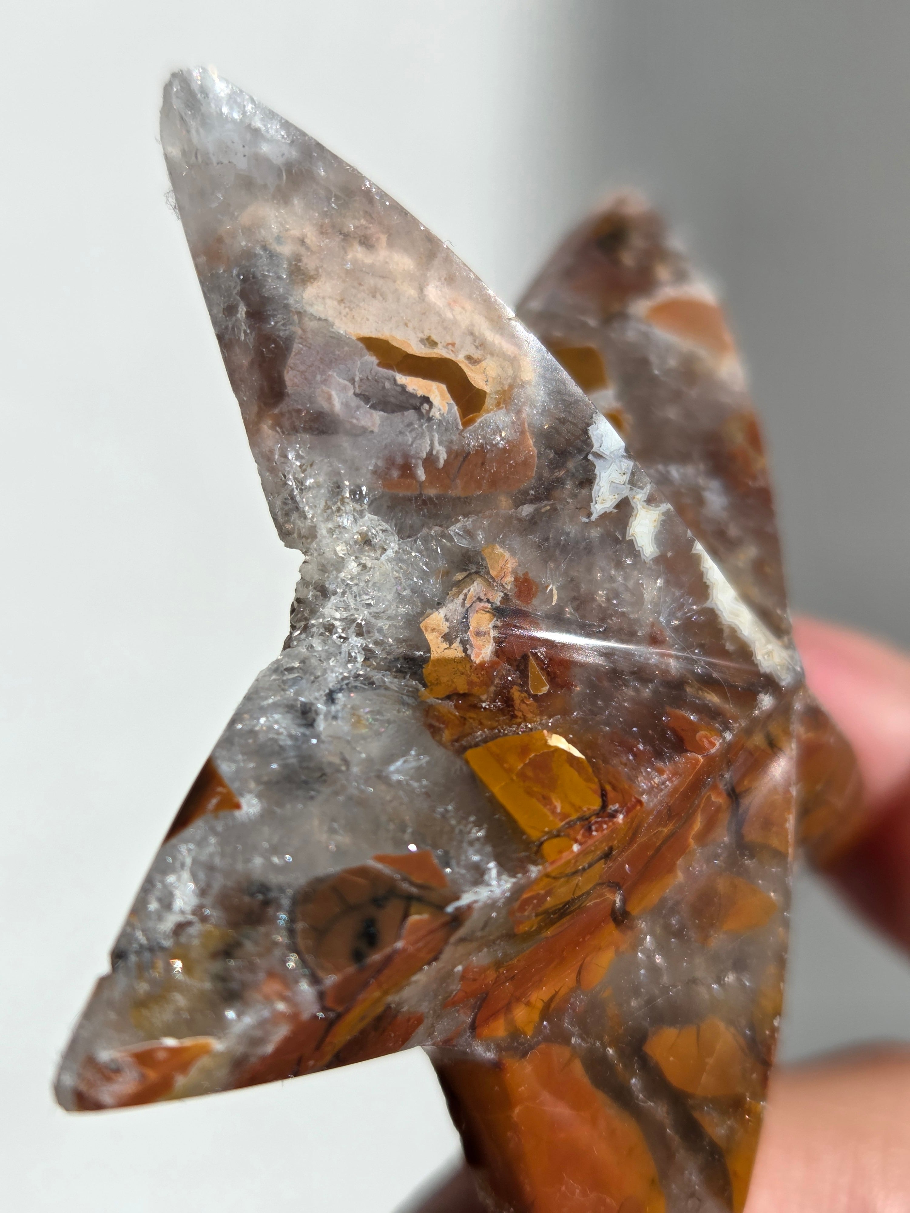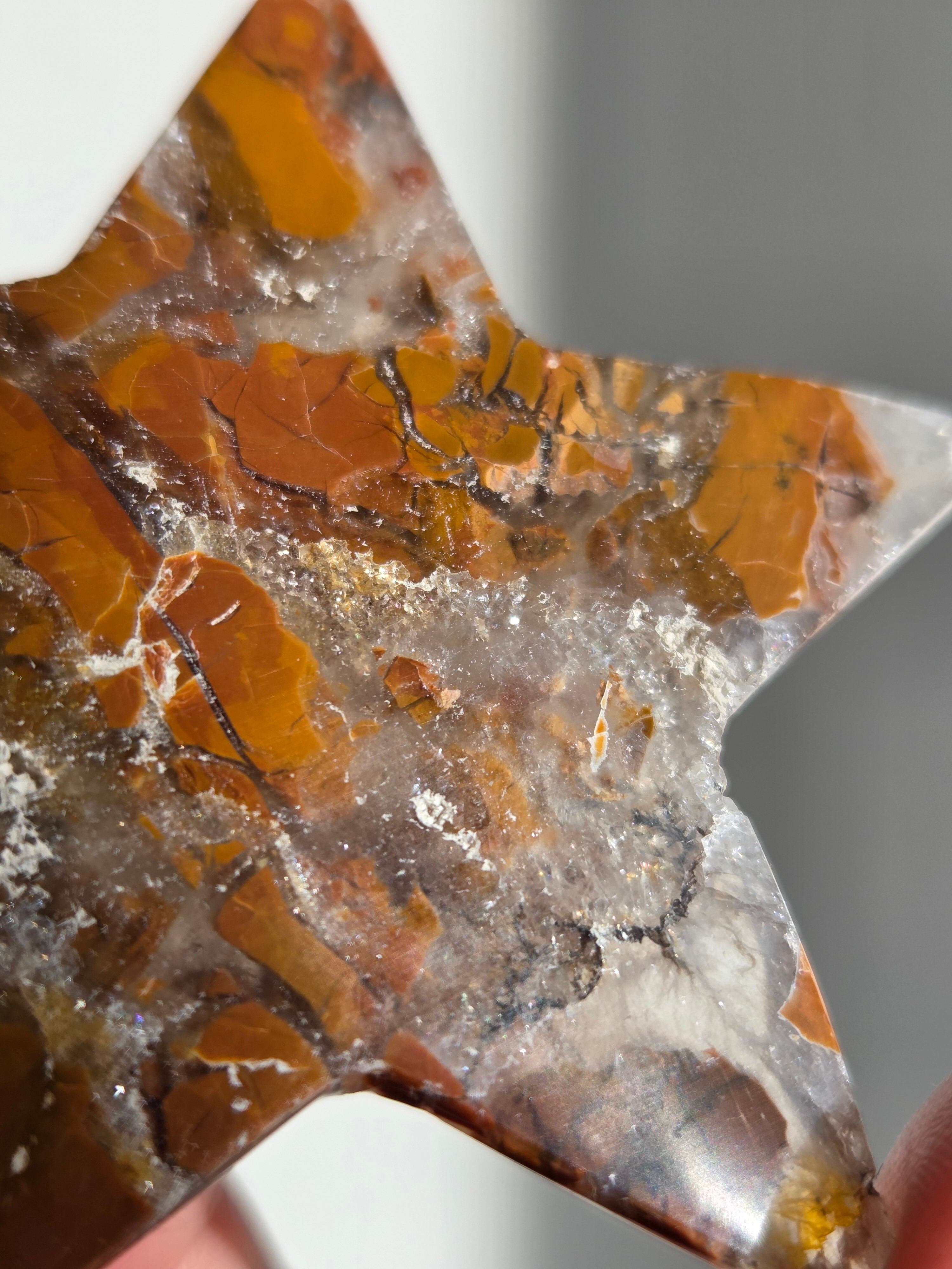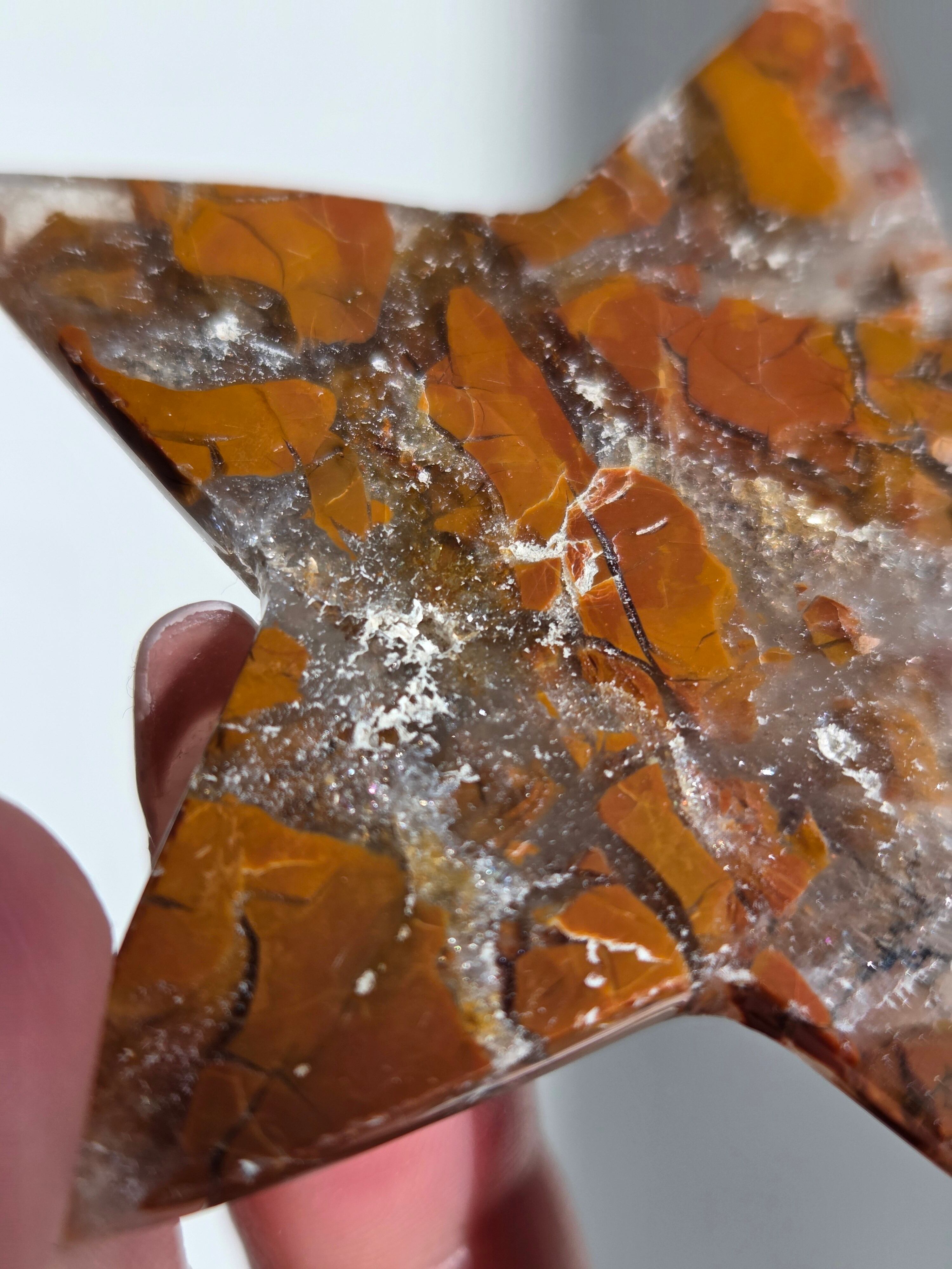 オレンジカラーをメインに、合間からクォーツの煌めきが見えるスターカービングです。