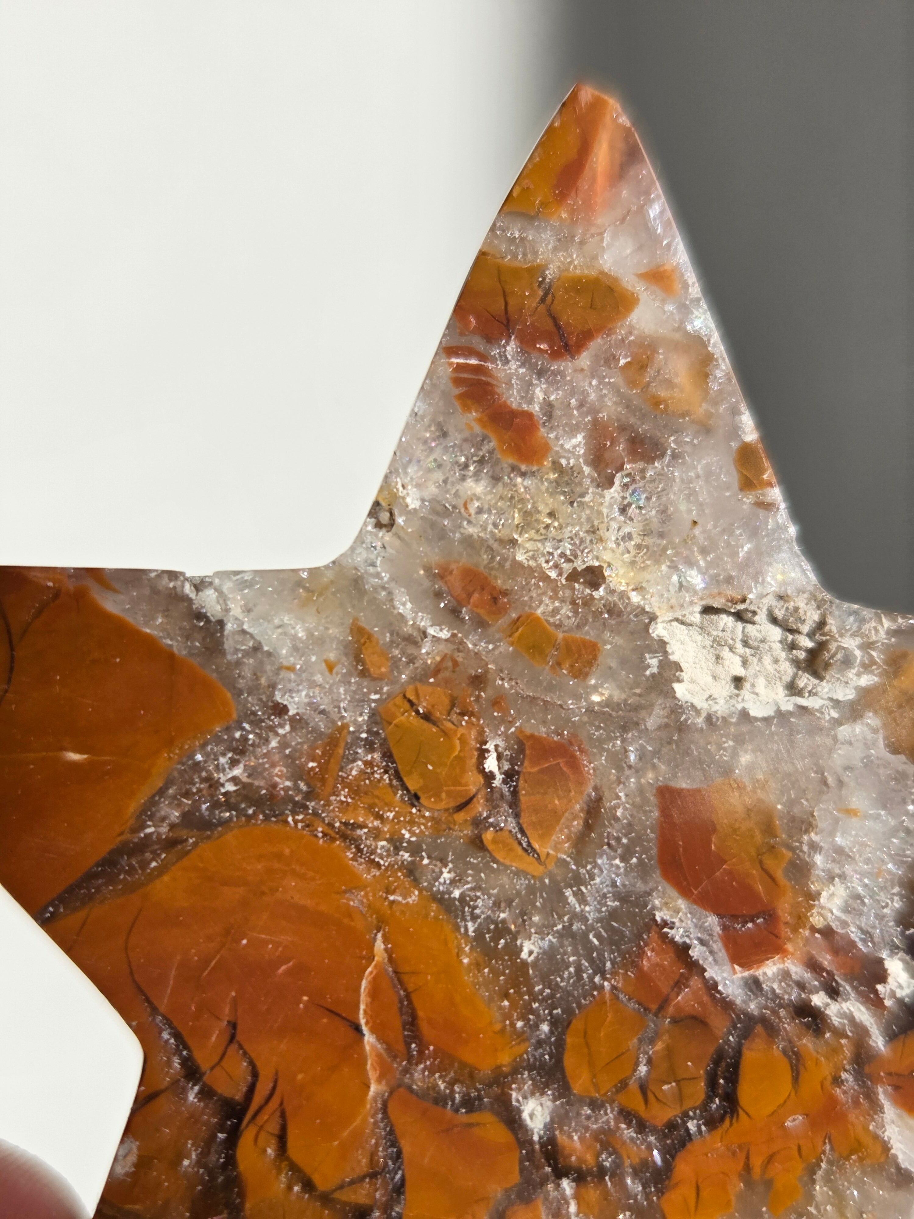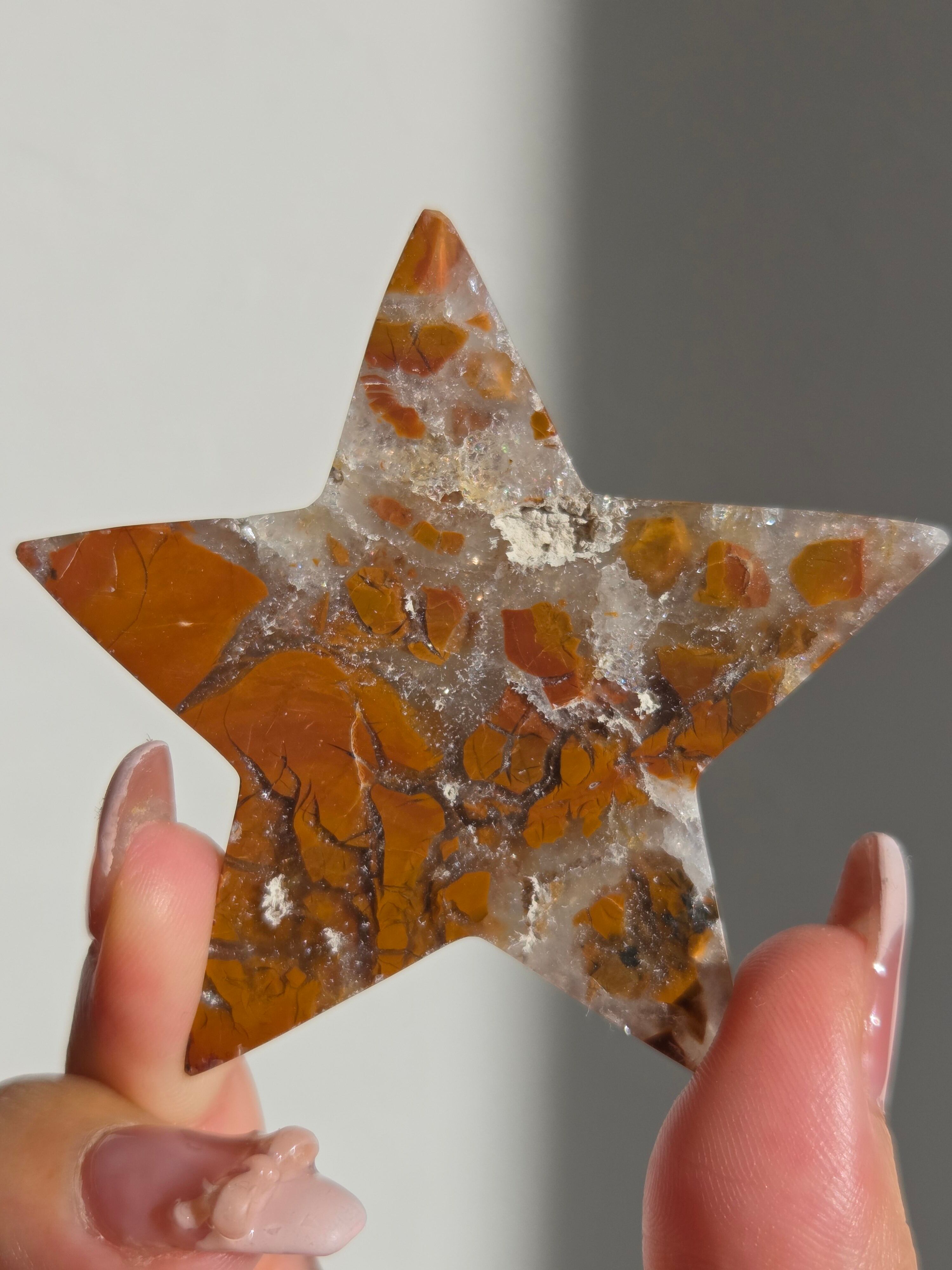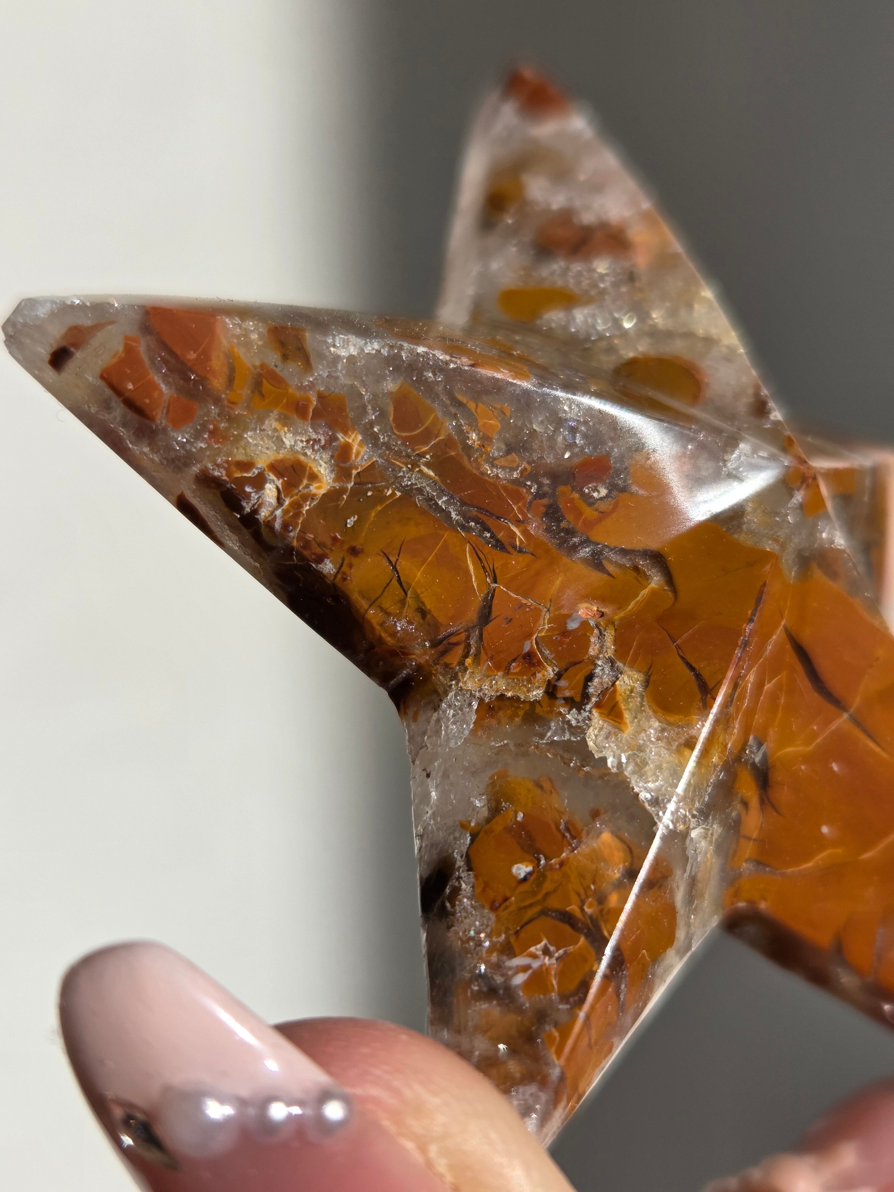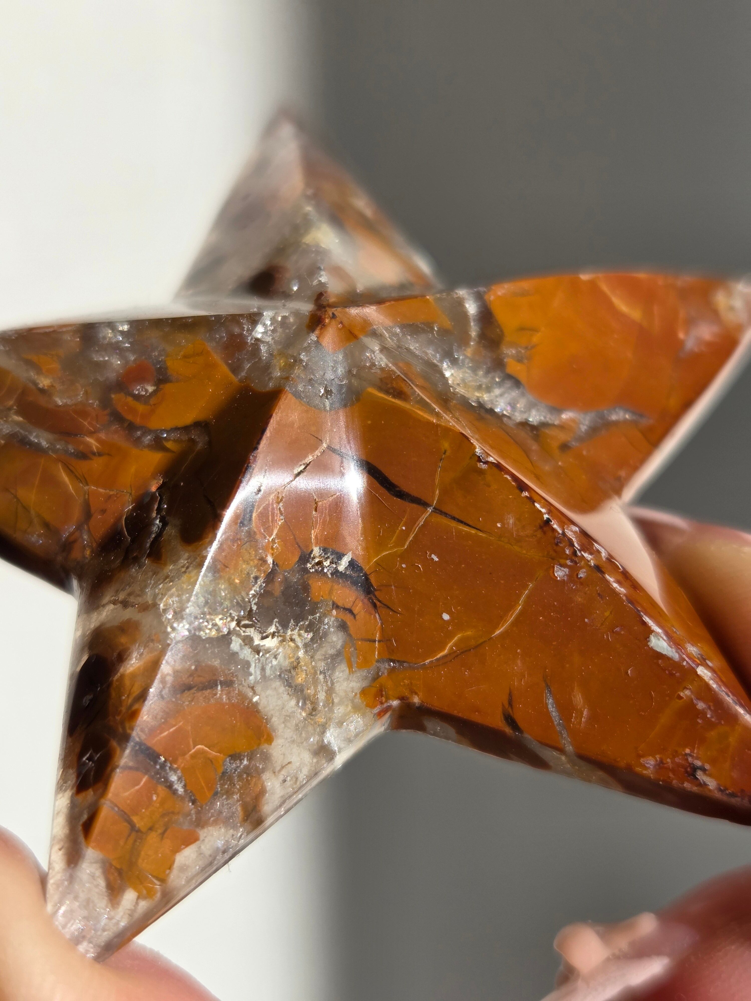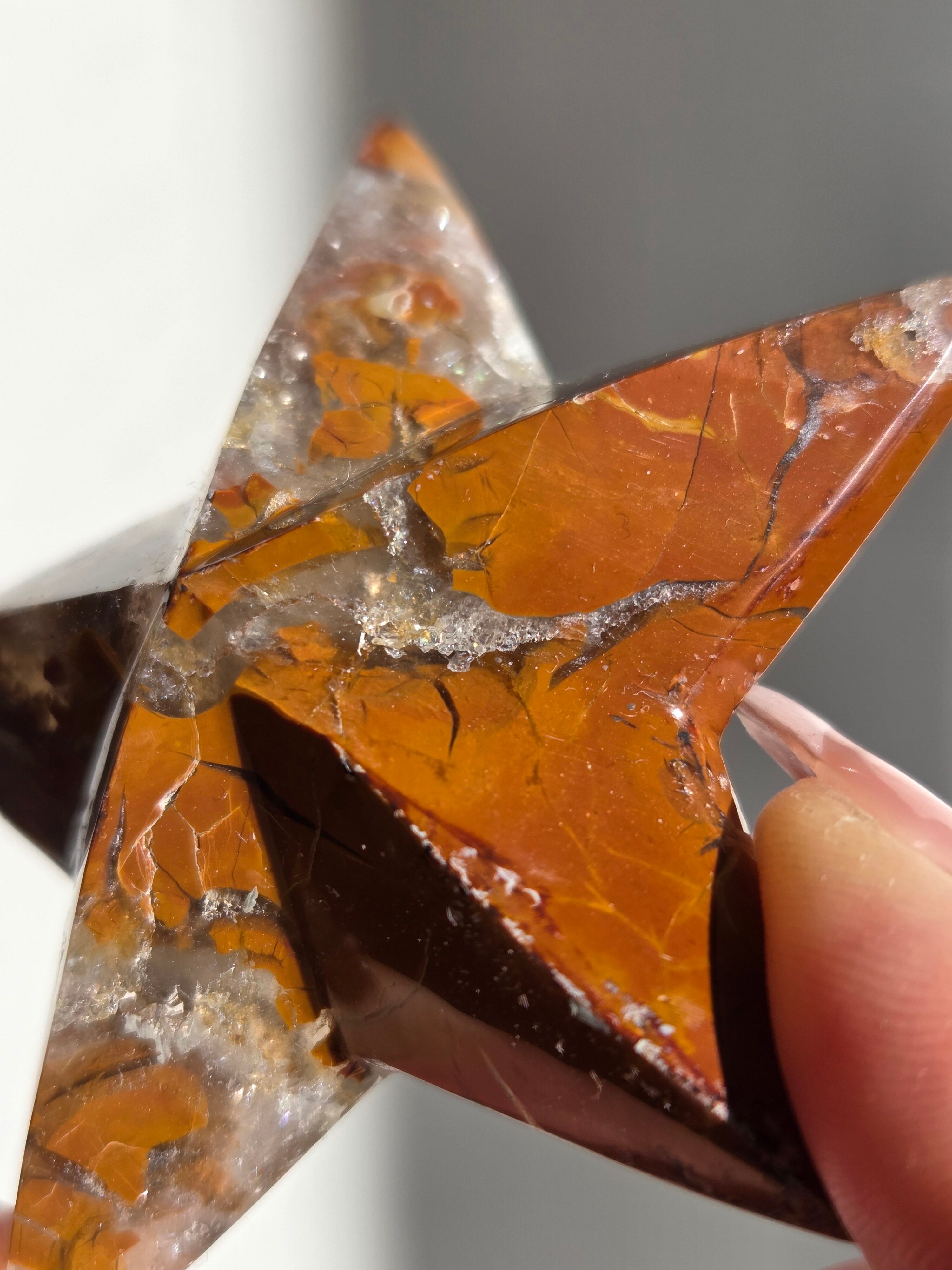 オレンジカラーをメインに、合間からクォーツの煌めきが見えるスターカービングです。