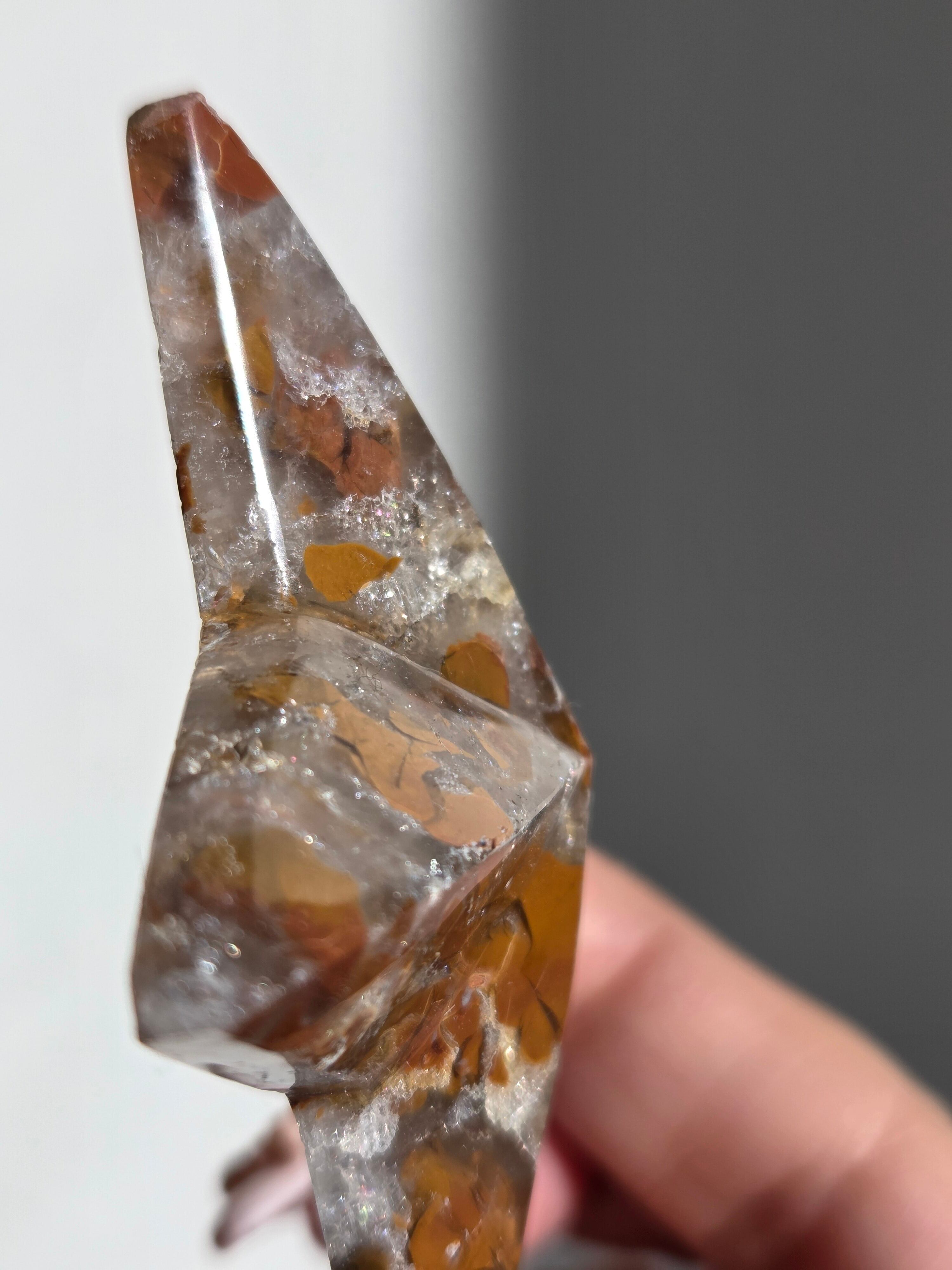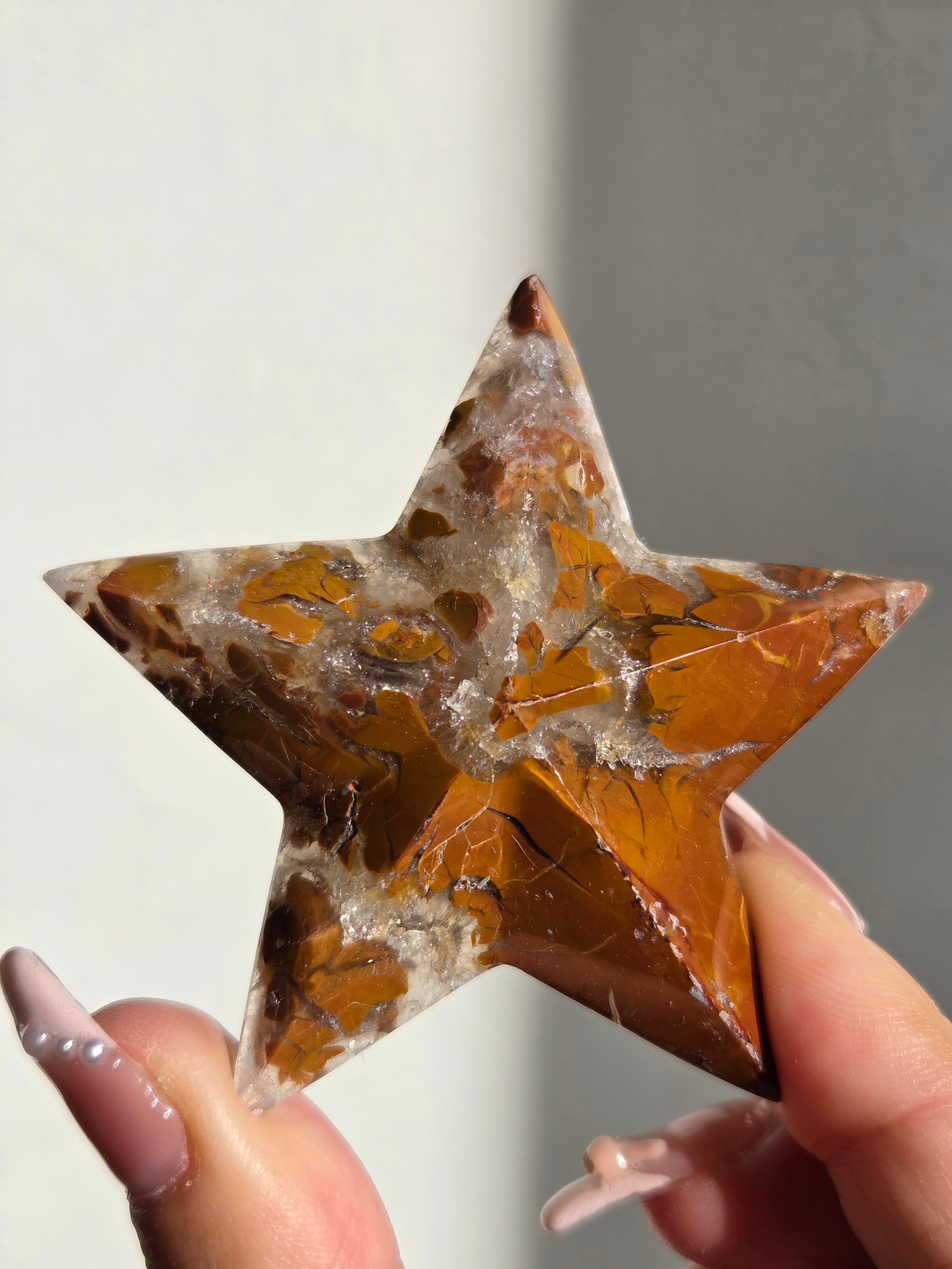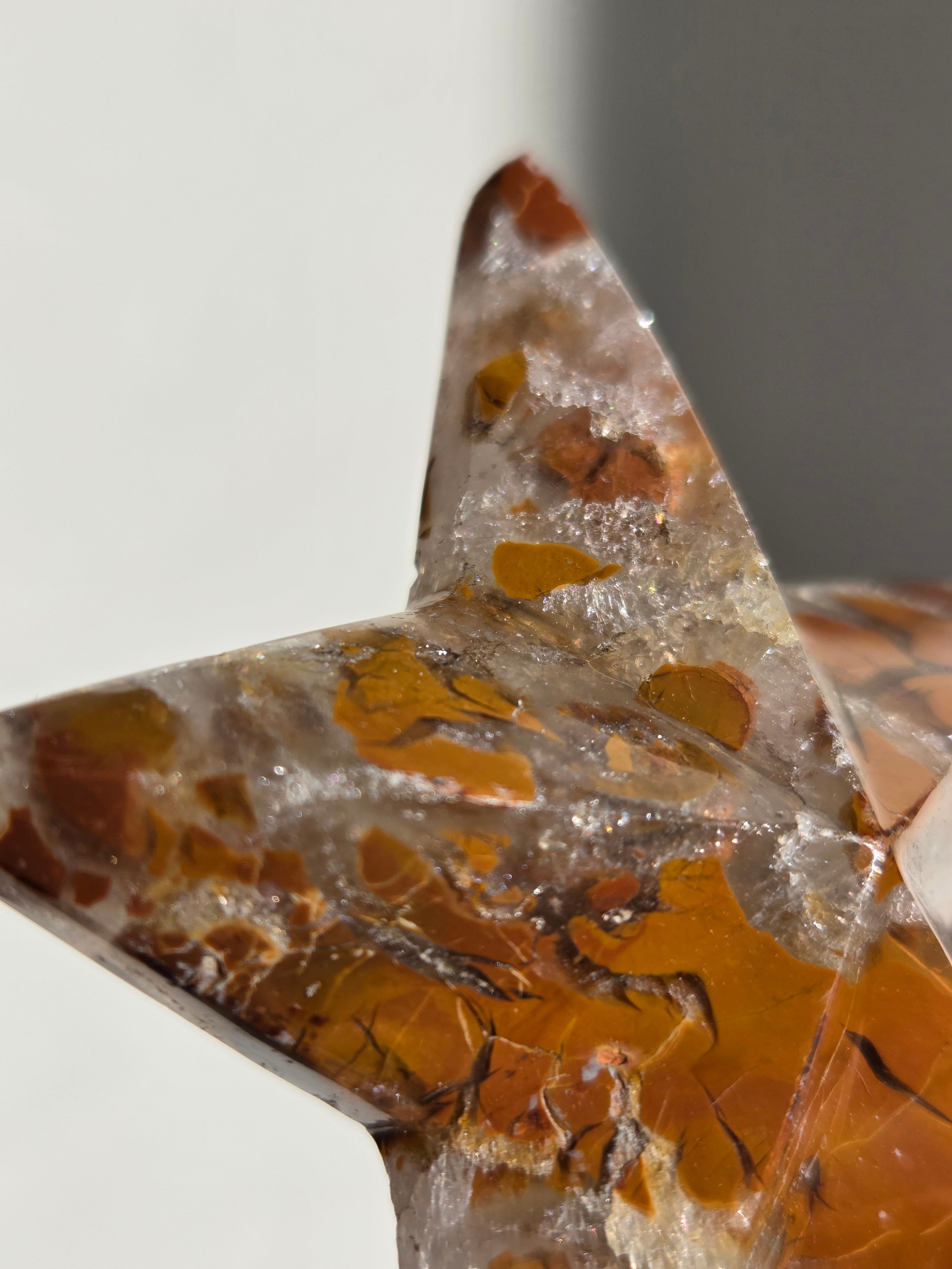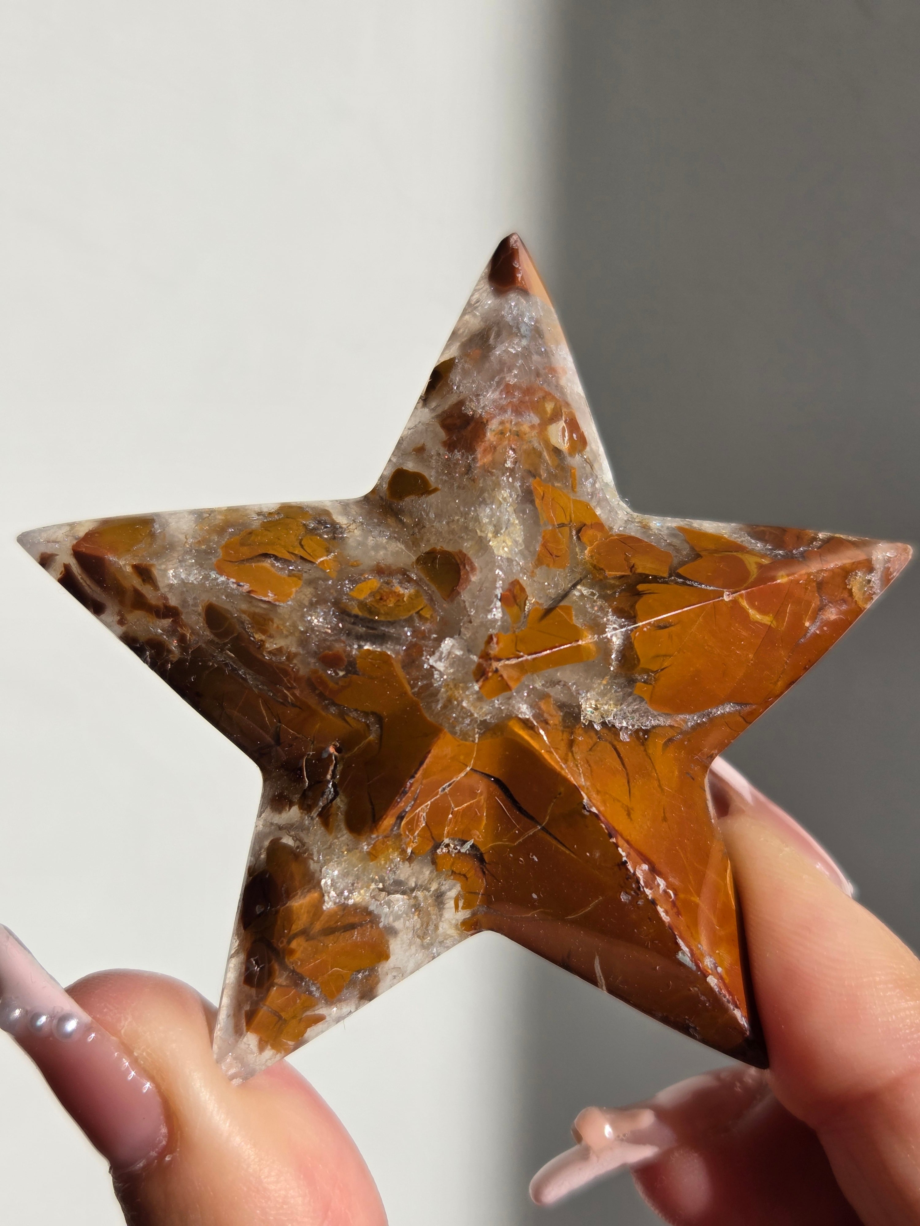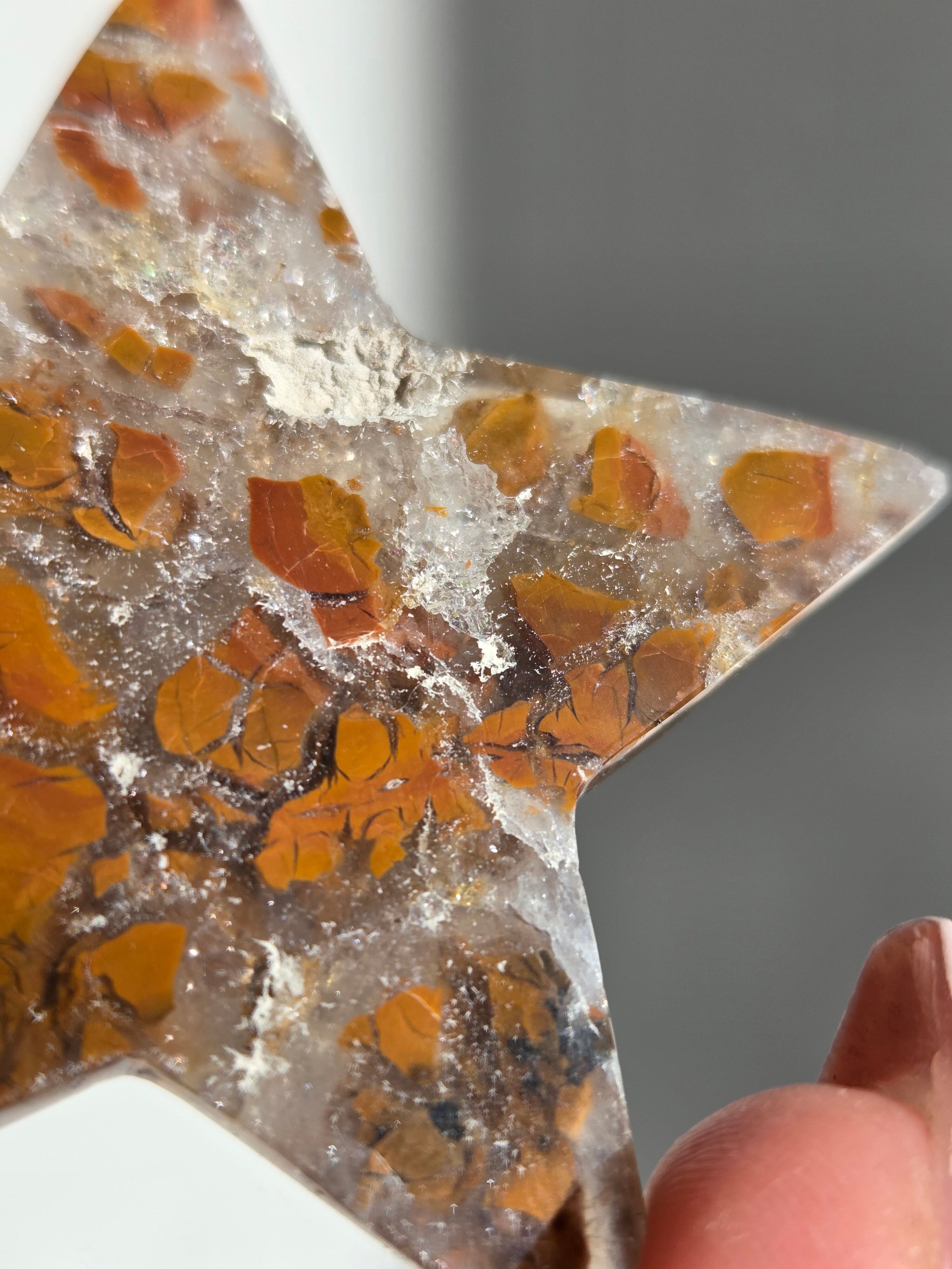 オレンジカラーをメインに、合間からクォーツの煌めきが見えるスターカービングです。