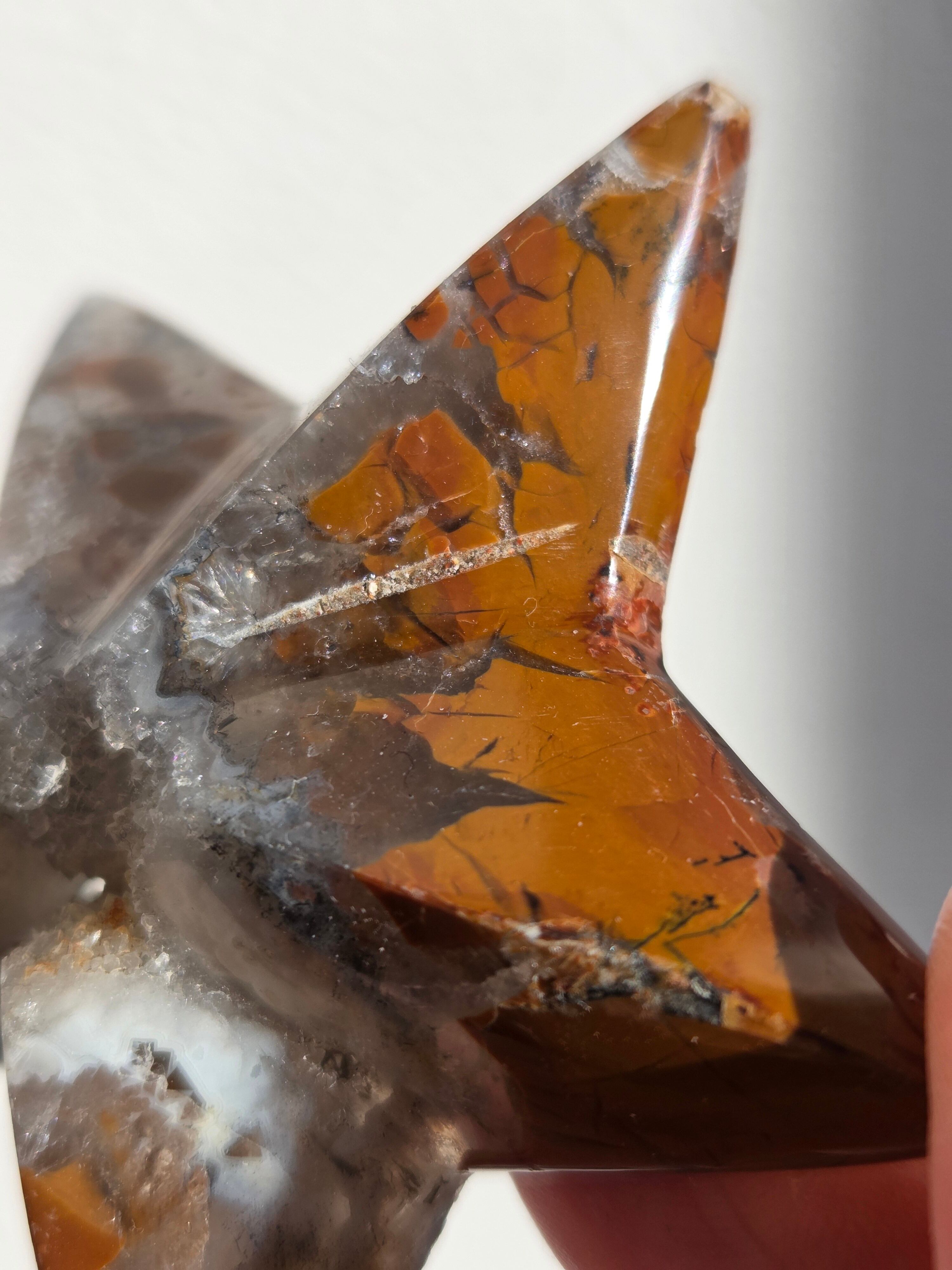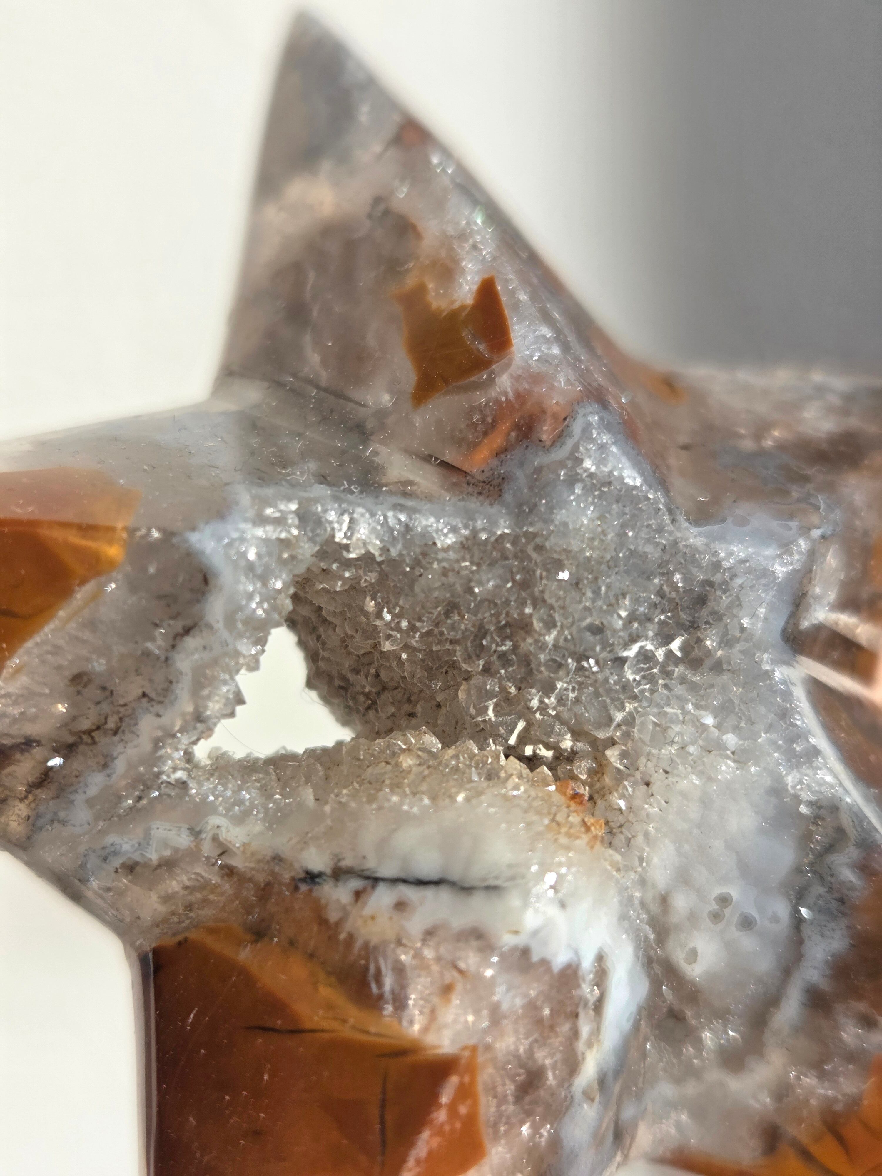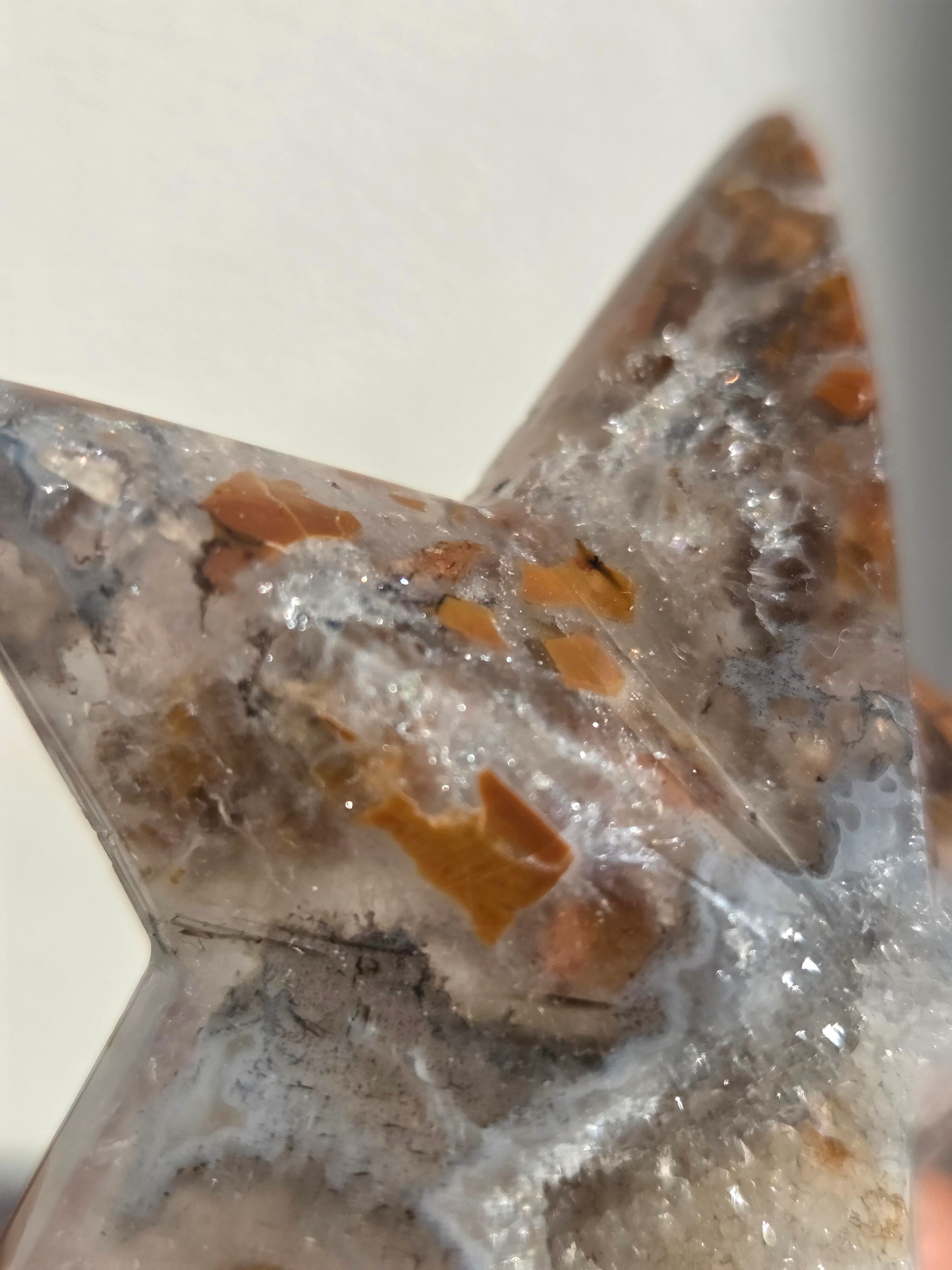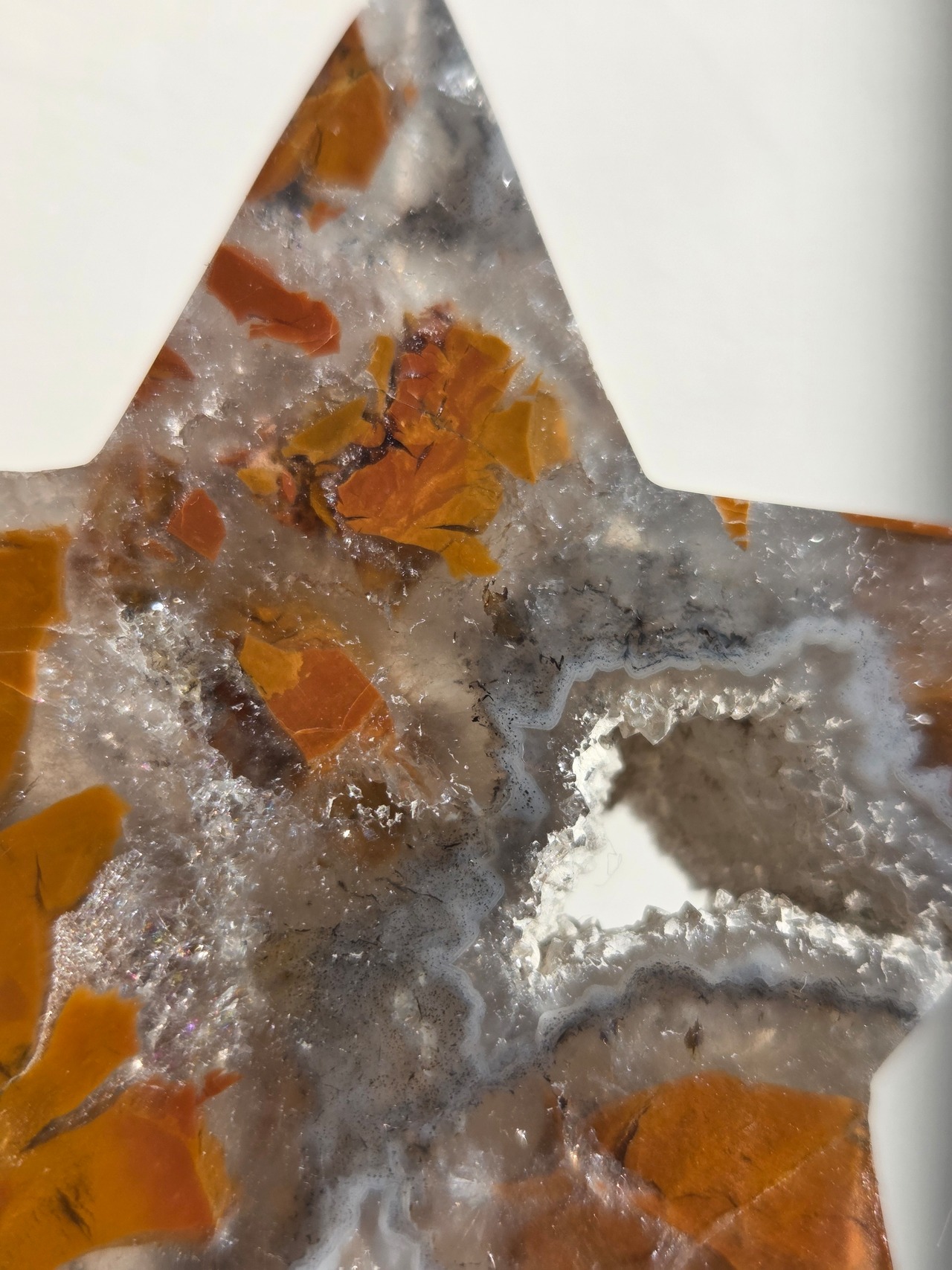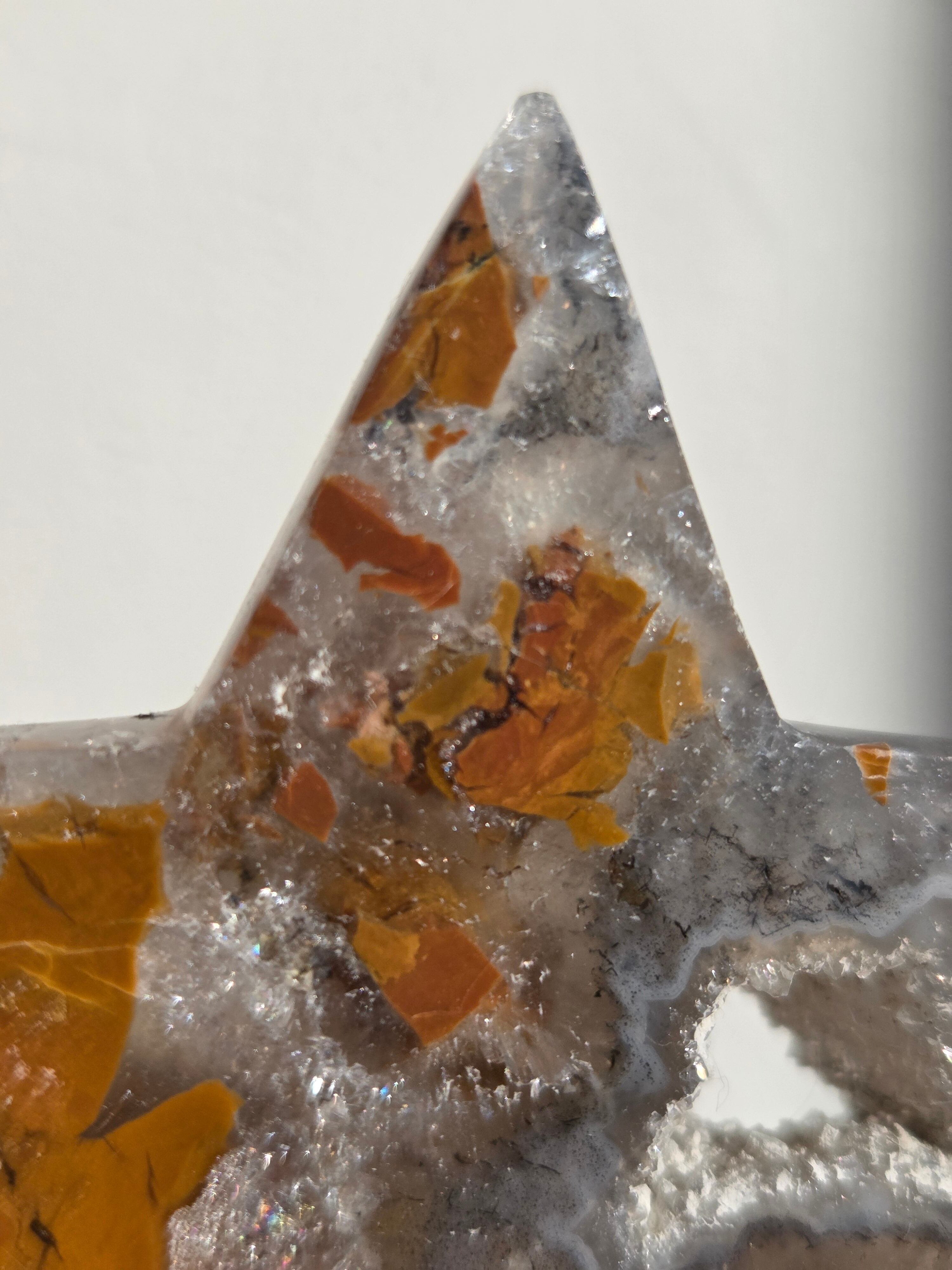 オレンジカラーをメインに、合間からクォーツの煌めきが見えるスターカービングです。