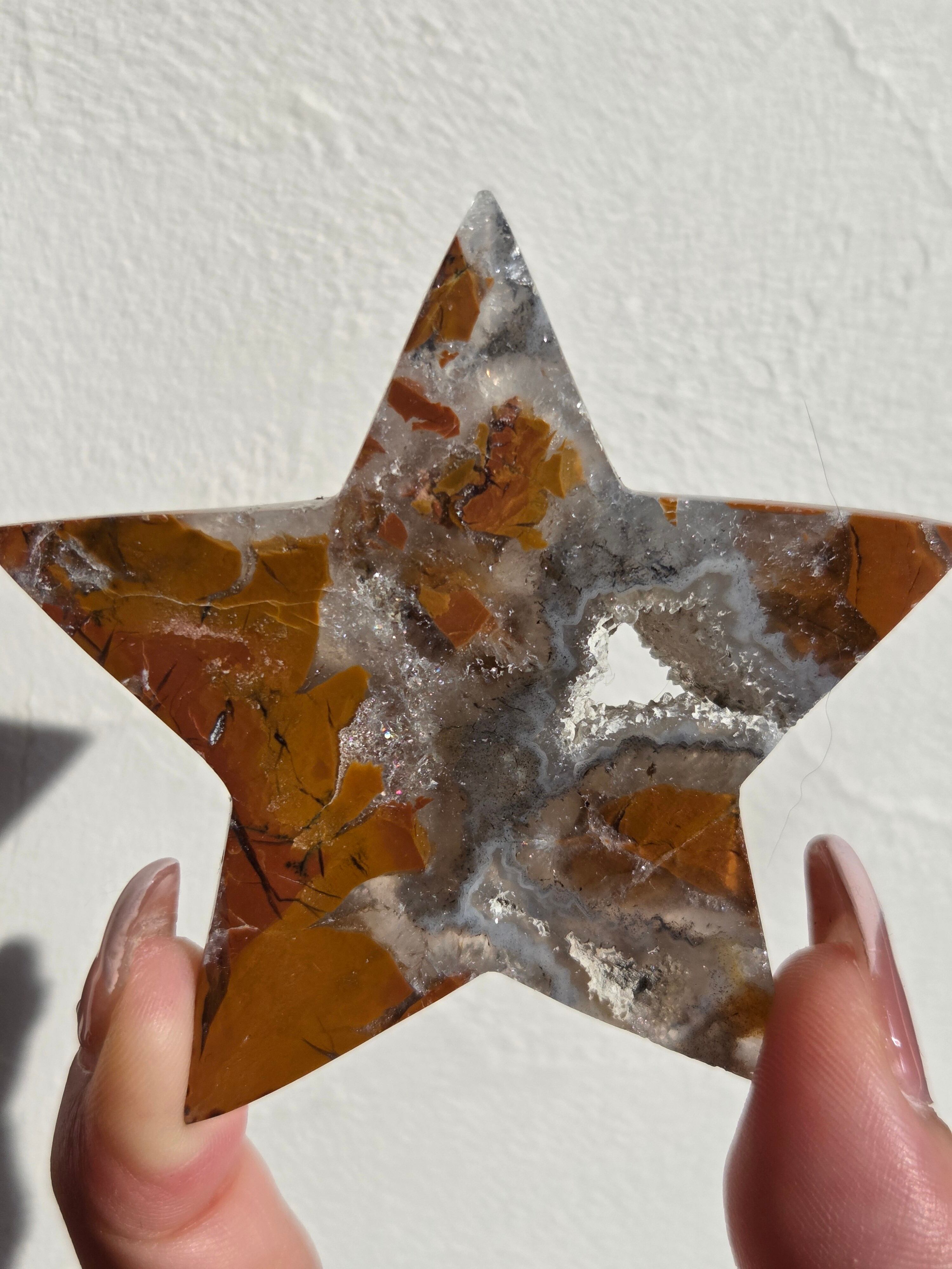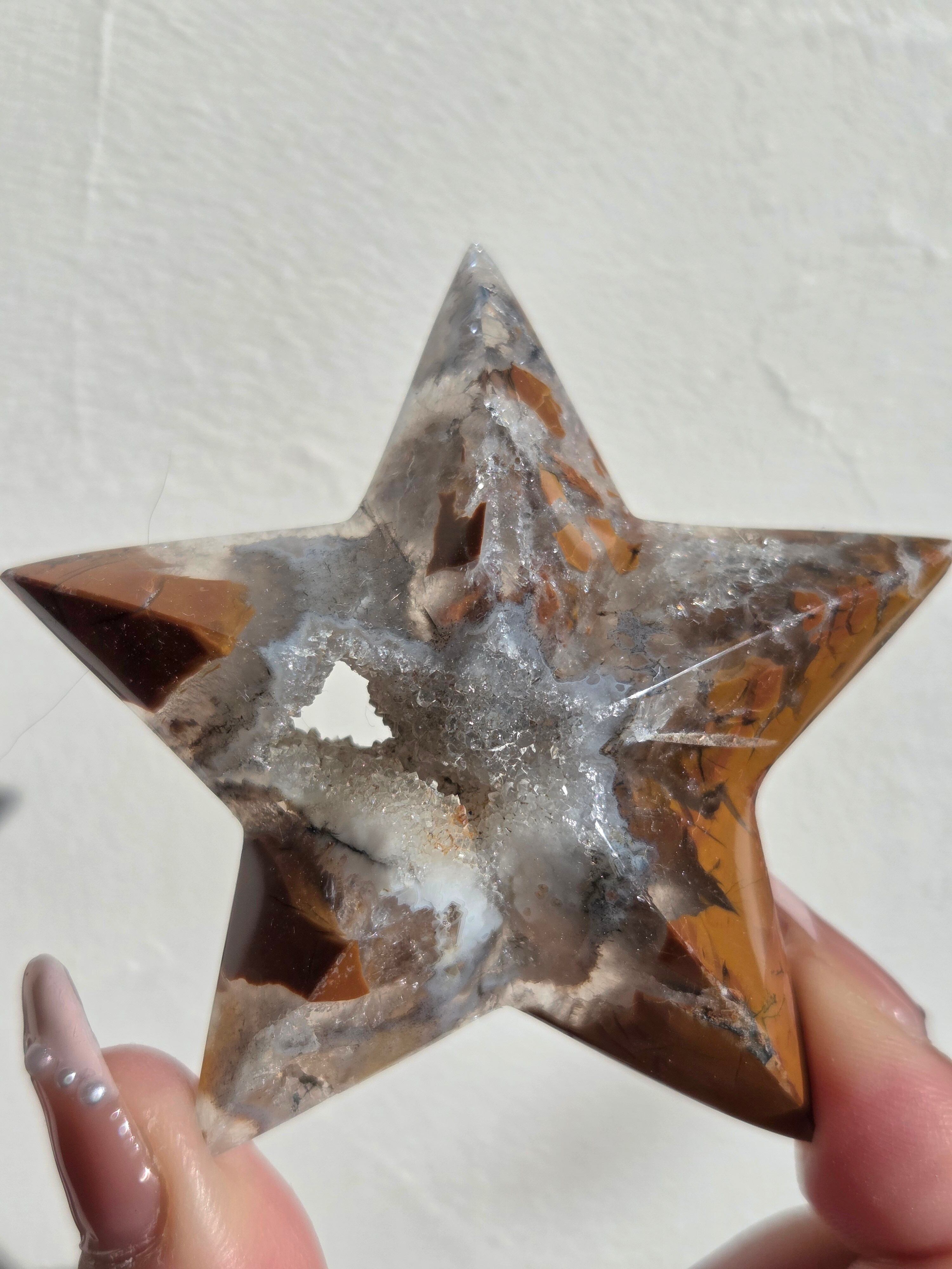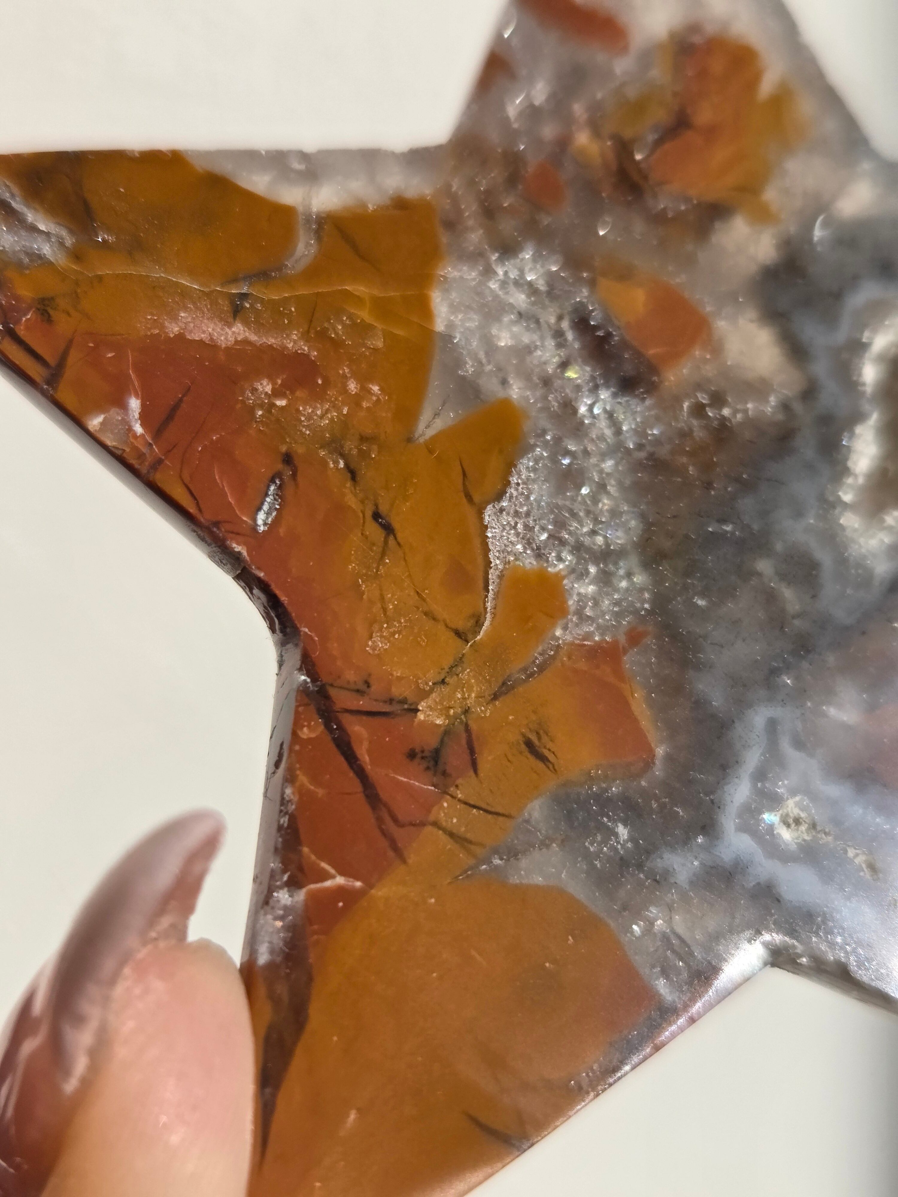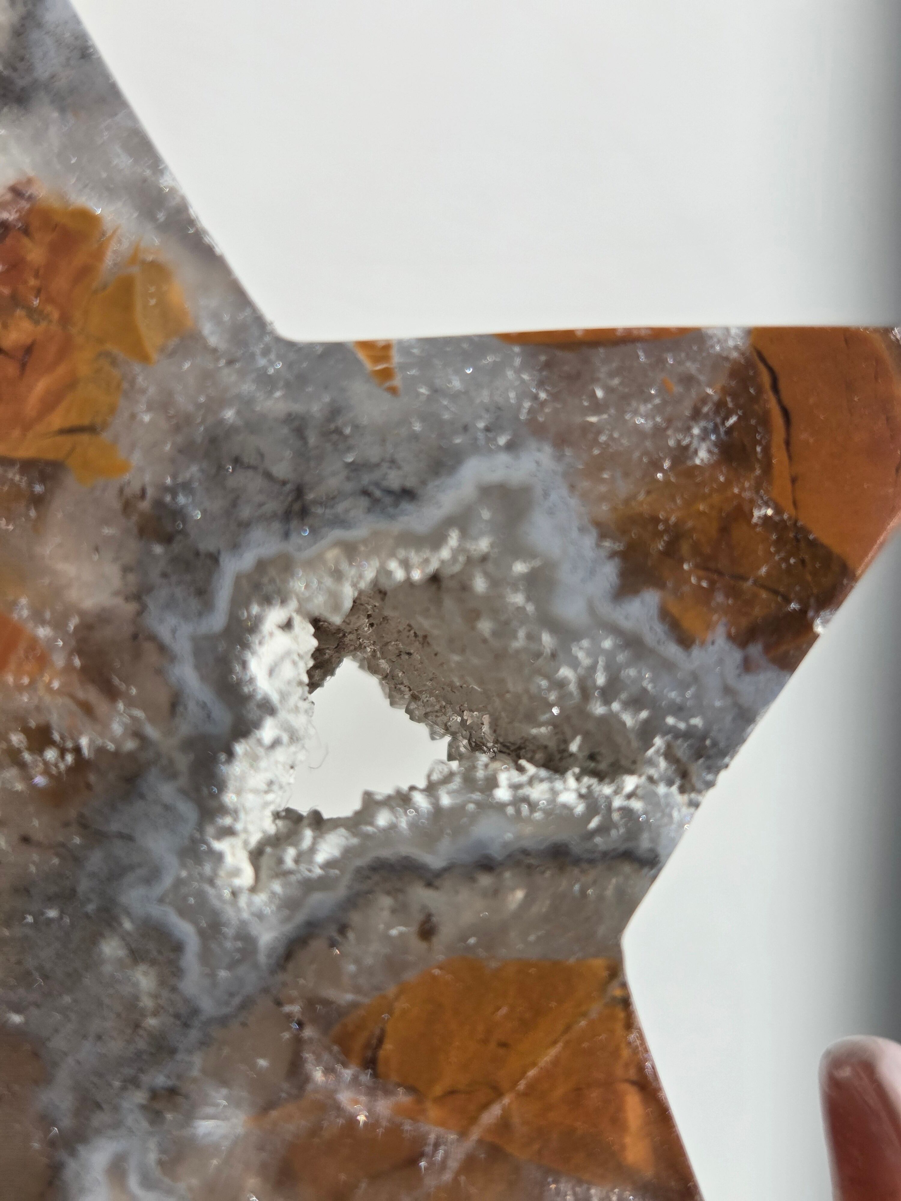 オレンジカラーをメインに、合間からクォーツの煌めきが見えるスターカービングです。