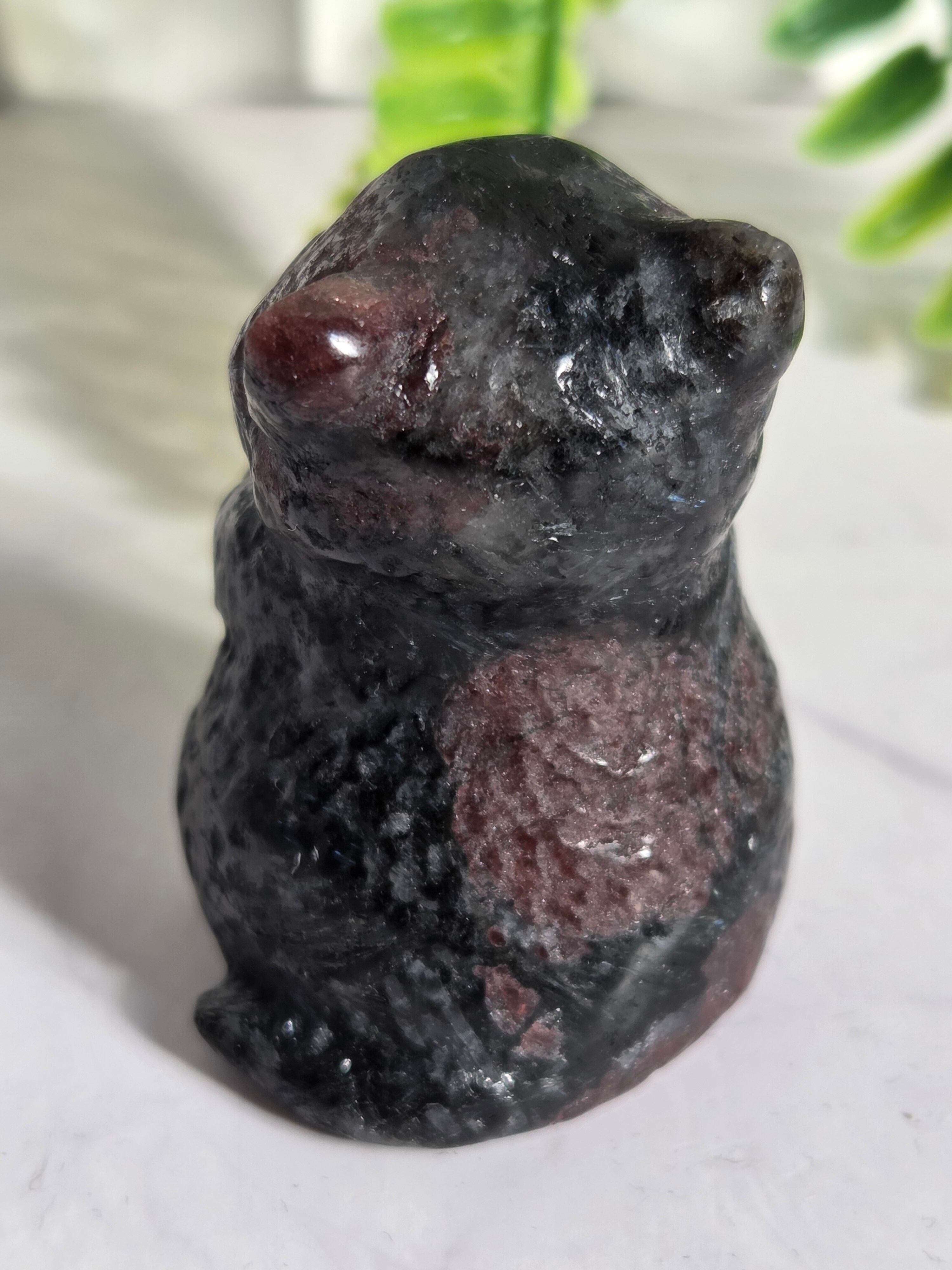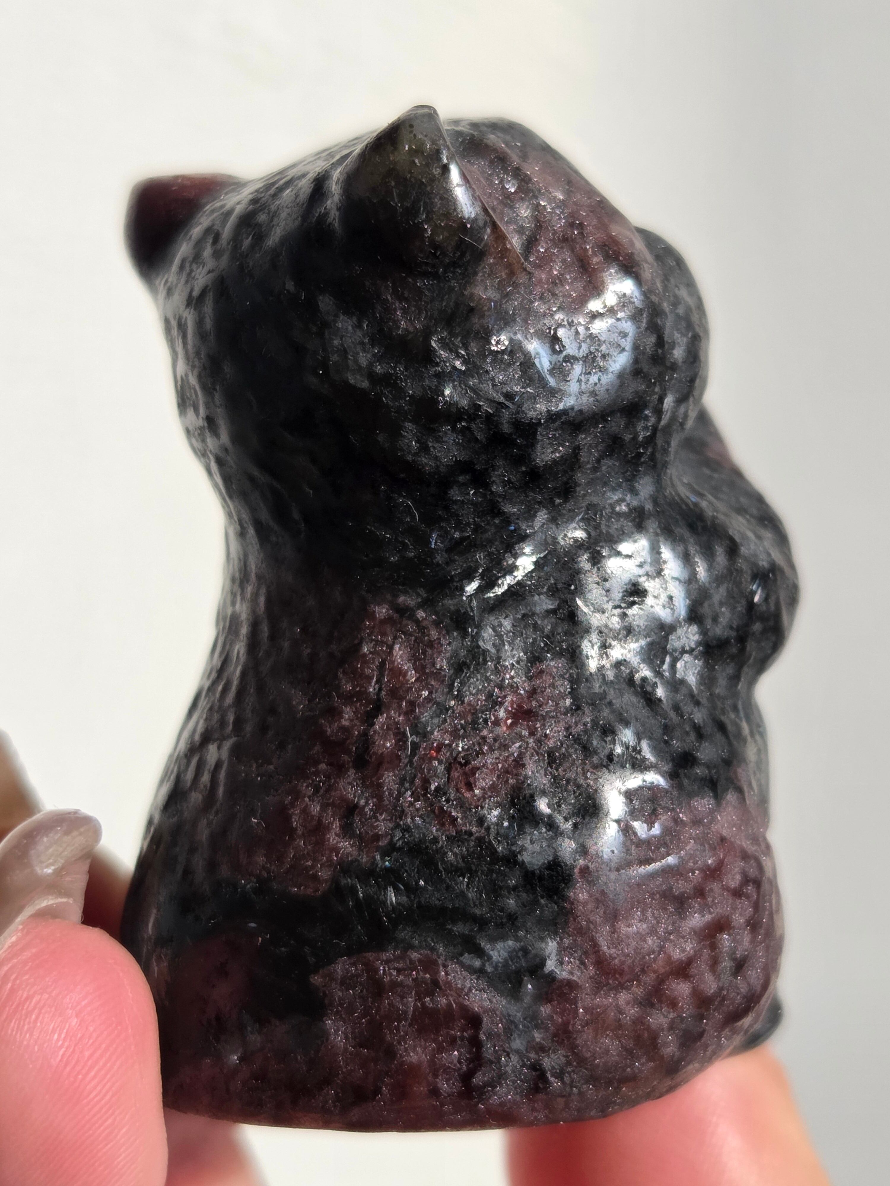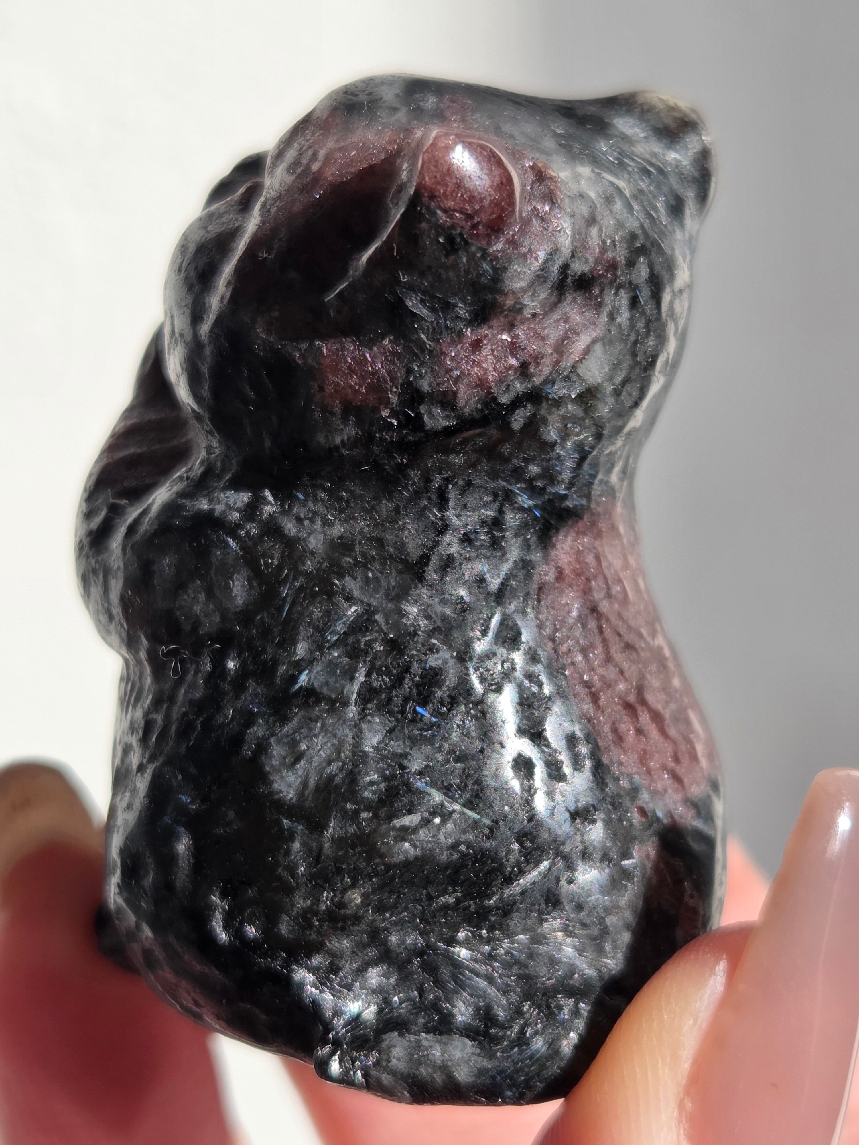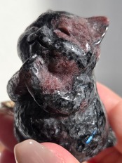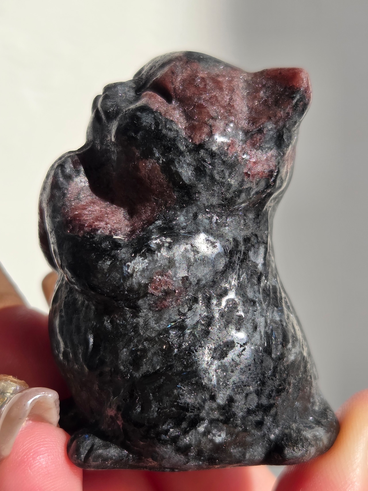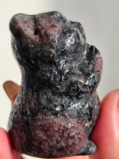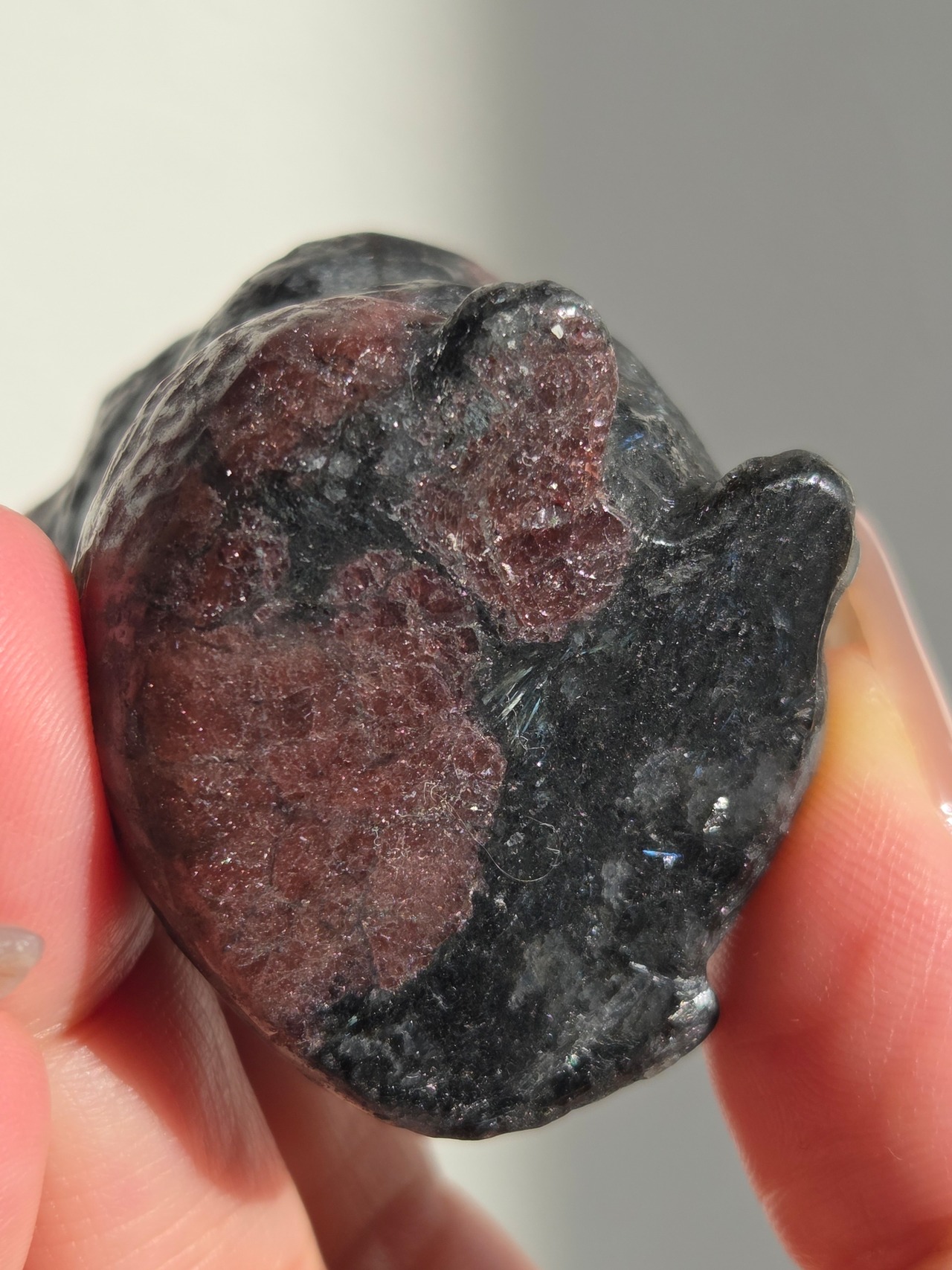 ガーネットの赤と、所々見える青い煌めきはヌーマイトです。