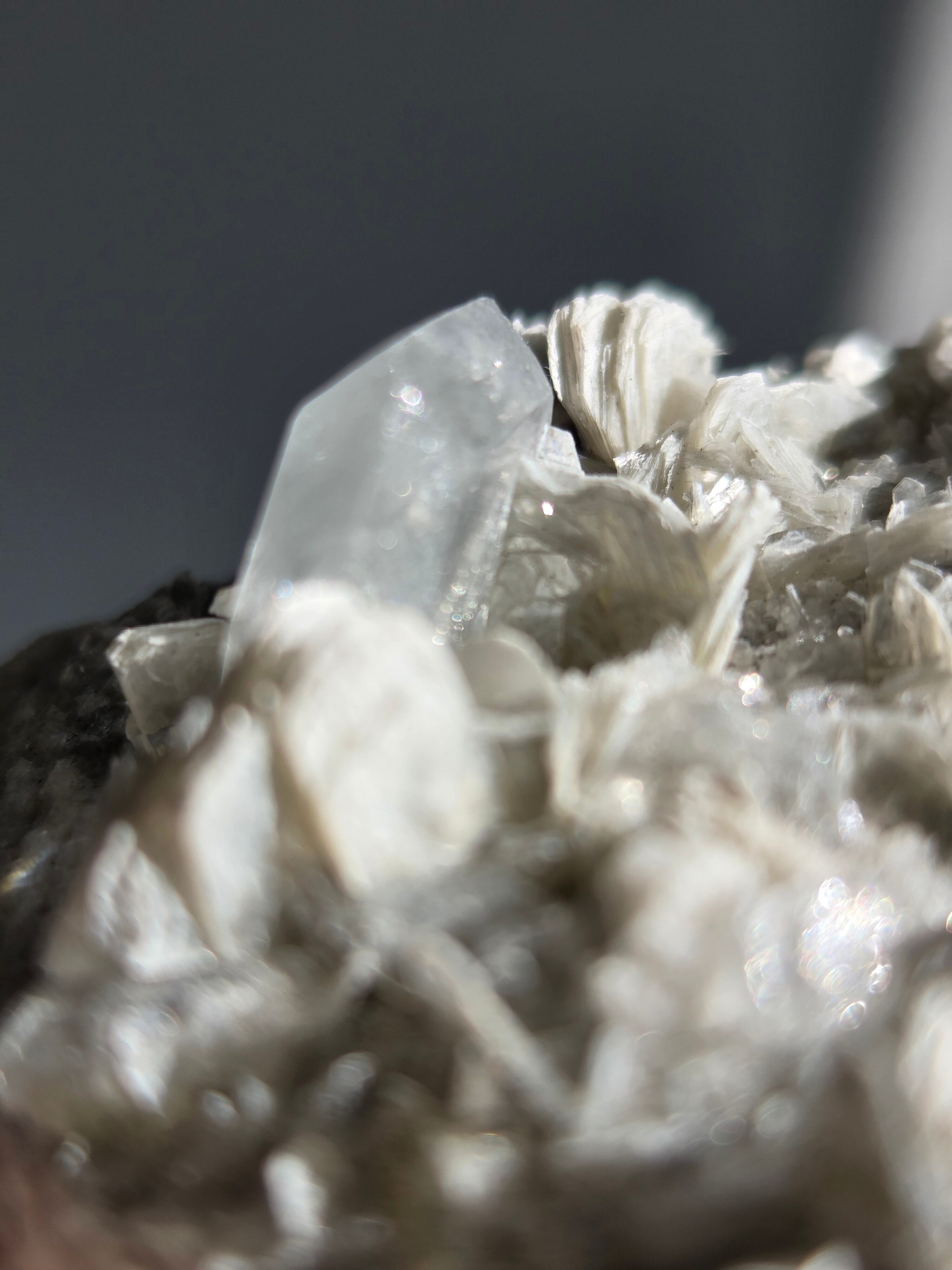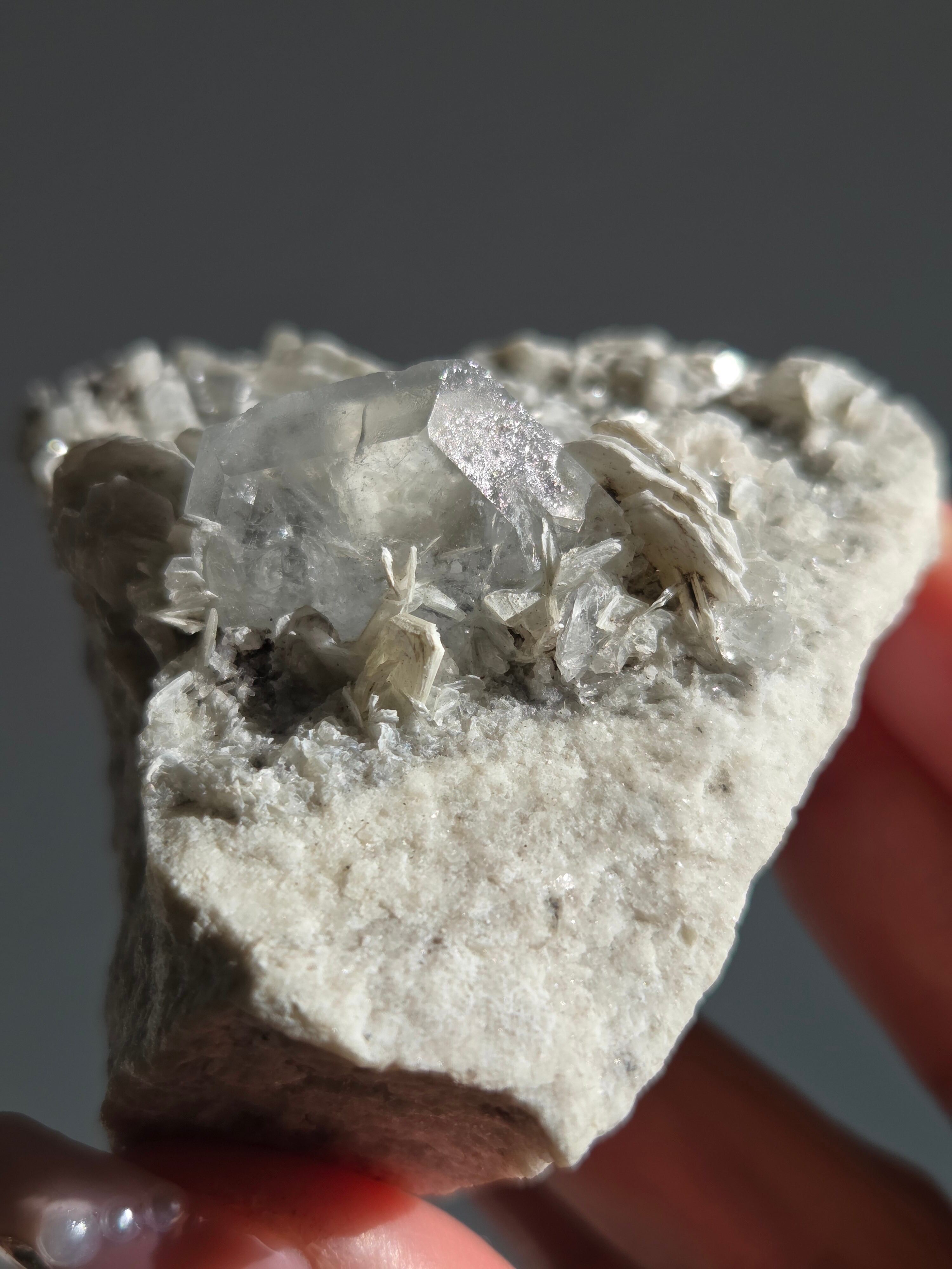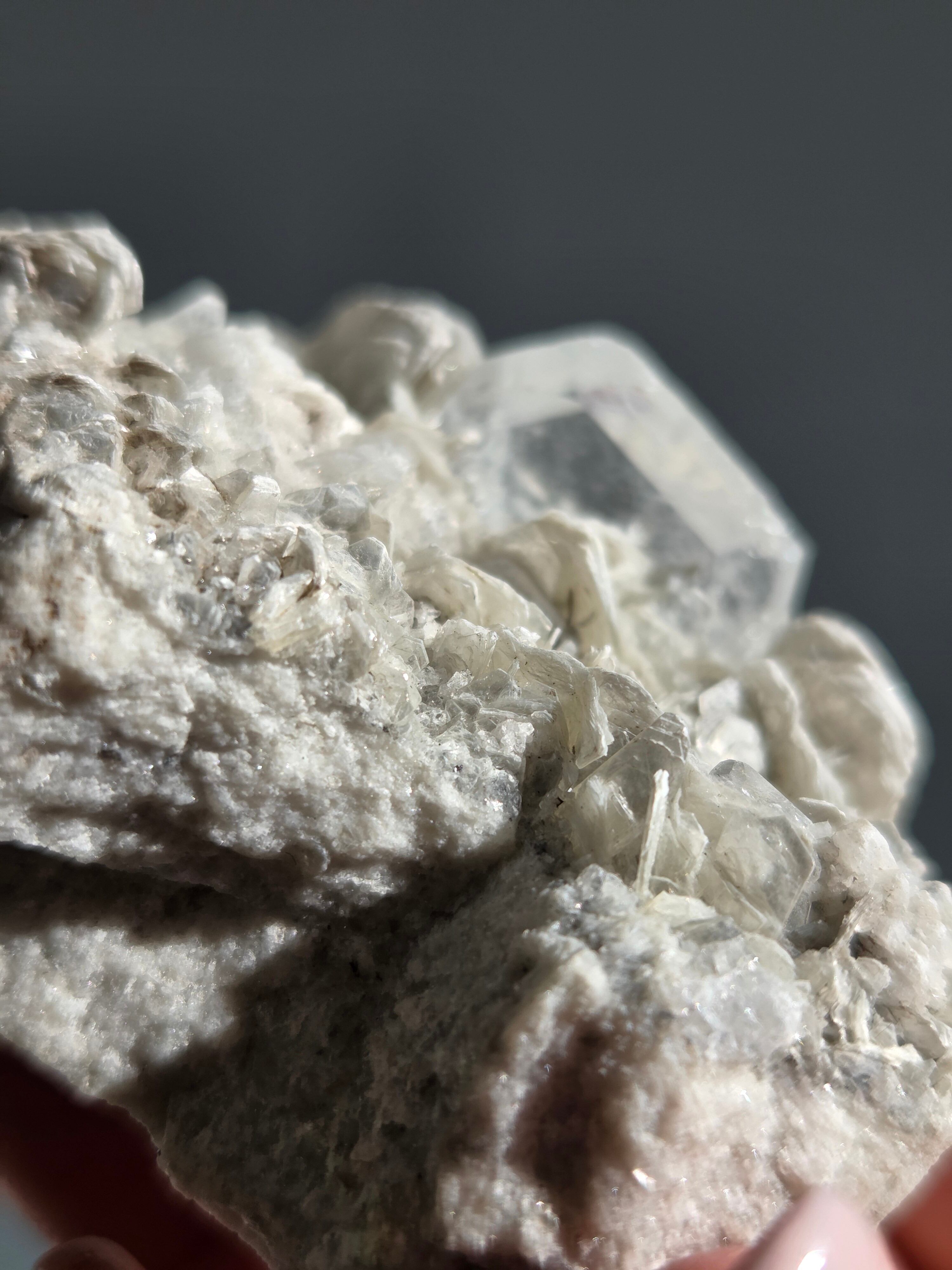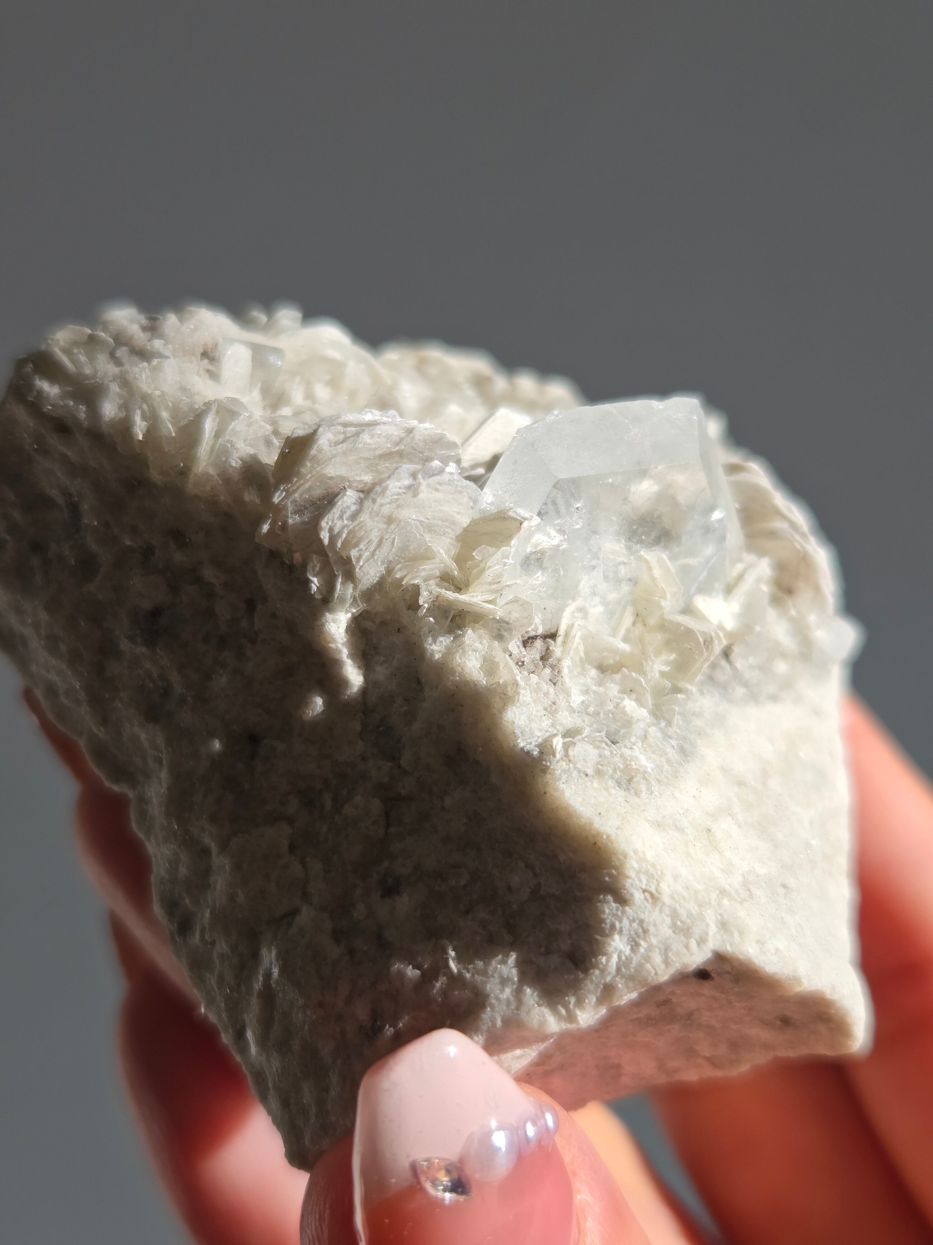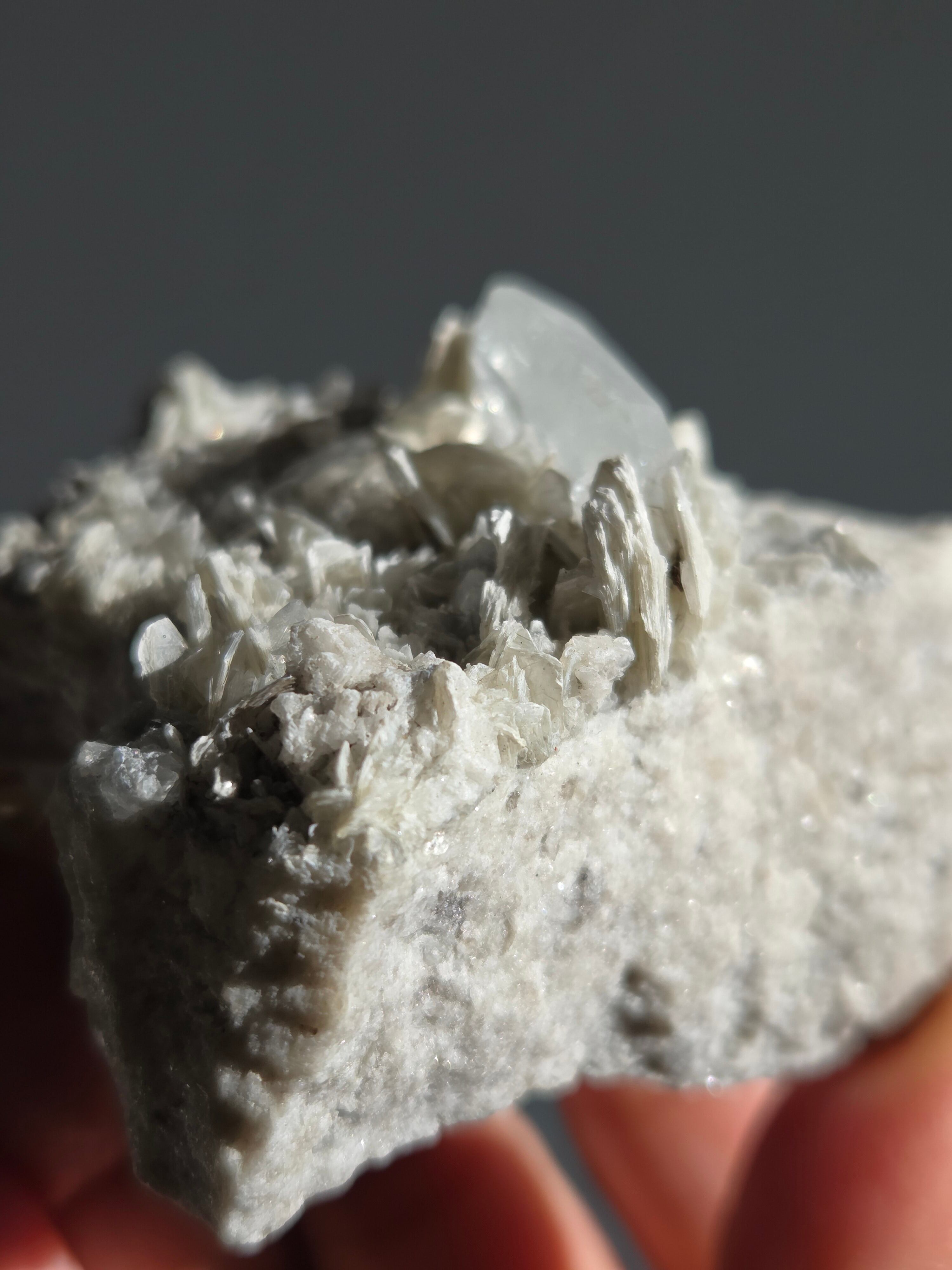 沢山のマイカ(雲母)に囲まれ佇むアクアマリン。淡い透き通った水色が美しいです。