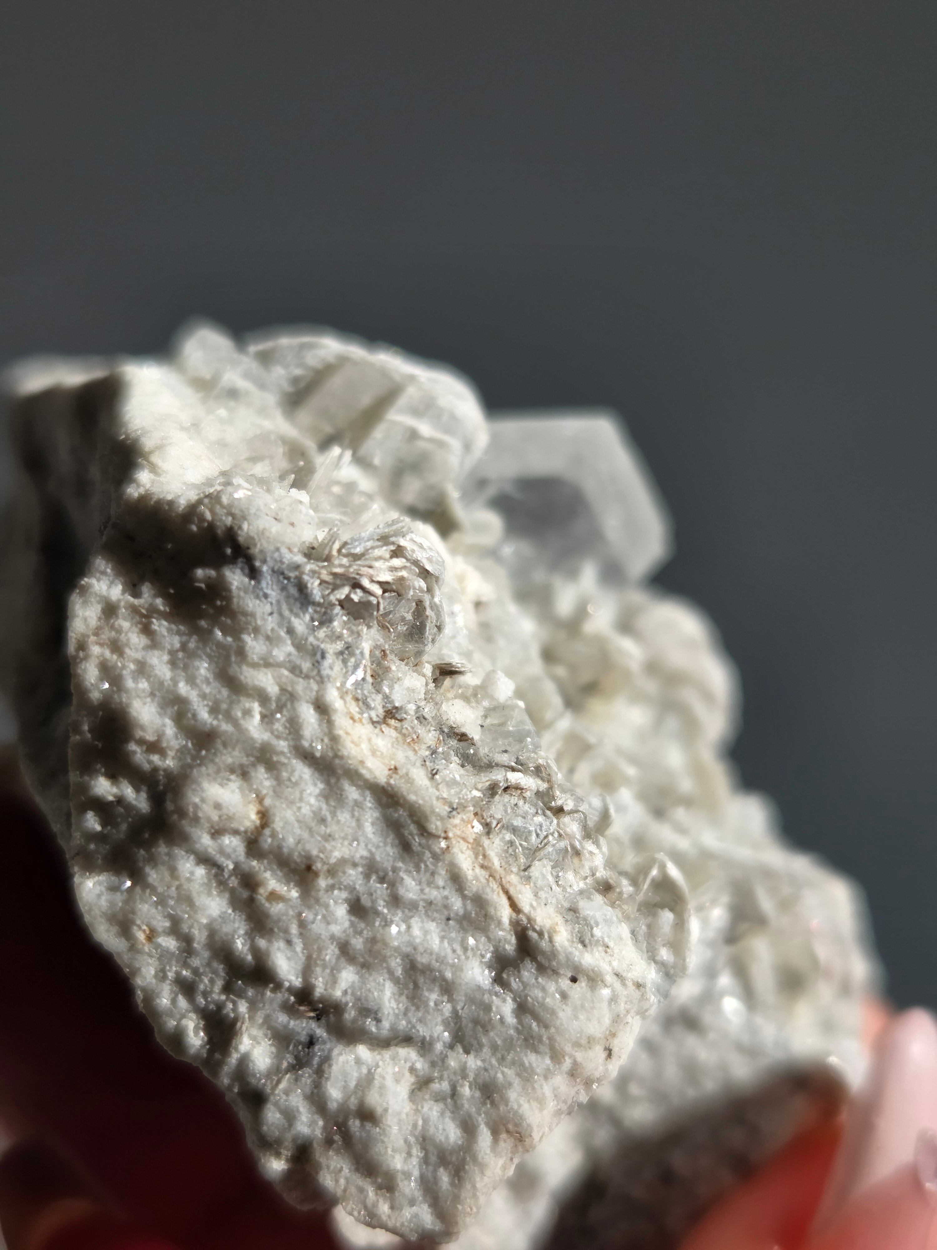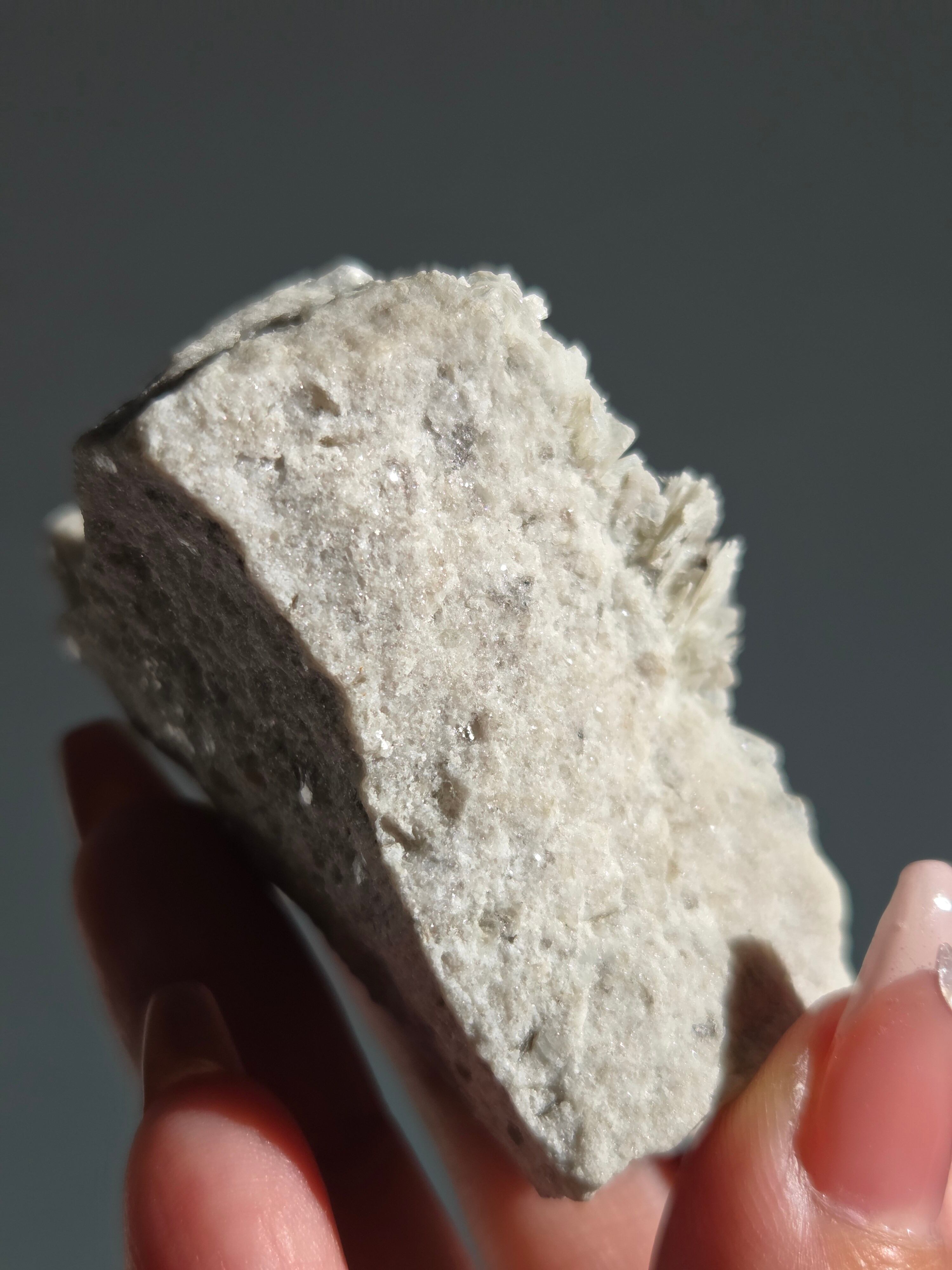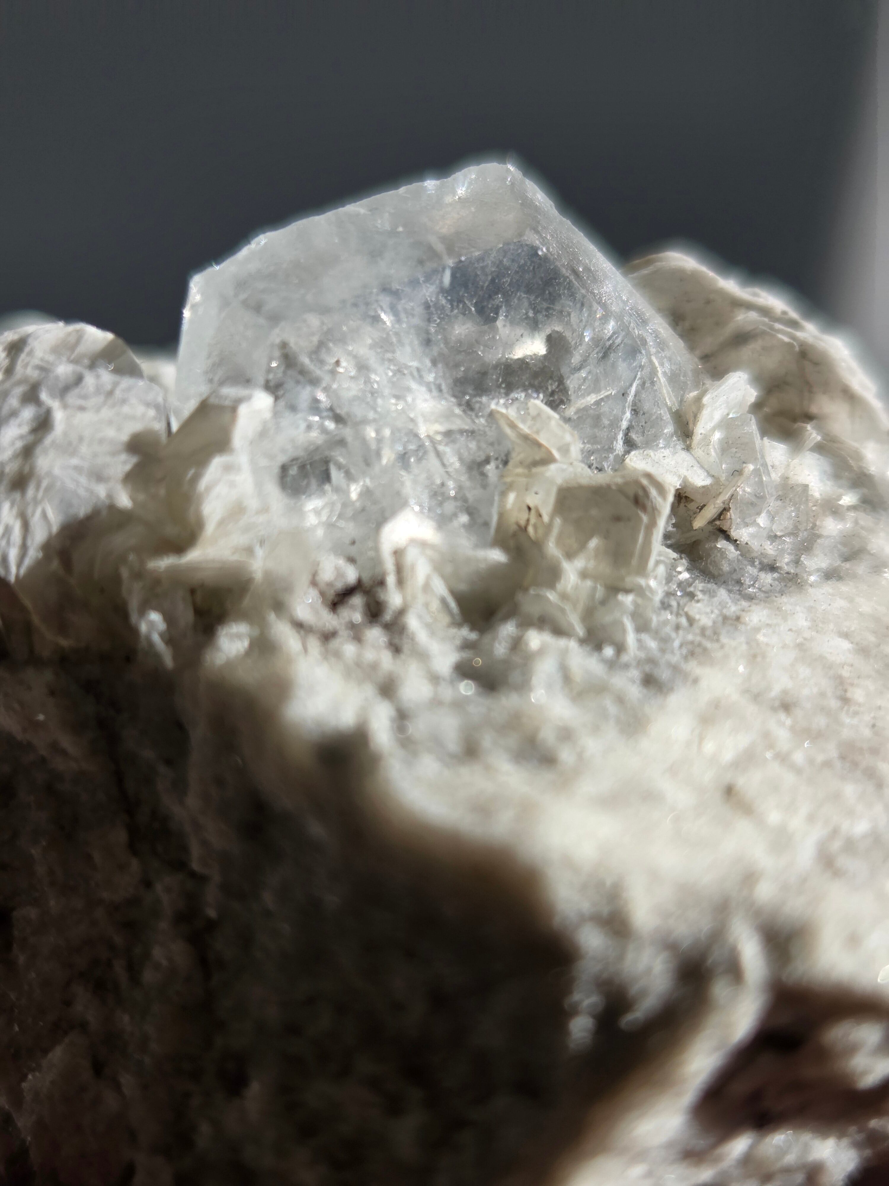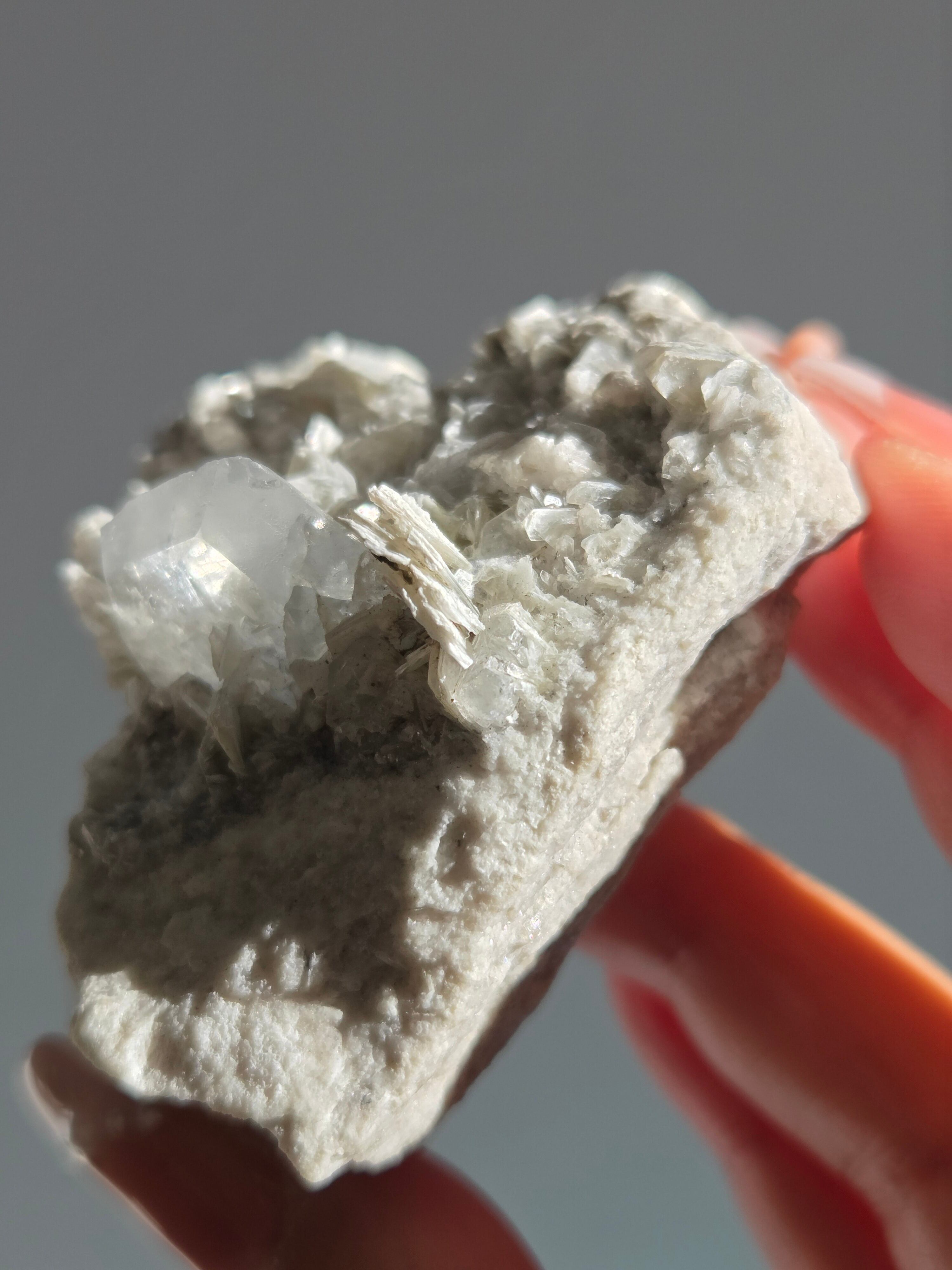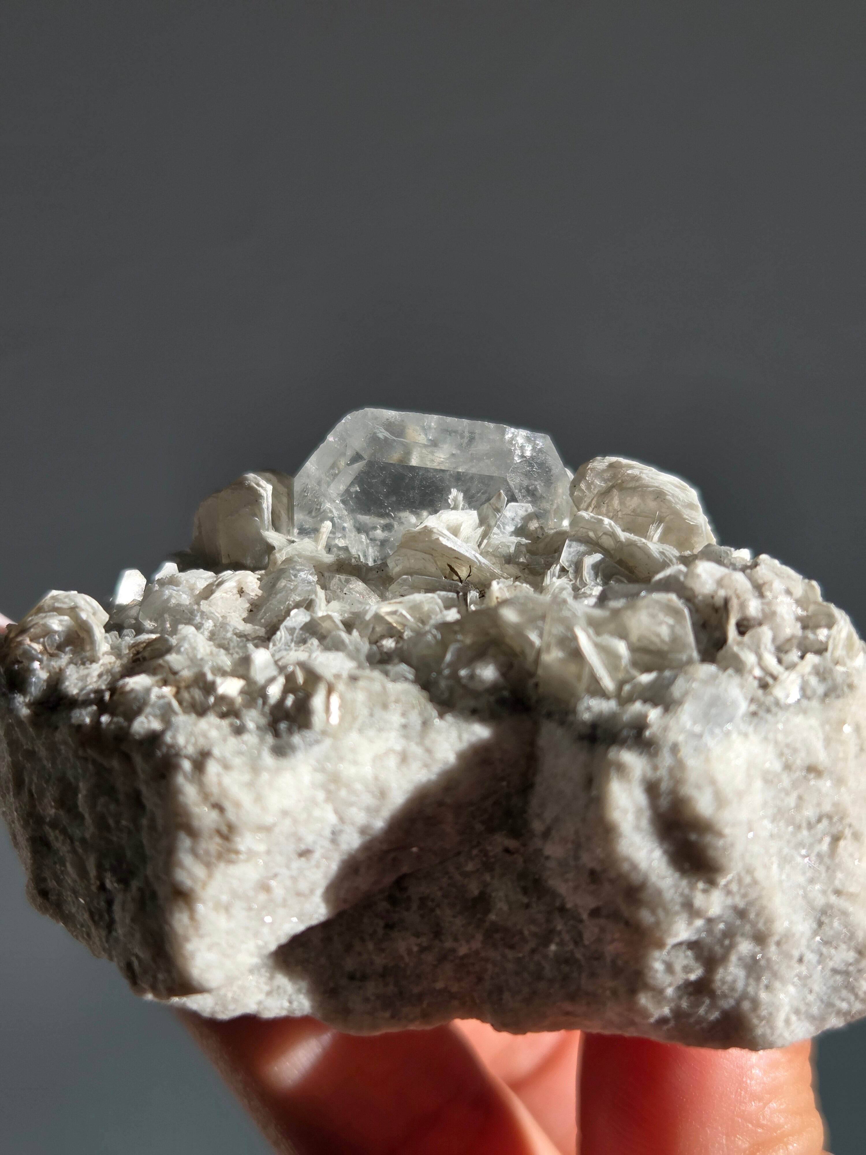 沢山のマイカ(雲母)に囲まれ佇むアクアマリン。淡い透き通った水色が美しいです。