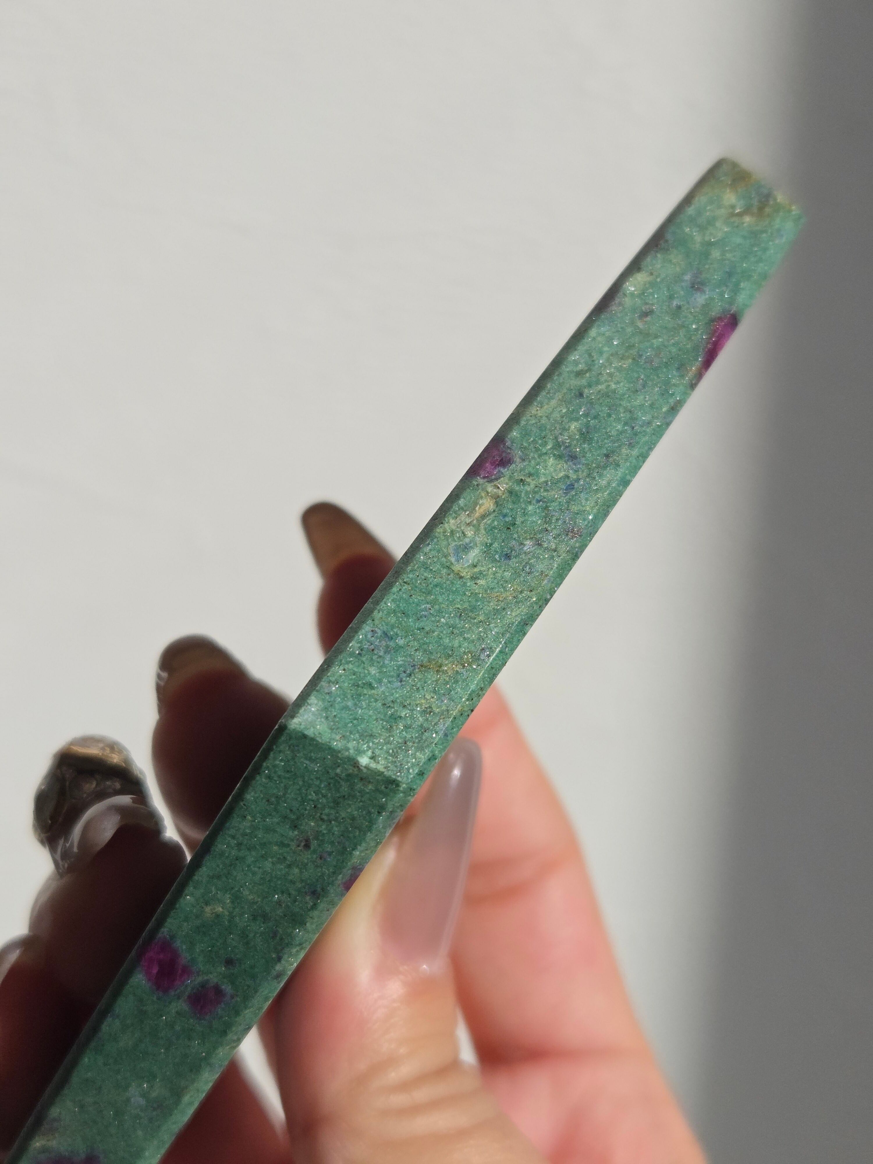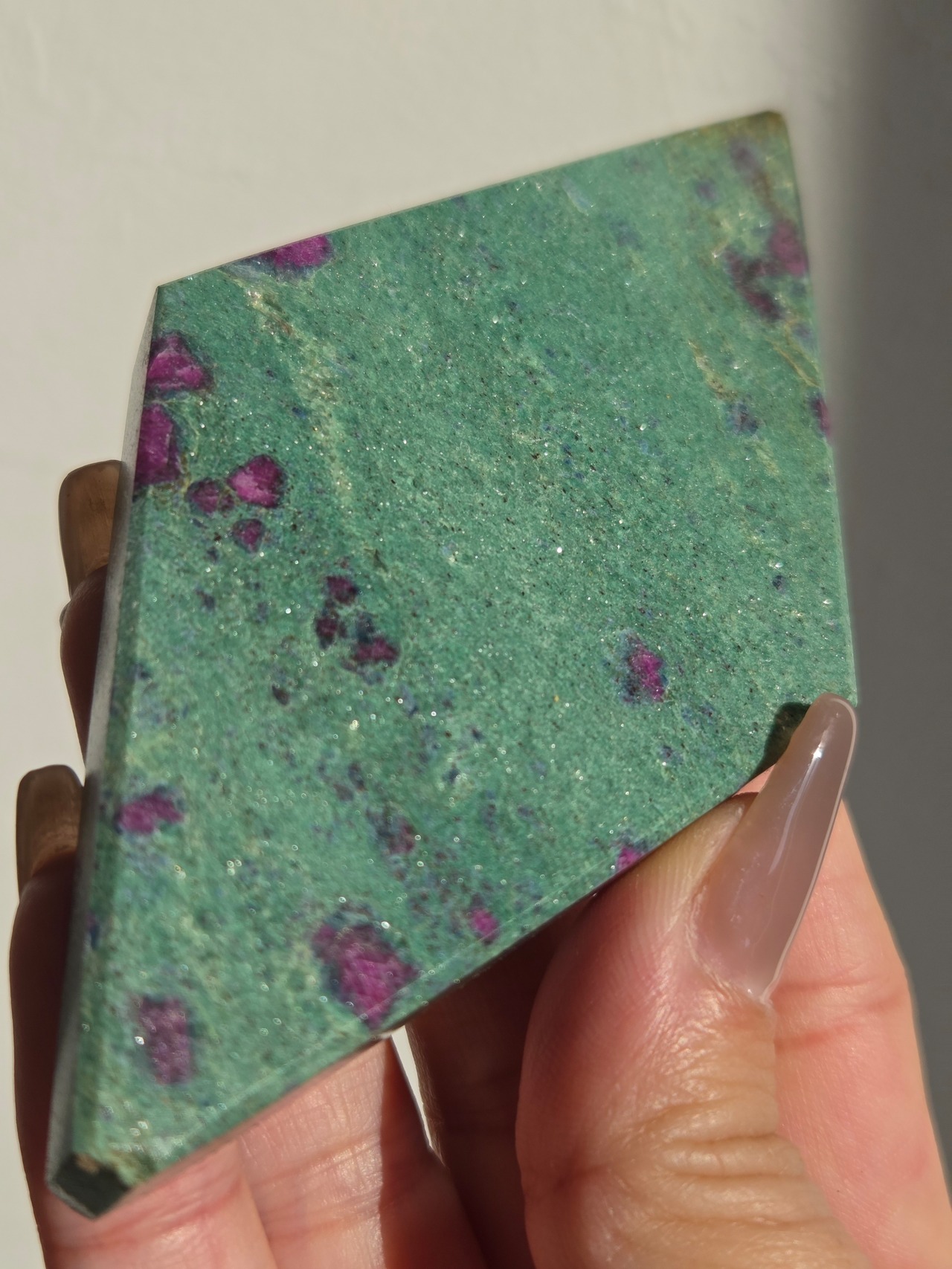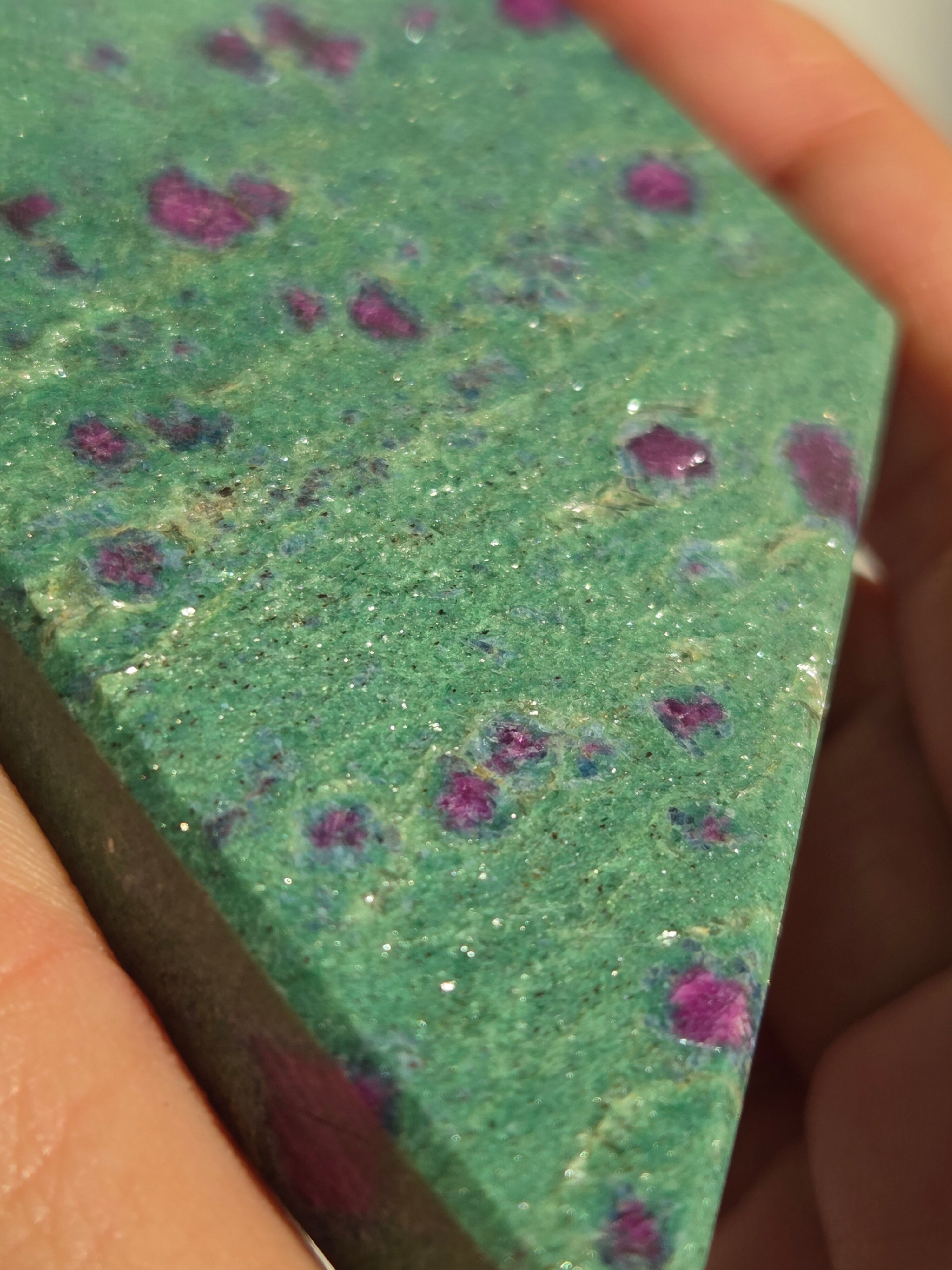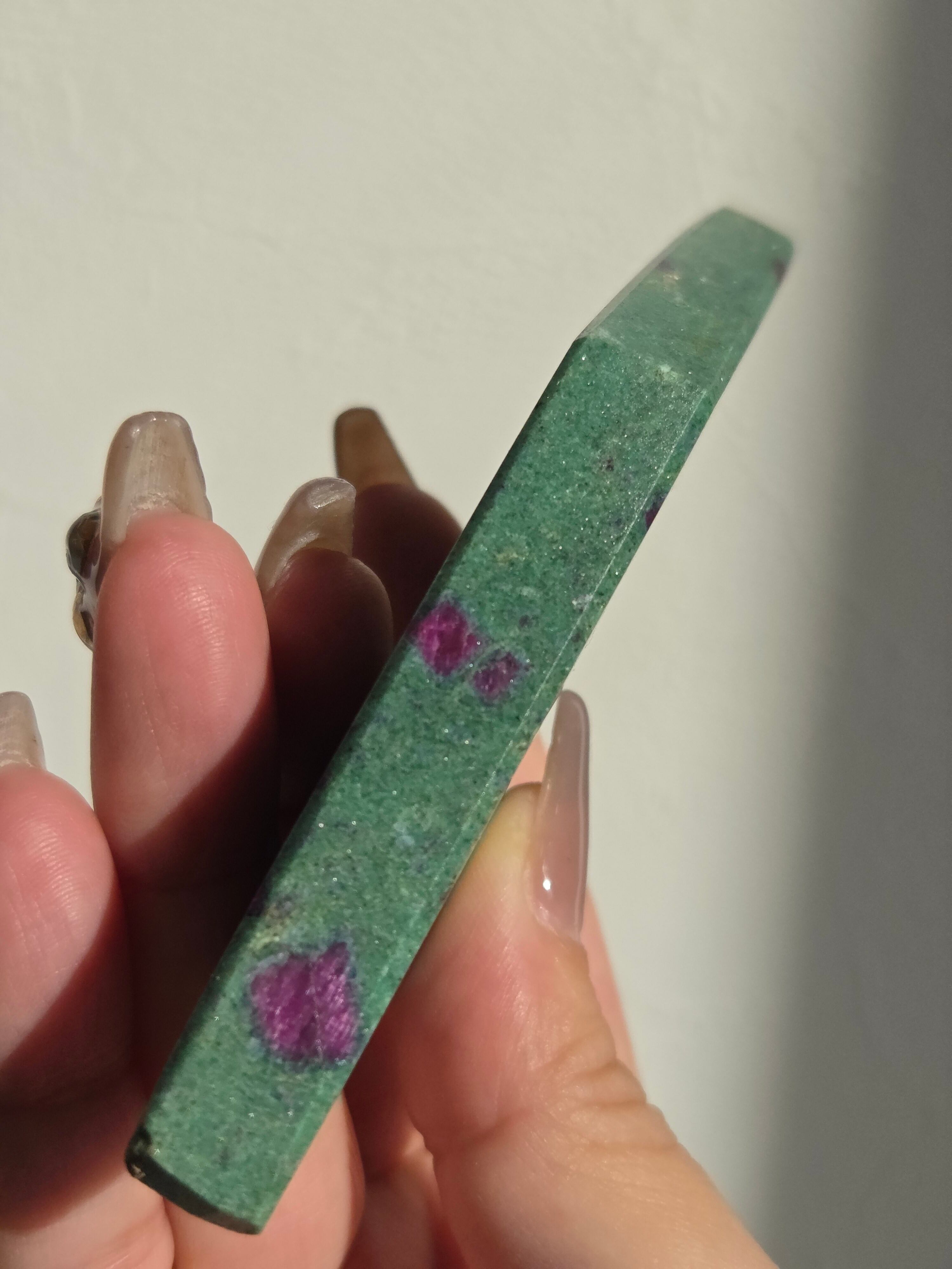 ルビーインフックサイトは、情熱のルビーと癒やしのフックサイト(緑色の雲母)が共生する天然石で、強いヒーリング効果と活力を同時に与え、精神的疲労や落ち込みから立ち直らせ、自己肯定感を高め、困難に打ち勝つ勇気と意欲をサポートするとされています。