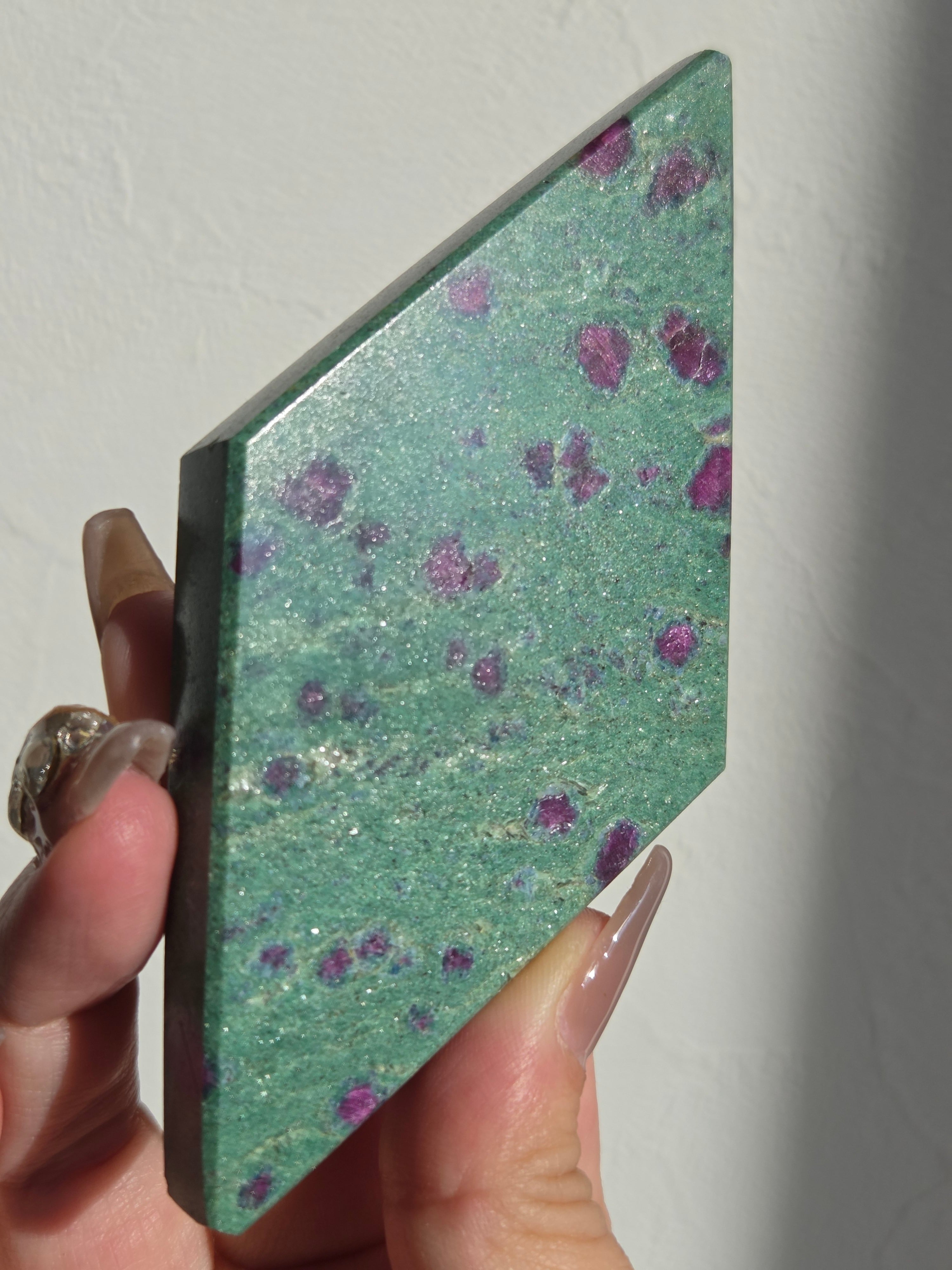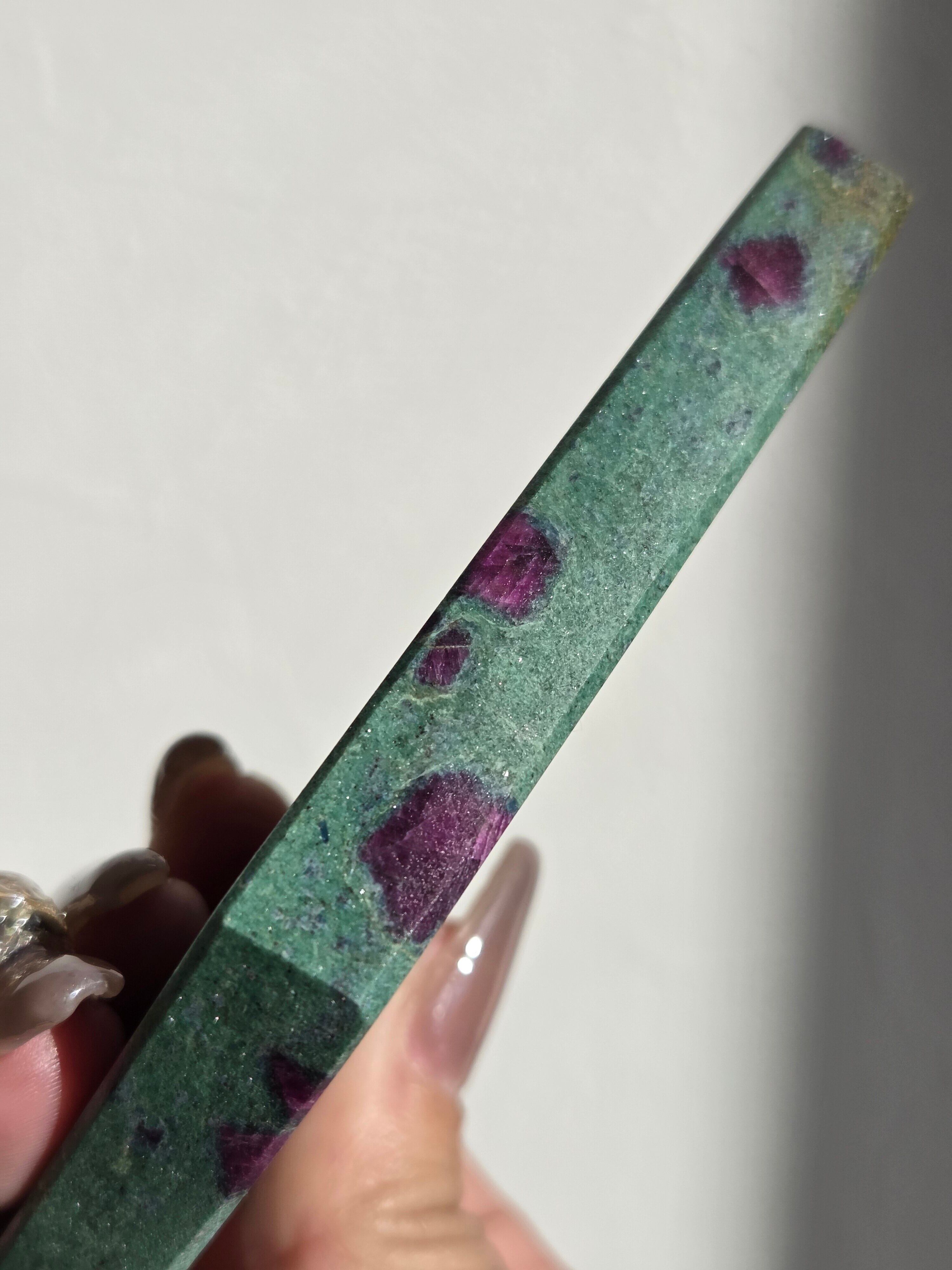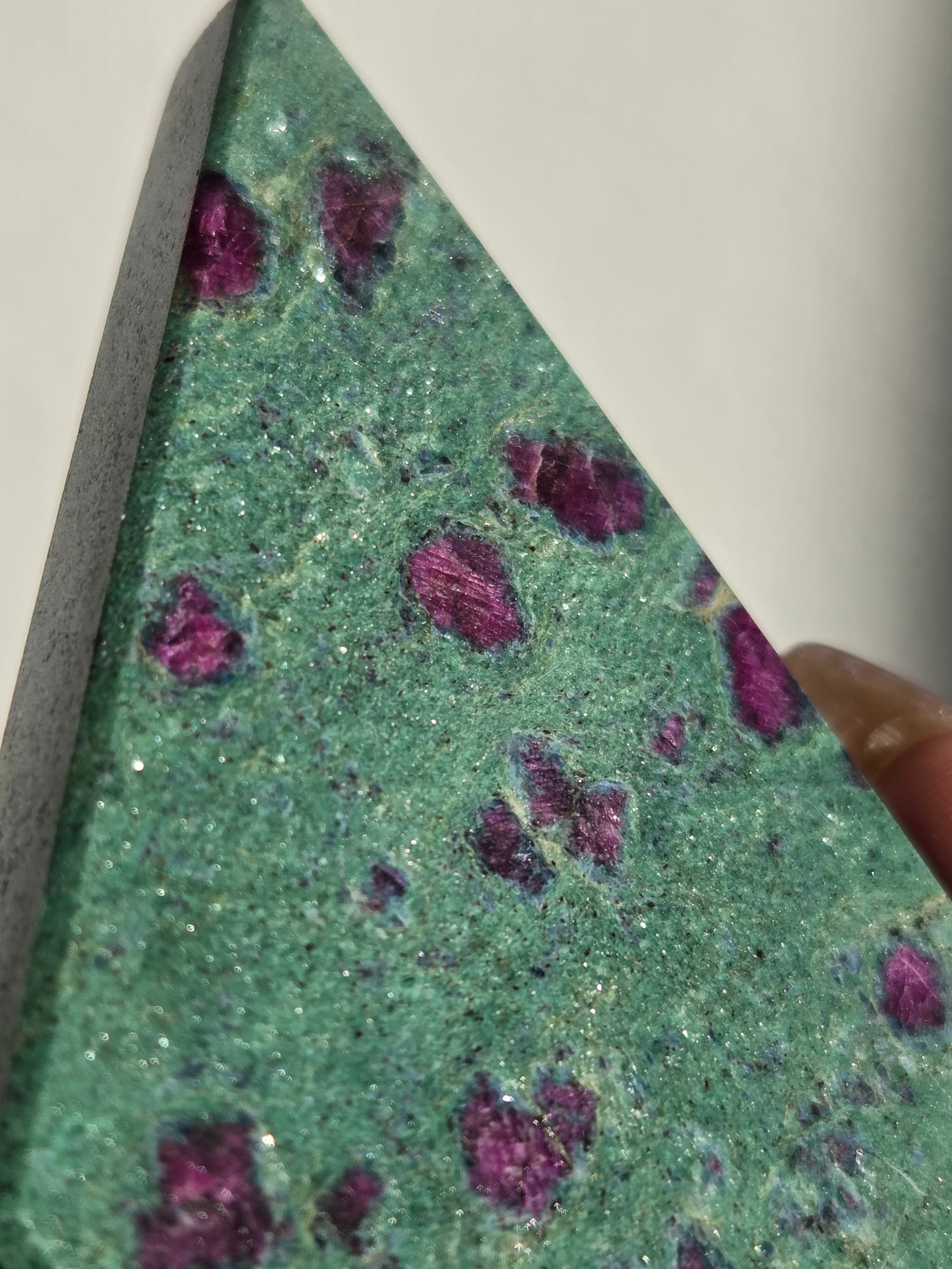 ルビーインフックサイトは、情熱のルビーと癒やしのフックサイト(緑色の雲母)が共生する天然石で、強いヒーリング効果と活力を同時に与え、精神的疲労や落ち込みから立ち直らせ、自己肯定感を高め、困難に打ち勝つ勇気と意欲をサポートするとされています。