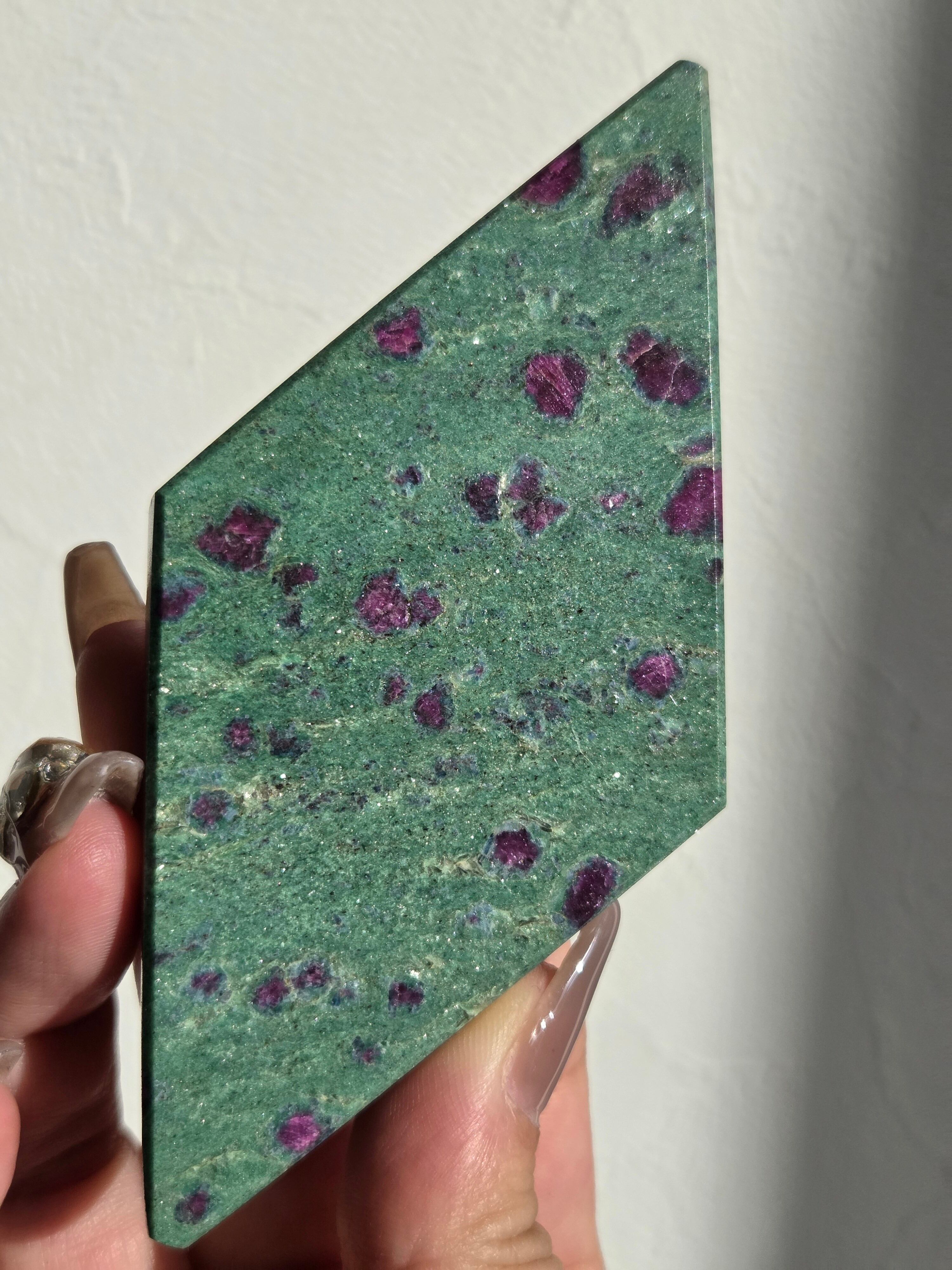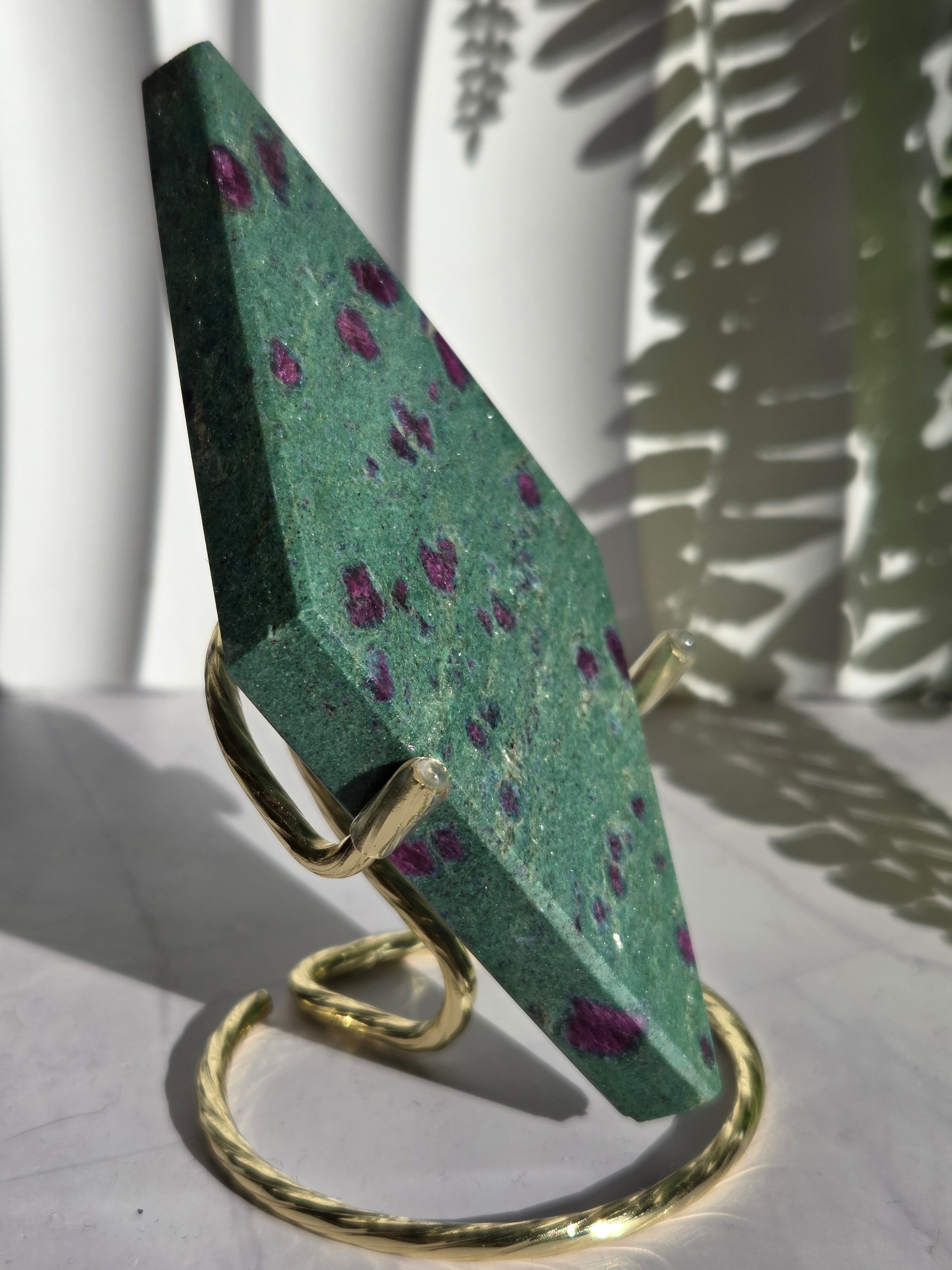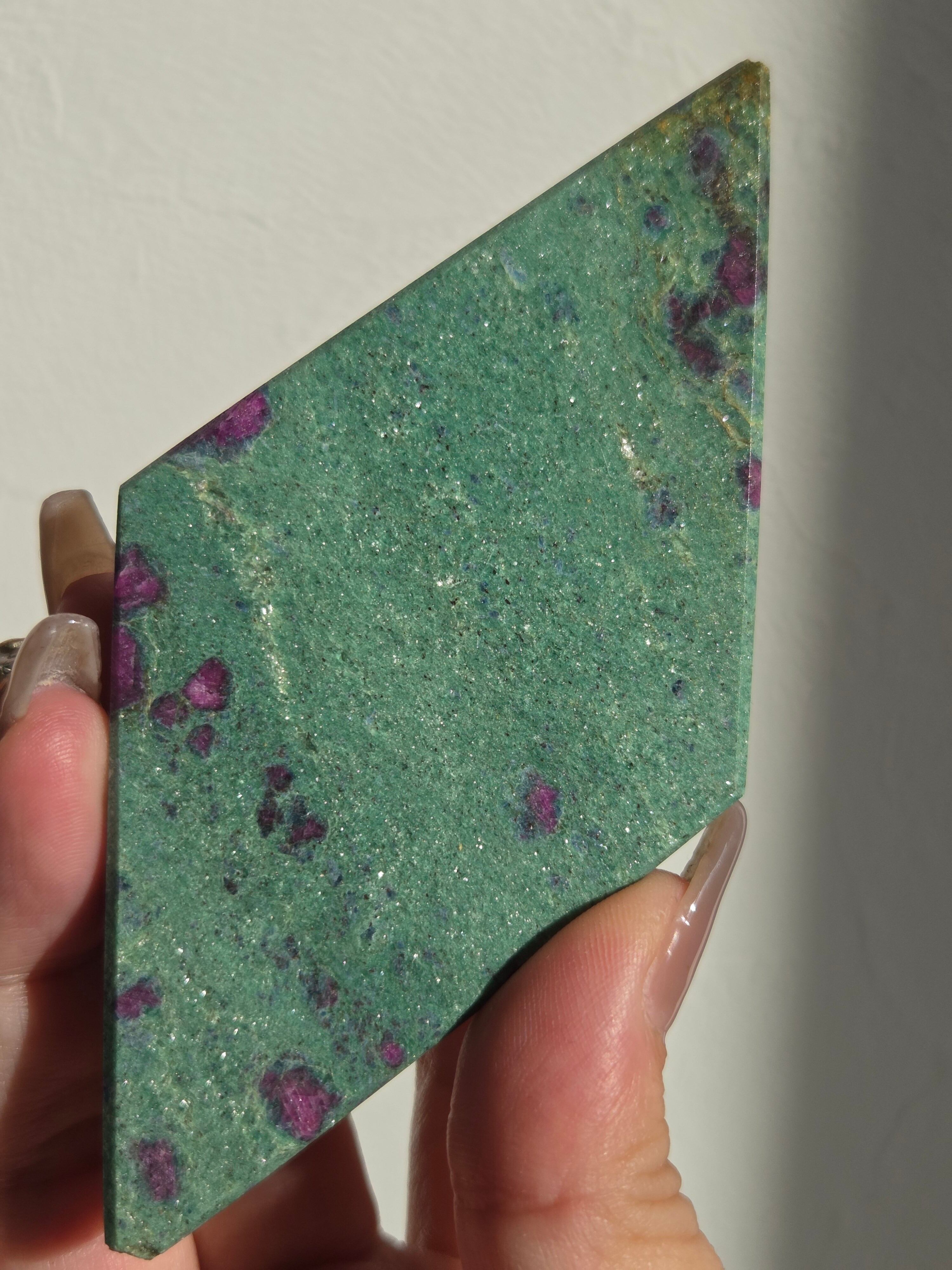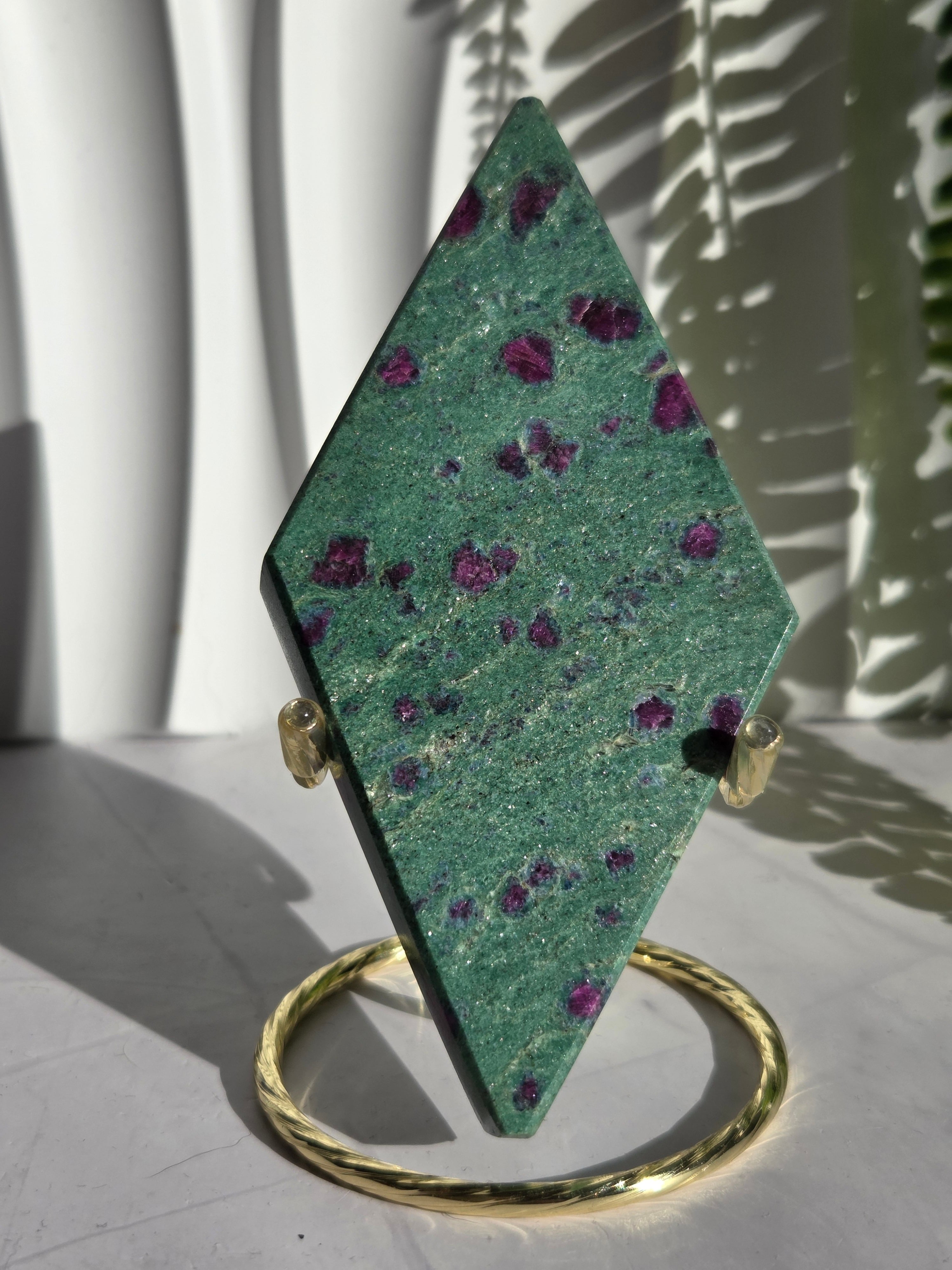 ルビーインフックサイトは、情熱のルビーと癒やしのフックサイト(緑色の雲母)が共生する天然石で、強いヒーリング効果と活力を同時に与え、精神的疲労や落ち込みから立ち直らせ、自己肯定感を高め、困難に打ち勝つ勇気と意欲をサポートするとされています。