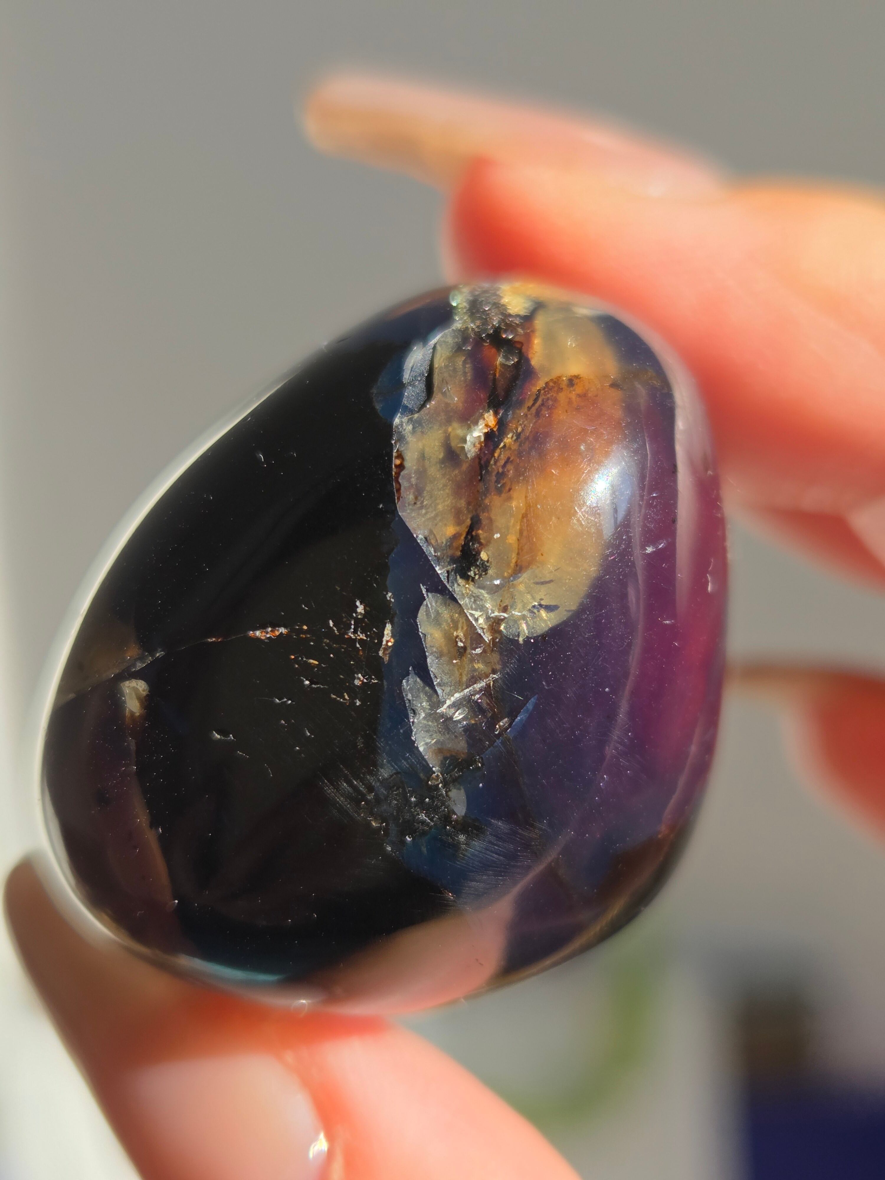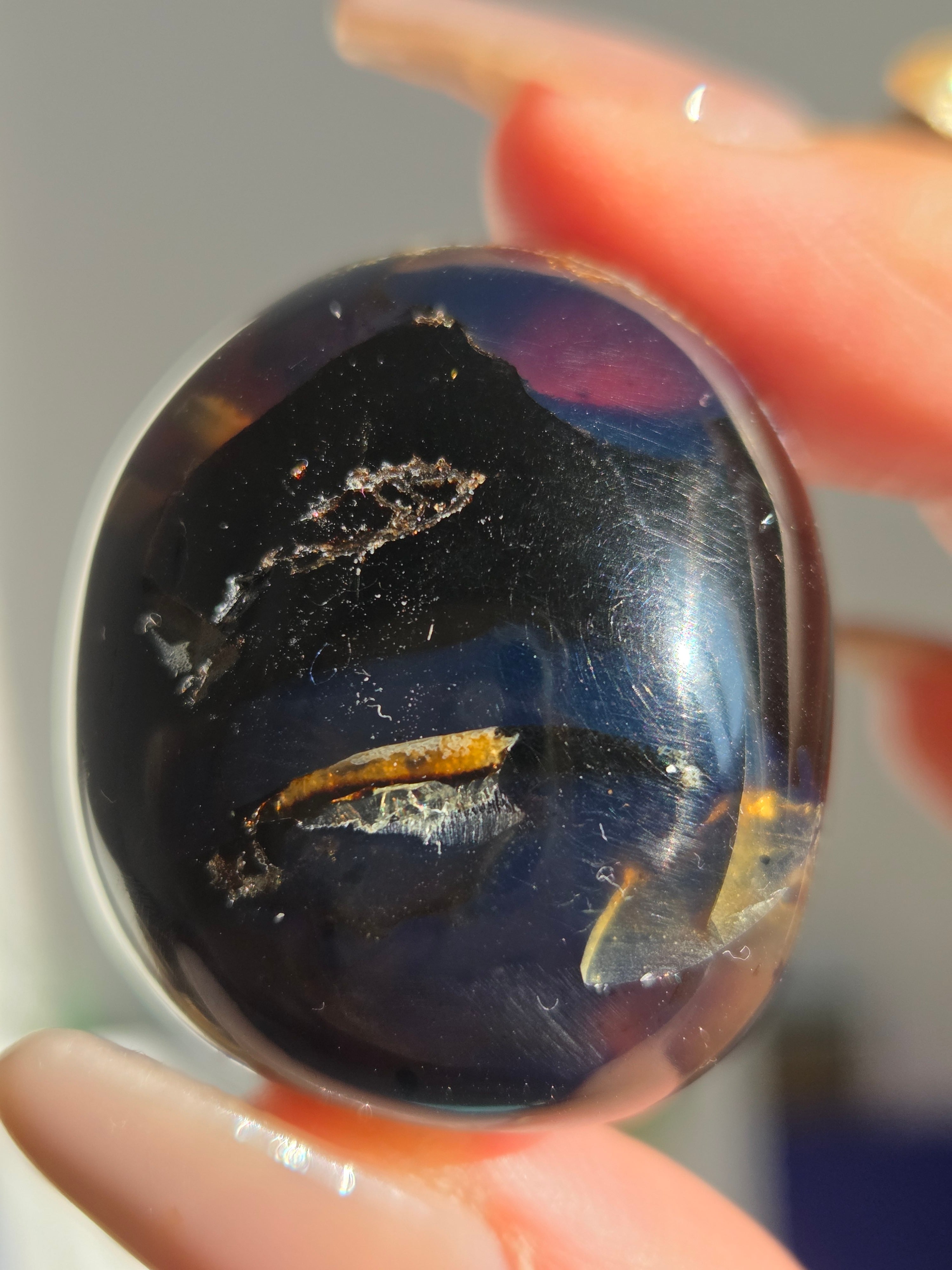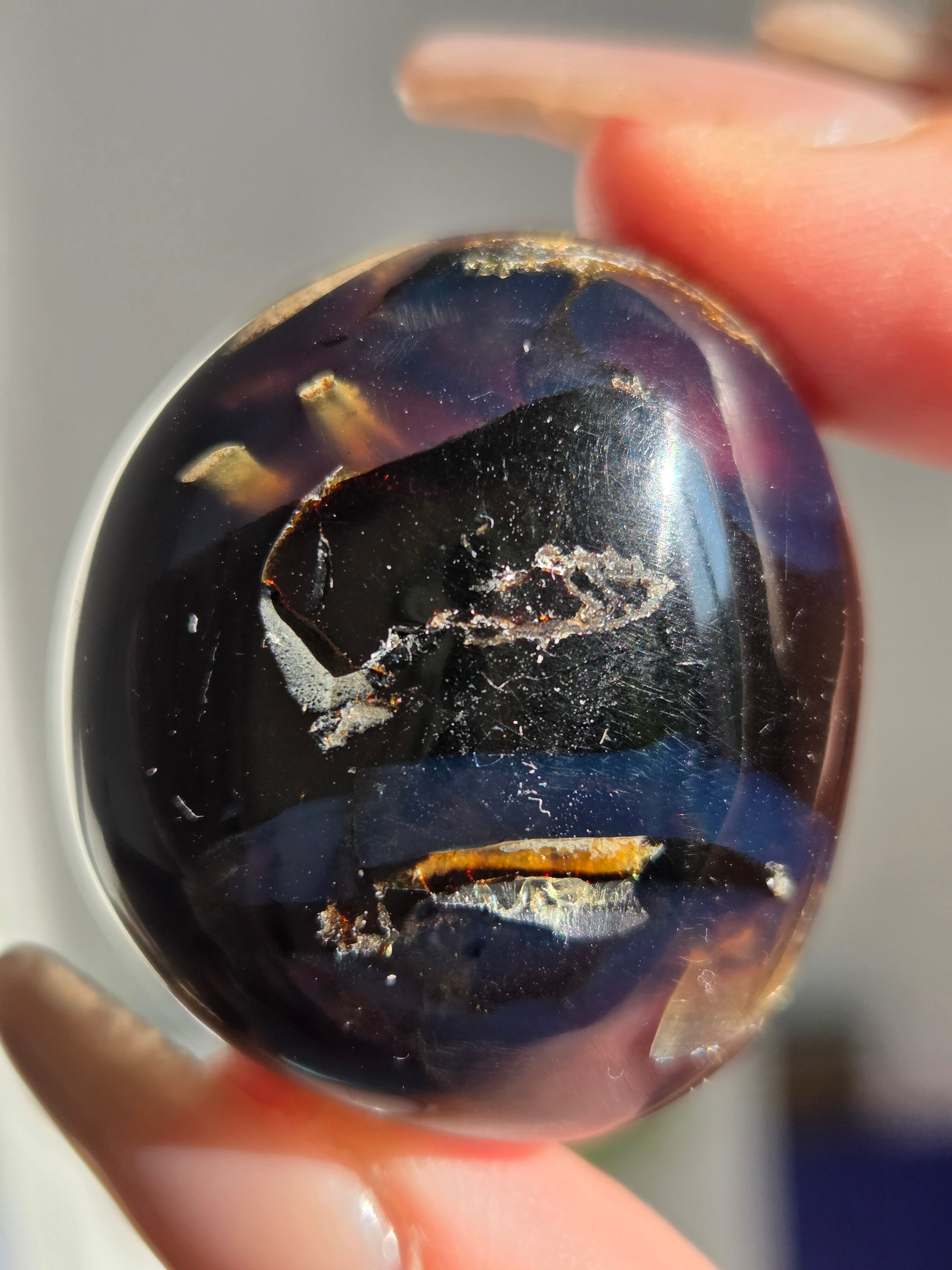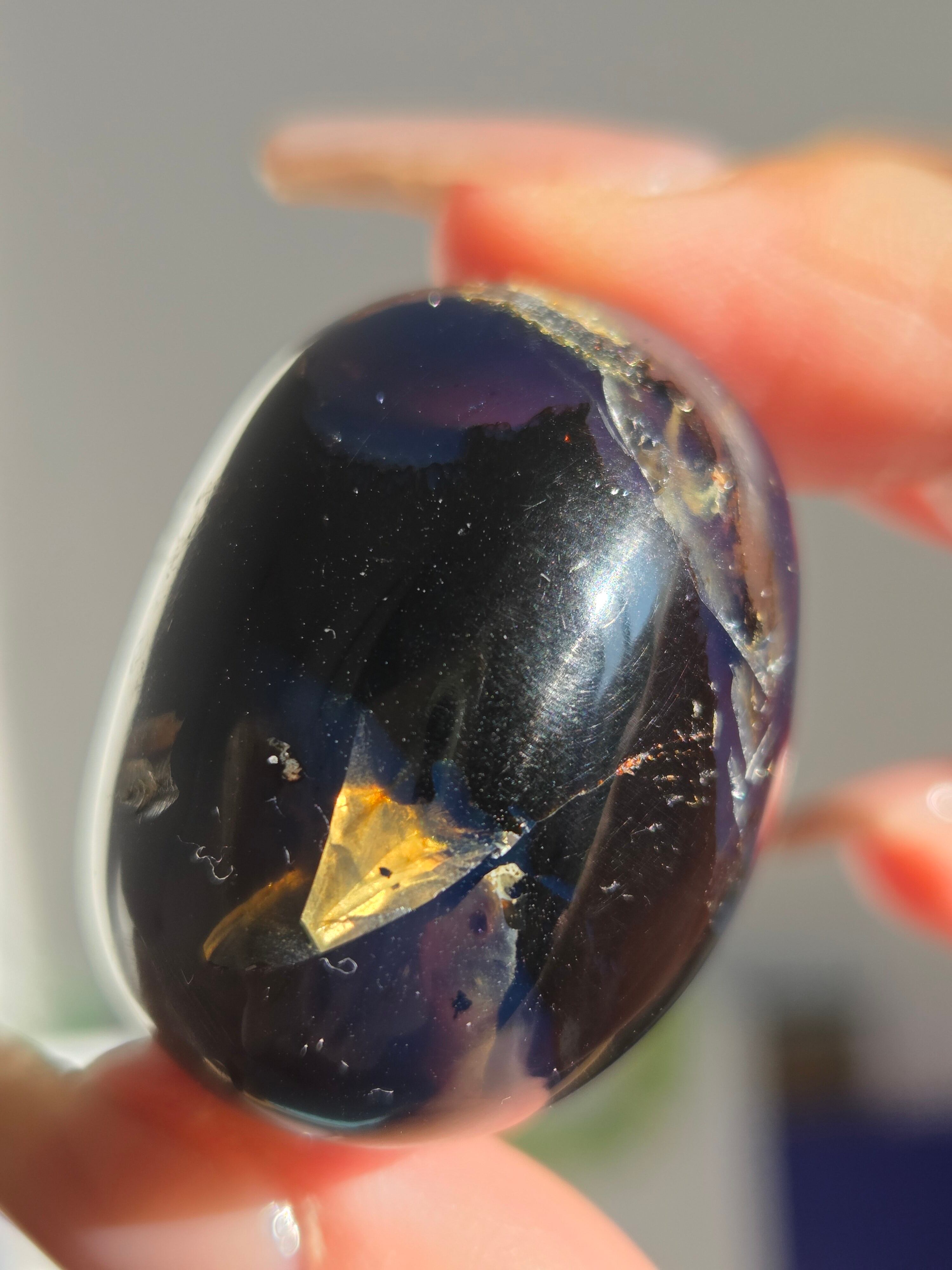 ブルーアンバー(青琥珀)は希少な天然樹脂(琥珀)の一種で、普段はイエローアンバーのように見えるものの、角度によって色味が異なり、太陽の下では薄い青みを帯びた光を放ちます。