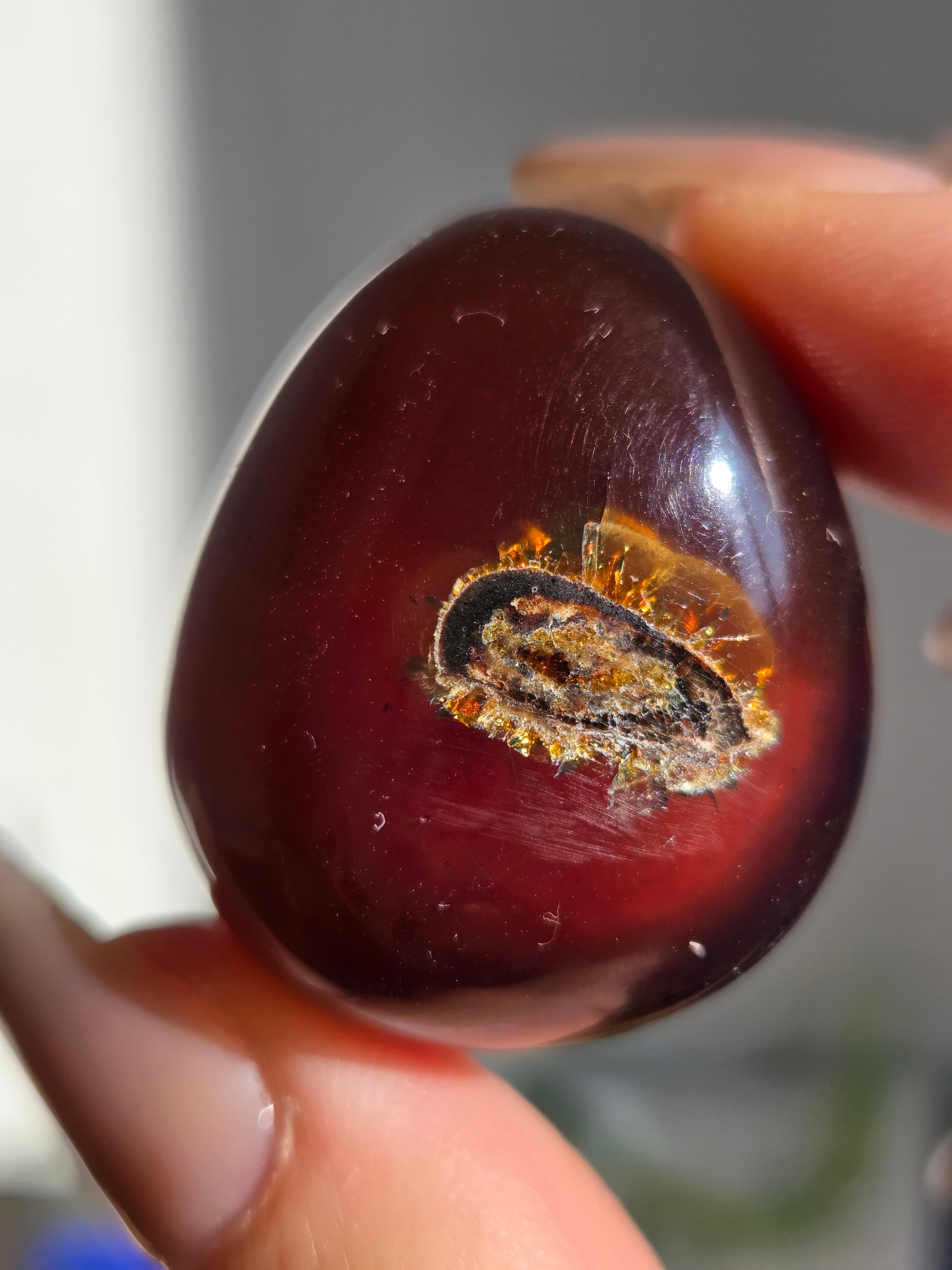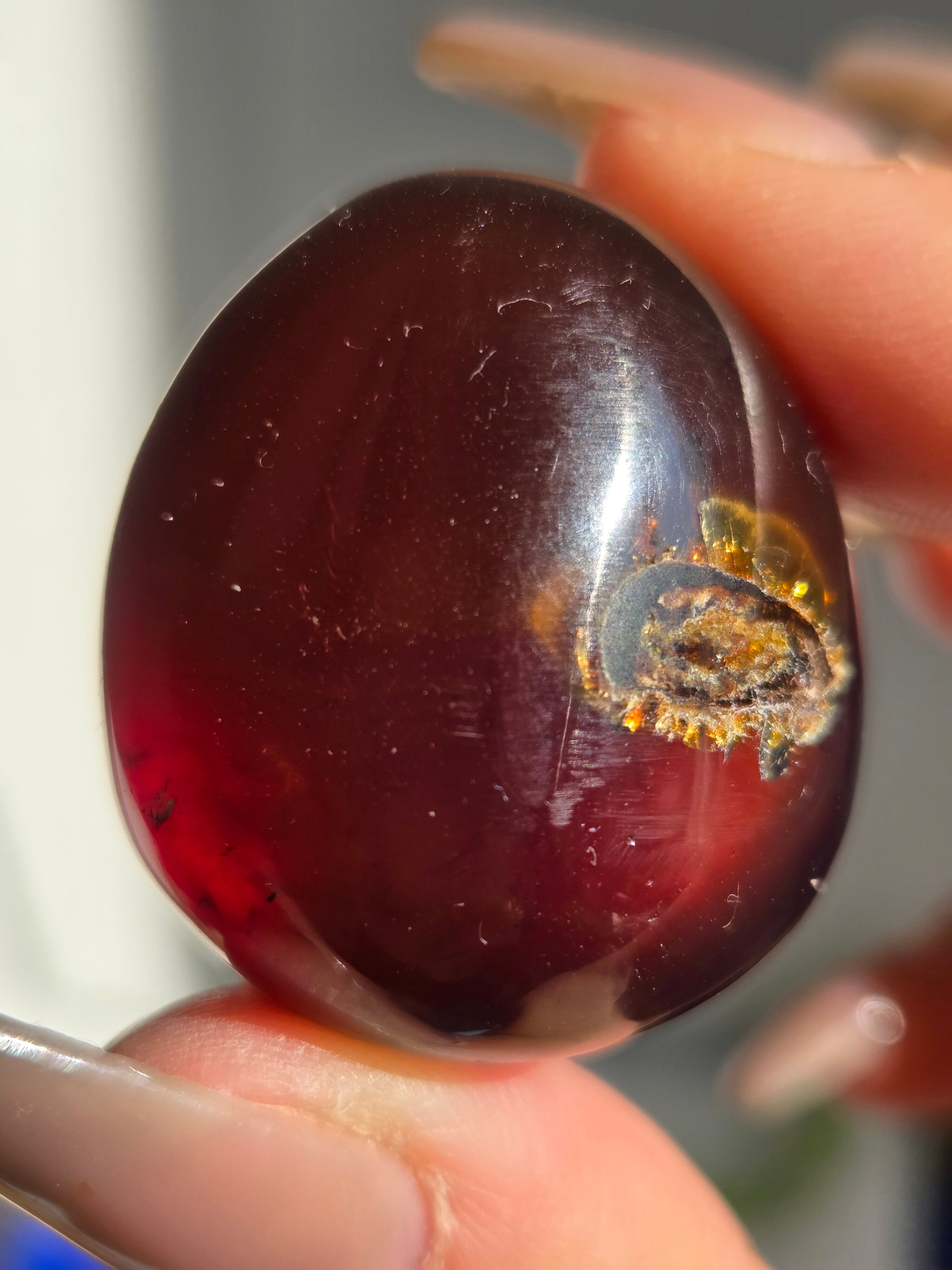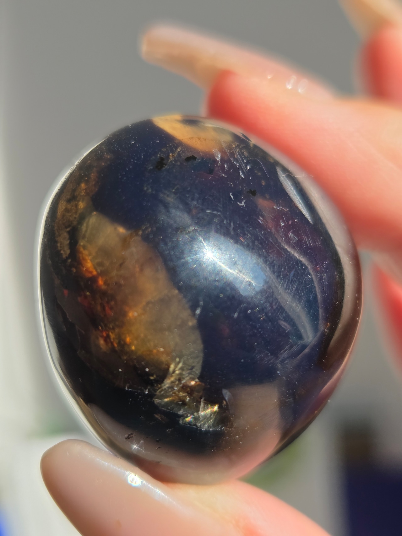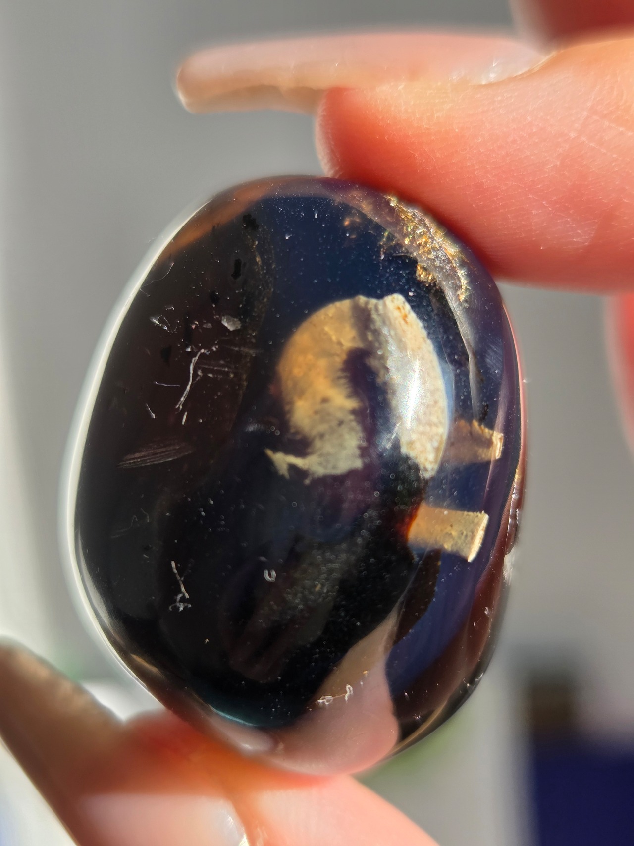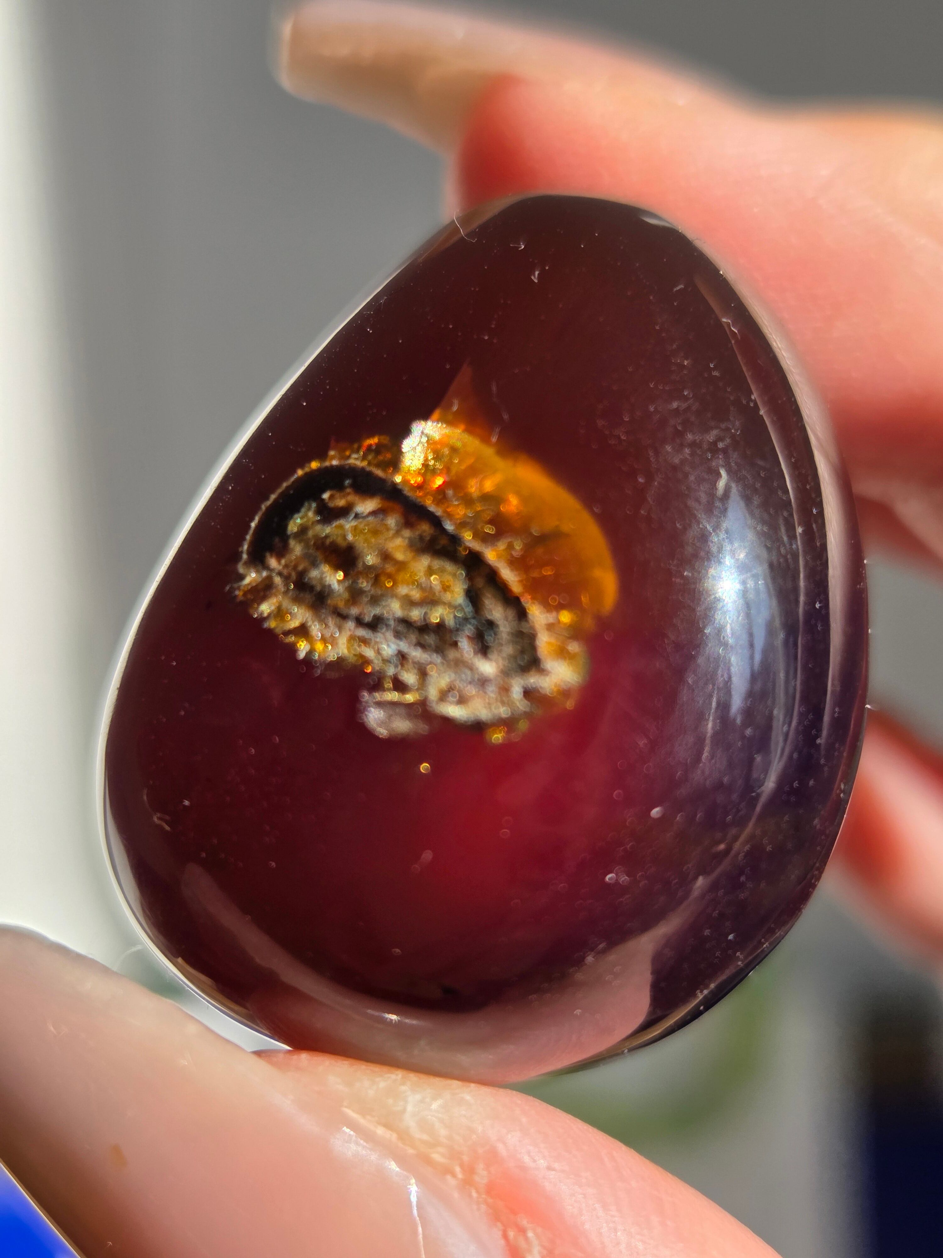 ブルーアンバー(青琥珀)は希少な天然樹脂(琥珀)の一種で、普段はイエローアンバーのように見えるものの、角度によって色味が異なり、太陽の下では薄い青みを帯びた光を放ちます。