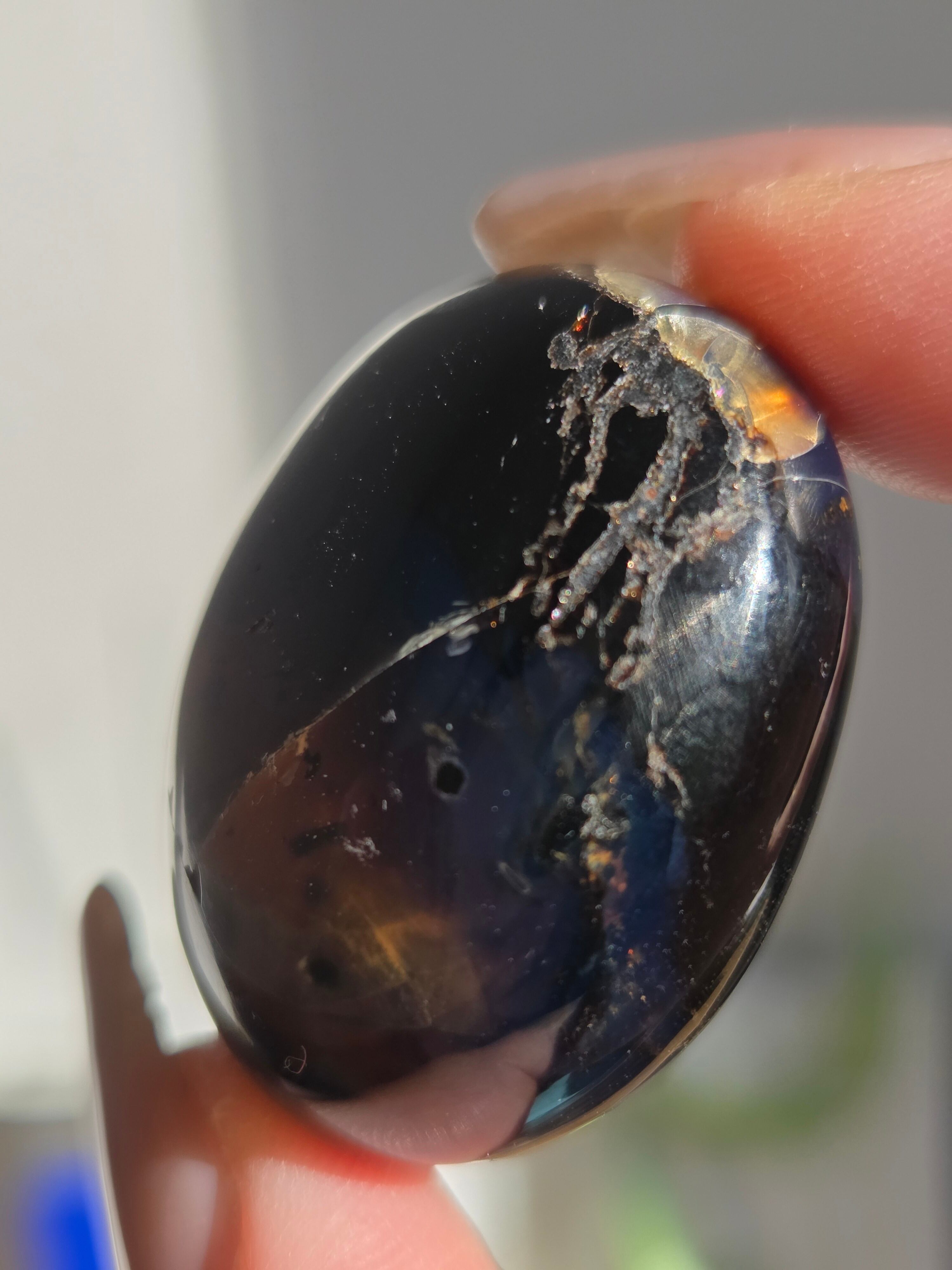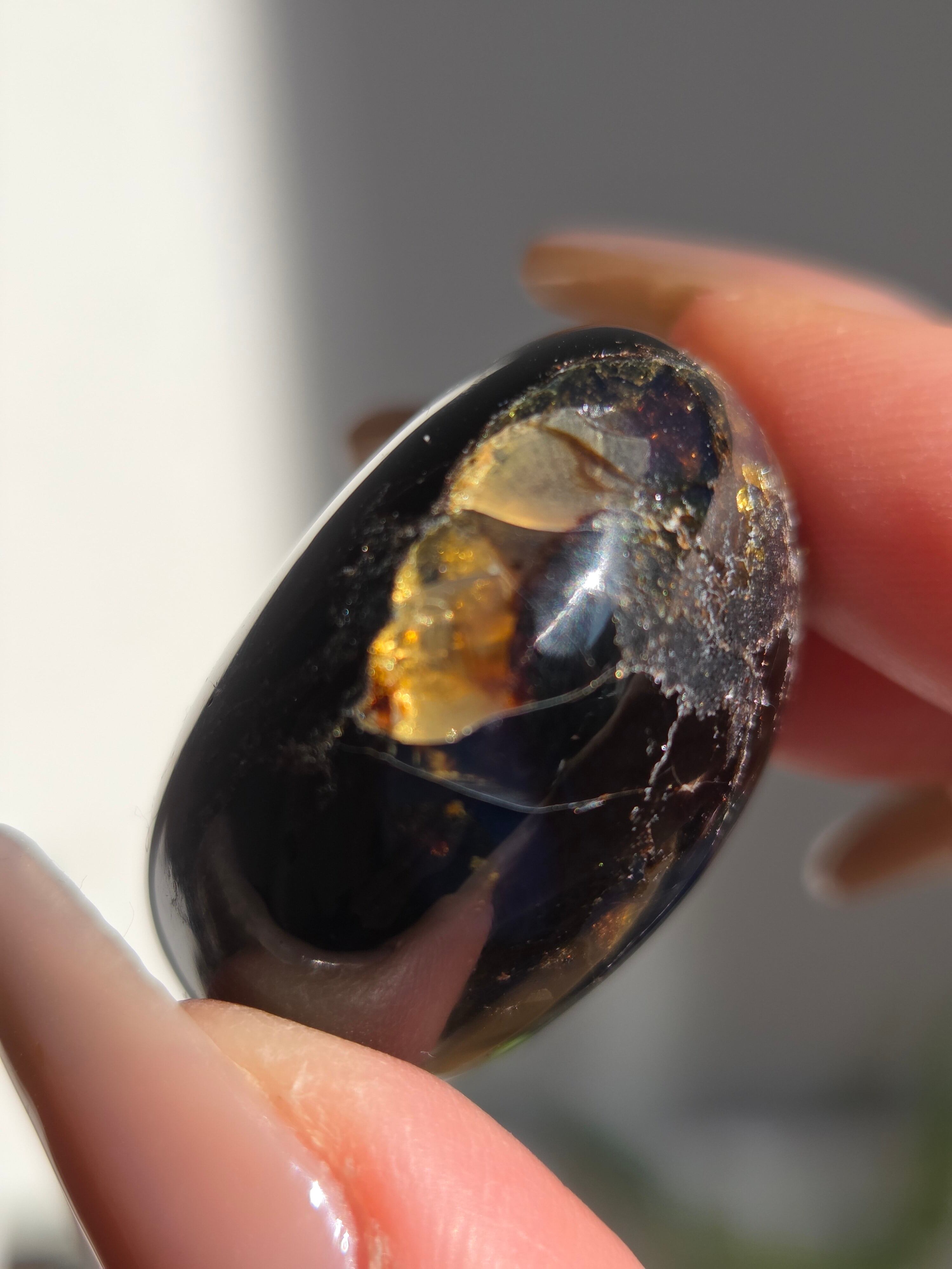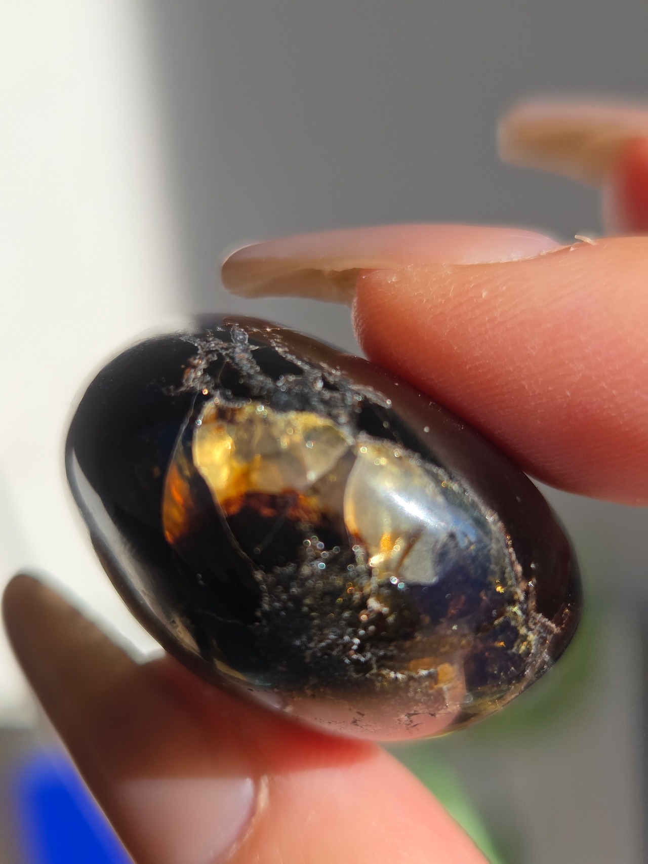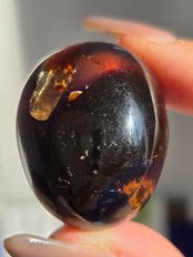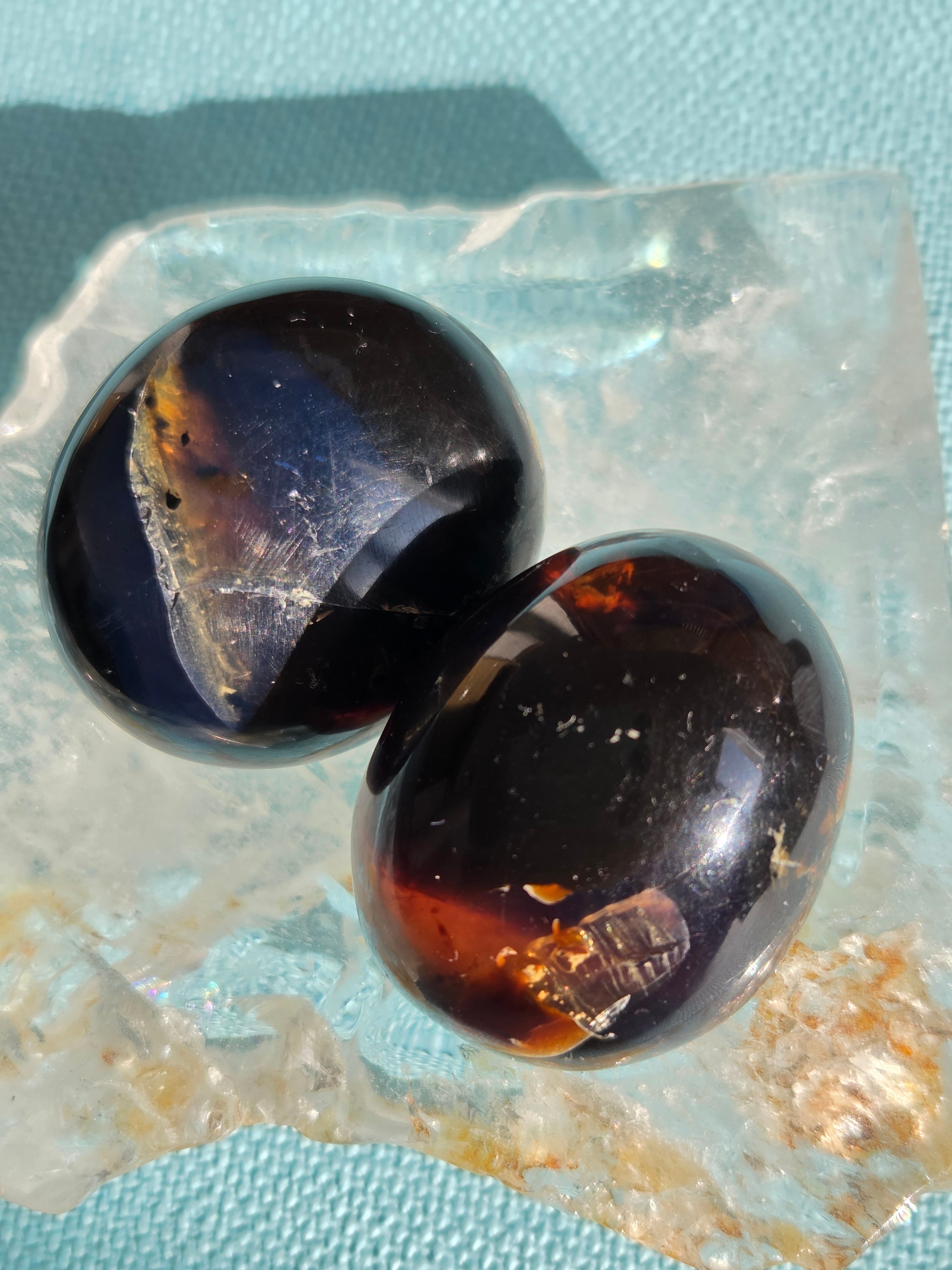 ブルーアンバー(青琥珀)は希少な天然樹脂(琥珀)の一種で、普段はイエローアンバーのように見えるものの、角度によって色味が異なり、太陽の下では薄い青みを帯びた光を放ちます。