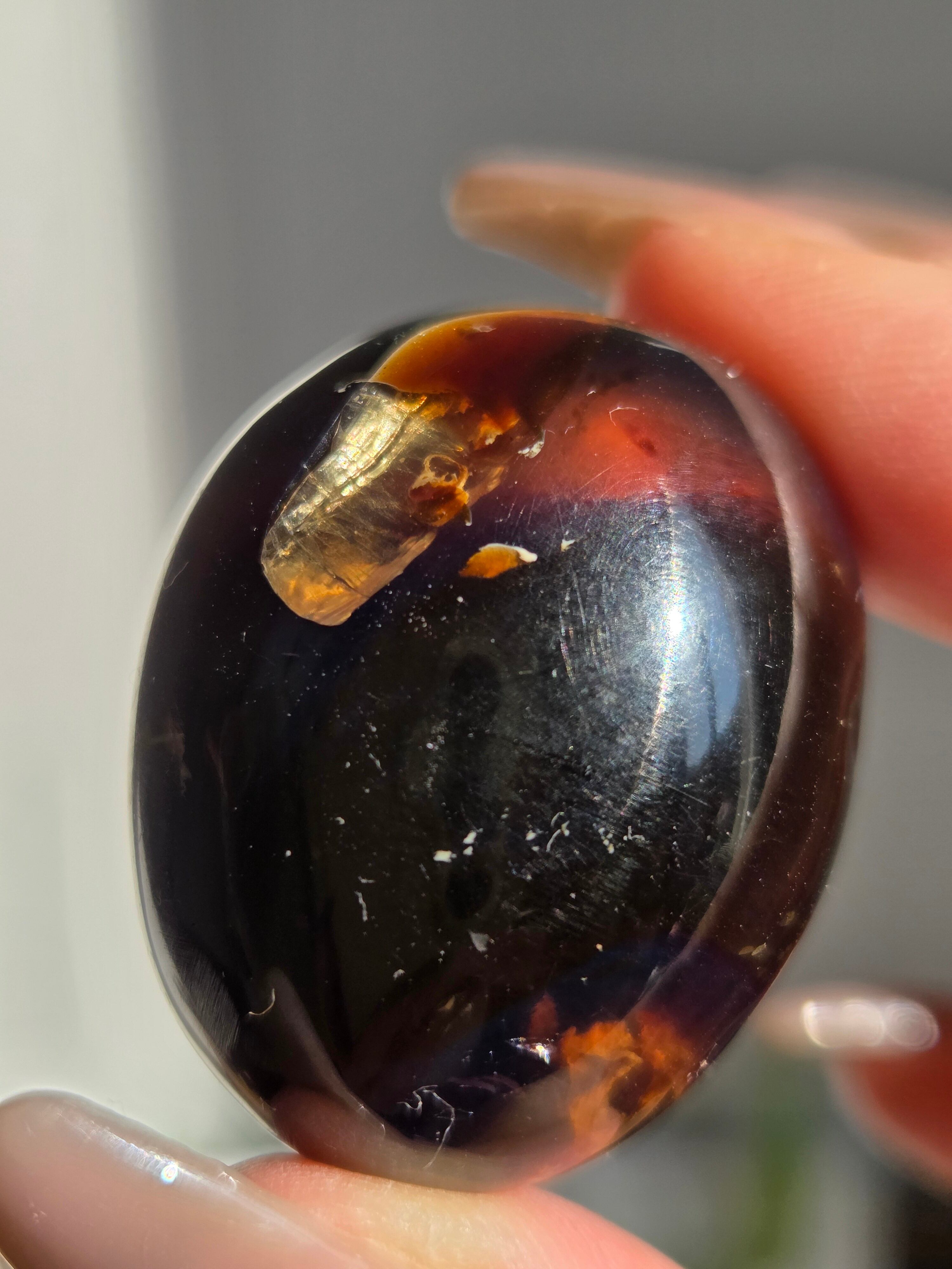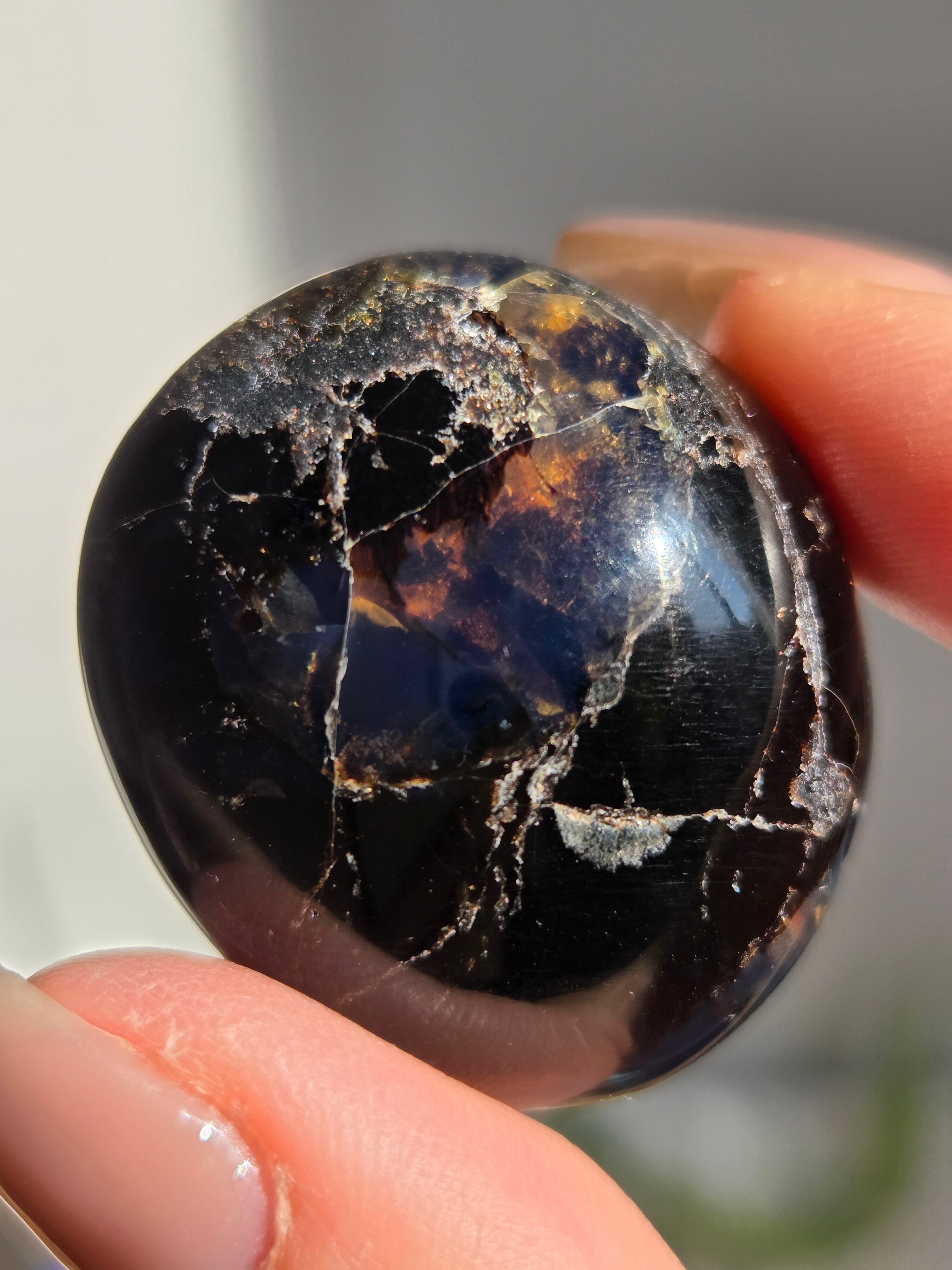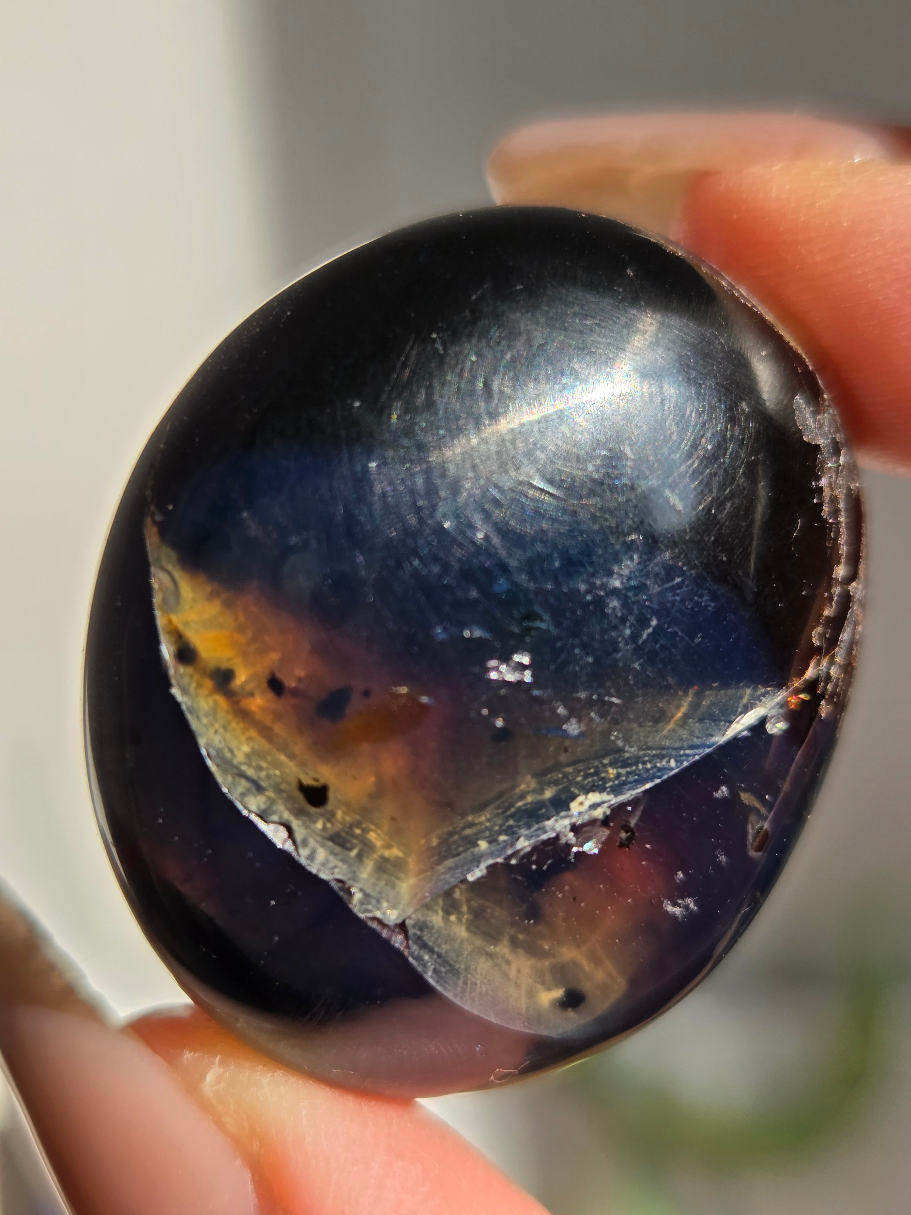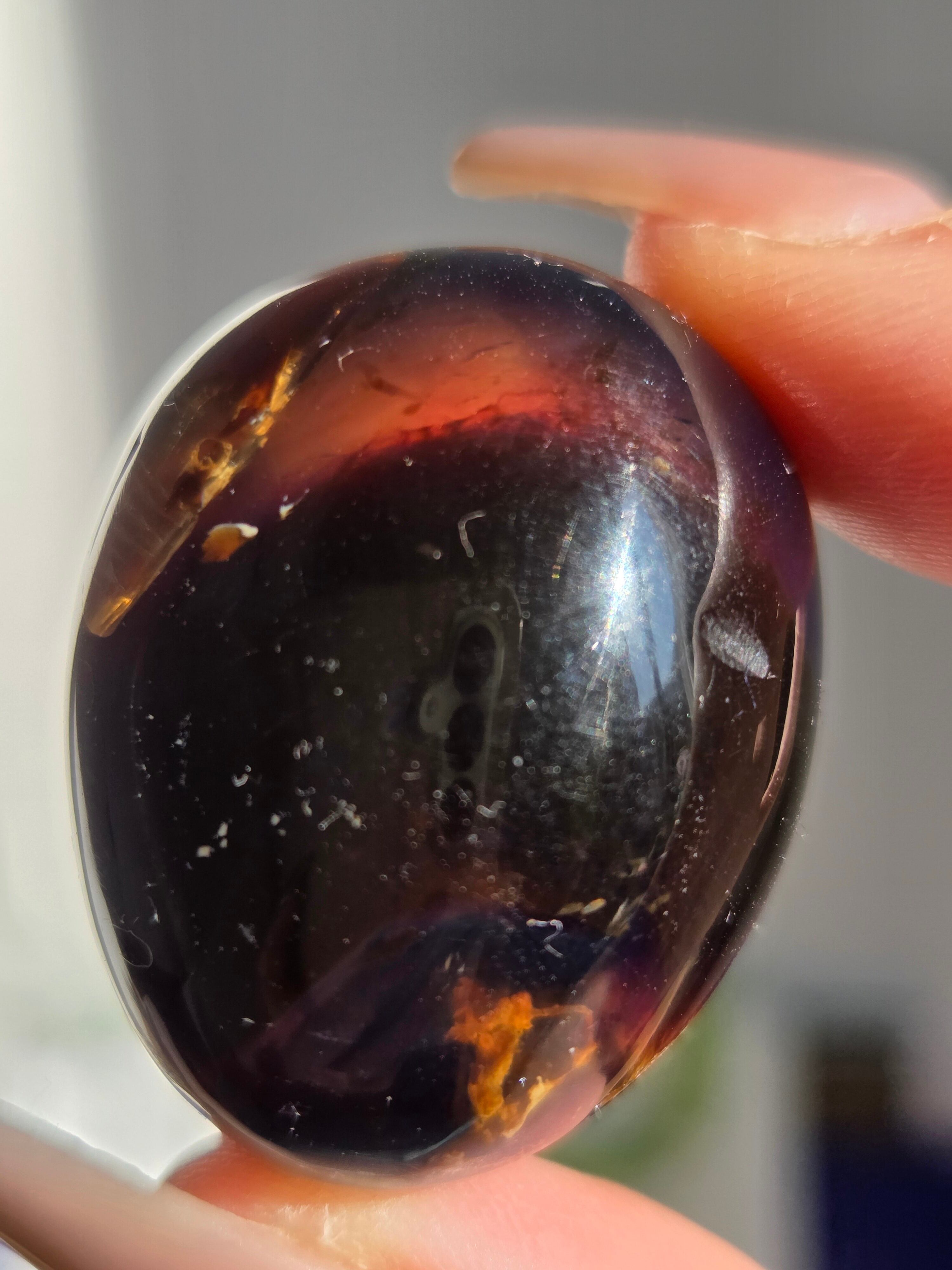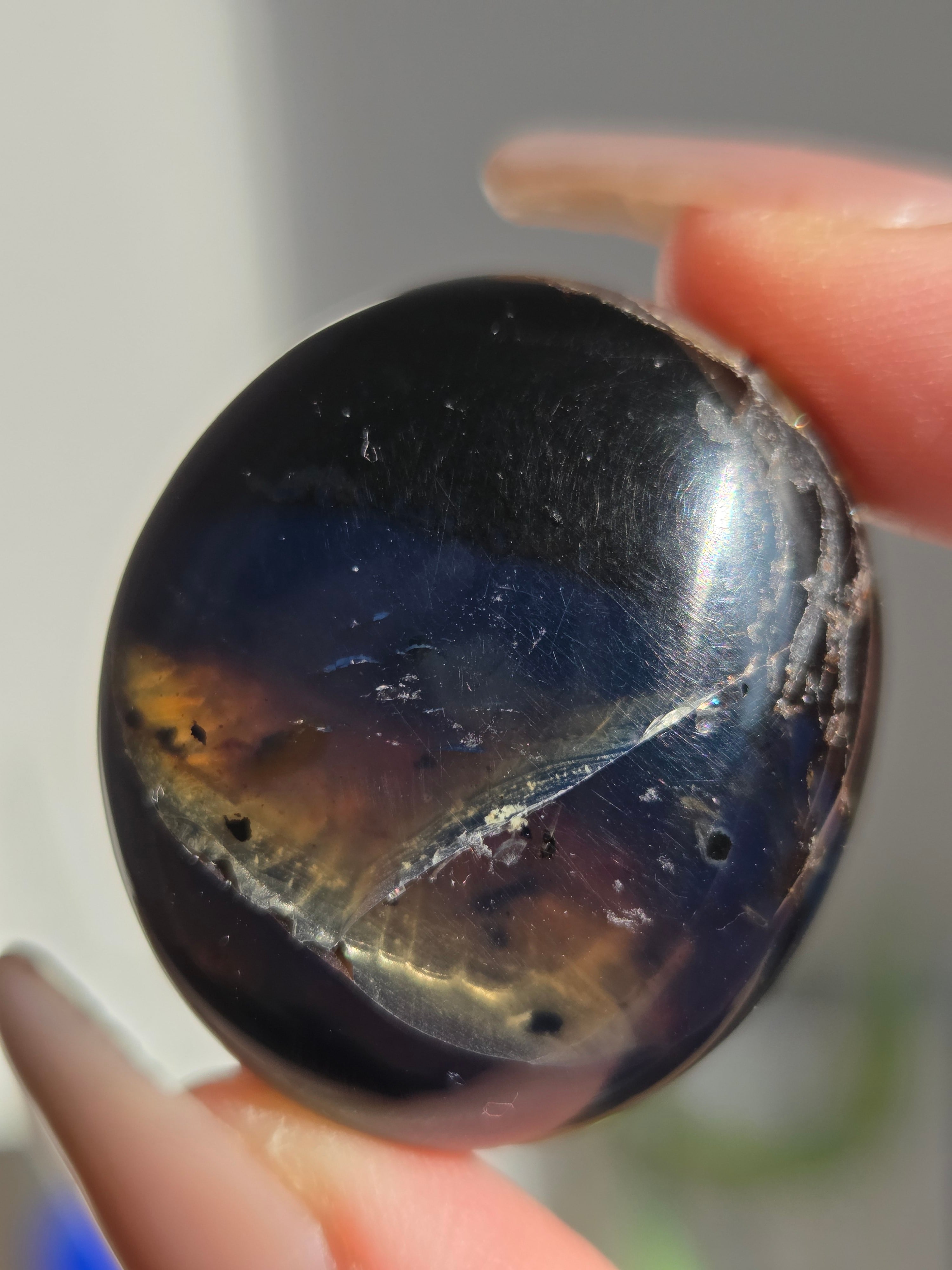 ブルーアンバー(青琥珀)は希少な天然樹脂(琥珀)の一種で、普段はイエローアンバーのように見えるものの、角度によって色味が異なり、太陽の下では薄い青みを帯びた光を放ちます。