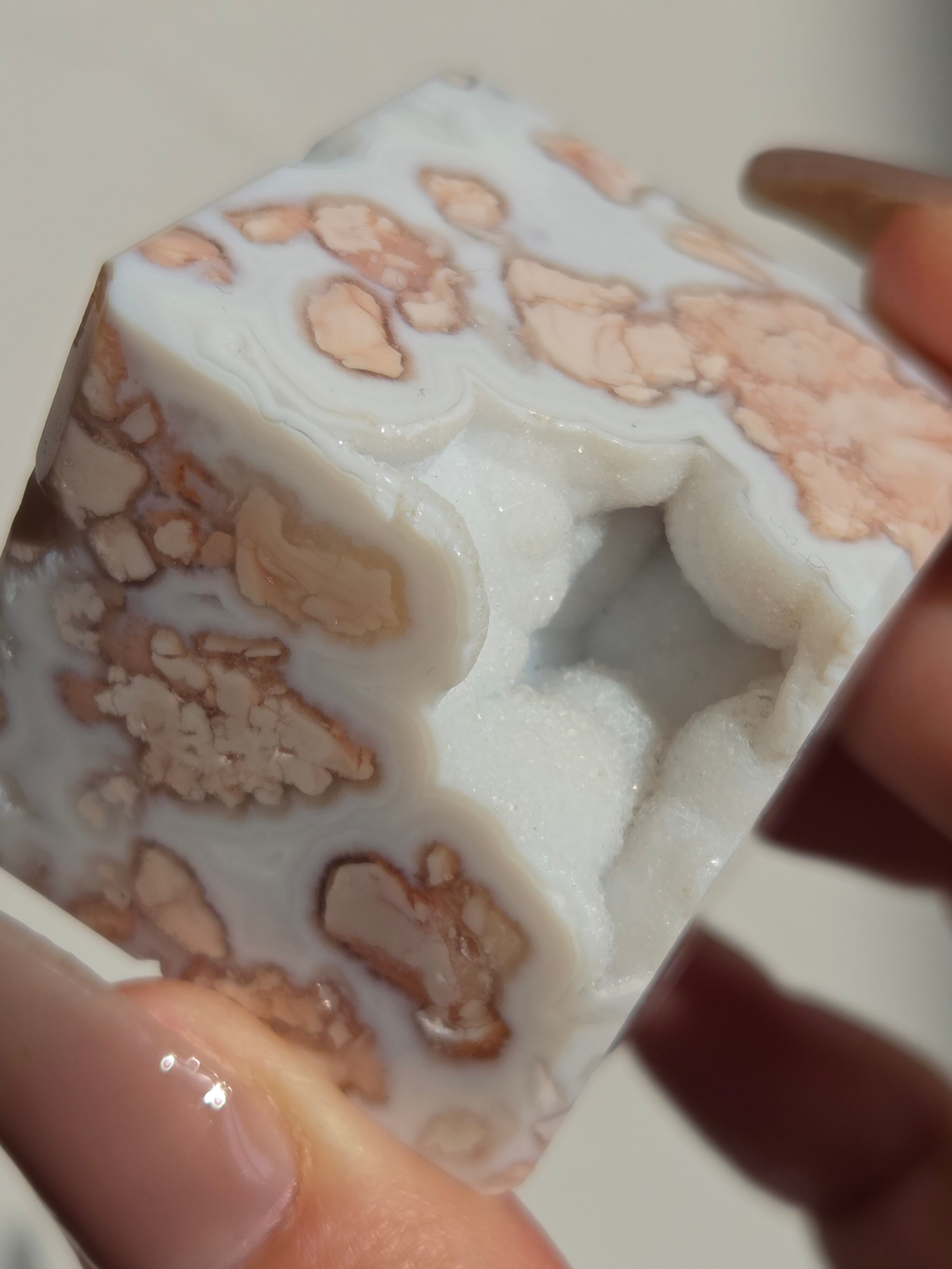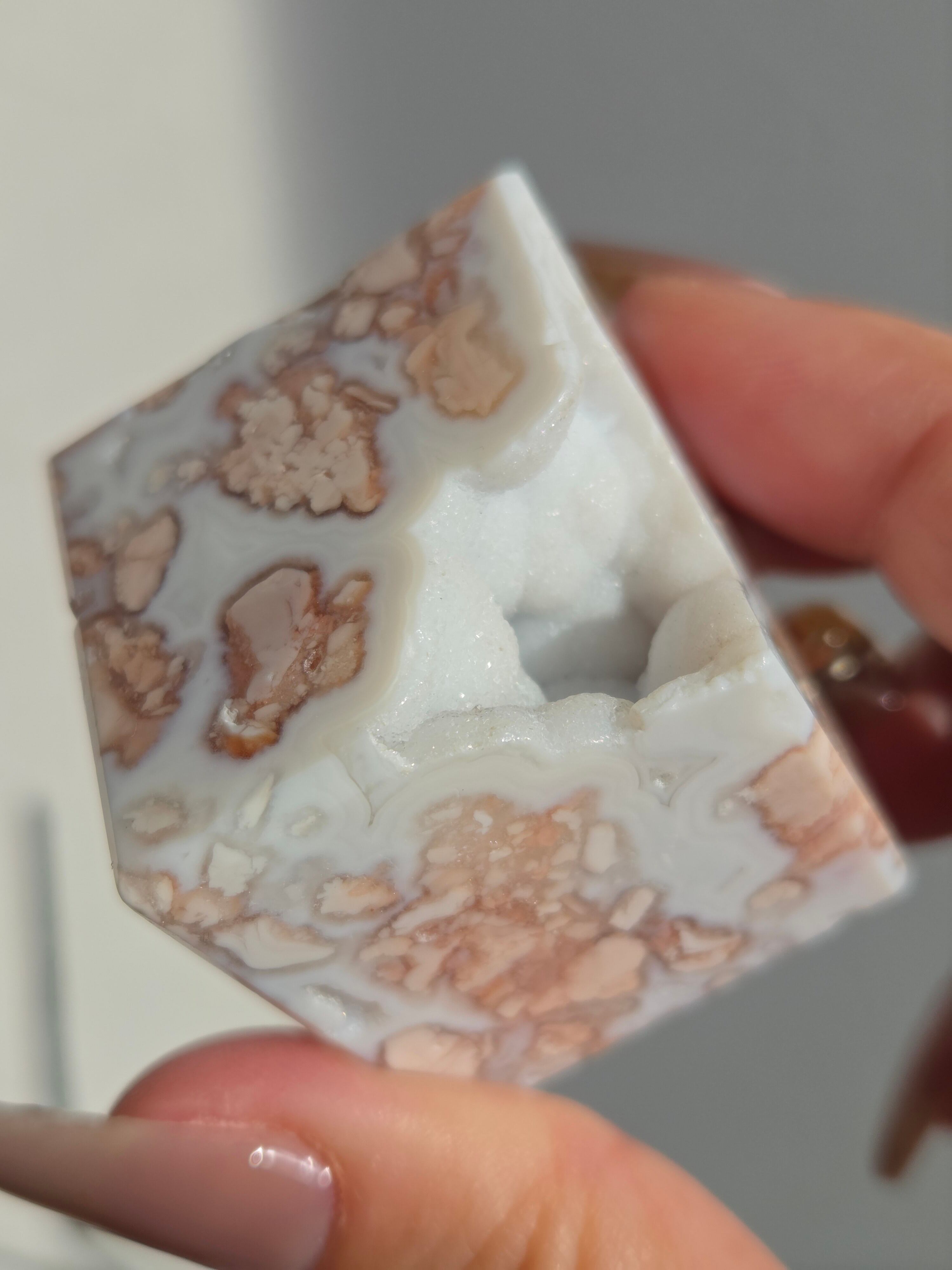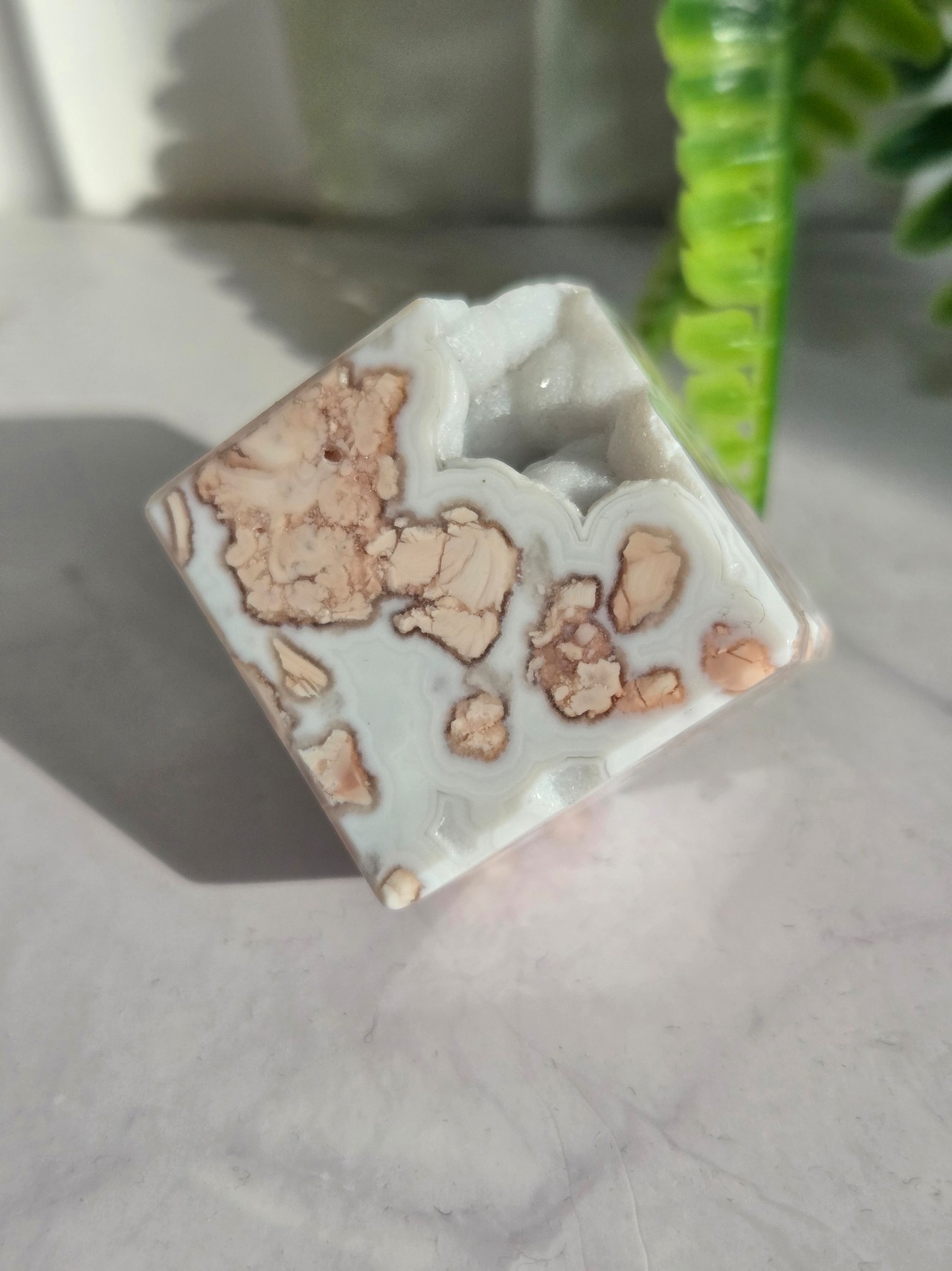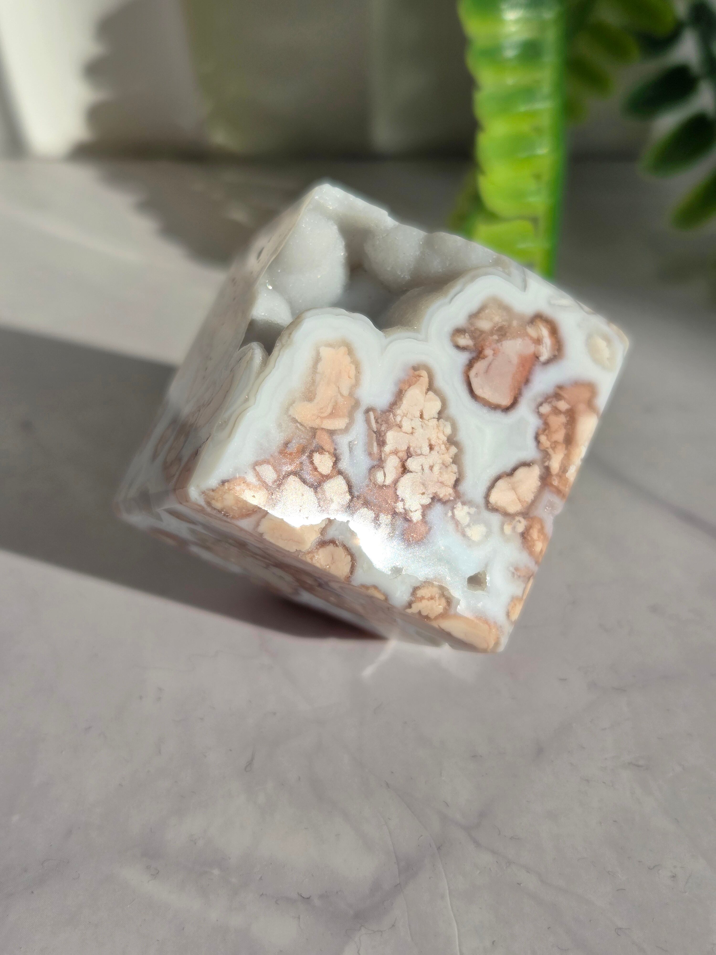 サーモンピンクカラーの瑪瑙に、キラキラのジオード部分が素敵なキューブ形オブジェです。