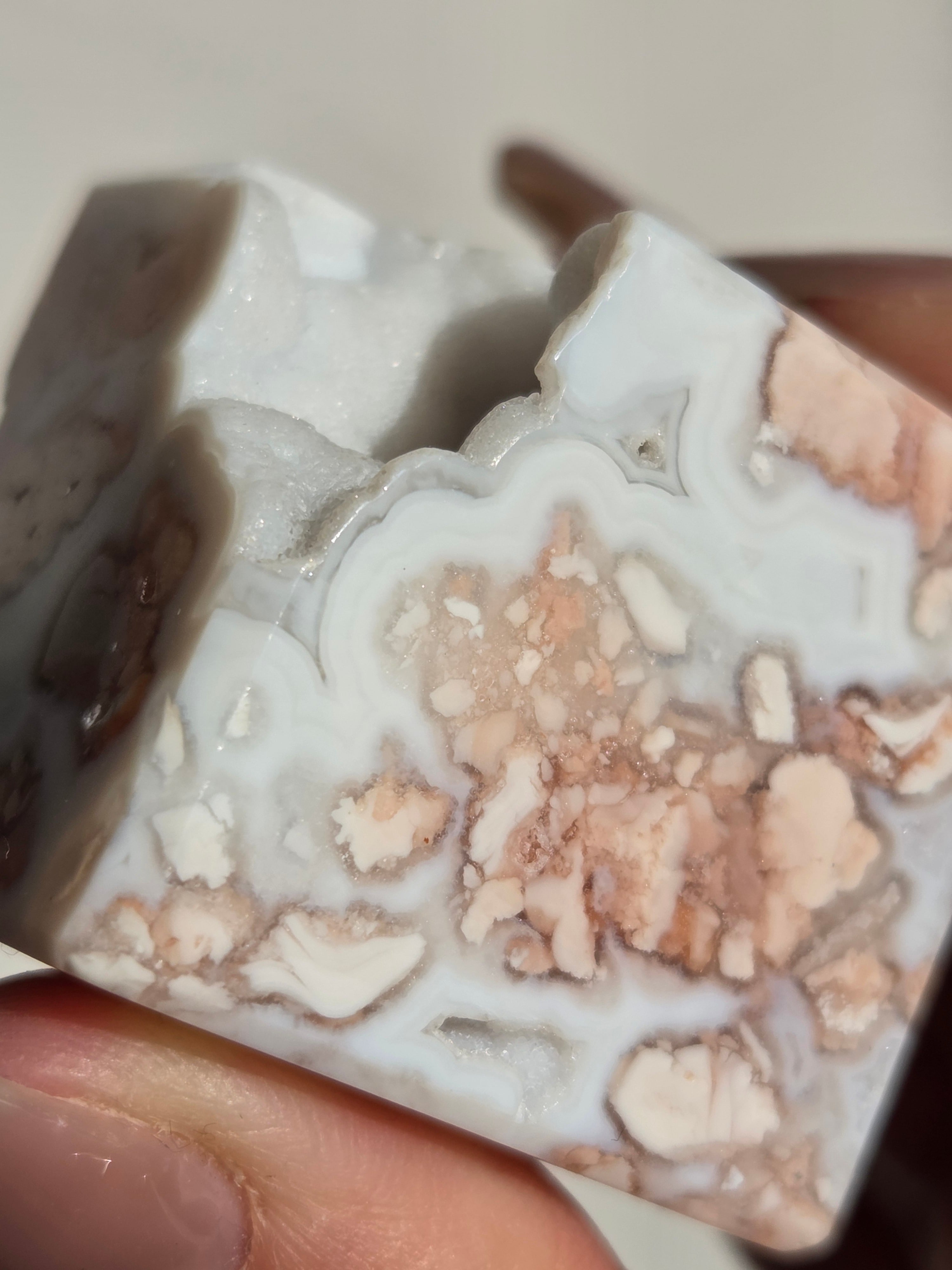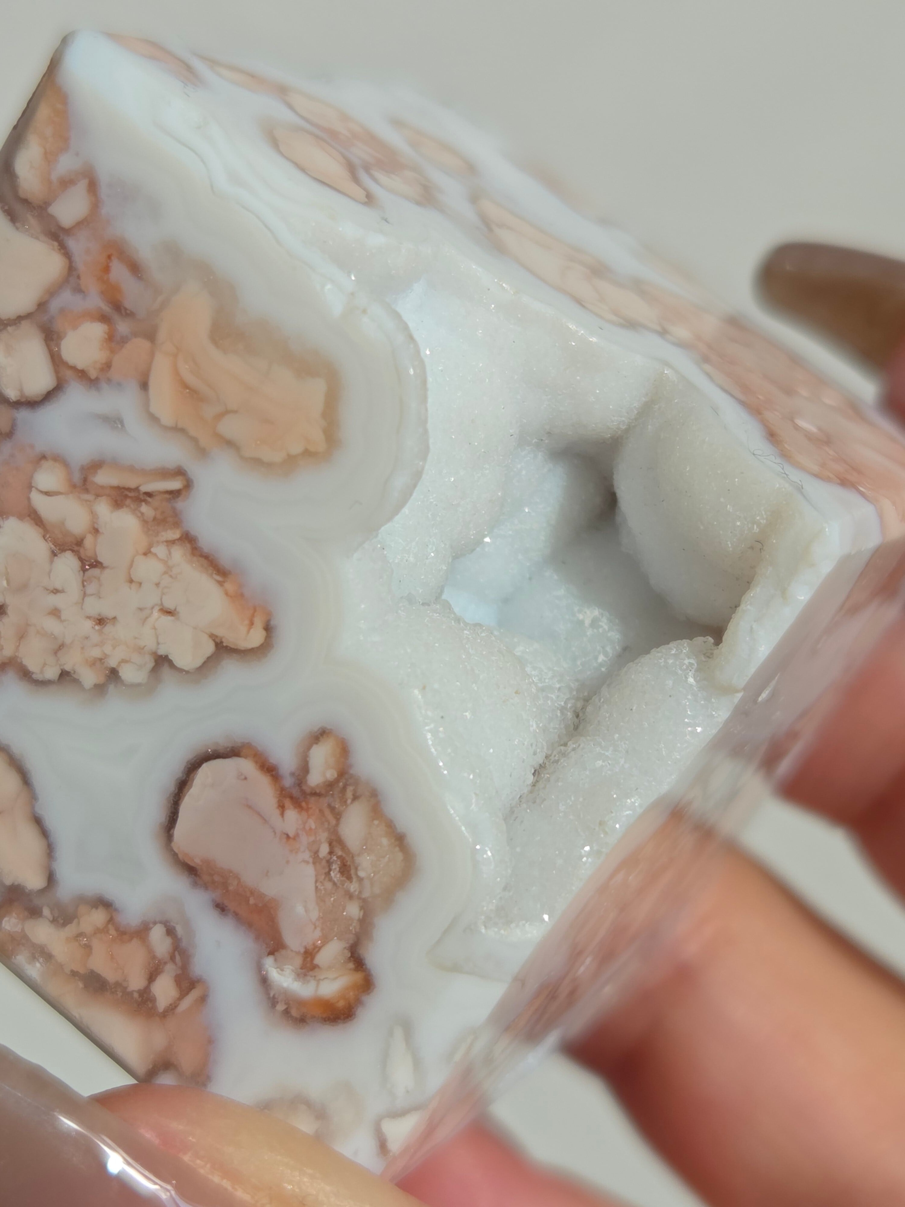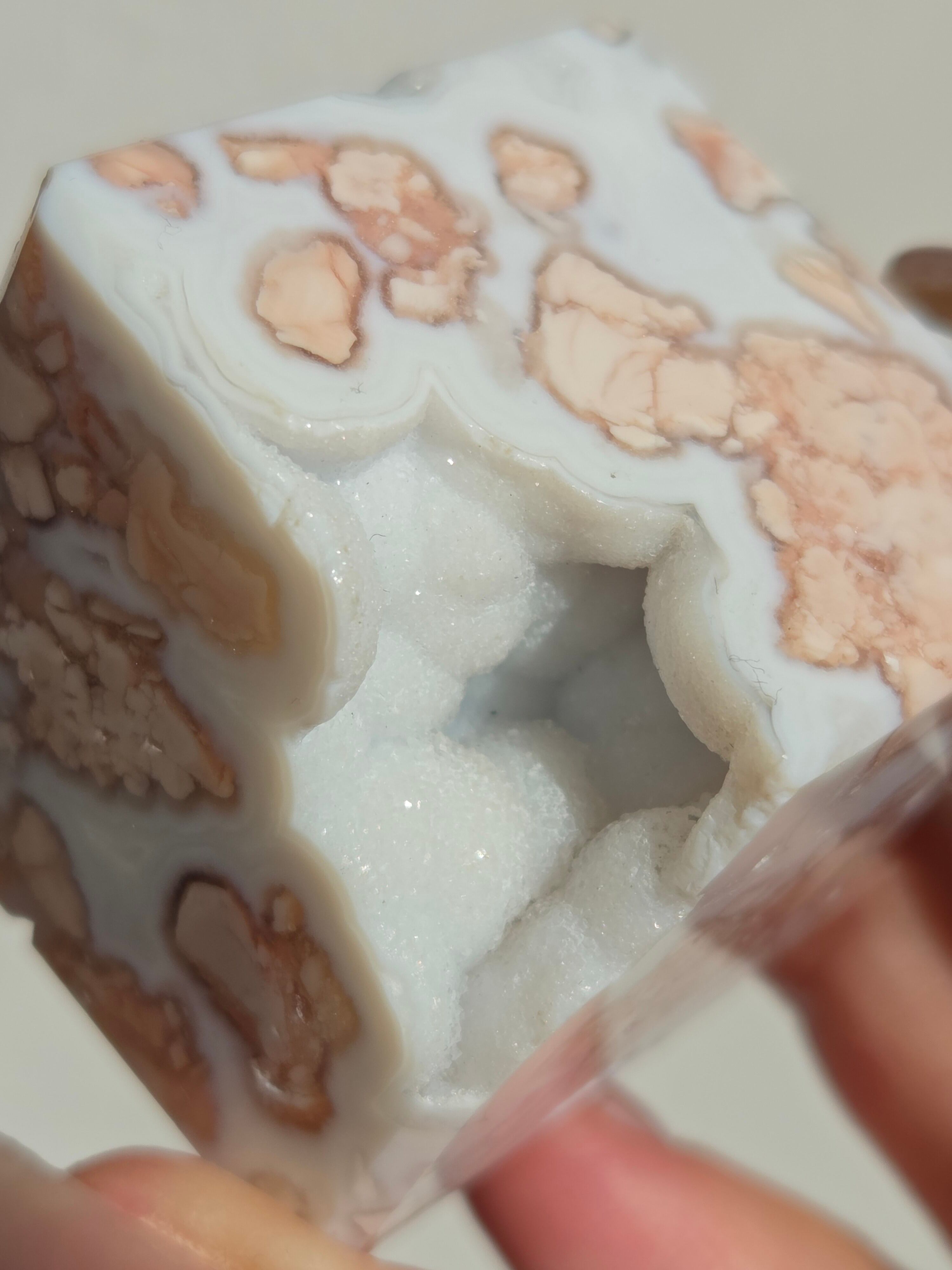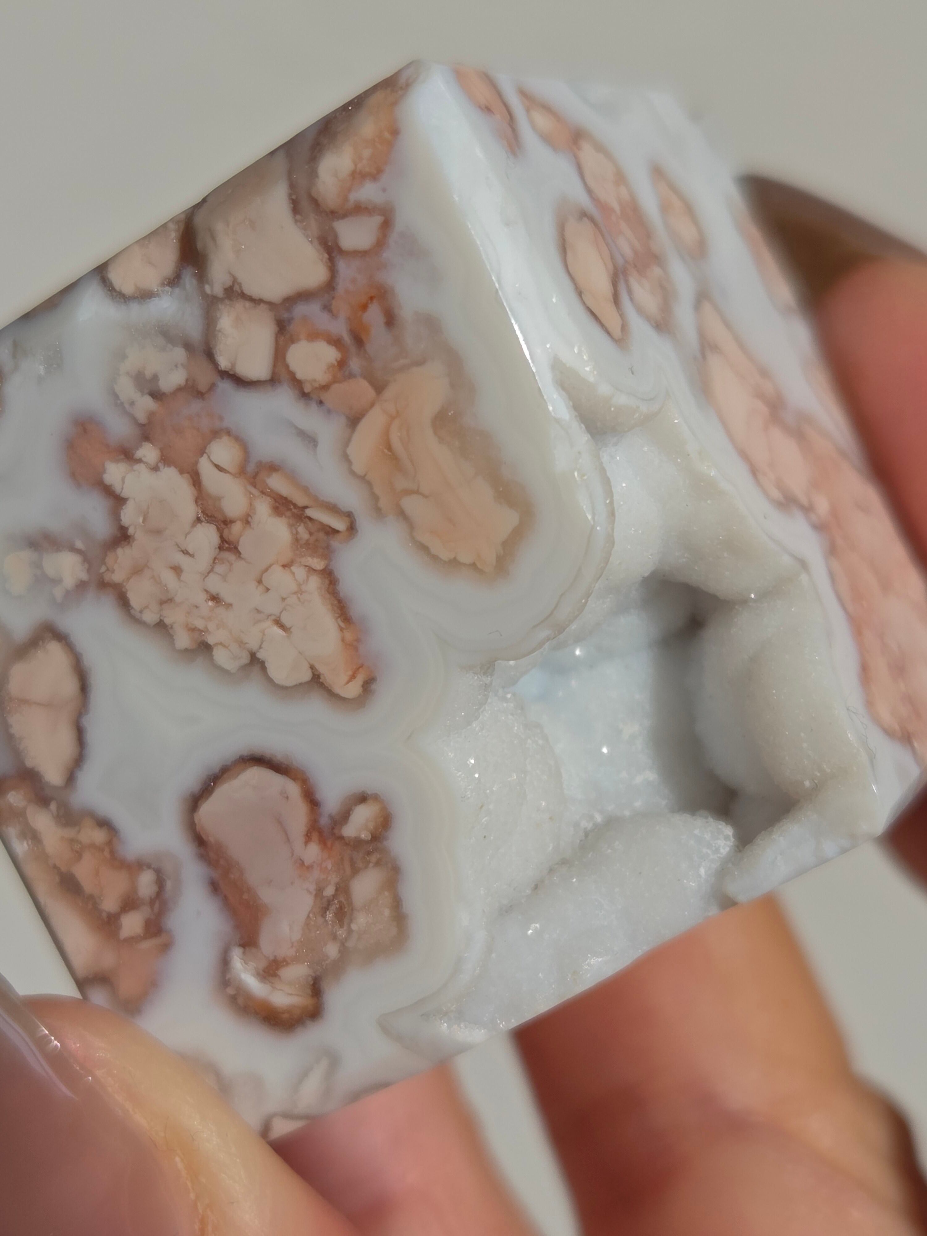サーモンピンクカラーの瑪瑙に、キラキラのジオード部分が素敵なキューブ形オブジェです。