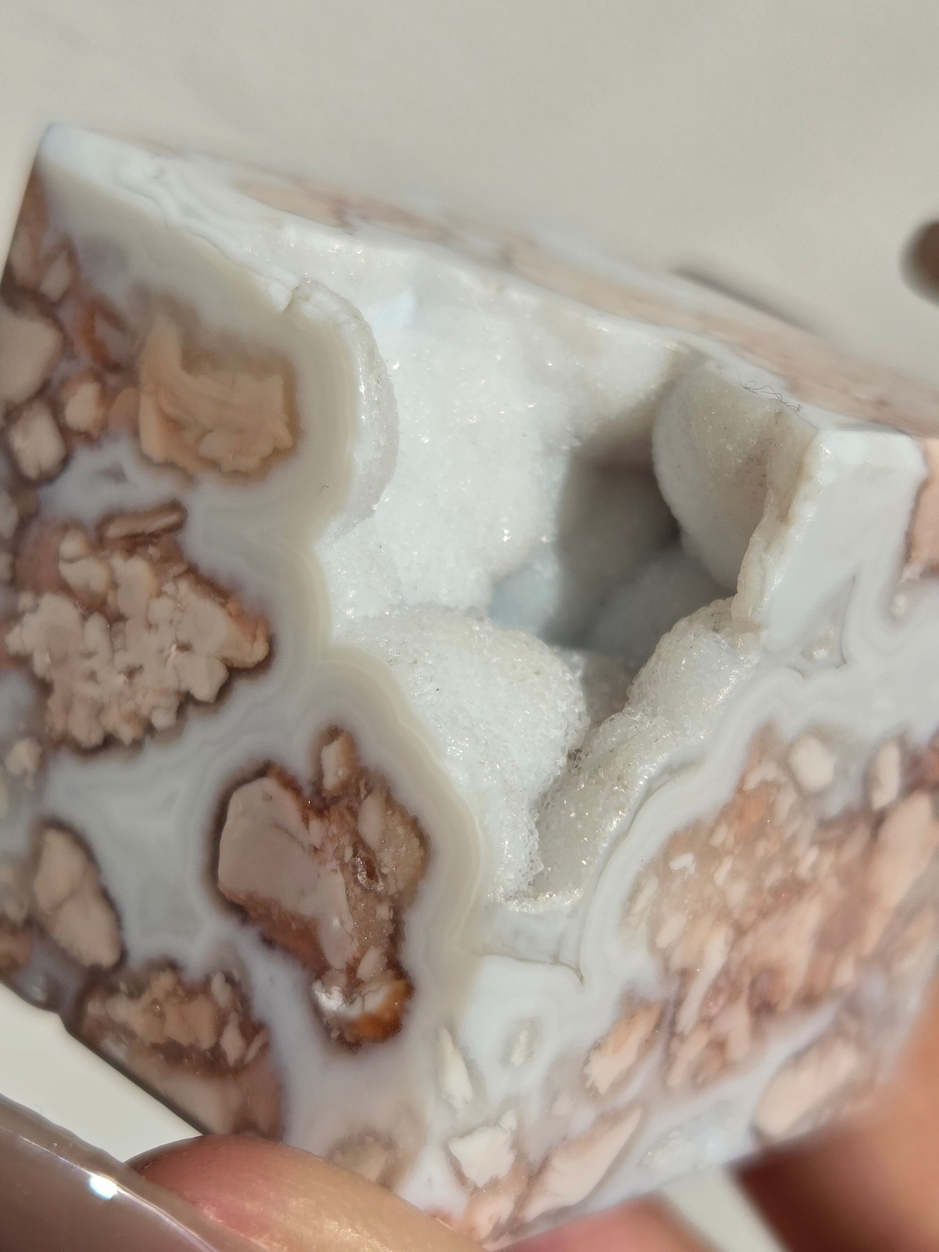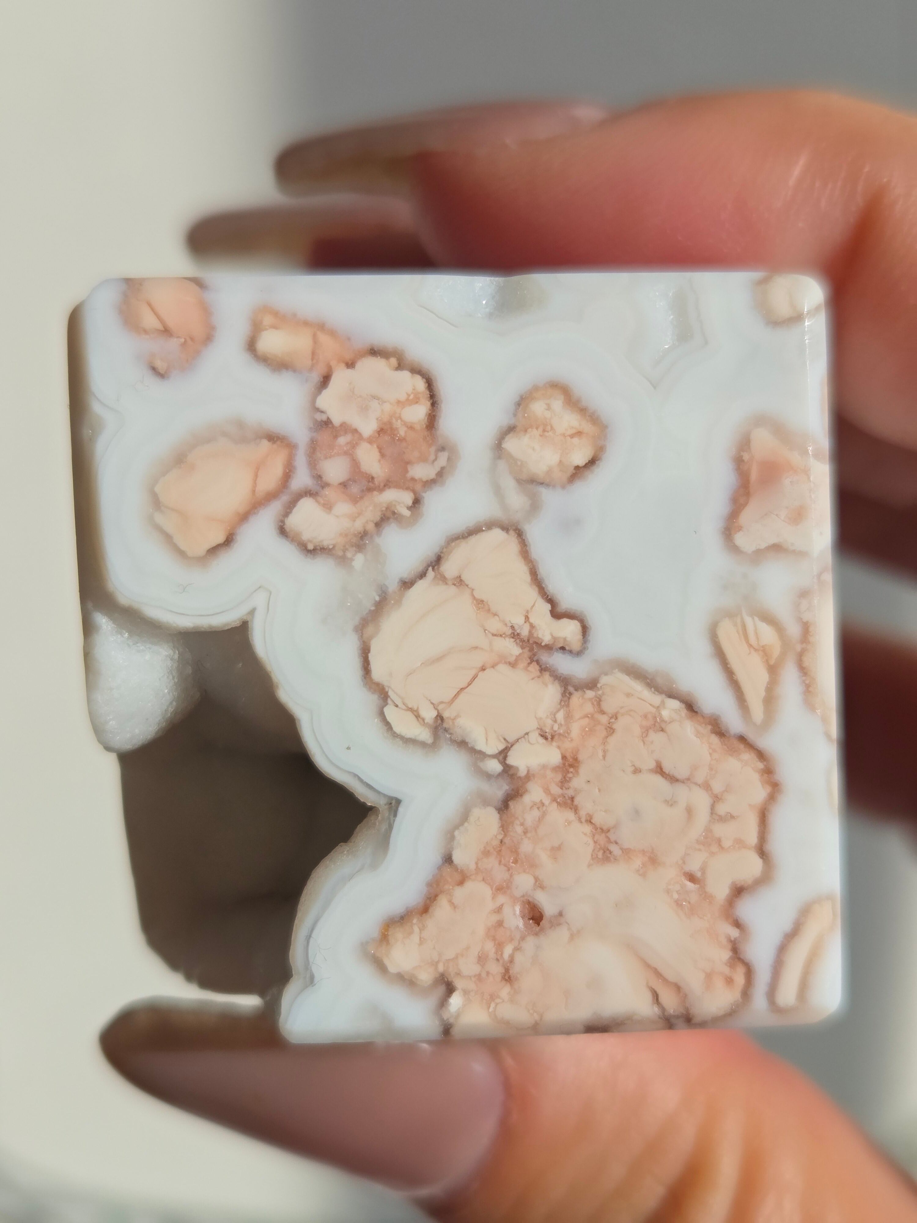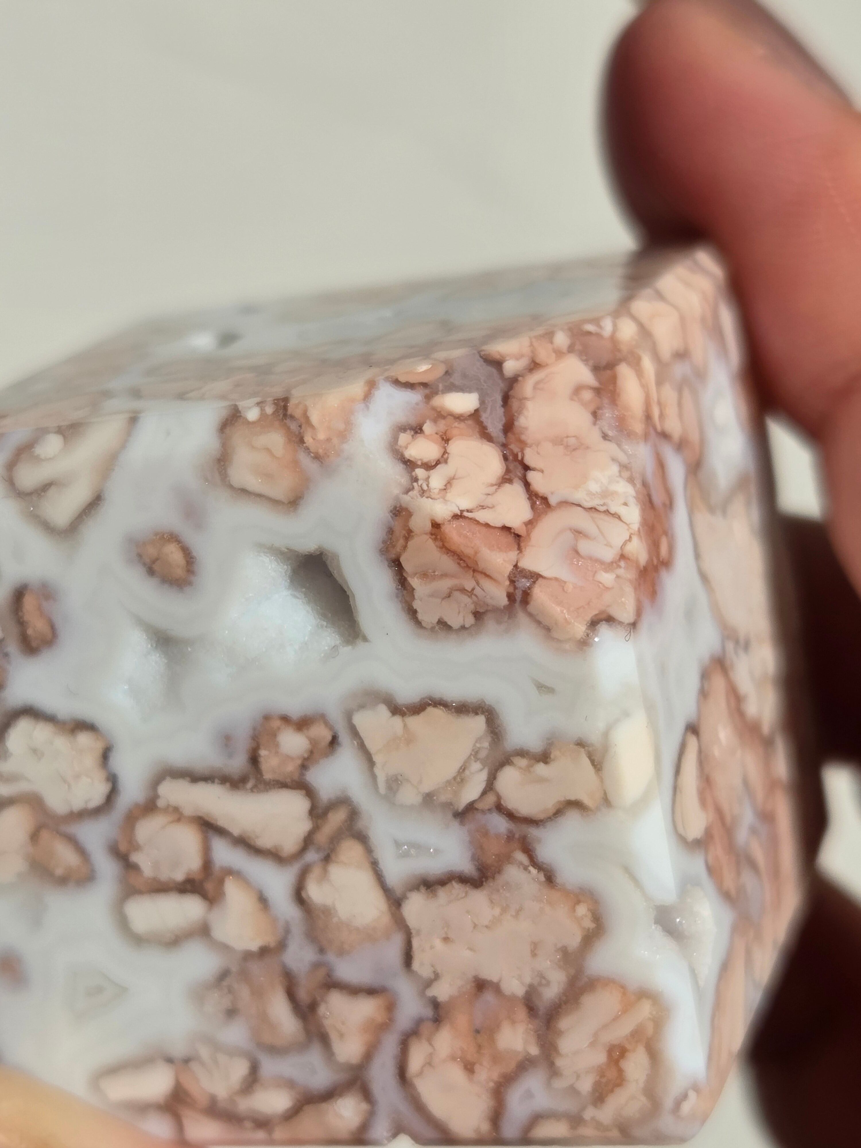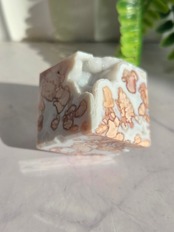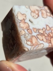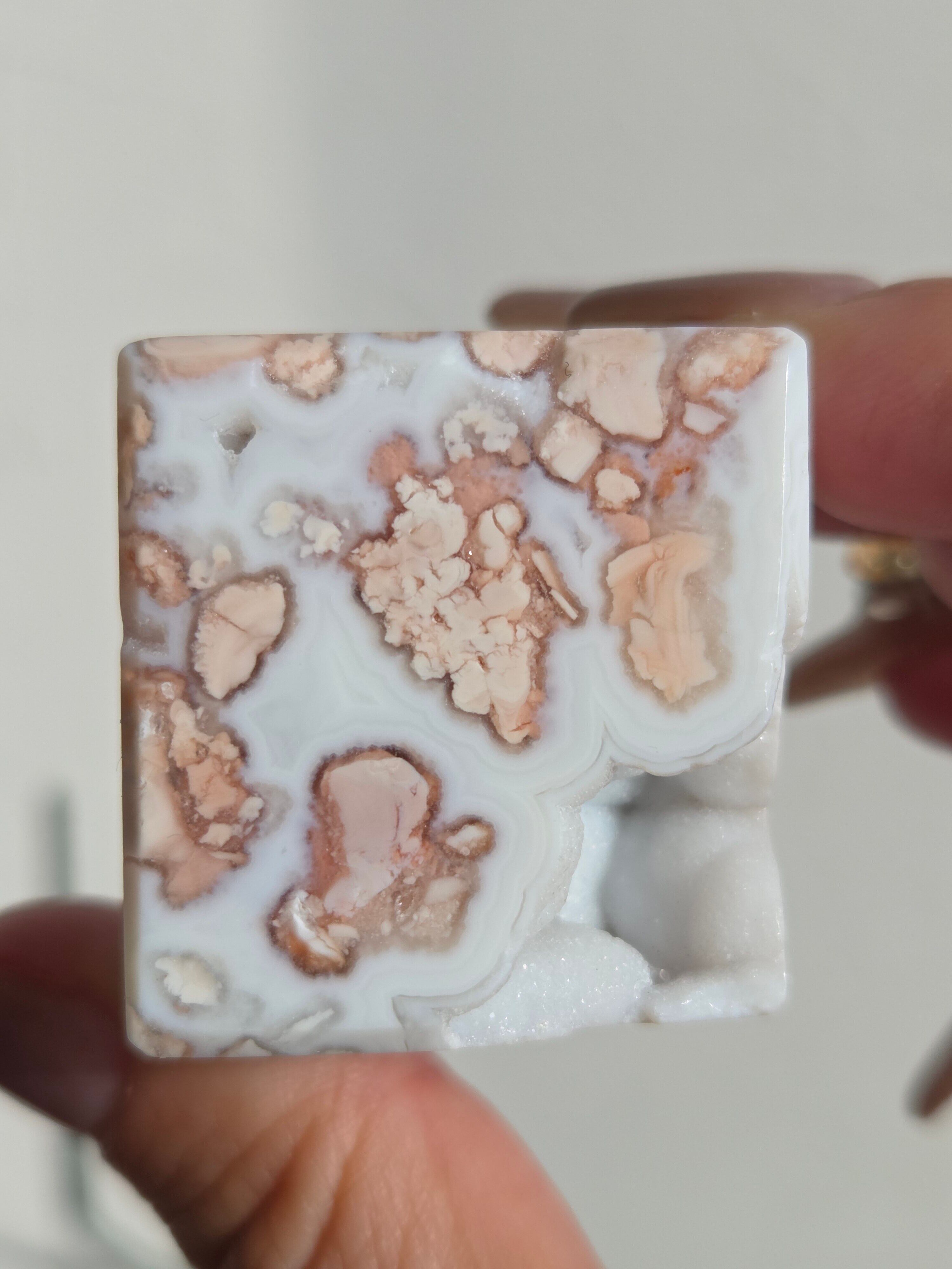 サーモンピンクカラーの瑪瑙に、キラキラのジオード部分が素敵なキューブ形オブジェです。
