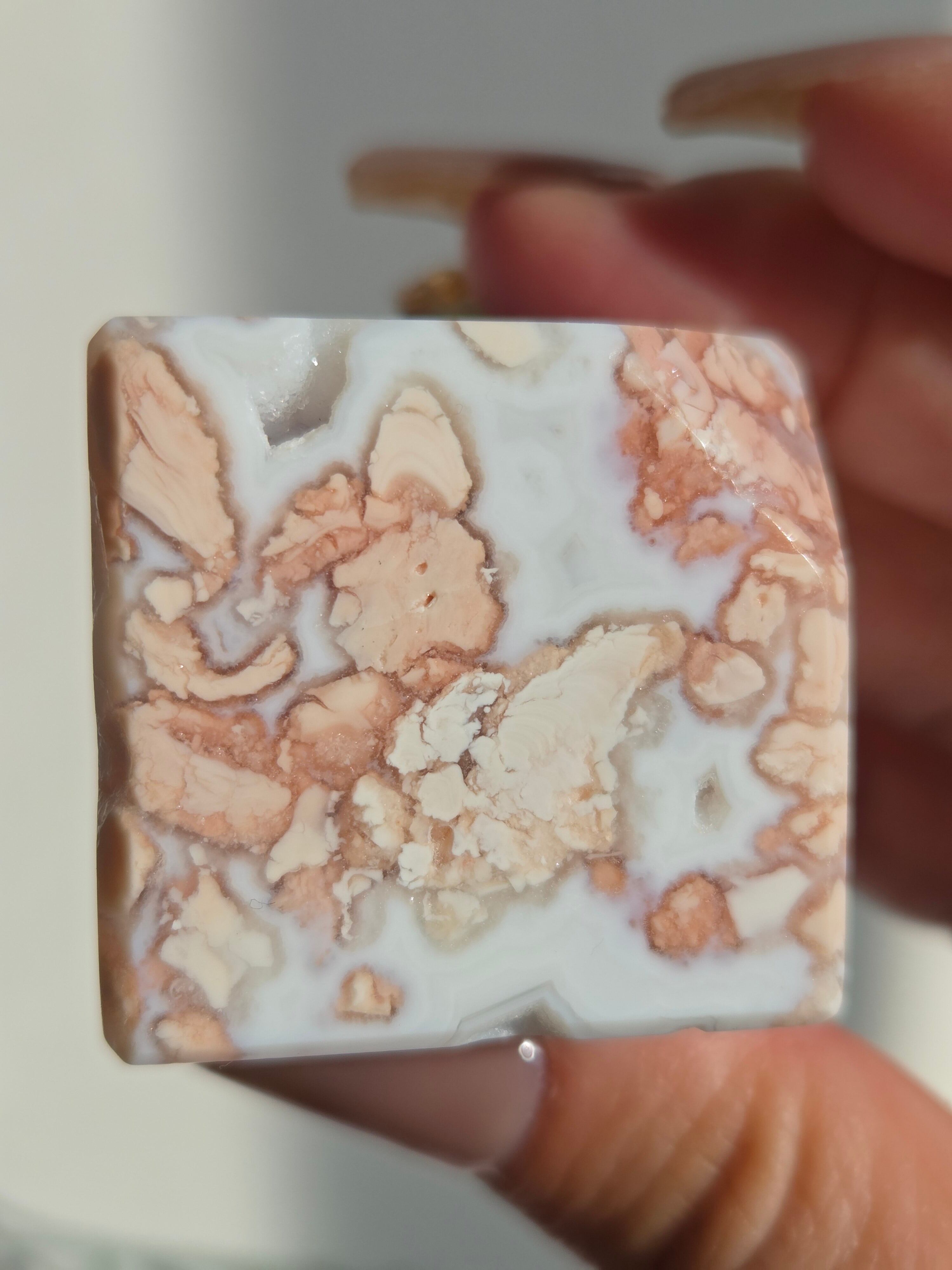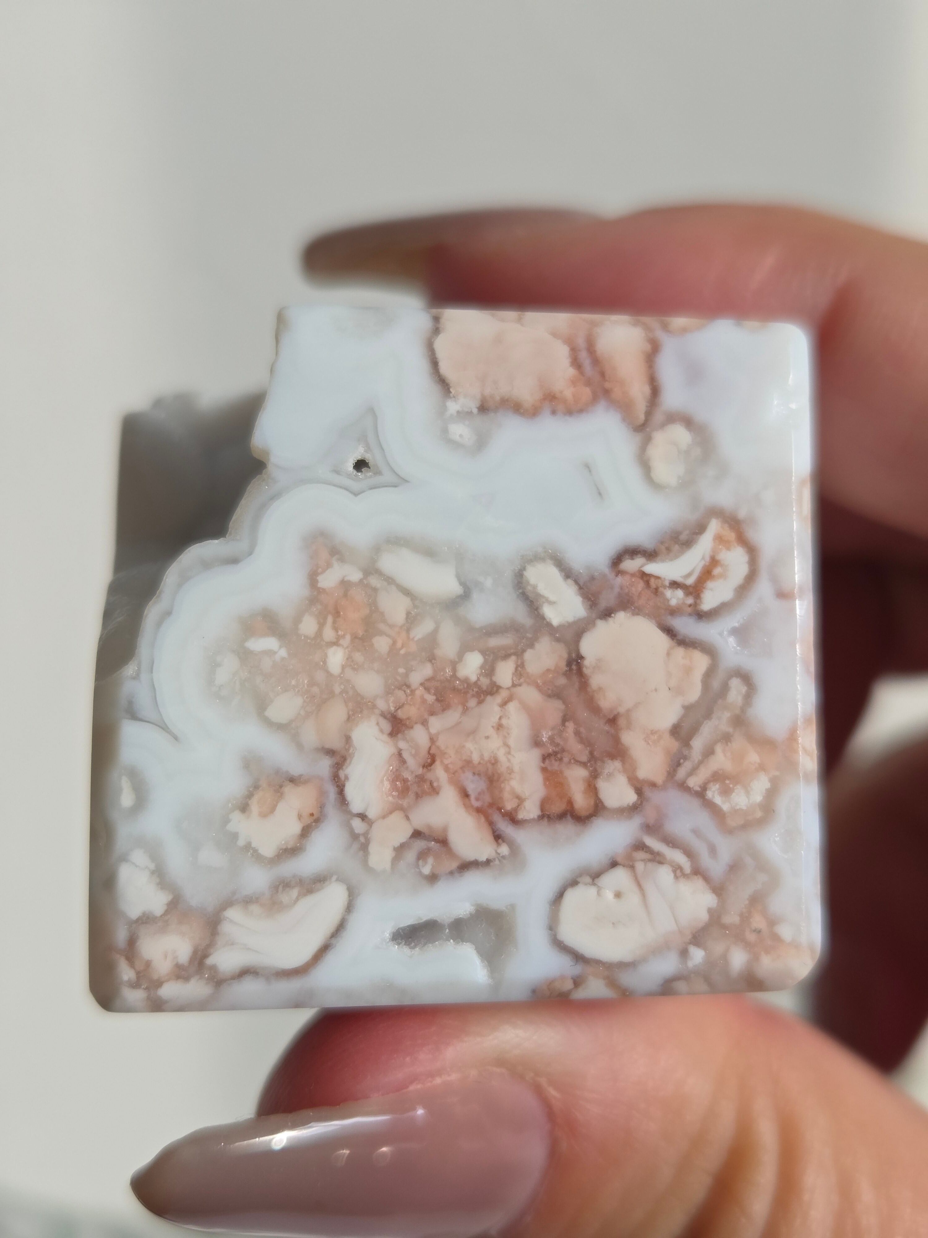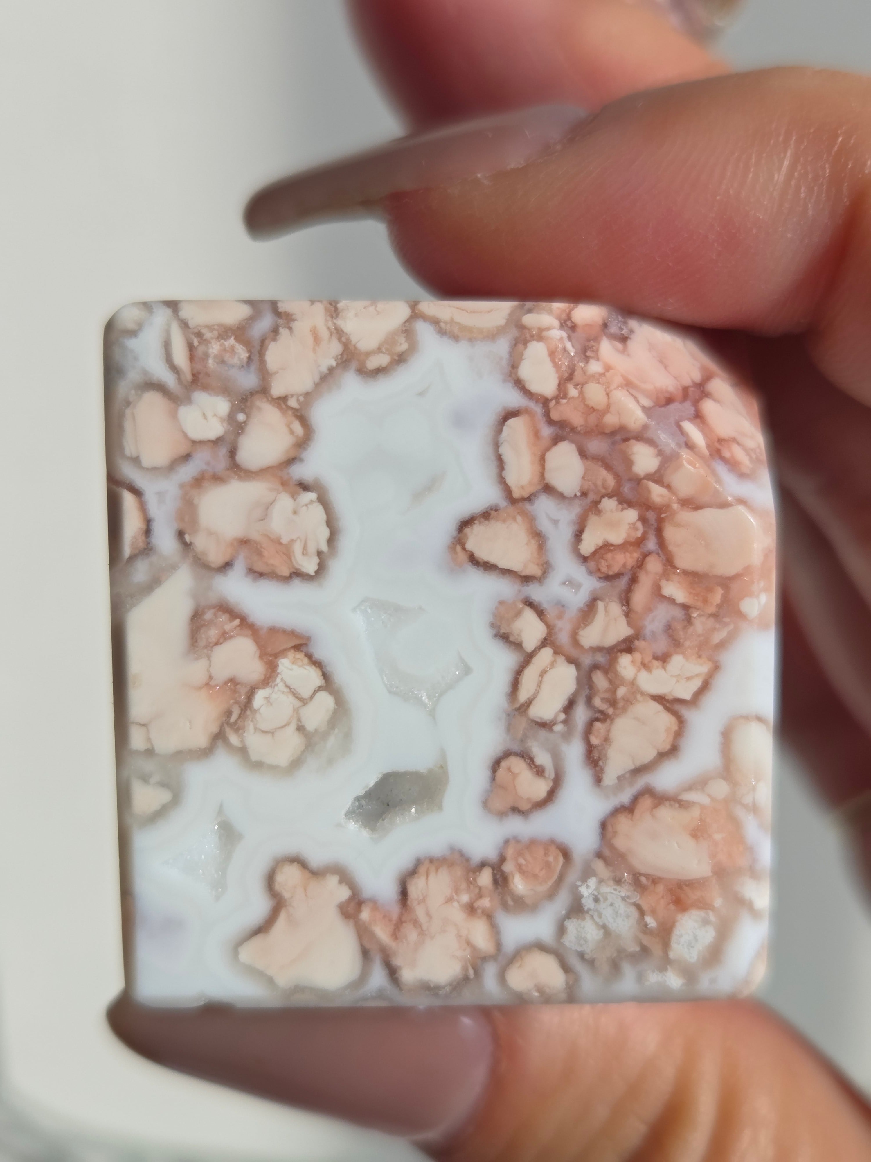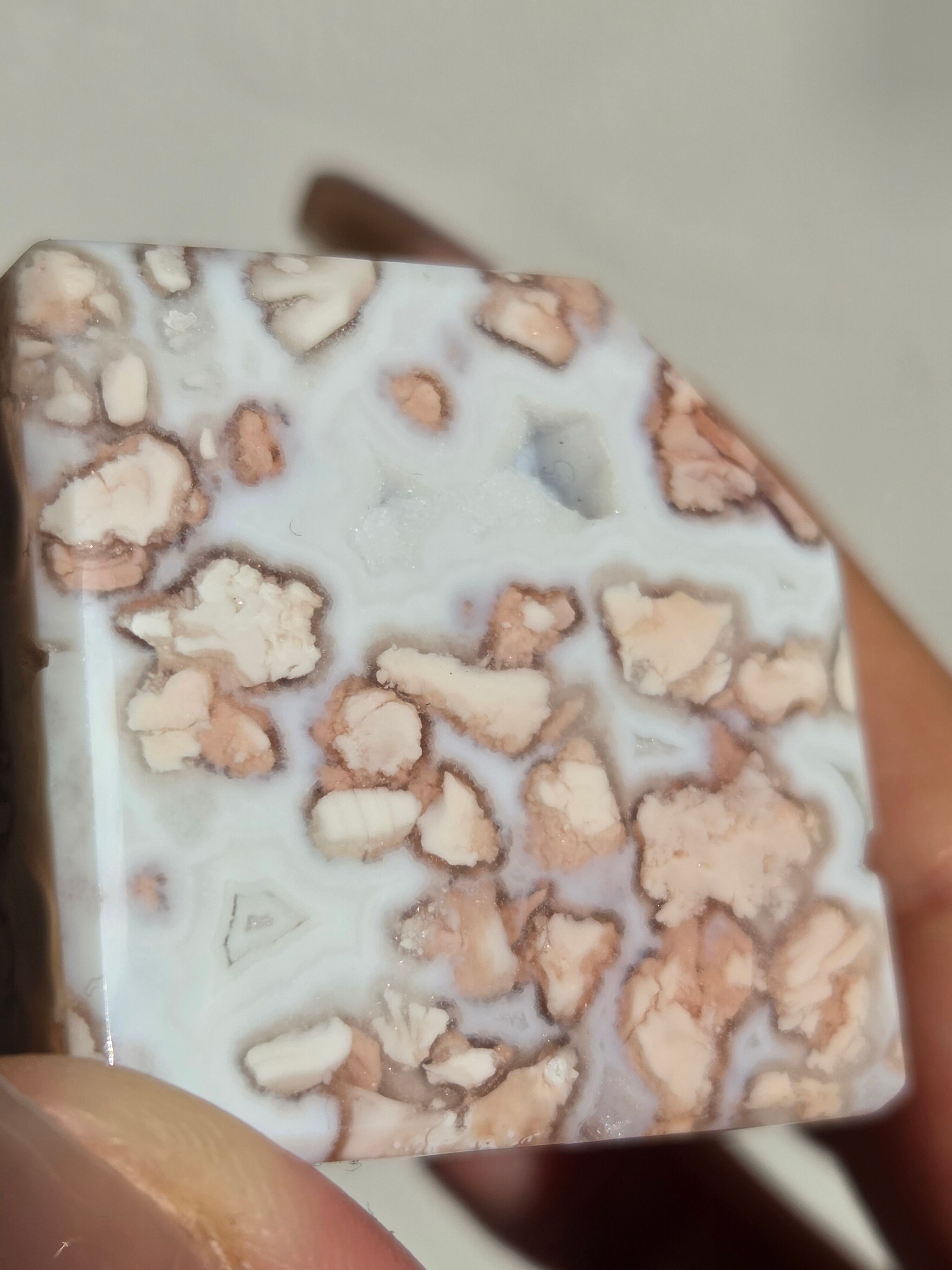 サーモンピンクカラーの瑪瑙に、キラキラのジオード部分が素敵なキューブ形オブジェです。
