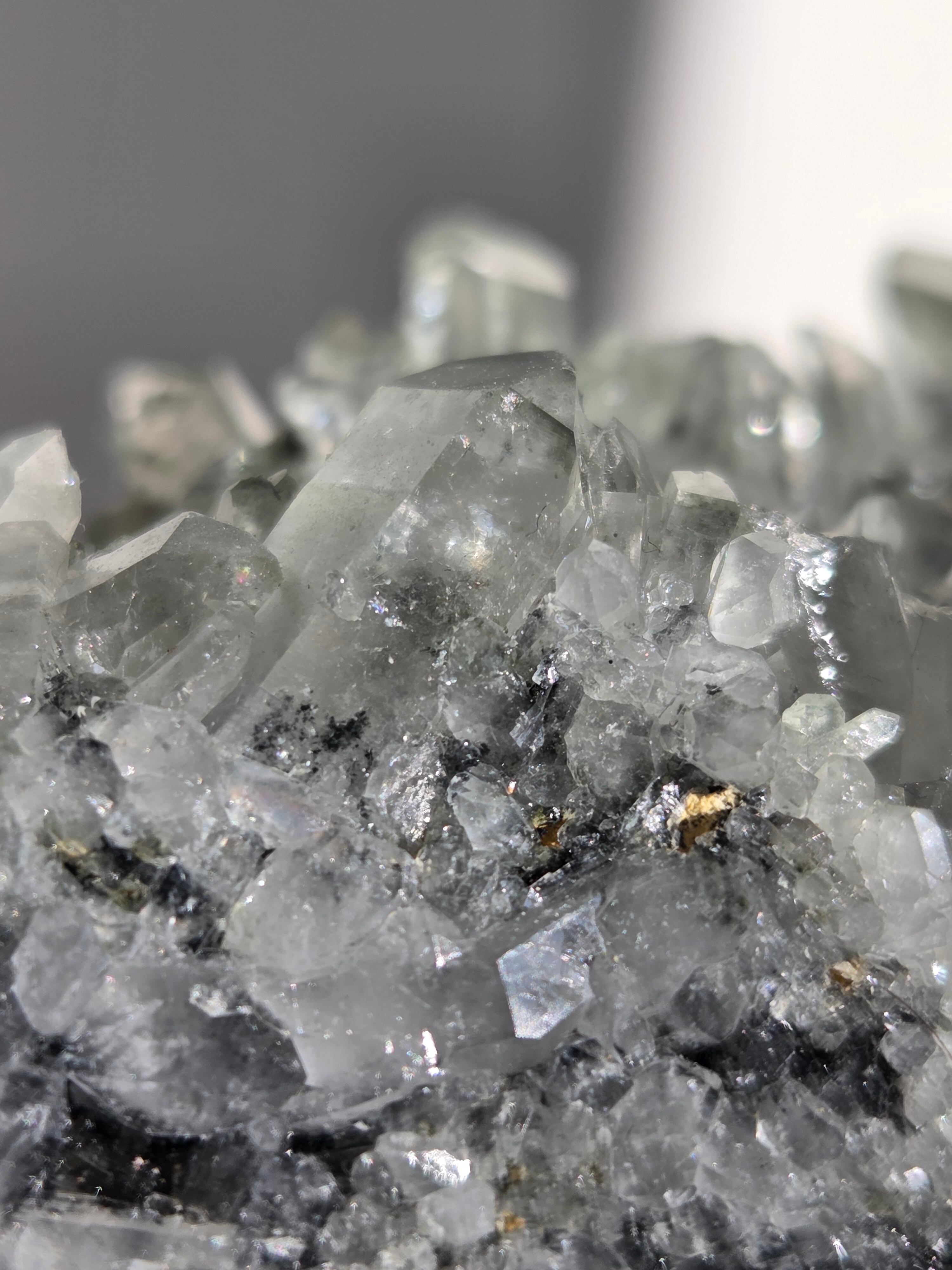 サイドにあるジオード部分や水晶ポイントの間から見えるクロマイトの煌めきも美しいです。