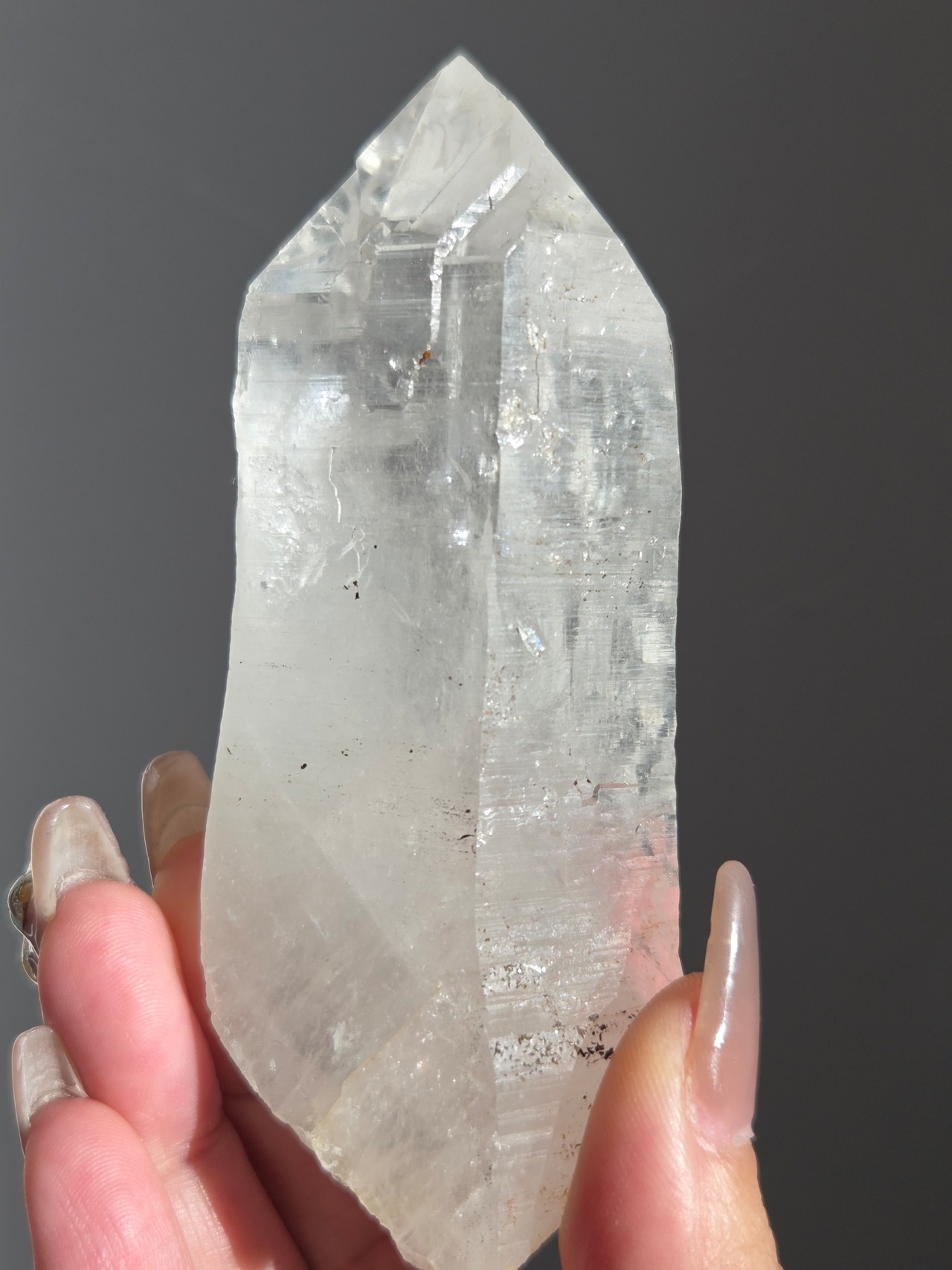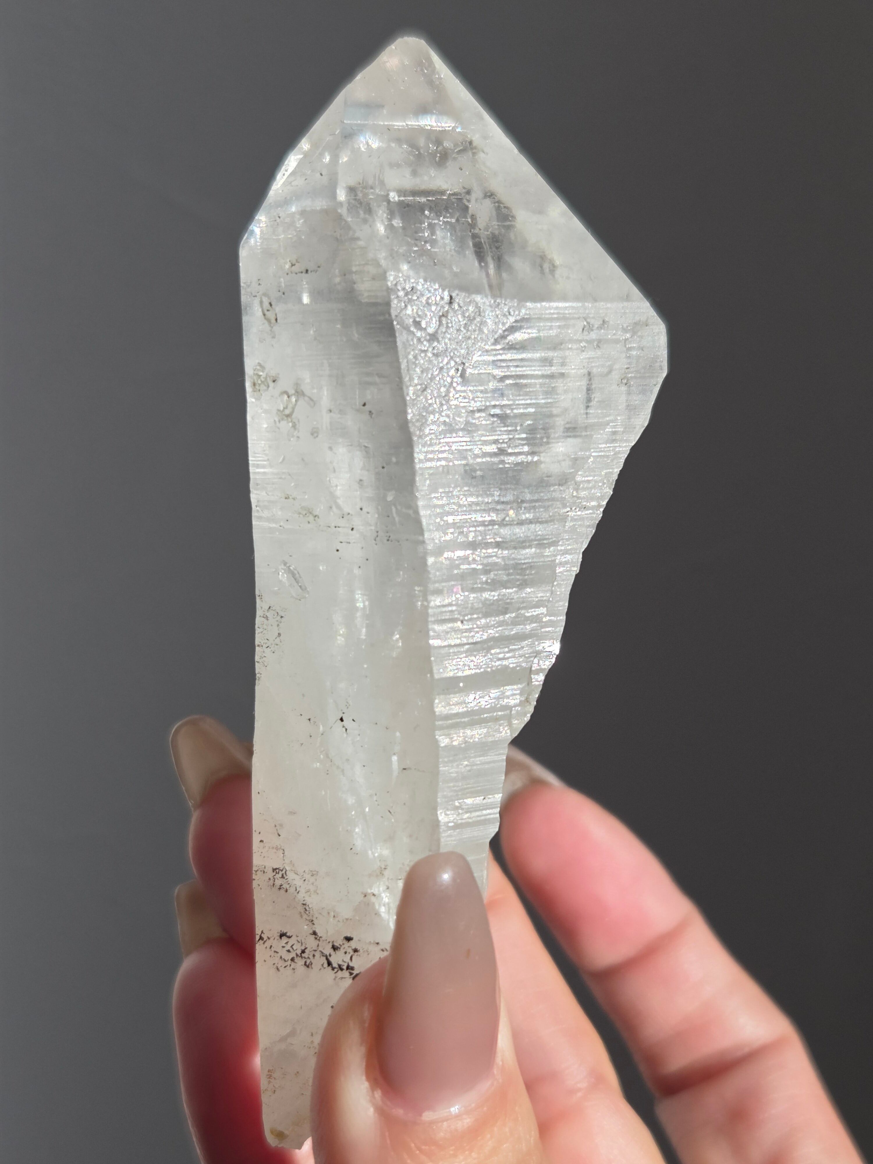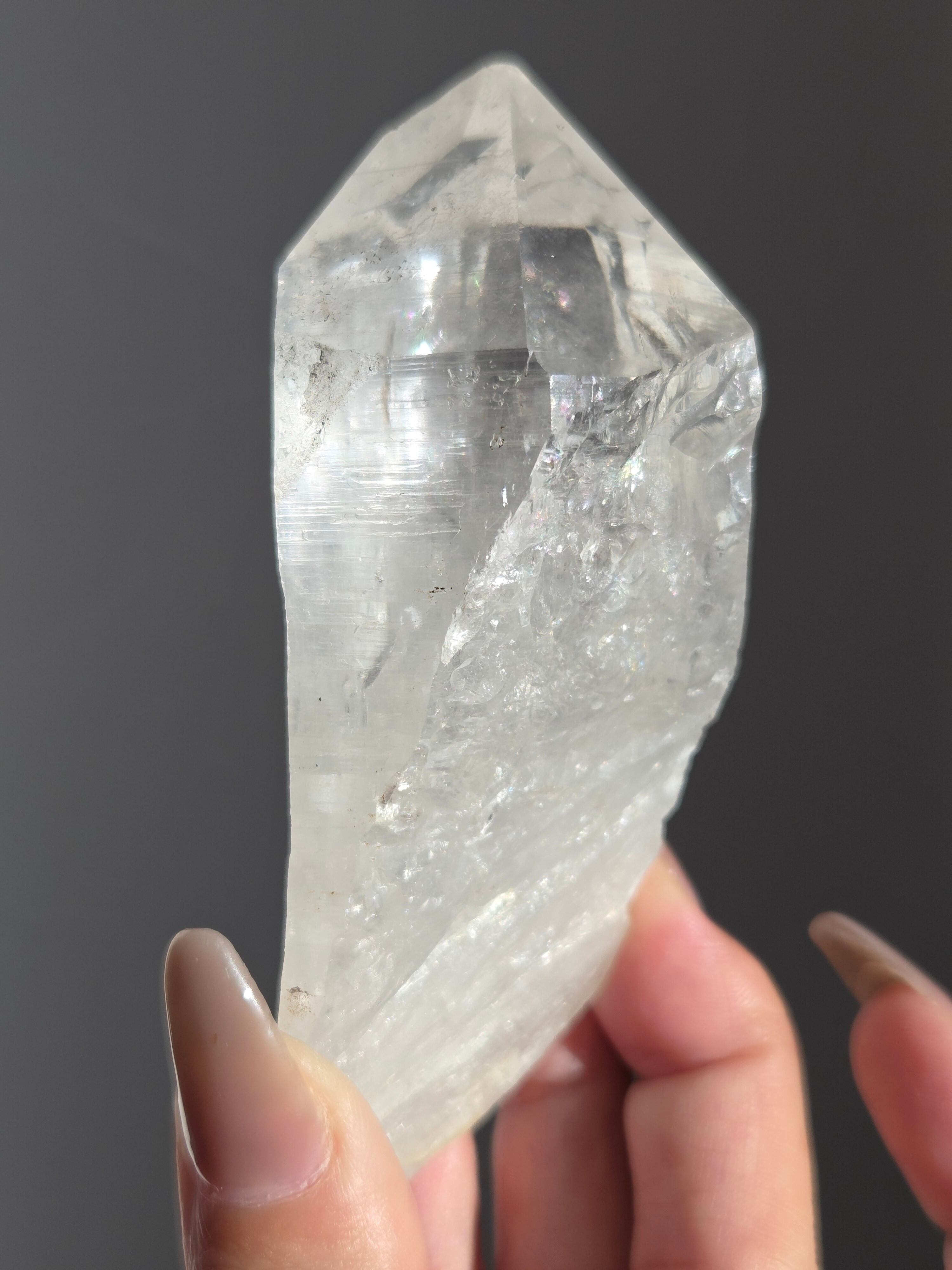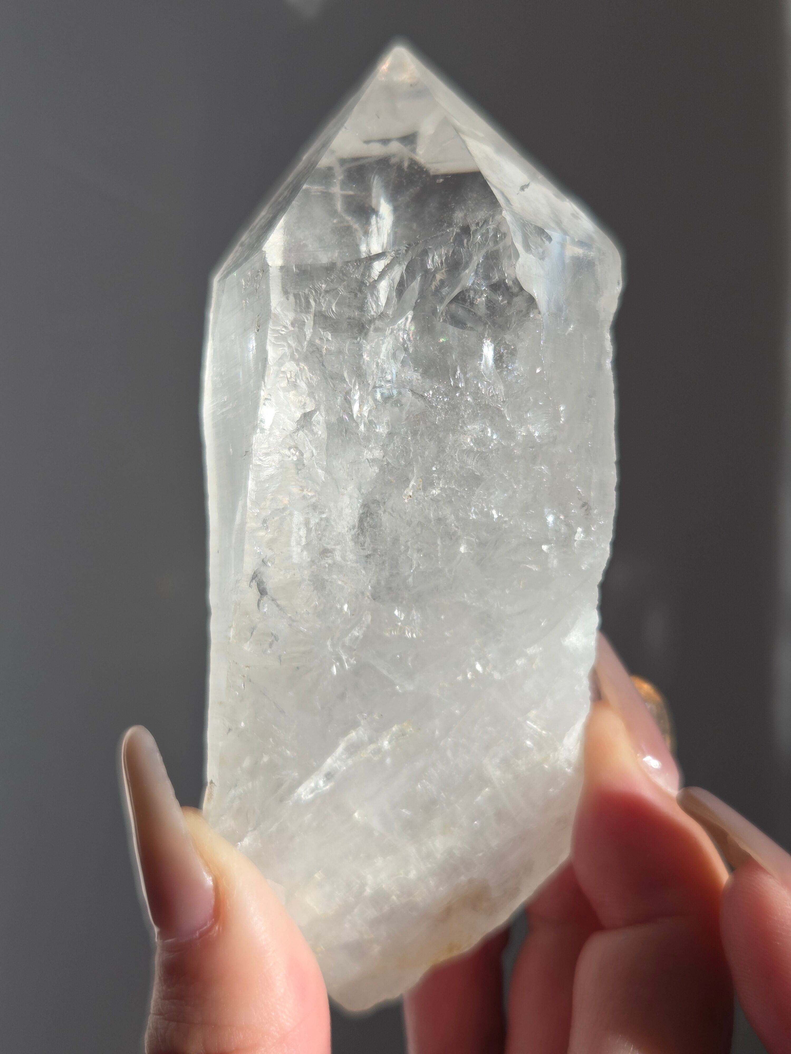 ヒマラヤ水晶サインジ産は、インド北部ヒマラヤ山脈のサインジ渓谷で採掘される、高い透明度と美しい輝きが特徴の水晶で、マニカラン産などと並び人気があり、希少性も高いとされています。澄んだ雪解け水のような美しさや、クローライト(緑泥石)やヘマタイト(赤鉄鉱)を含むものもあり、内部のレインボーも魅力で、強力な浄化力を持つと信じられています。
