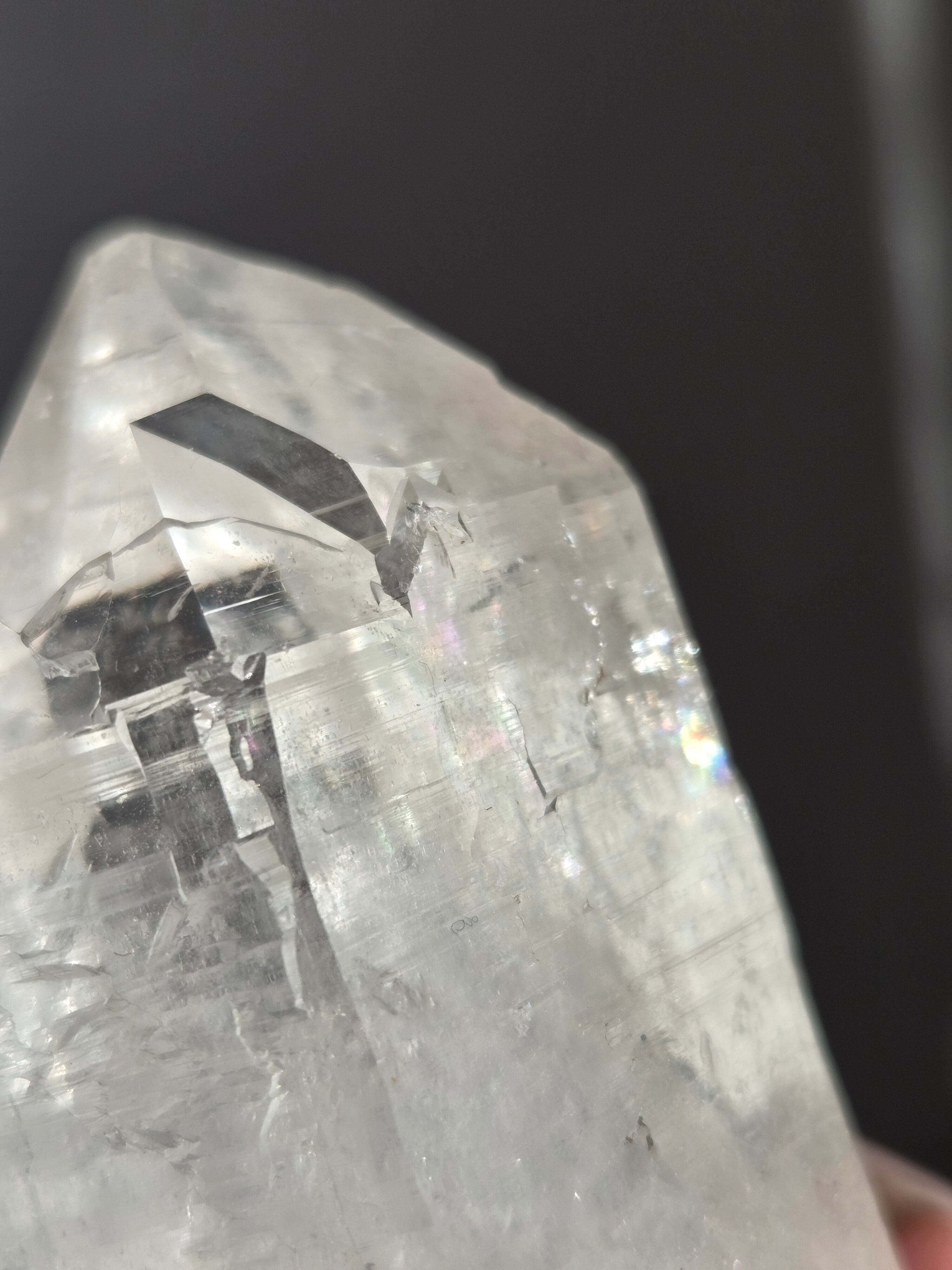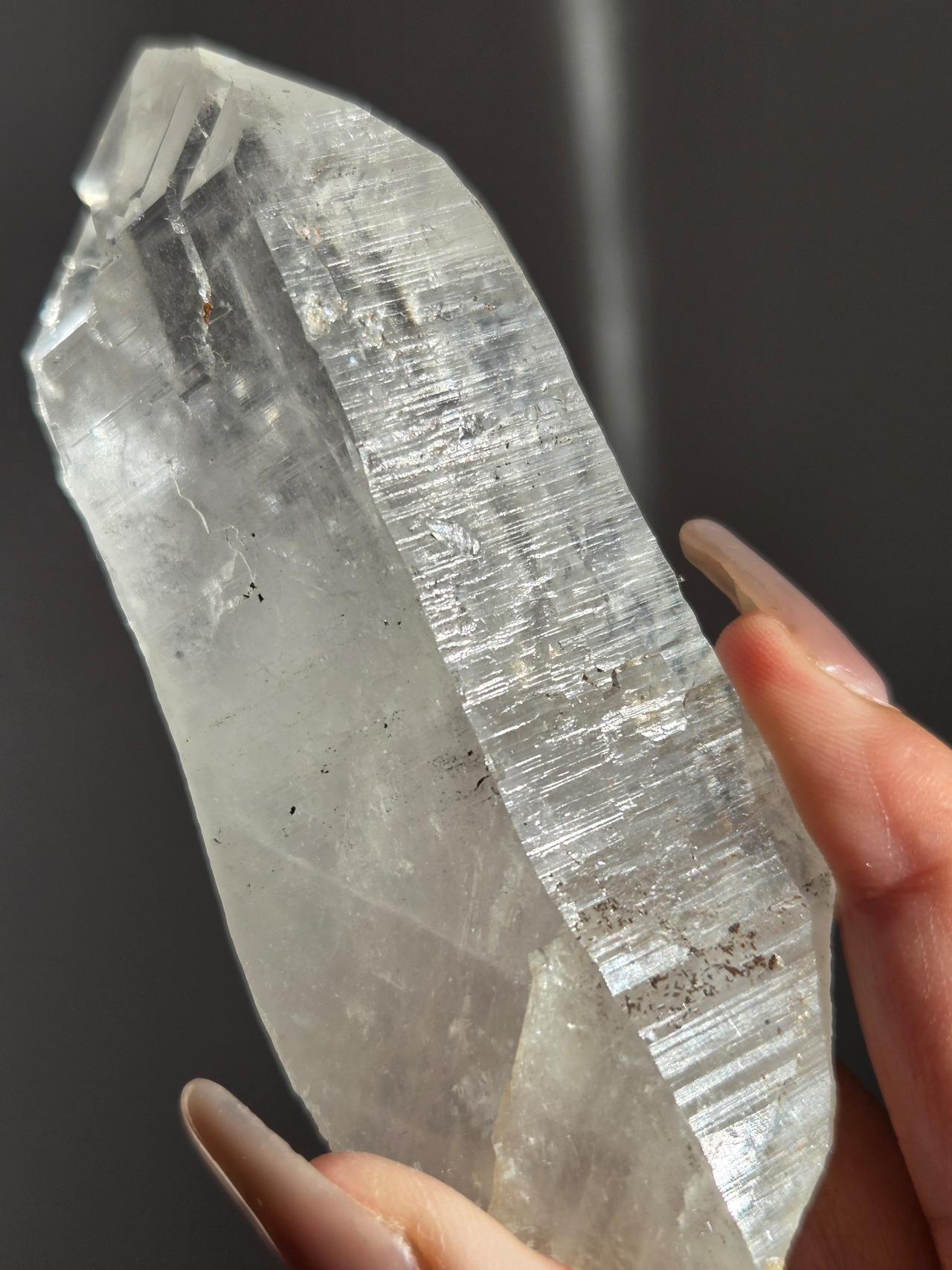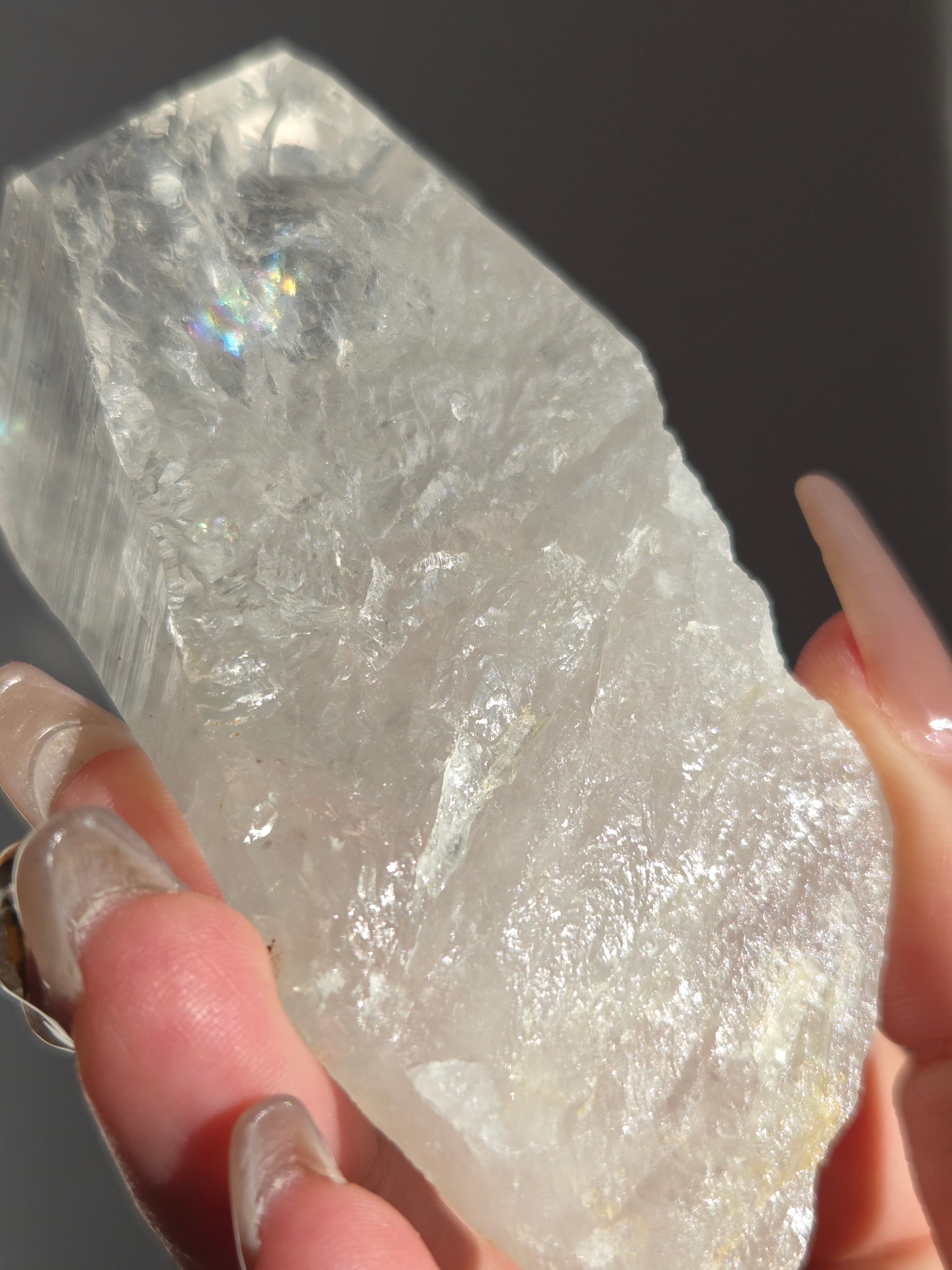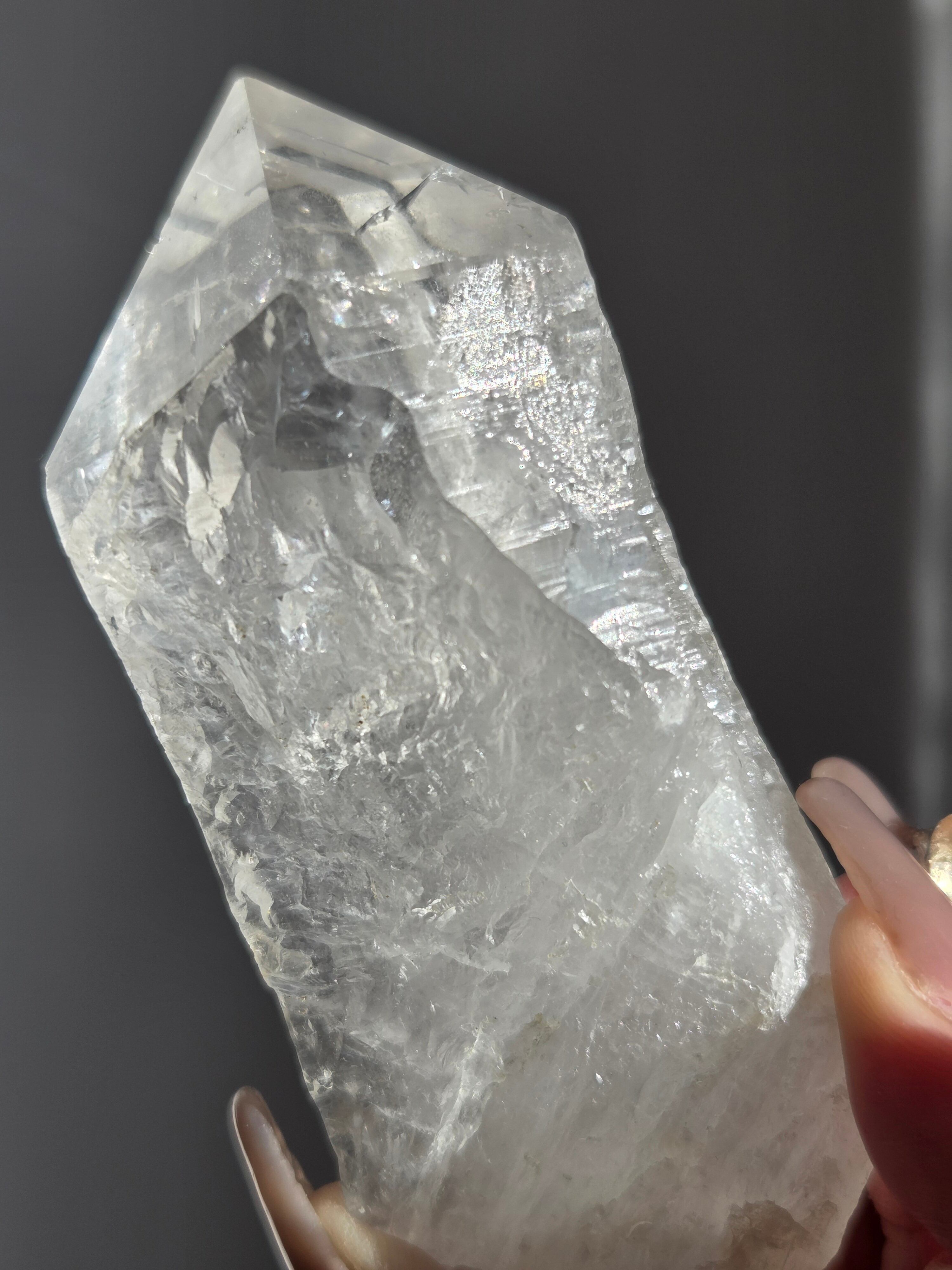 ヒマラヤ水晶サインジ産は、インド北部ヒマラヤ山脈のサインジ渓谷で採掘される、高い透明度と美しい輝きが特徴の水晶で、マニカラン産などと並び人気があり、希少性も高いとされています。澄んだ雪解け水のような美しさや、クローライト(緑泥石)やヘマタイト(赤鉄鉱)を含むものもあり、内部のレインボーも魅力で、強力な浄化力を持つと信じられています。