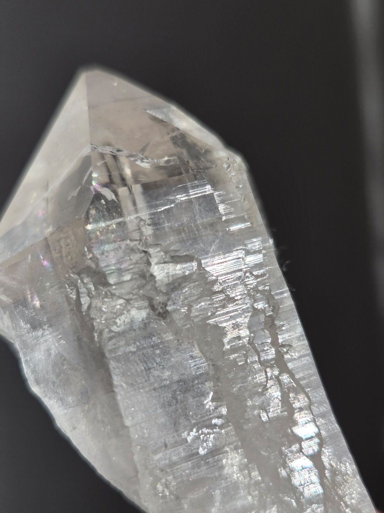 うっすらピンクがかったピースで、蝕像部分も見られます。蝕像水晶(しょくぞうすいしょう、エッチドクォーツ)とは、水晶が成長する過程で、地中の高温の熱水やフッ化水素酸などの影響で表面が溶かされ(蝕像)、その後、再結晶するなどして独特の複雑な凹凸模様や幾何学模様が形成された天然の水晶のことです。